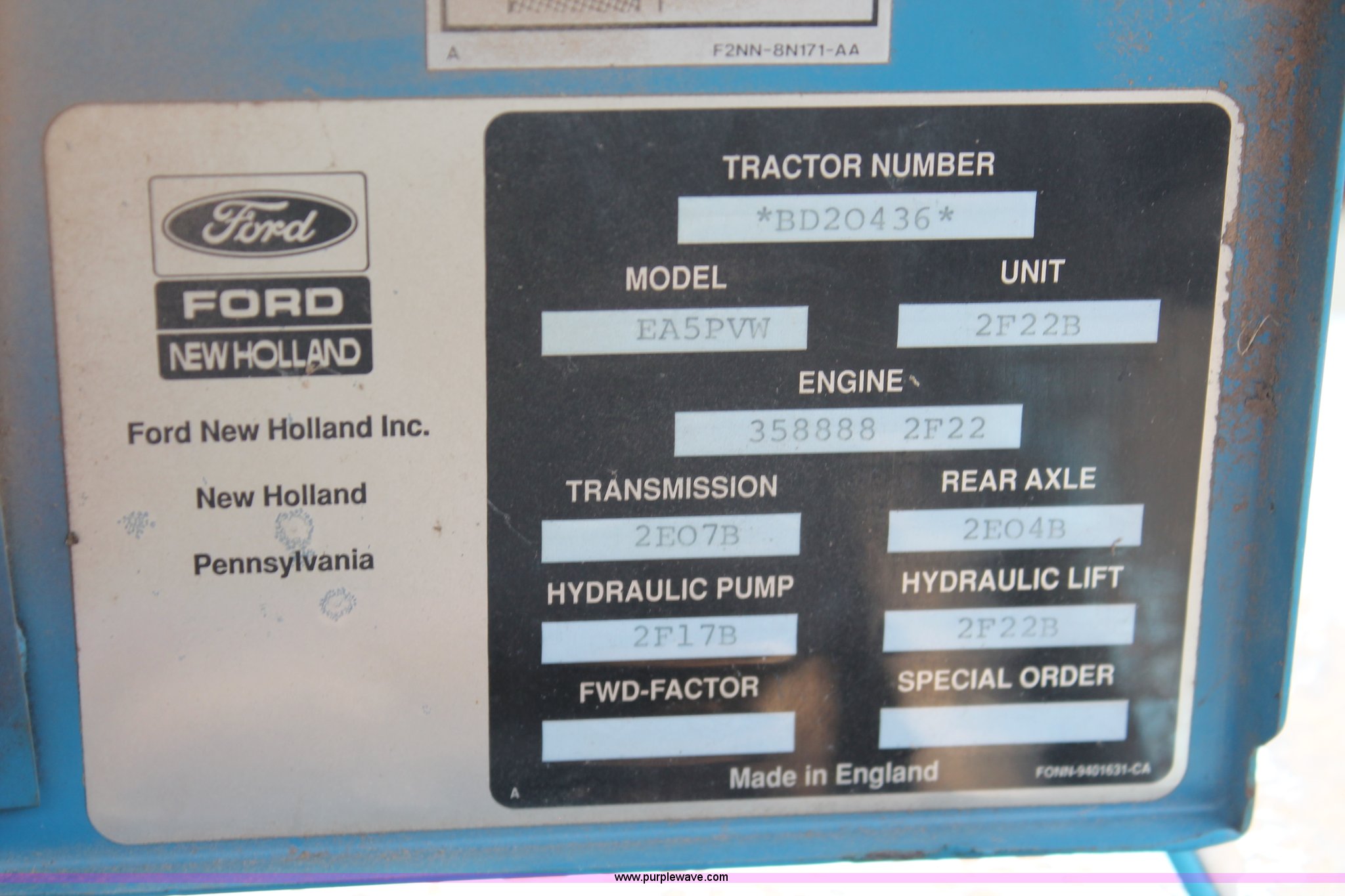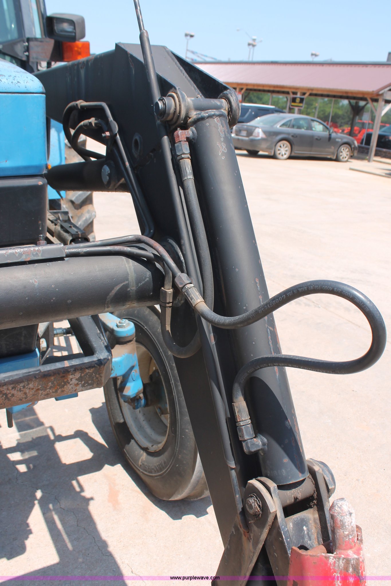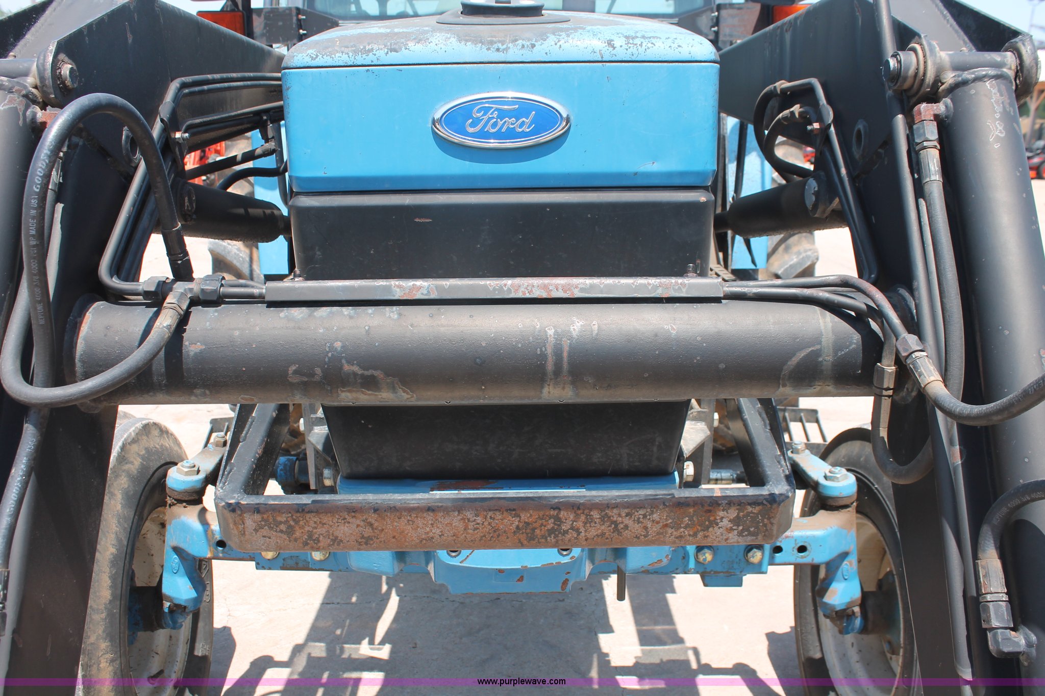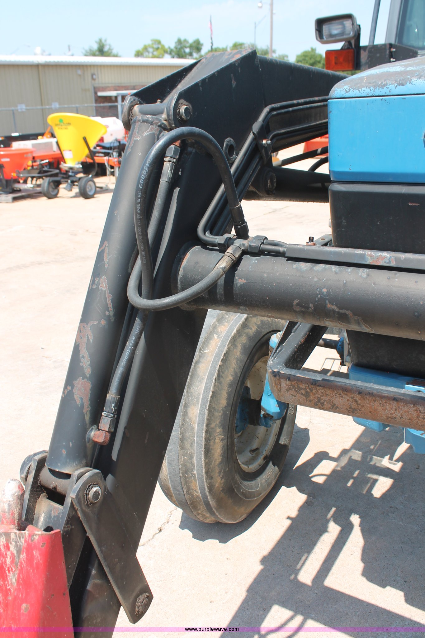Purple Wave is selling a used Tractor in Oklahoma. This item is a 1994 Ford 6640 tractor with the following: 3,874 hours on meter, Ford 5.0L four cylinder diesel engine, Electroshift Pulse Command powershift transmission, 16F-16R gears, Differential lock, AC and heat, Non-operational AC, Tilt steering wheel, AM/FM/cassette, Suspension seat, Shades, Westendorf TA-26 loader, Two-lever controls, Three point, Top link, Seven pin outlet, 540/1000 PTO, Draw bar, (2) rear hydraulic remote sets, 93" wheelbase, 10.00-16SL front tires, 18.4-34 rear tires, Serial BD20436