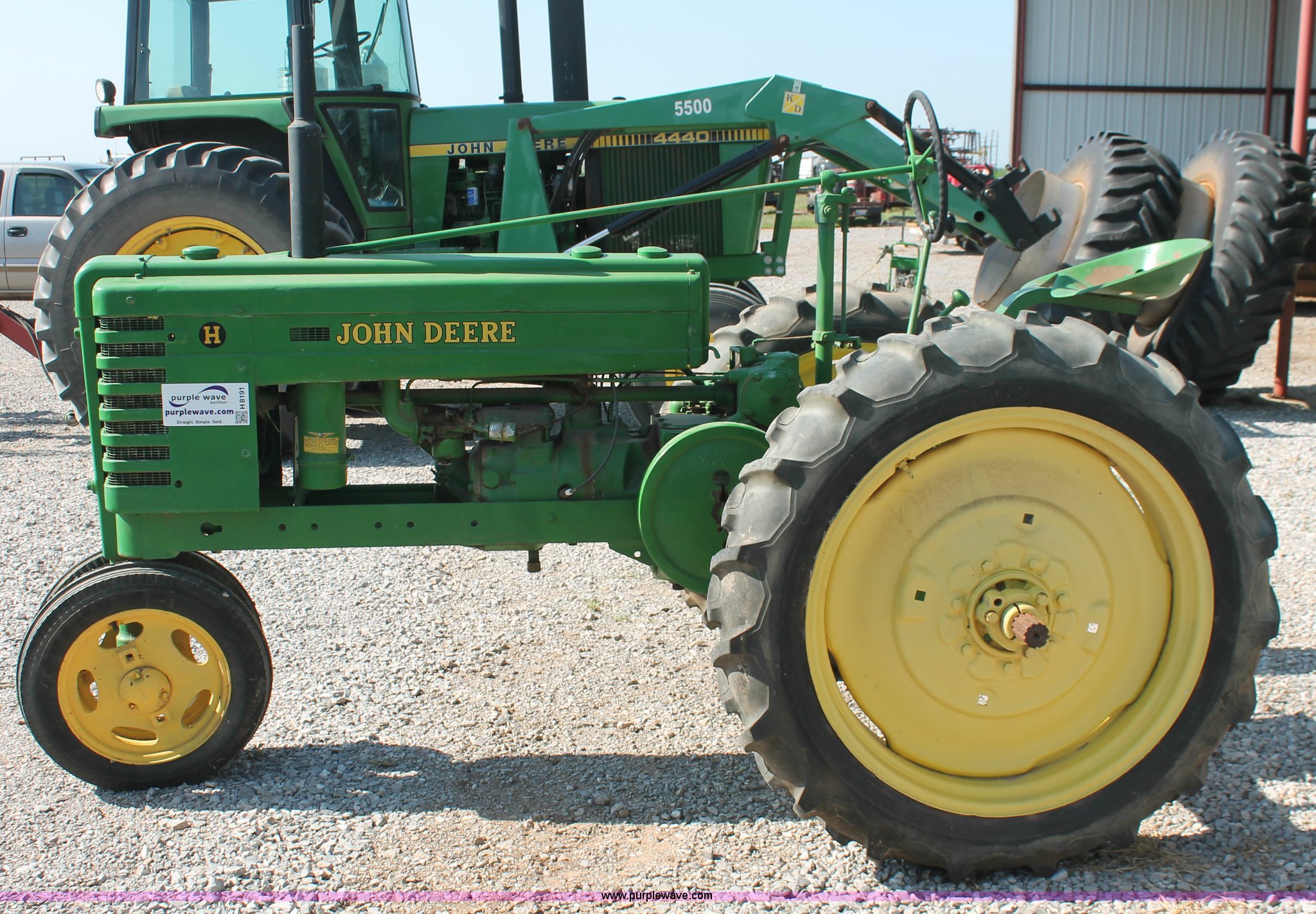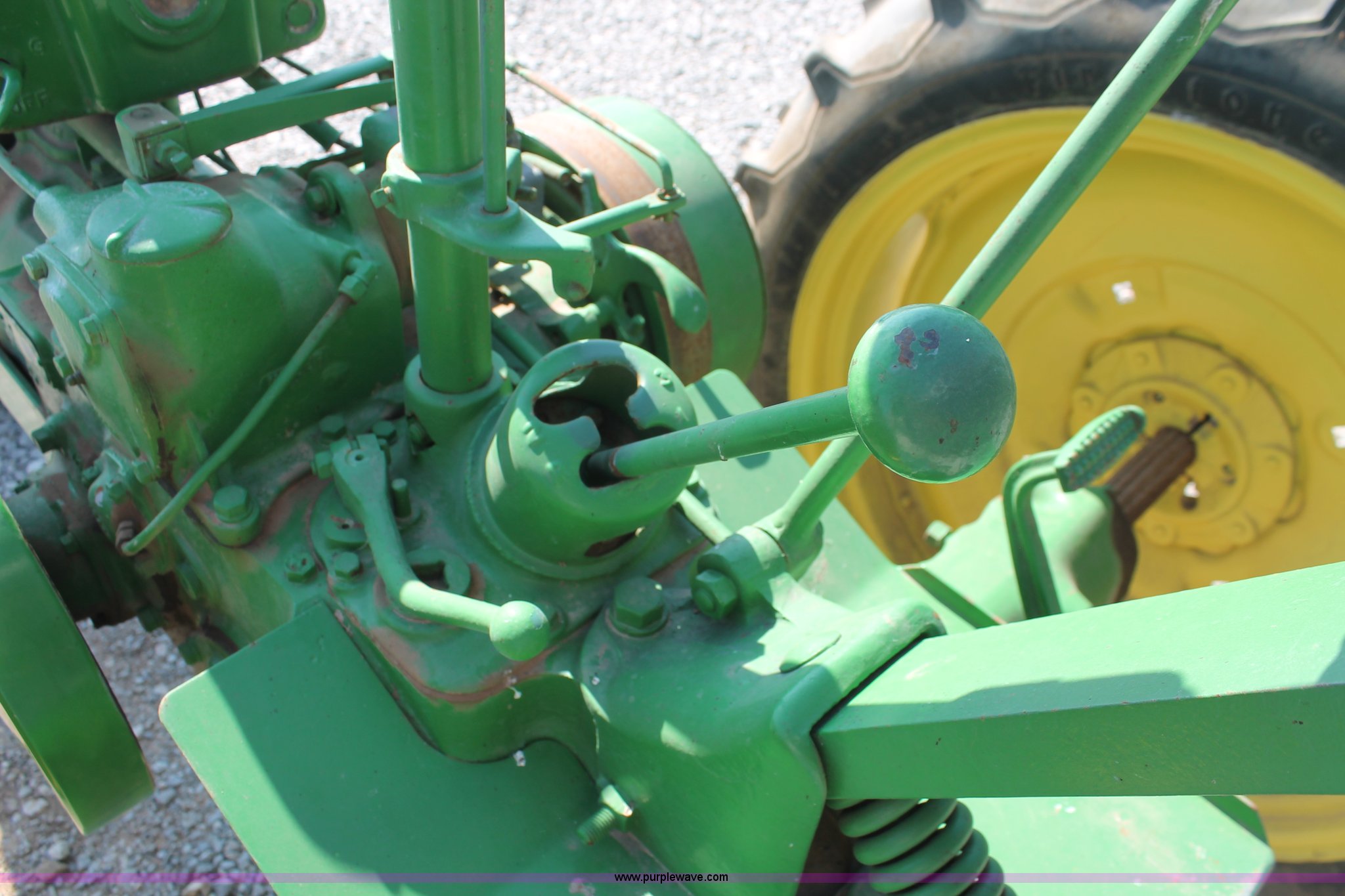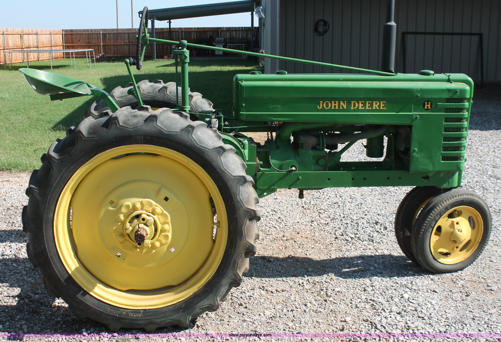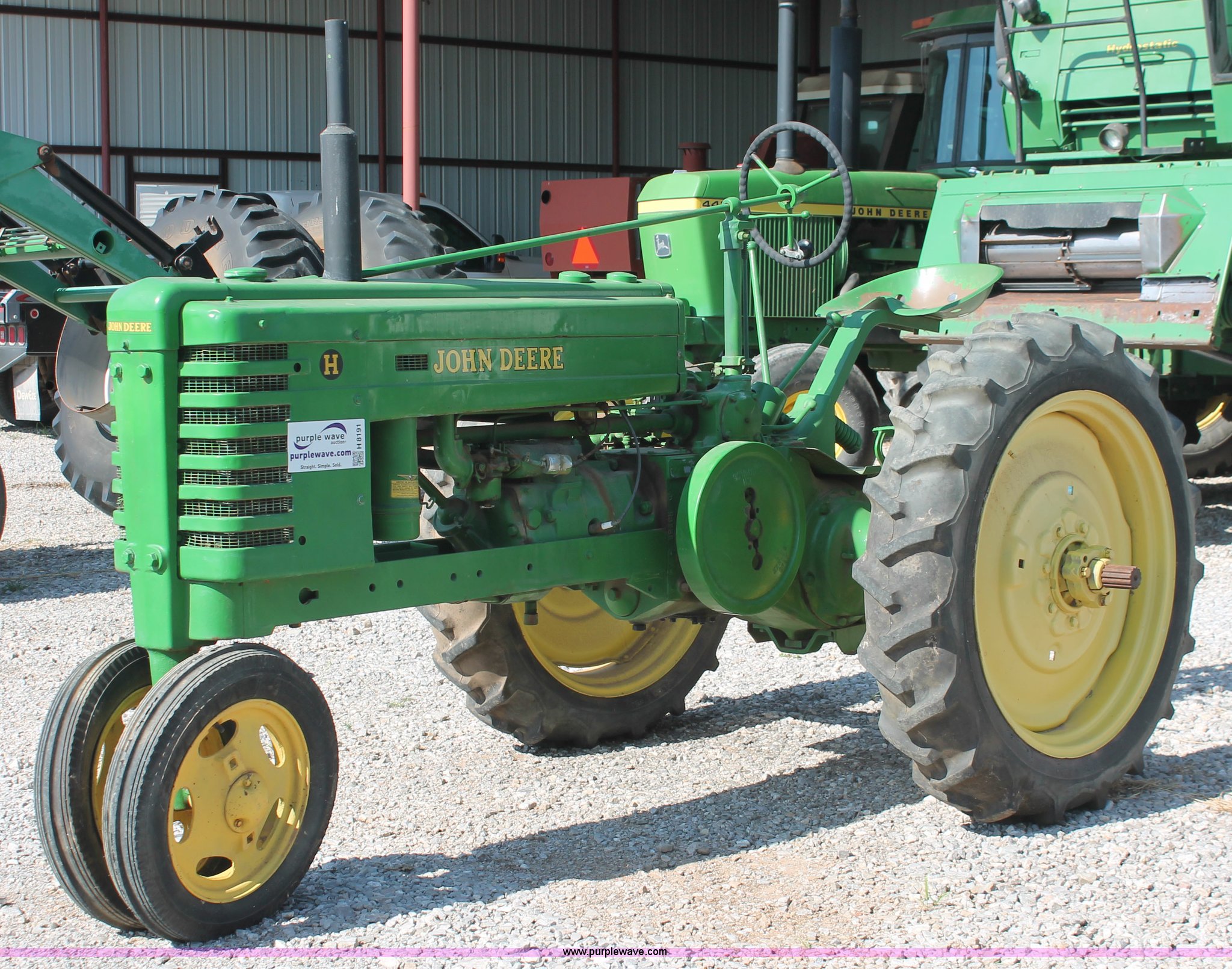 Purple Wave is selling a used Tractor in Oklahoma. This item is a 1942 John Deere H tractor with the following: John Deere 1.6L two cylinder gas/kerosene engine, 12 HP, Currently runs on gas, 3F-1R gears, Spring suspension seat, 540 PTO, Draw bar, 4.00-15 front tires, 9.5-32 rear tires, Serial 44636