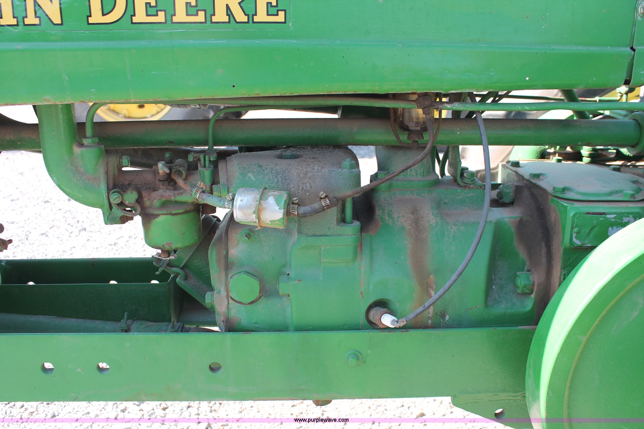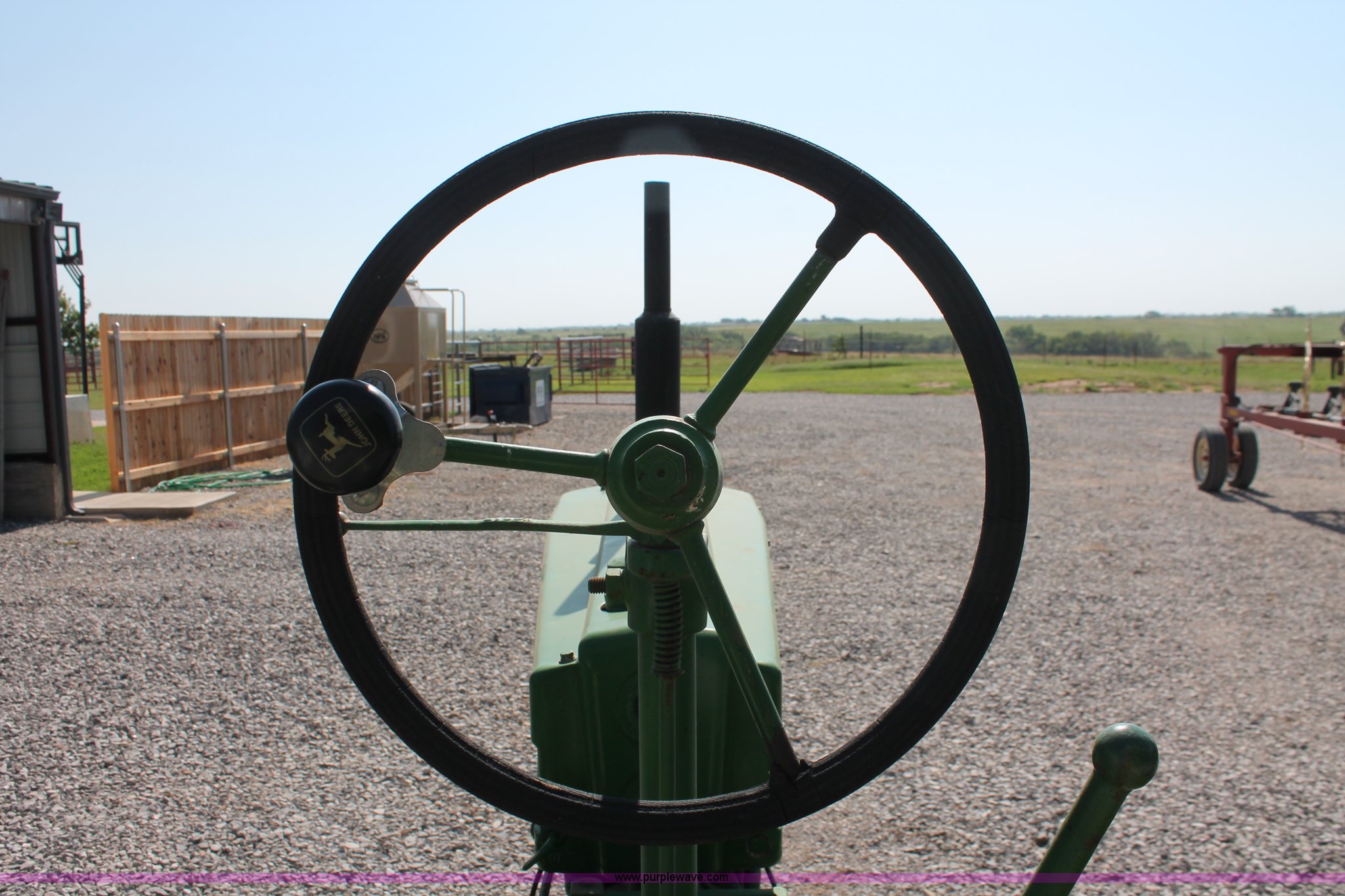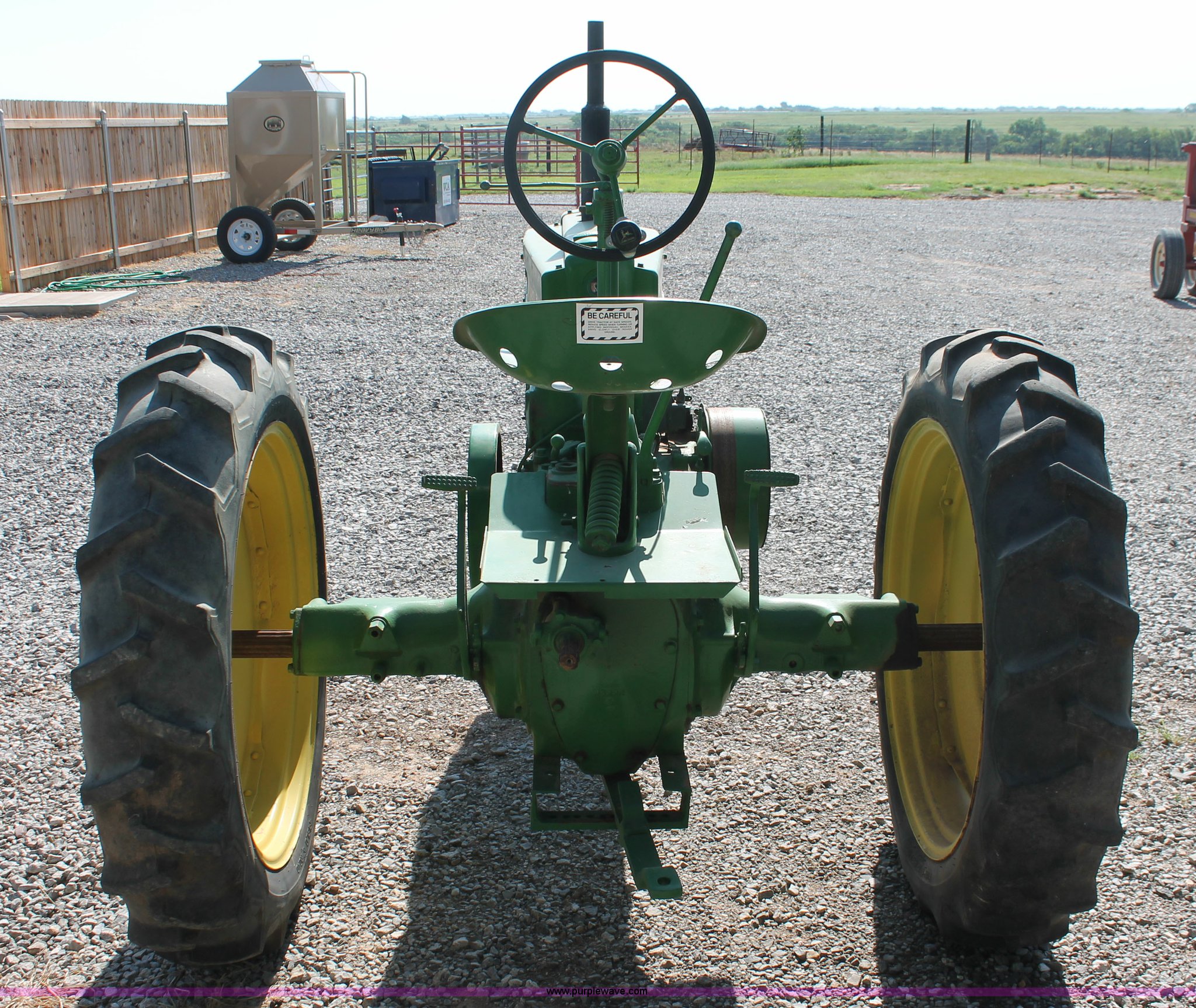Purple Wave is selling a used Tractor in Oklahoma. This item is a 1942 John Deere H tractor with the following: John Deere 1.6L two cylinder gas/kerosene engine, 12 HP, Currently runs on gas, 3F-1R gears, Spring suspension seat, 540 PTO, Draw bar, 4.00-15 front tires, 9.5-32 rear tires, Serial 44636