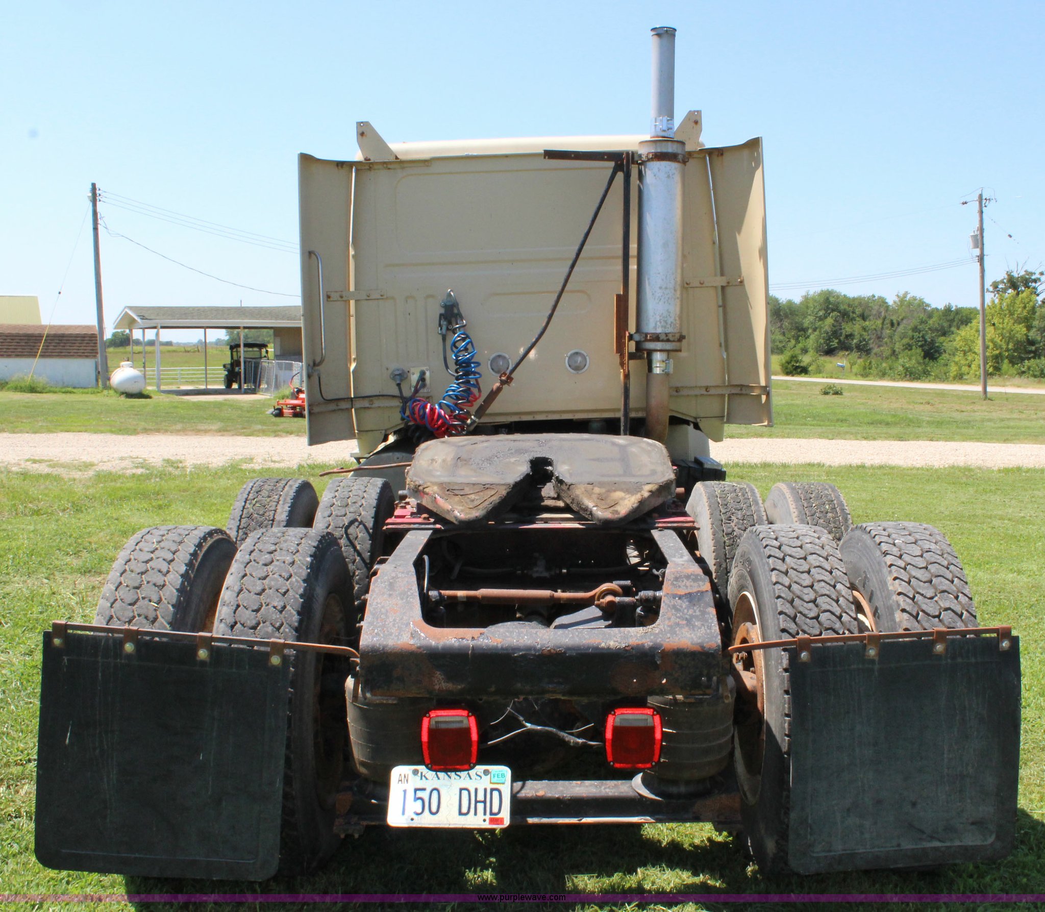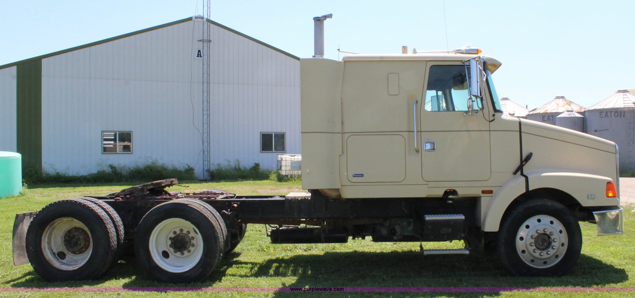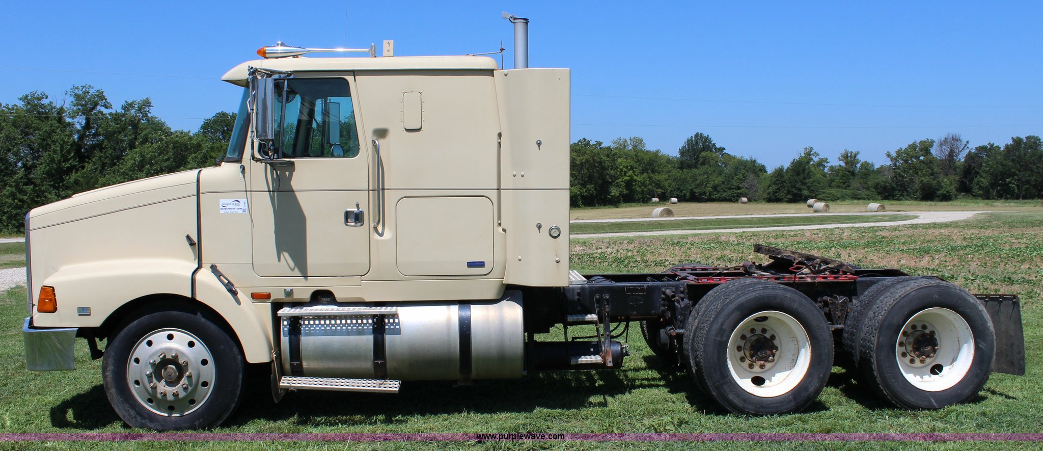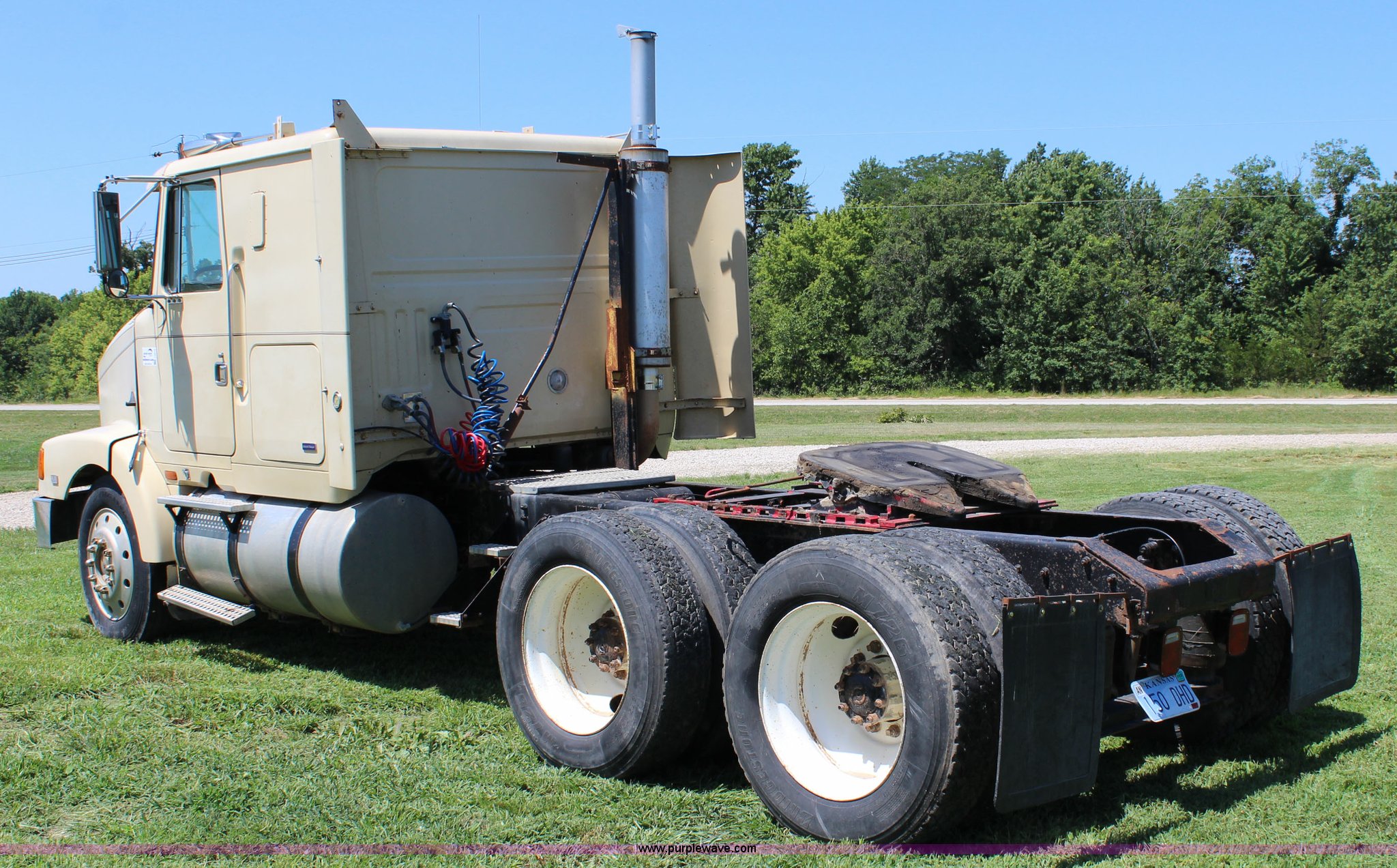 Purple Wave is selling a used Truck Tractor in Kansas. This item is a 1994 Volvo White semi truck with the following: 598,514 miles on odometer, Volvo six cylinder diesel engine, Volvo six speed manual transmission, Tandem axle, Inter-axle differential lock, AC and heat, AM/FM, Air suspension seat, 34" sleeper, Single bed, Air over hydraulic clutch, PTO, Visor, Single exhaust stack, Recently replaced, Sliding fifth wheel plate, Air suspension, Air brakes, 285/75R24.5 tires, GVWR 50,000 lbs, FAWR 12,000 lbs, IAWR 19,000 lbs, RAWR 19,000 lbs, Clutch has small leak