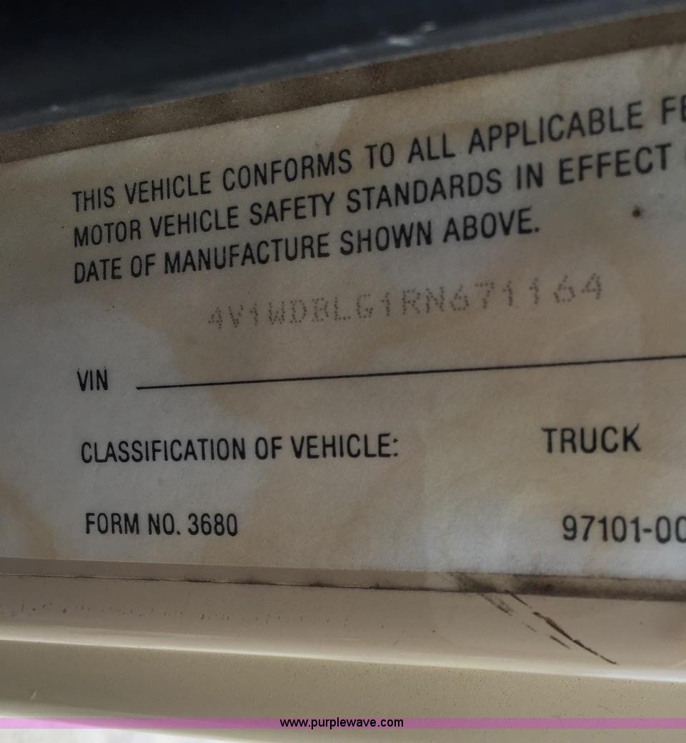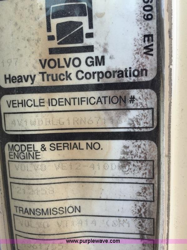 1994 Volvo White semi truck. 598,514 miles on odometer, Volvo six cylinder diesel engine, Volvo six speed manual transmission, Tandem axle, Inter-axle differential lock, AC and heat, AM/FM, Air suspension seat, 34" sleeper Single bed, Air over hydraulic clutch, PTO, Visor, Single exhaust stack Recently replaced, Sliding fifth wheel plate, Air suspension, Air brakes, 285/75R24.5 tires, GVWR 50,000 lbs, FAWR 12,000 lbs, IAWR 19,000 lbs, RAWR 19,000 lbs, Clutch has small leak. Title distribution may be delayed up to 14 days from verification of funds. 4V1WDBLG1RN671164. Garnett, KS 66032