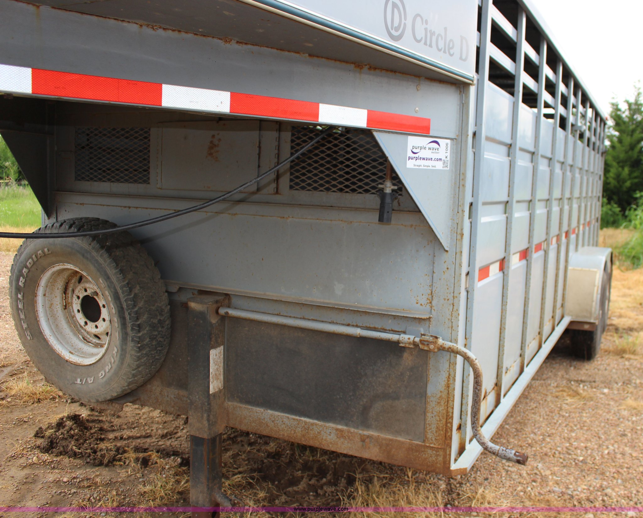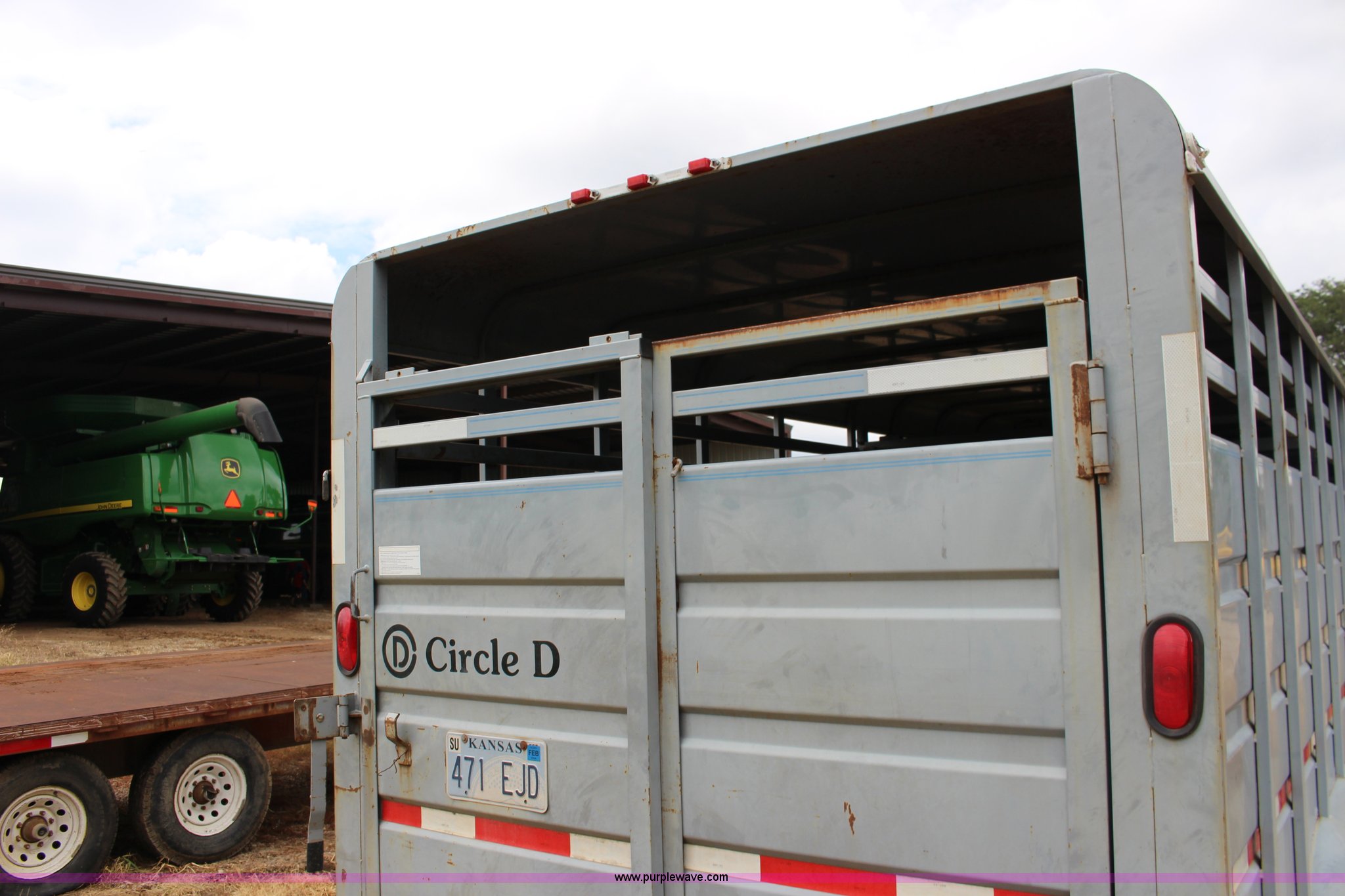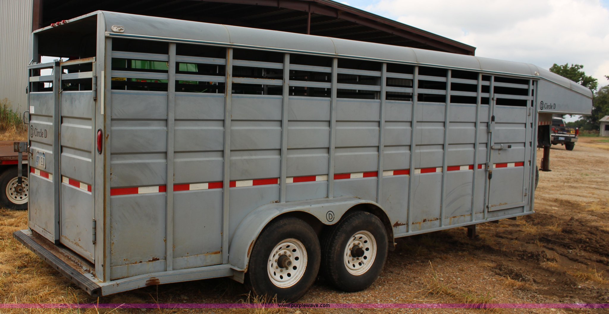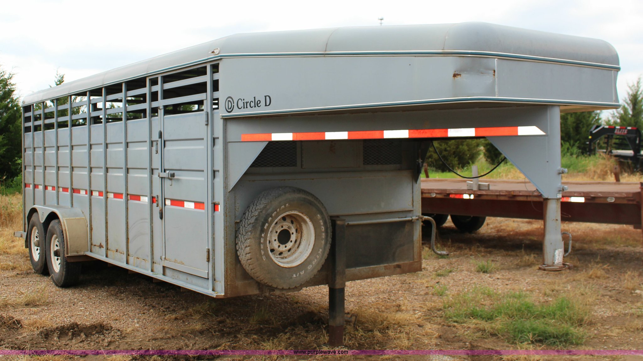 Purple Wave is selling a used Livestock Trailer in Kansas. This item is a 1999 Circle D livestock trailer with the following: 20'L x 7'W, Center divider gate, Wood floor, 16" tires