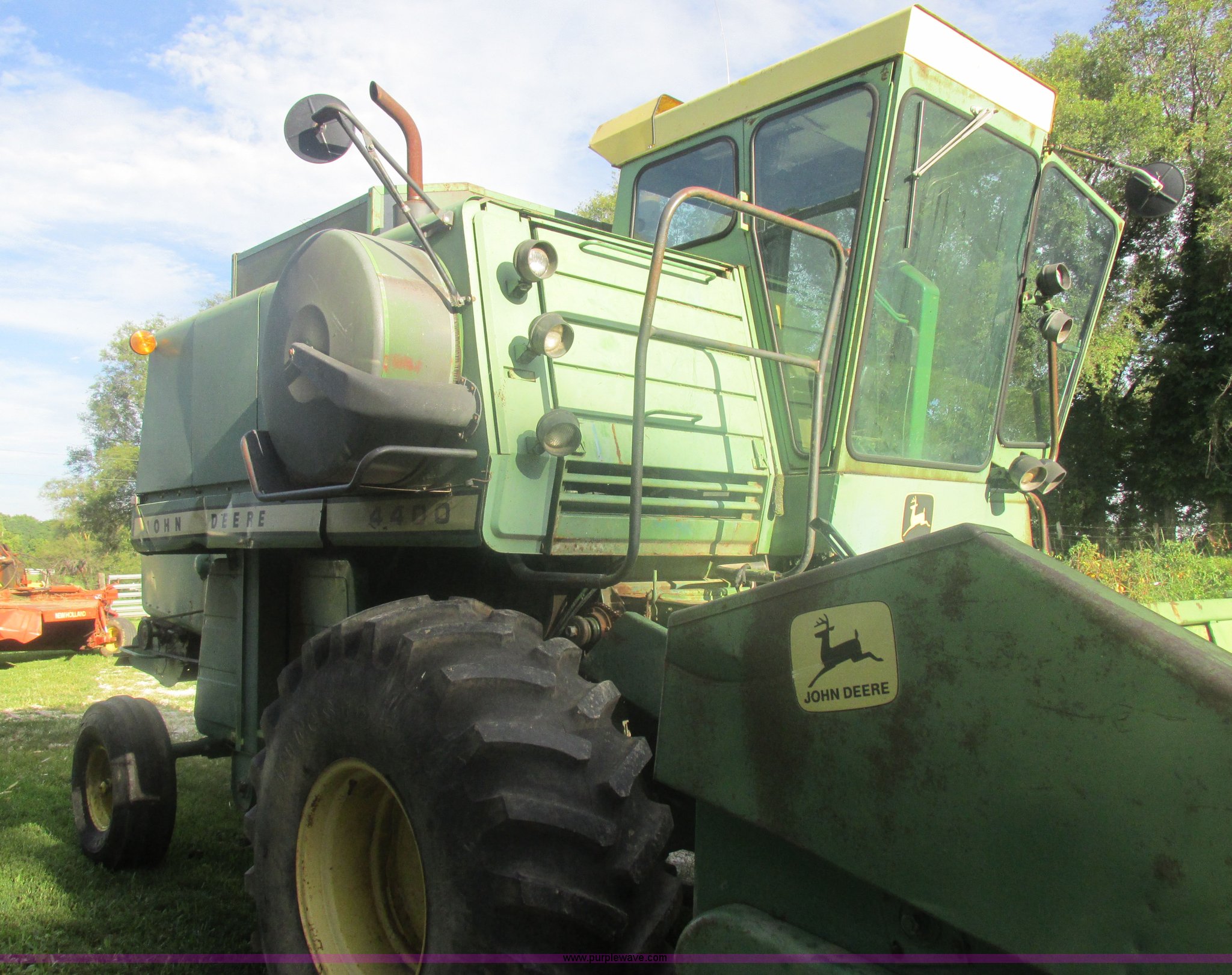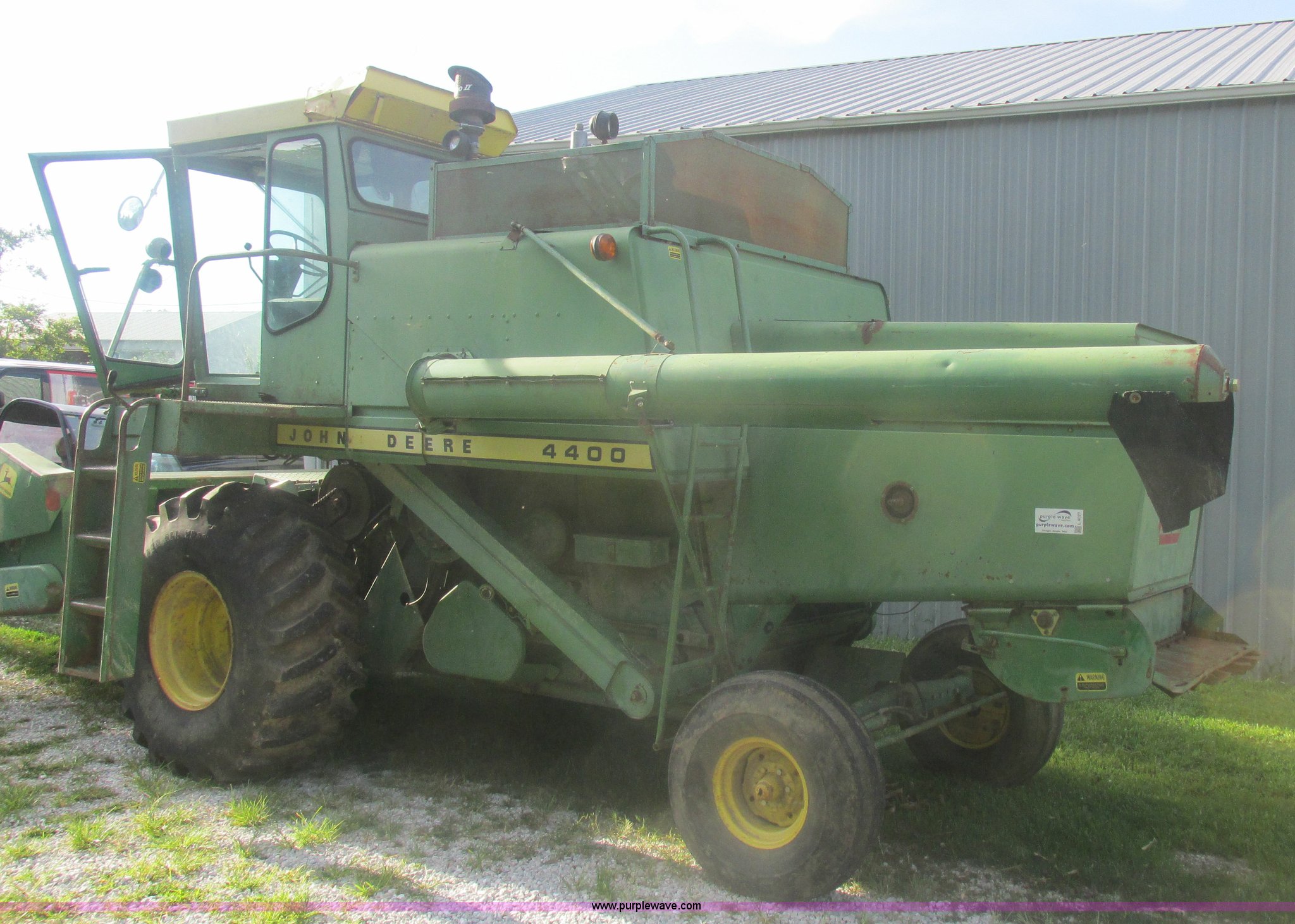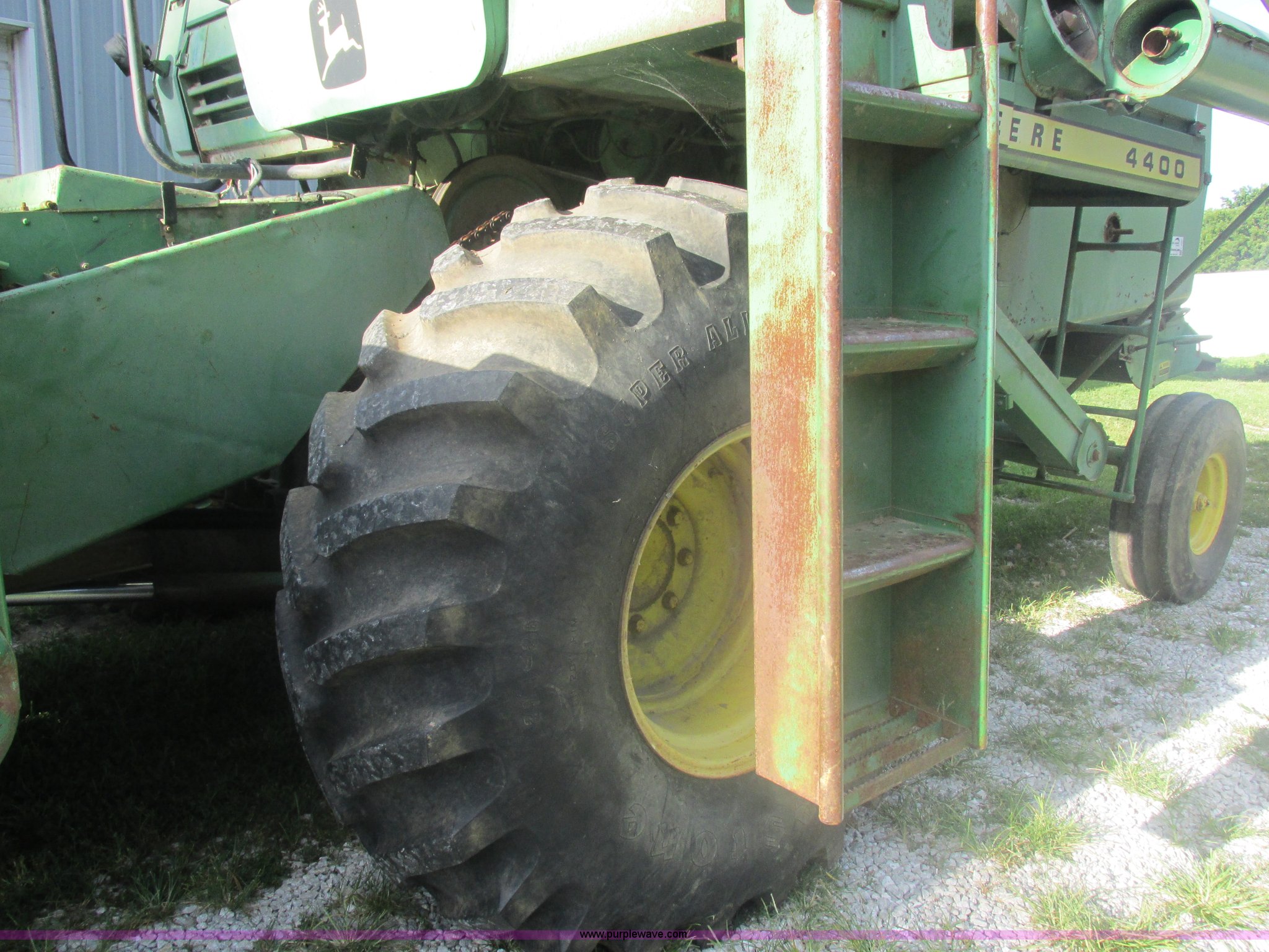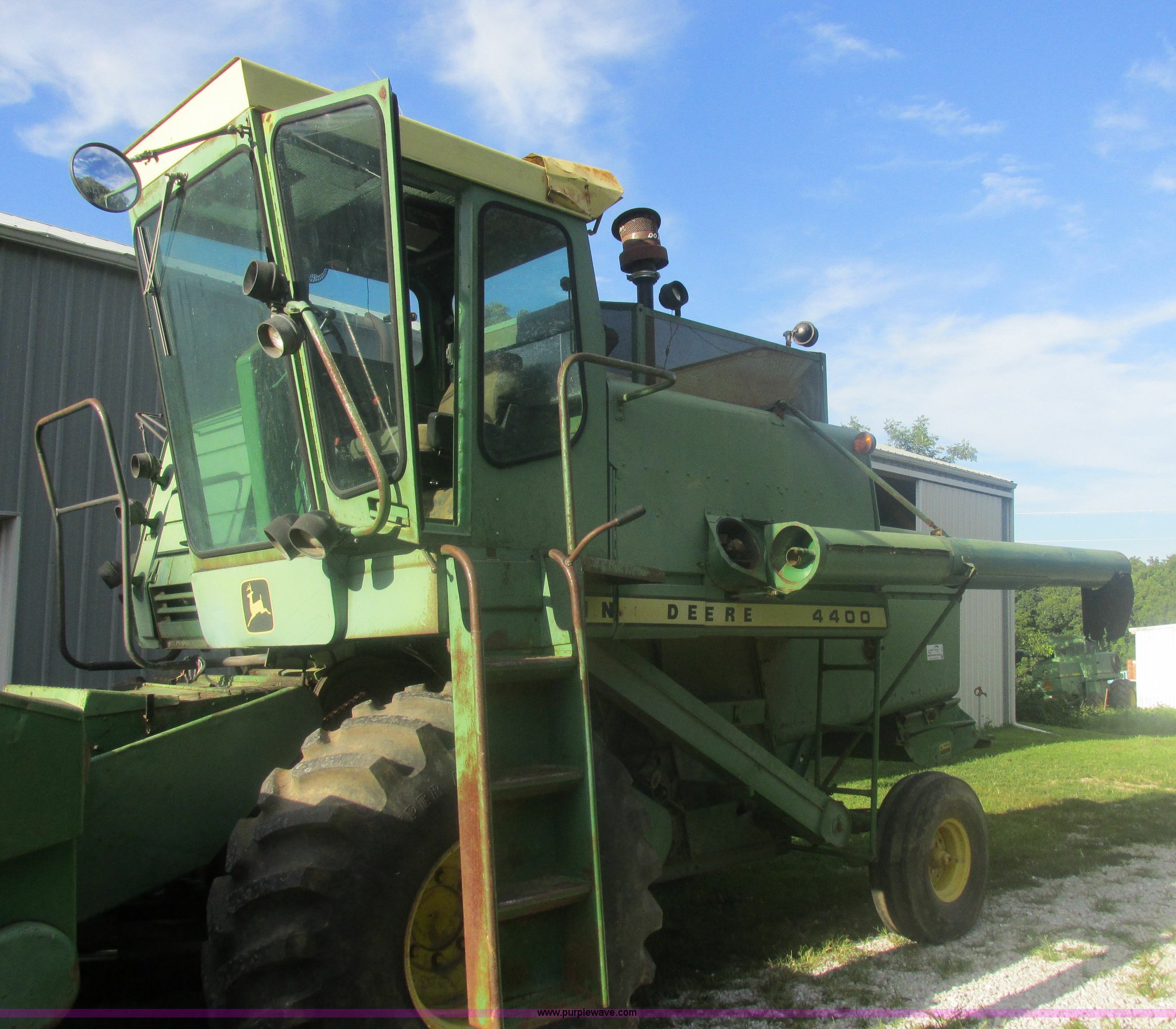 Purple Wave is selling a used Combine in Missouri. This item is a 1976 John Deere 4400 combine with the following: 3,610 engine hours on meter, John Deere six cylinder diesel engine, Manual transmission, 4F gears, AM/FM, Tilt steering wheel, Suspension seat, 23.1-26 front tires, 11-16 rear tires, Non-operational AC, Head not included, Serial 203617