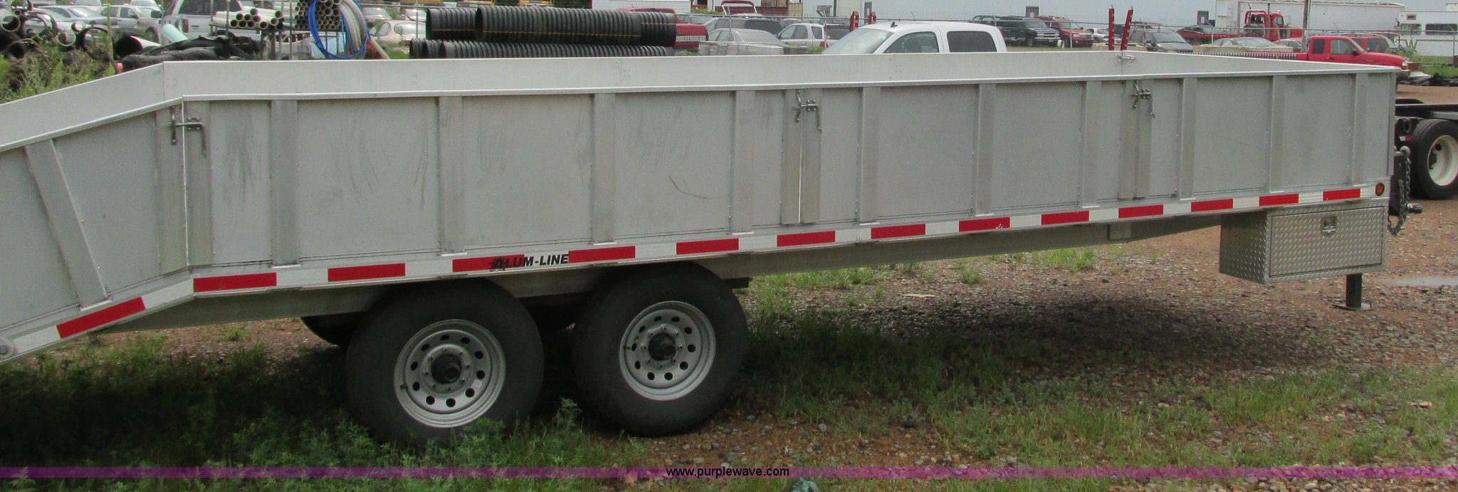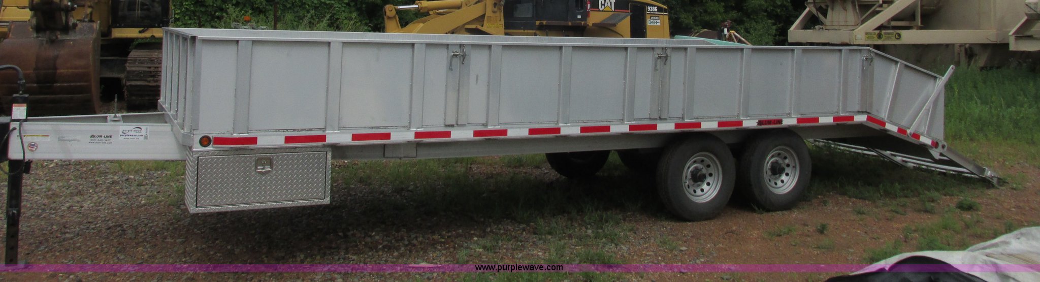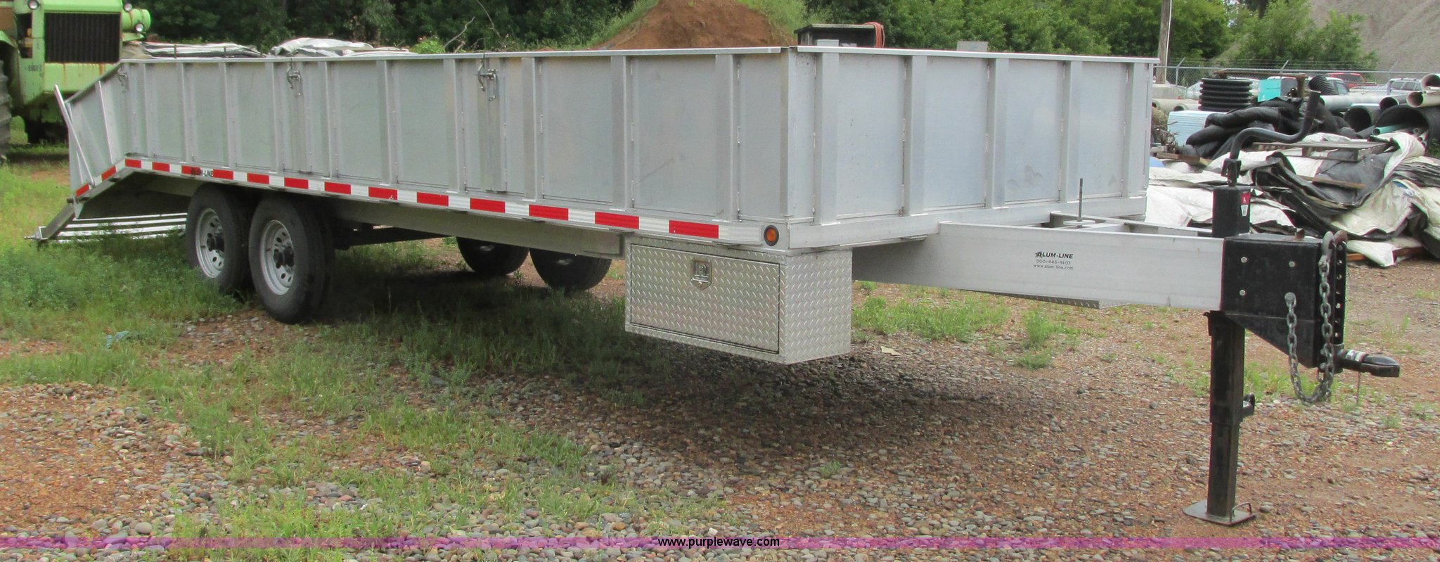 Purple Wave is selling a used Equip. Trailer in Minnesota. This item is a 2008 Alum-Line equipment trailer with the following: 20'L x 101"W main deck, 4'L dovetail, 2'H removable aluminum sides, (2) 46"L x 46"W fold down loading ramps, 24" floor tie down, (2) under mount toolboxes, Aluminum construction, 2 5/16" ball hitch, Jack stand, Tandem axle, 235/80R16 tires, GVWR 15,400 lbs
