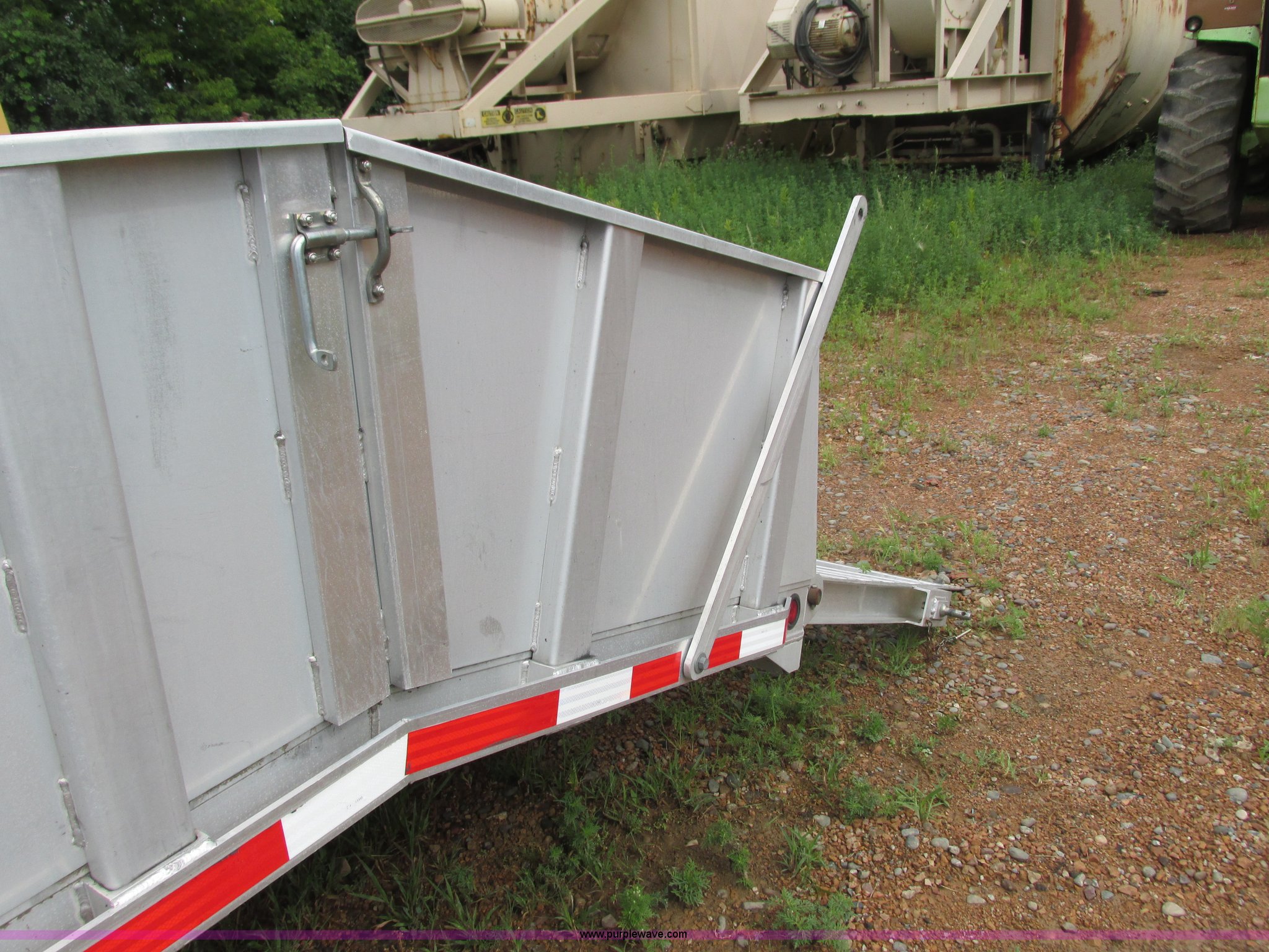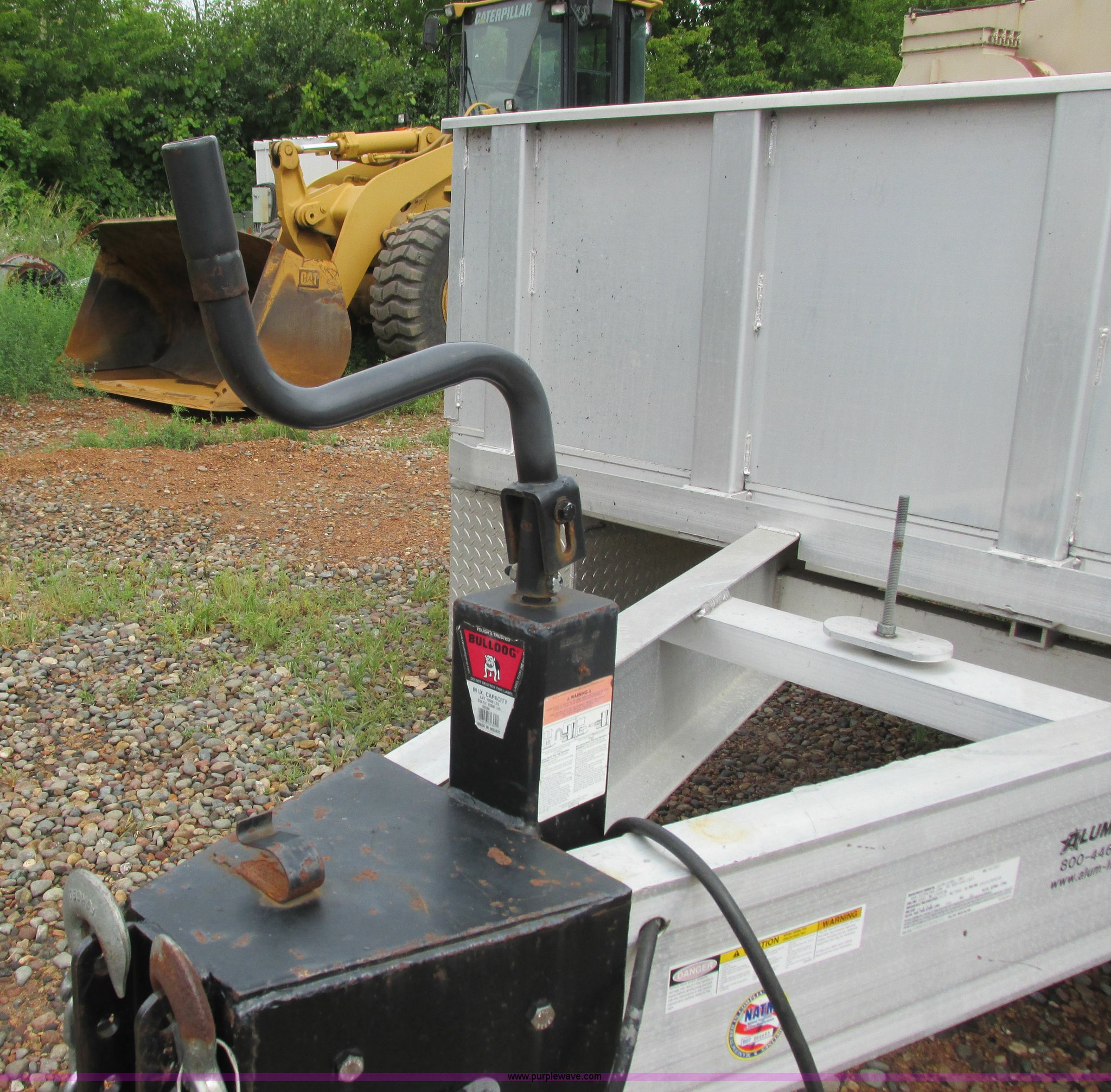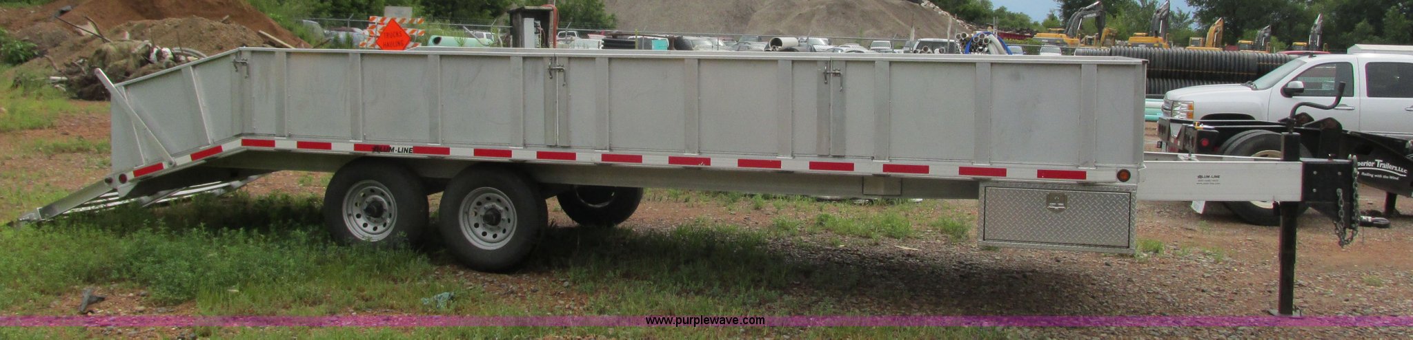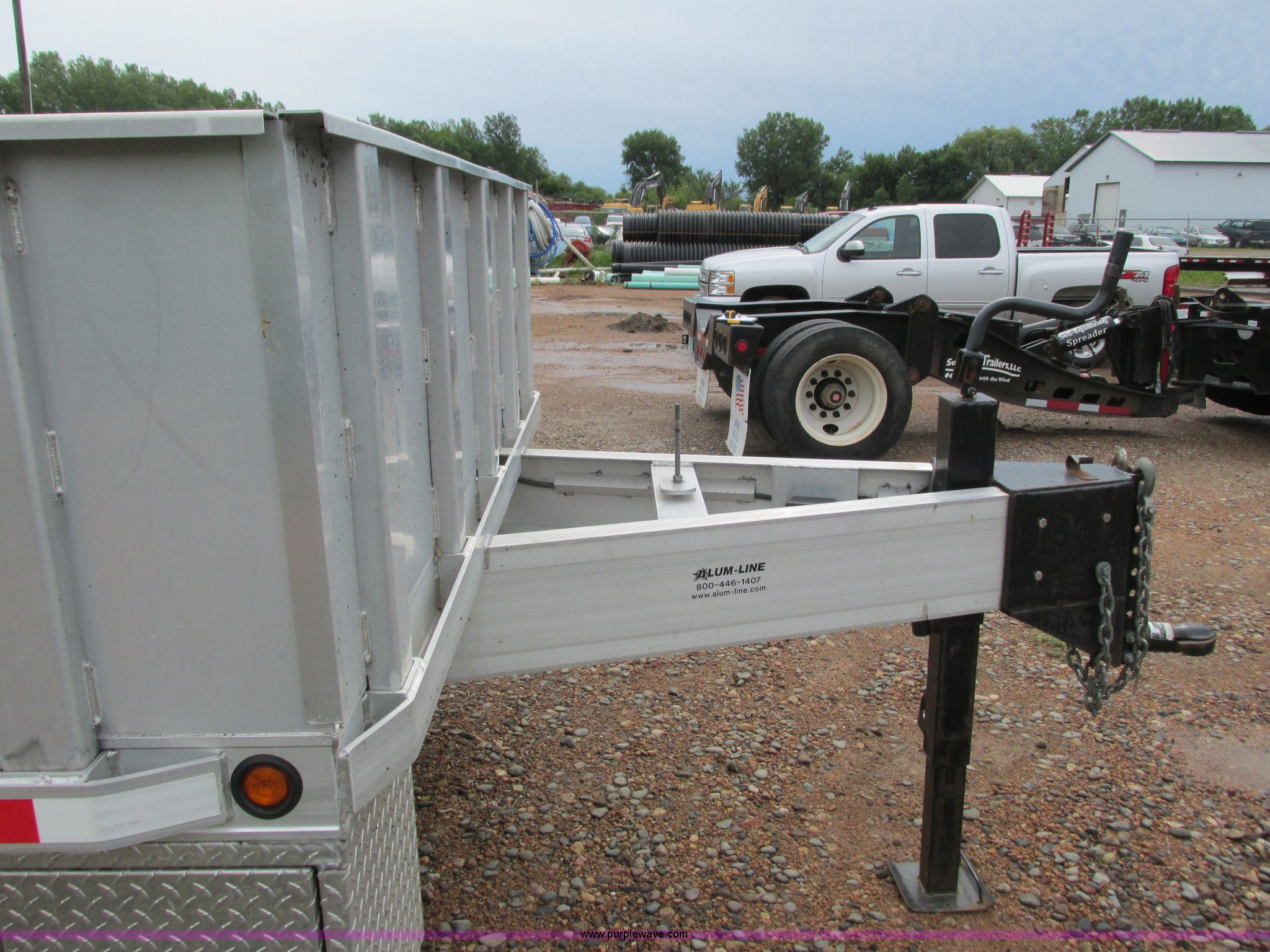 Purple Wave is selling a used Equip. Trailer in Minnesota. This item is a 2008 Alum-Line equipment trailer with the following: 20'L x 101"W main deck, 4'L dovetail, 2'H removable aluminum sides, (2) 46"L x 46"W fold down loading ramps, 24" floor tie down, (2) under mount toolboxes, Aluminum construction, 2 5/16" ball hitch, Jack stand, Tandem axle, 235/80R16 tires, GVWR 15,400 lbs