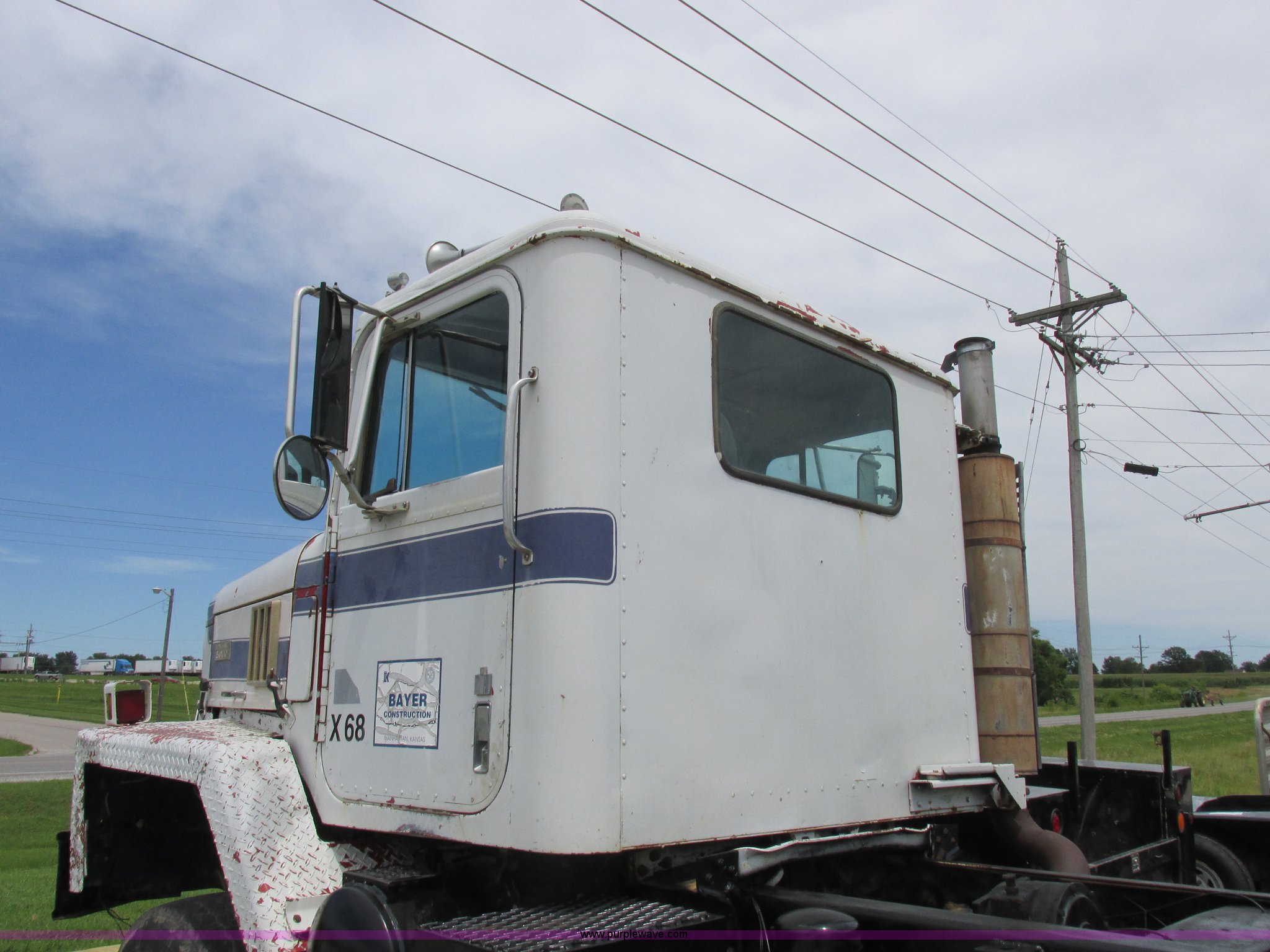 1979 International Paystar 5000 truck cab and chassis. 43,638 miles on odometer, 6,021 hours on meter, 5,743 engine hours on meter, Cummins diesel engine, Eaton Fuller 955DLL six speed manual transmission, Tandem axle, Heat, Air suspension seat, PTO, Single exhaust stack, Pintle hitch, Spring suspension, Air brakes, 425/65R22.5 tires. D3217HGB16125. Williams Logging. 3330 W Arrow. Marshall, MO 65340