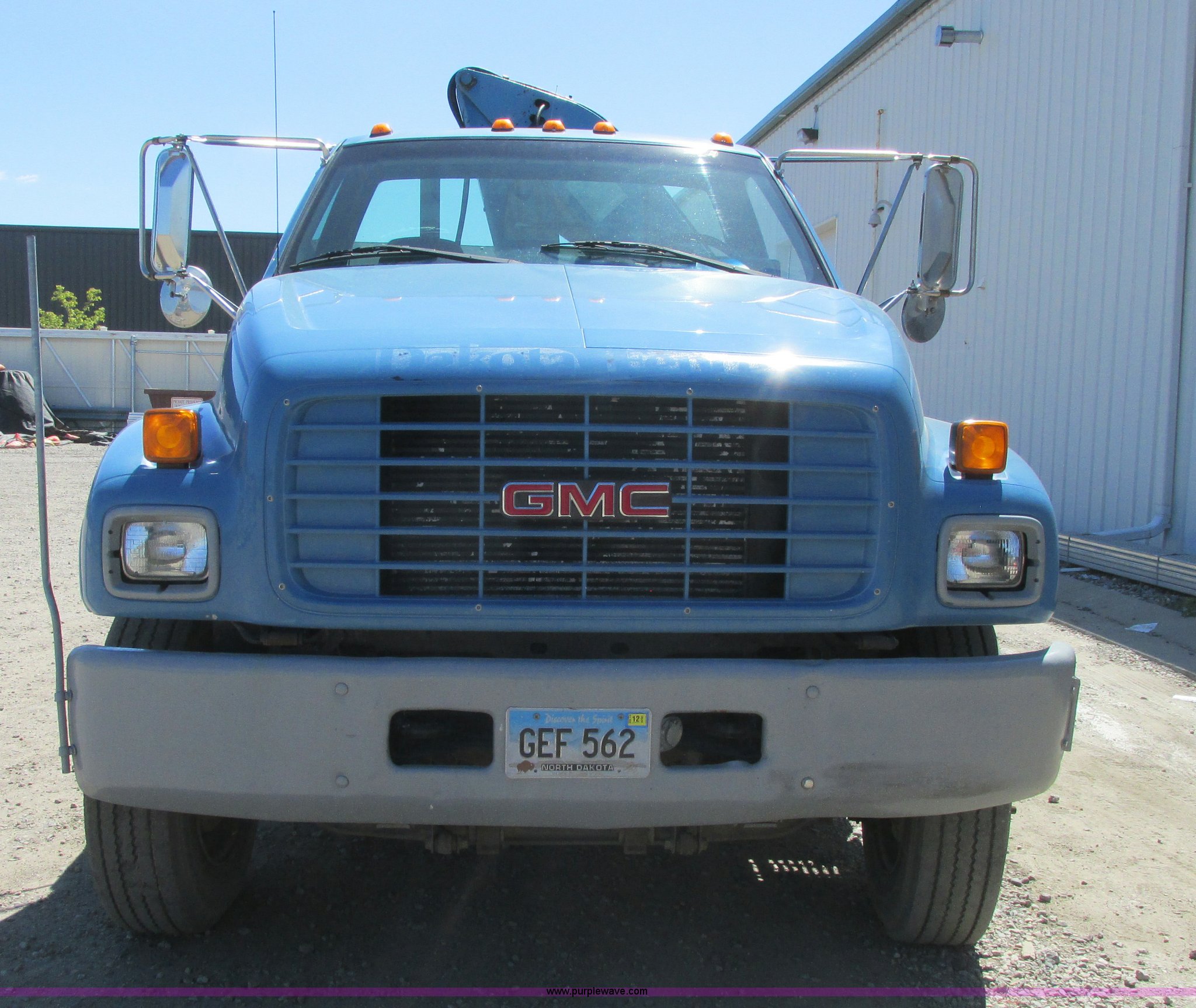 Purple Wave is selling a used Crane Truck in North Dakota. This item is a 1999 GMC C7500 flatbed truck with crane with the following: 63,188 miles on odometer, Caterpillar 3126 7.2L six cylinder turbo diesel engine, Serial ZA556521, Six speed manual transmission, Heat, AM, PTO, 18'L x 94"W steel flatbed, Hiab hydraulic crane, 6,500 lbs maximum lift capacity, 16.5' maximum reach, Toolboxes, Dual fuel tanks, Michelin X2E 255/80R22.5 tires