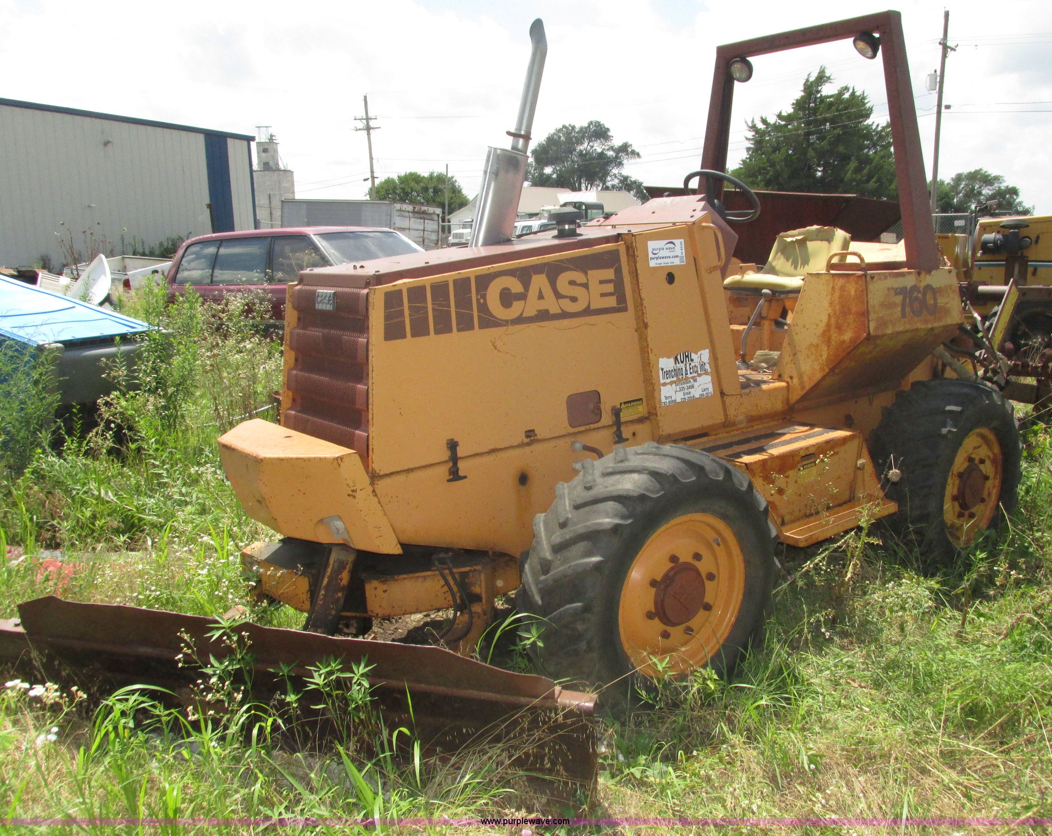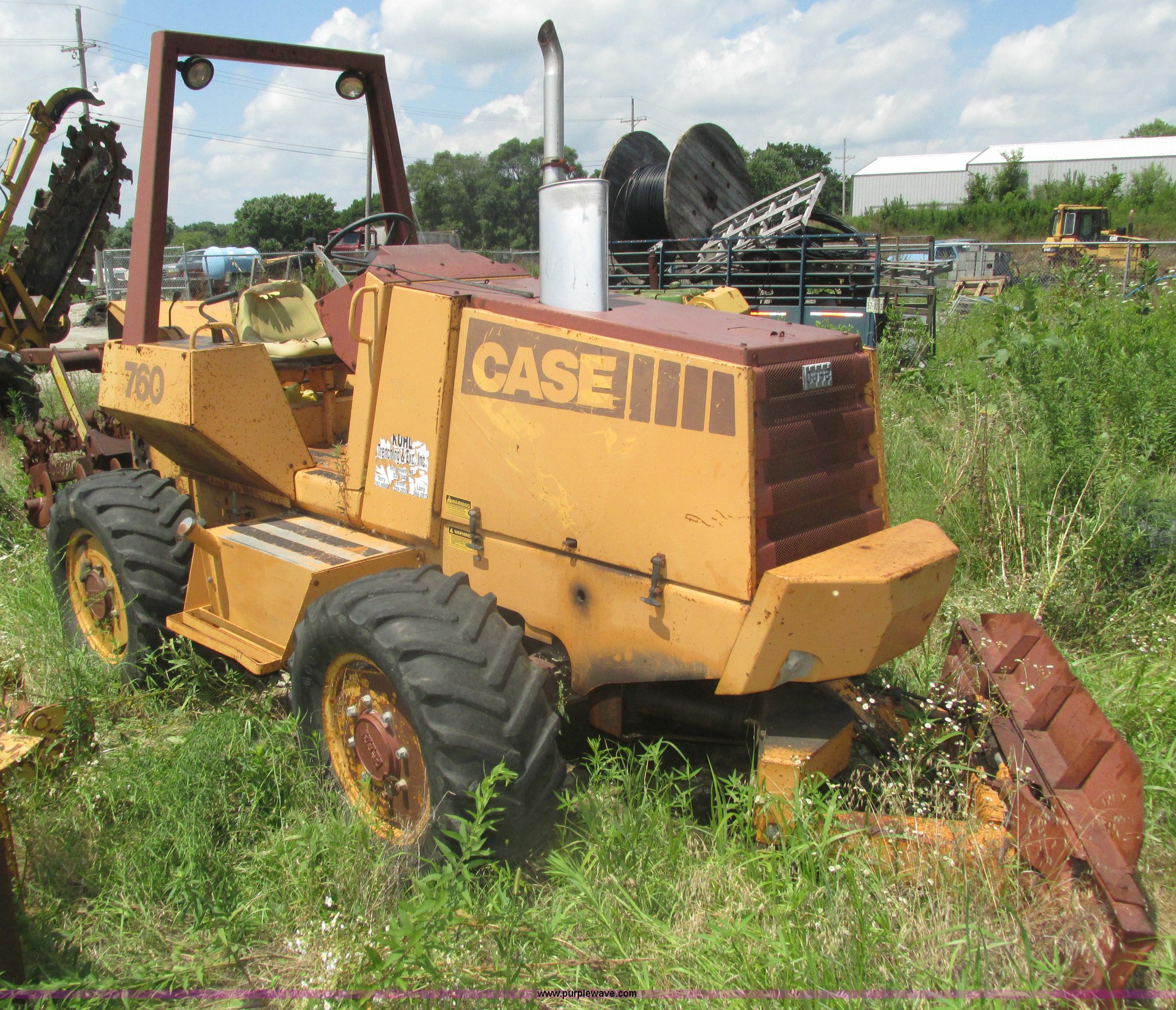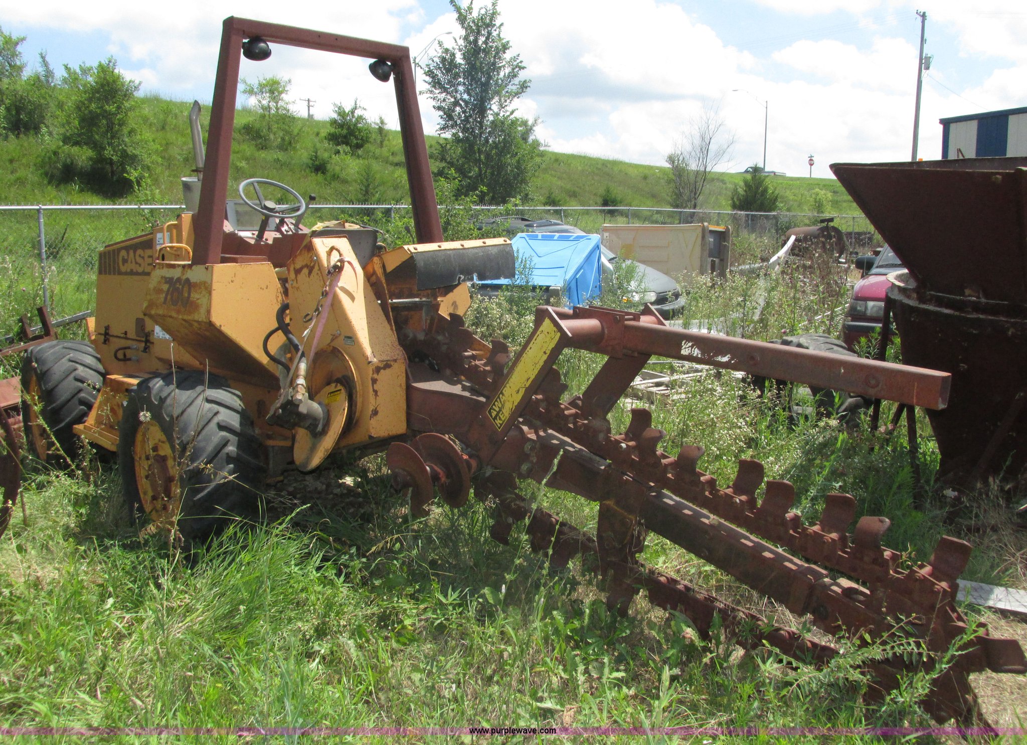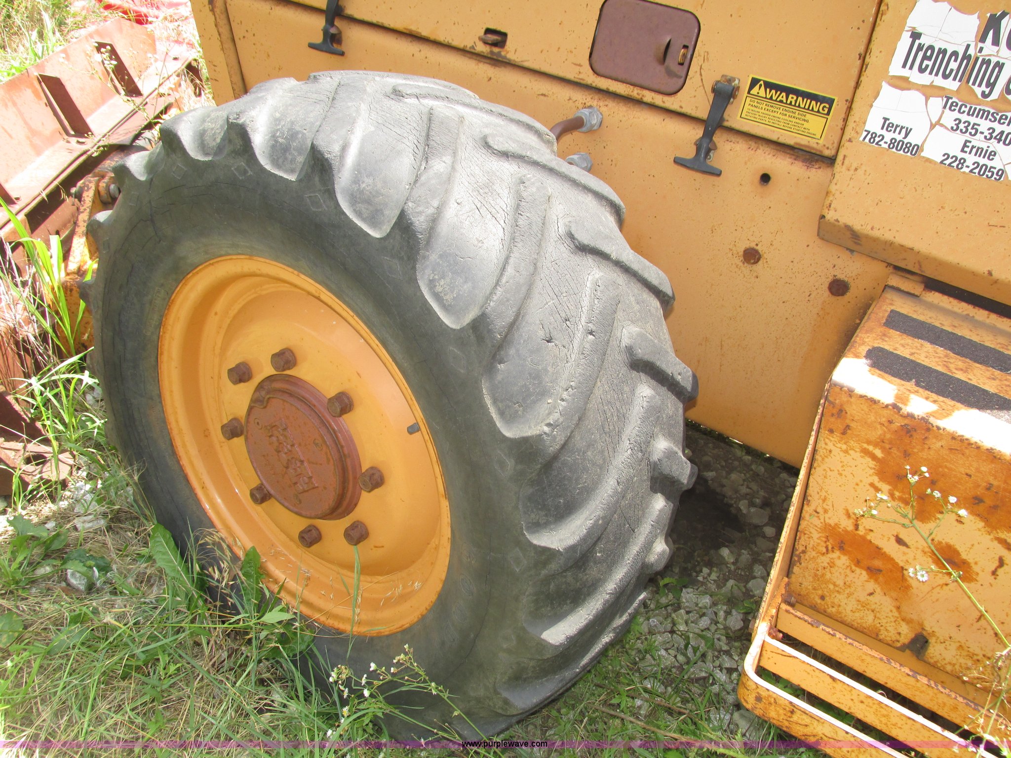 Purple Wave is selling a used Trencher or Rock Saw in Nebraska. This item is a 1988 Case 760 trencher with the following: 2,596 hours on meter, Four cylinder diesel engine, Block heater, 8' trenching boom, Model H6714R, Serial JAF0005733, Approximately 7' digging depth, Recently replaced chain, Safety bar, Dual discharge augers, Six-way back fill blade, 81"W x 18"H, 38 x 14.00-20 tires, Unit will not move, Non-operational hydraulics, Serial JAF0003051