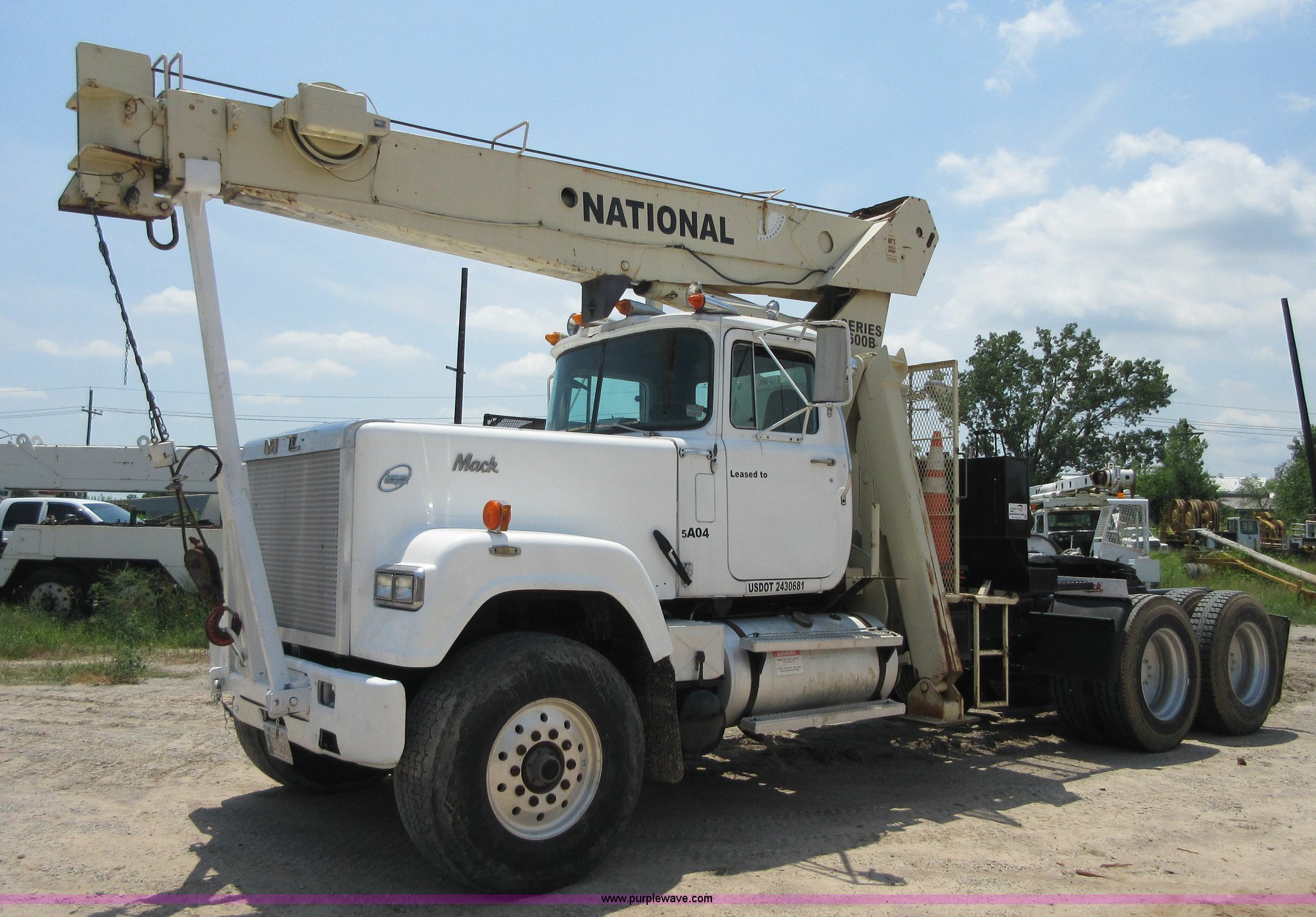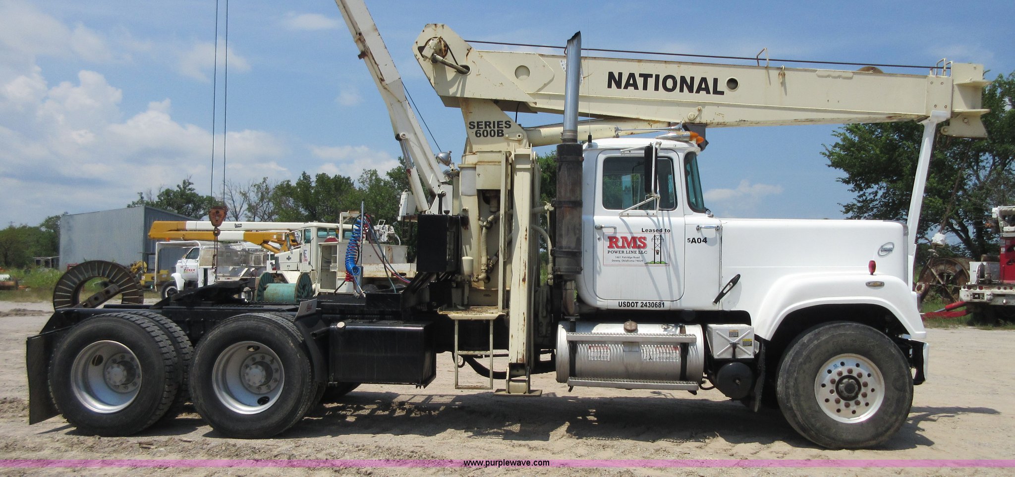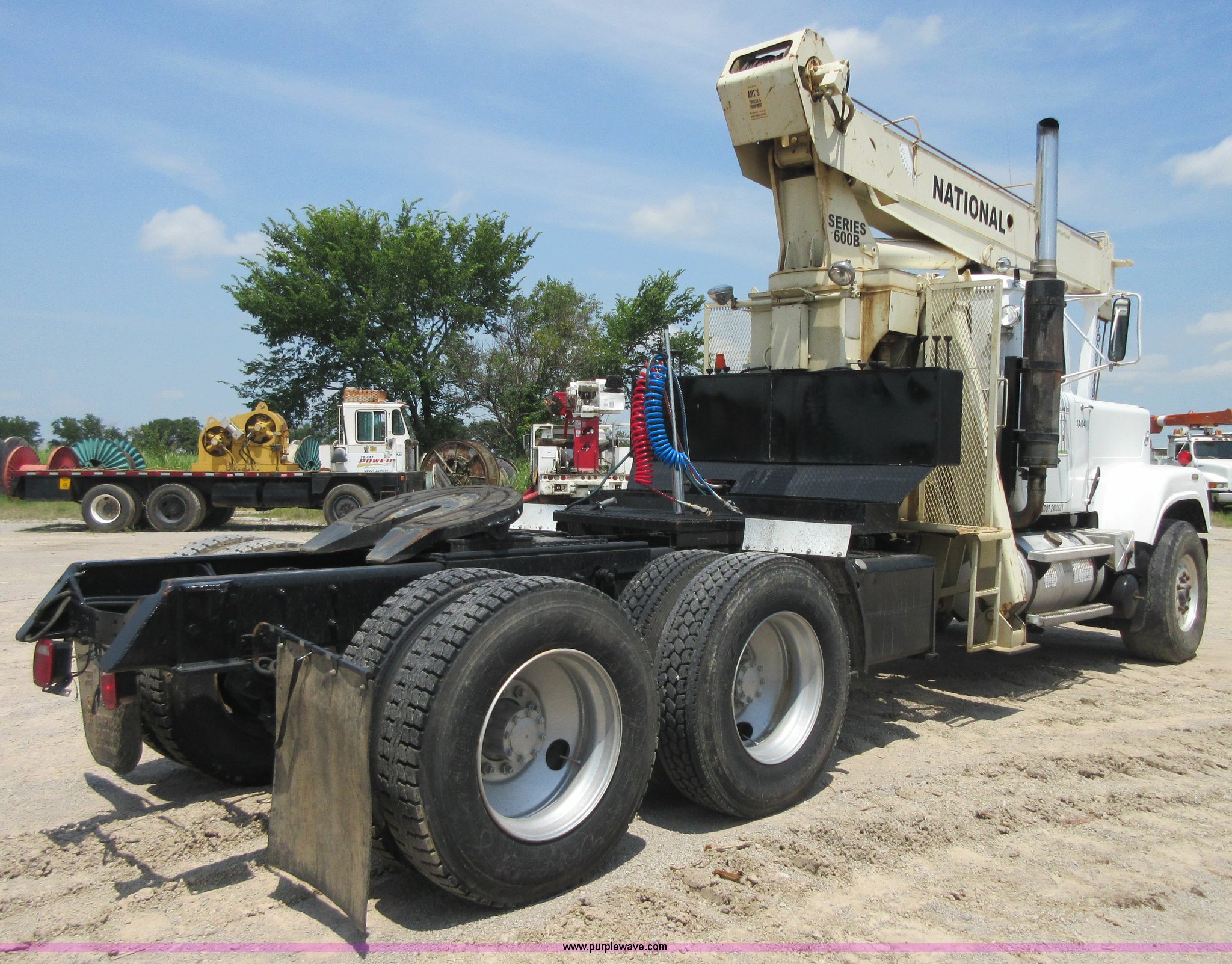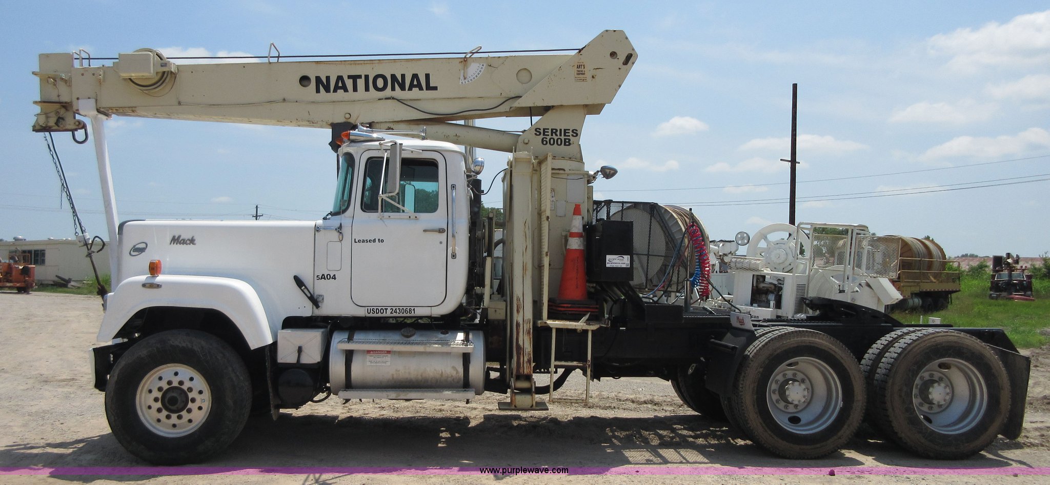 Purple Wave is selling a used Crane Truck in Oklahoma. This item is a 1989 Mack RW713 crane truck with the following: 688,062 miles on odometer, Mack E6 11.0L L6 turbo diesel engine, Manual transmission, Tandem axle, AC and heat, Air suspension seat, Trailer brake controller, PTO, National 638B crane, Serial 20374, 49' maximum lift height, 28,000 lbs maximum lift capacity, Outriggers, Boom rotation, Telescopic boom type, Dual fuel tanks, Single exhaust stack, Camelback spring suspension, Air brakes, Engine brake, 225" wheelbase, 425/65R22.5 front tires, 11R24.5 rear tires, GVWR 64,000 lbs, FAWR 20,000 lbs, IAWR 22,000 lbs, RAWR 22,000 lbs