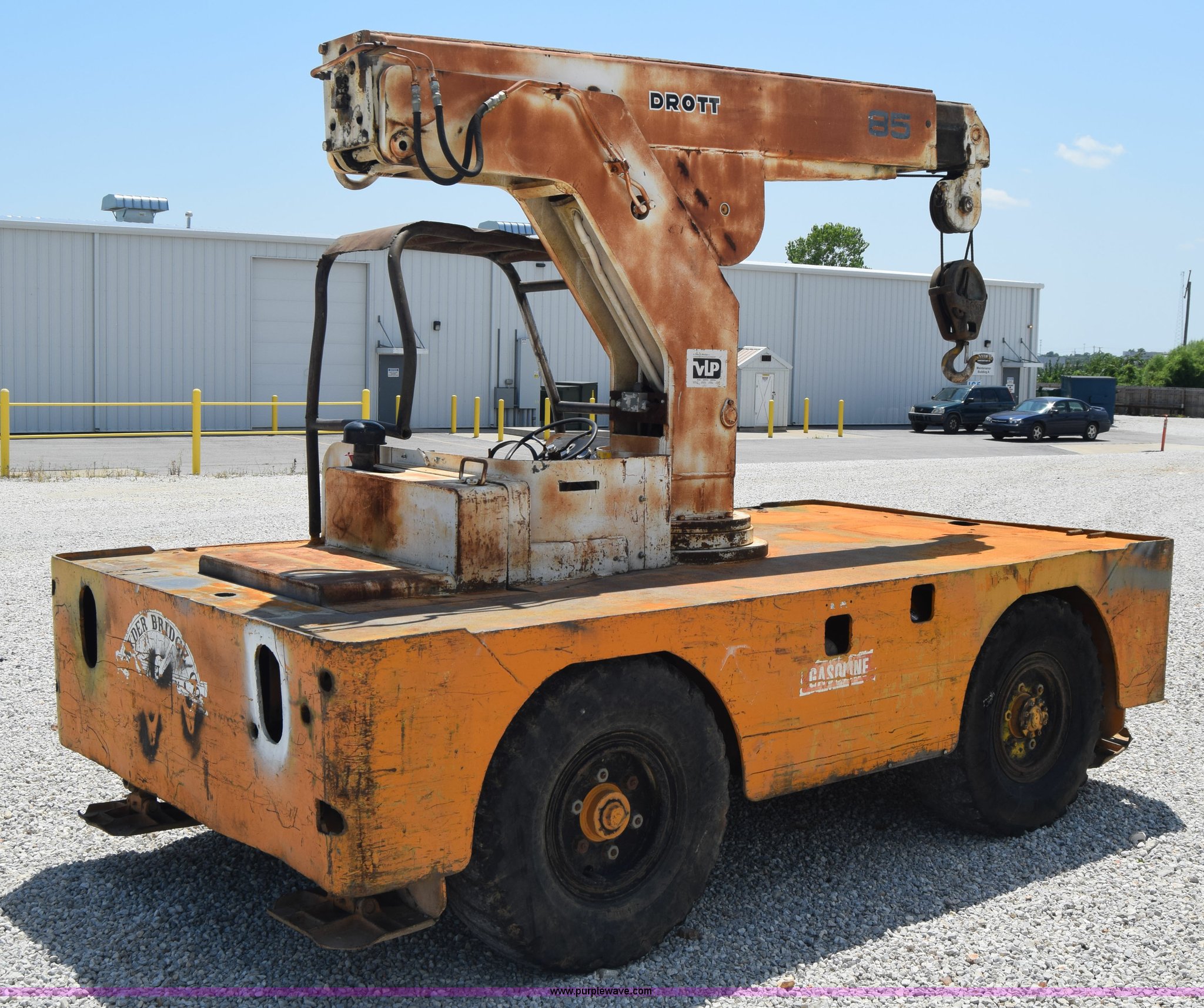 Purple Wave is selling a used Truck Crane in Missouri. This item is a Drott 85-RM2 crane with the following: 1,077 hours on meter, Four cylinder gas engine, Hydrostatic transmission, Four lever controls, 10' boom, Four outriggers, 10.00R15 tires, Serial 1782