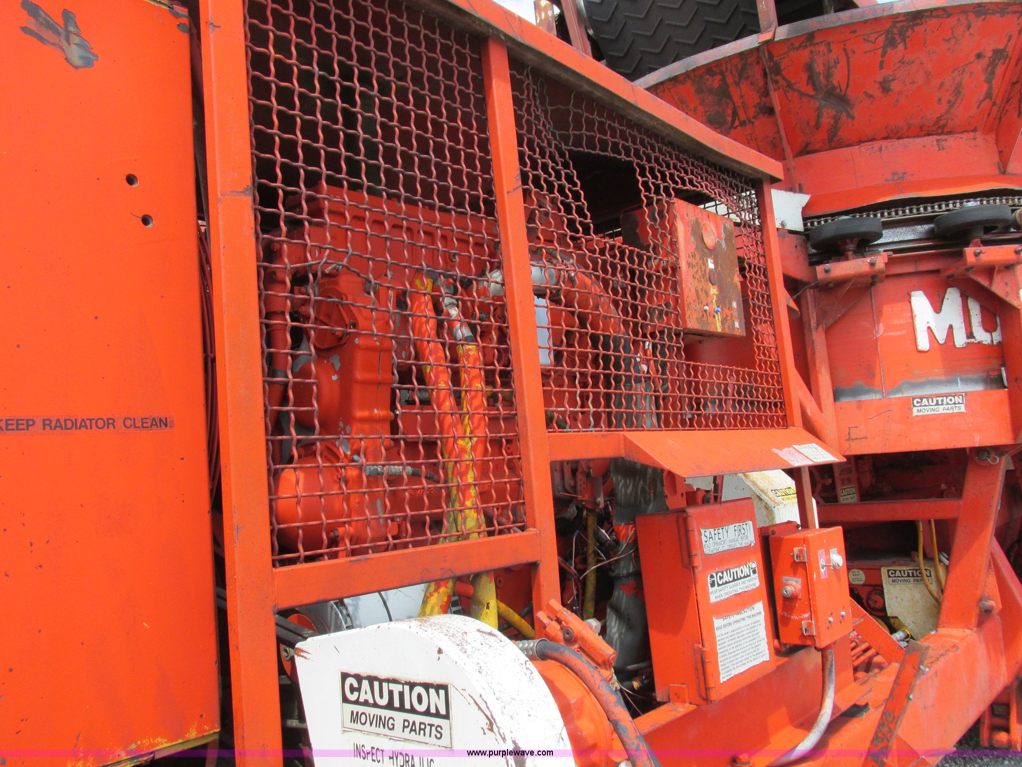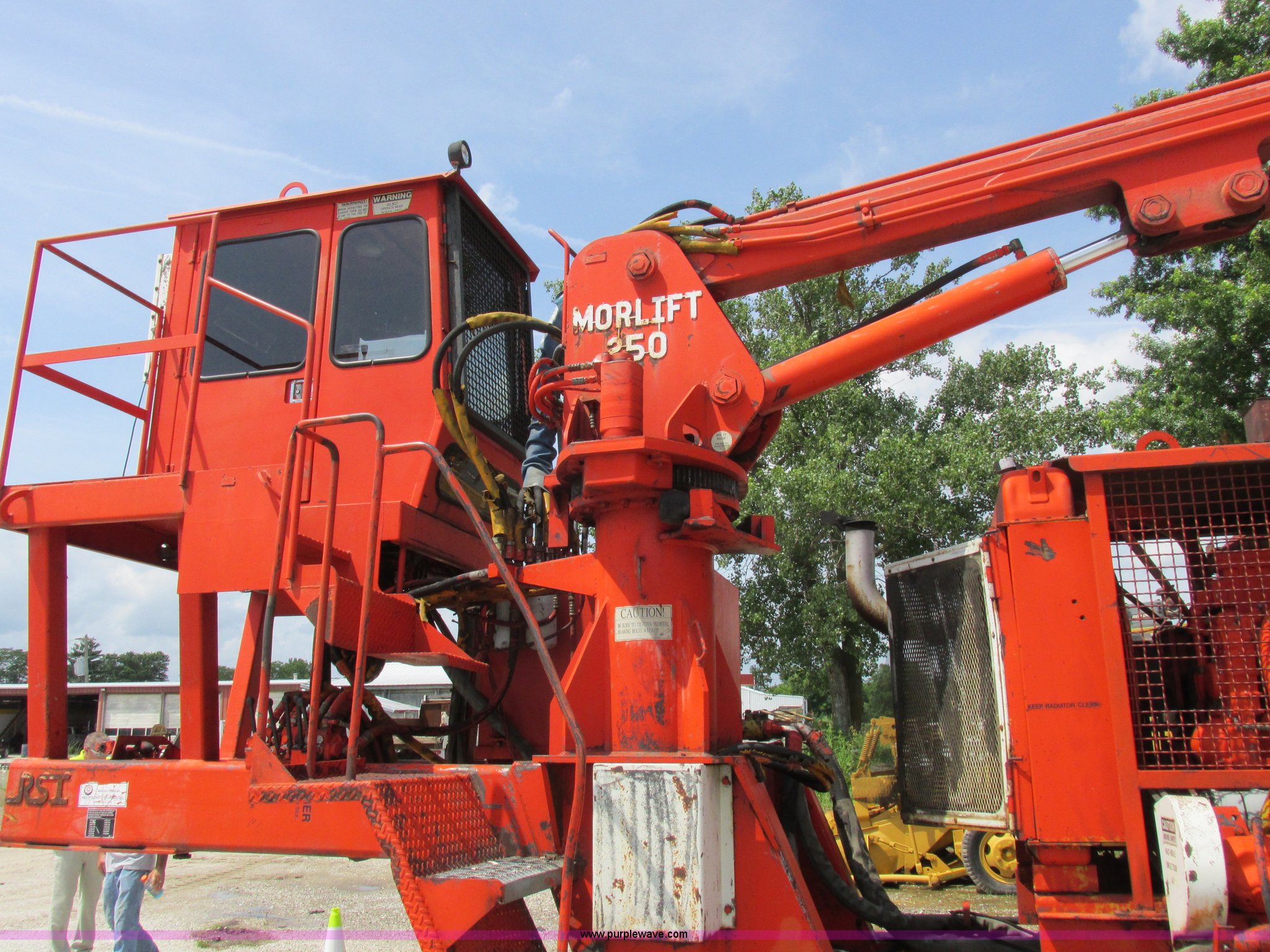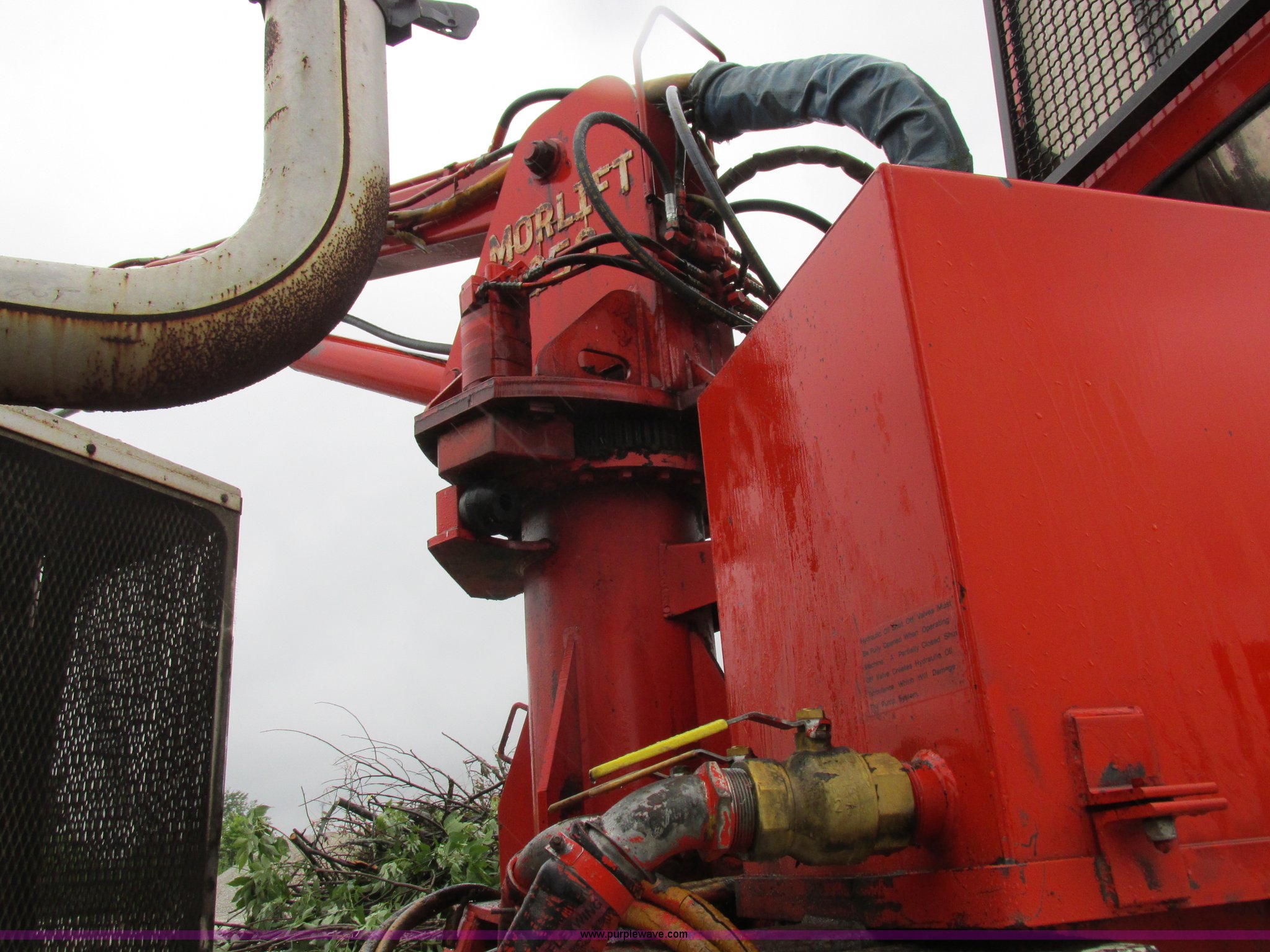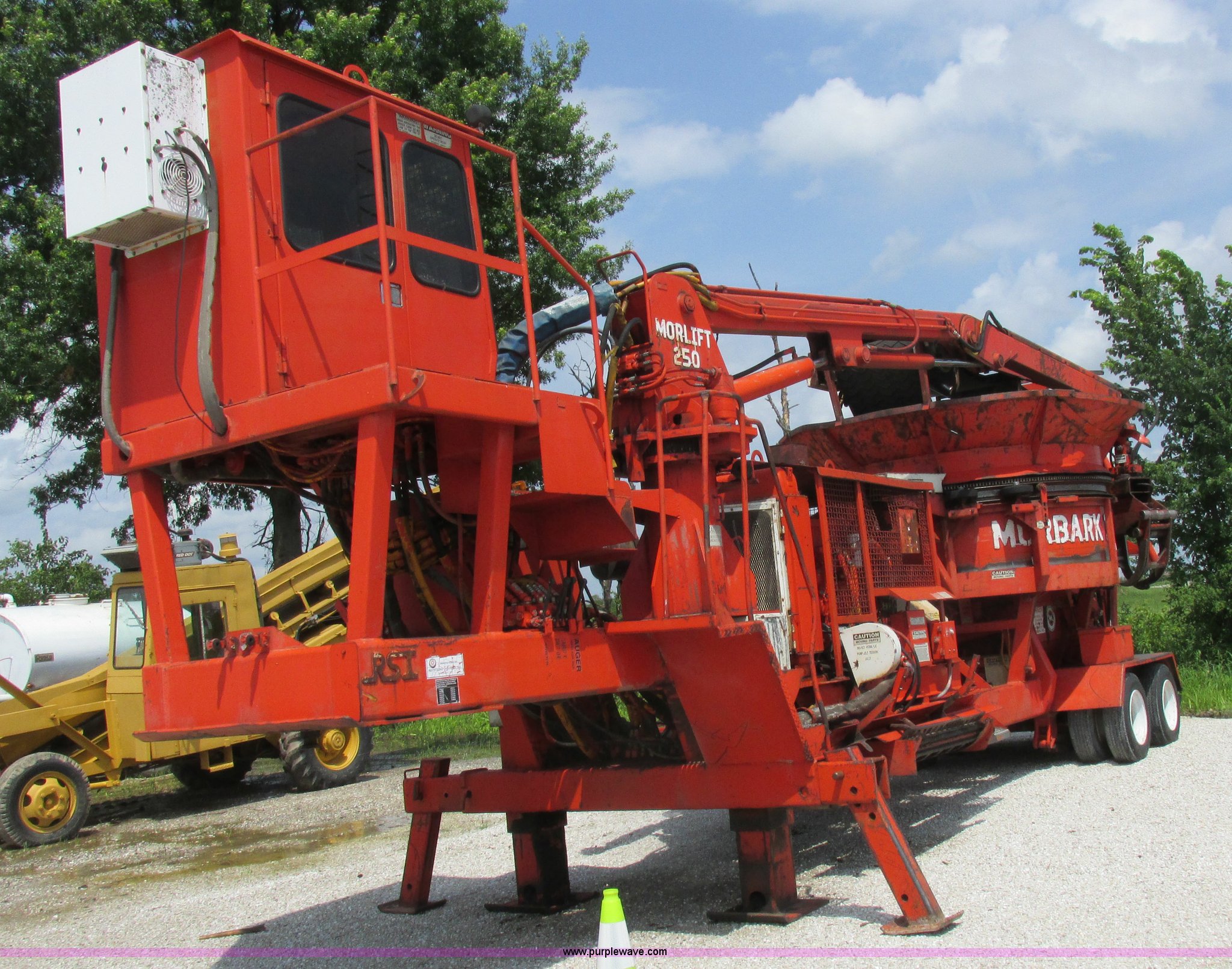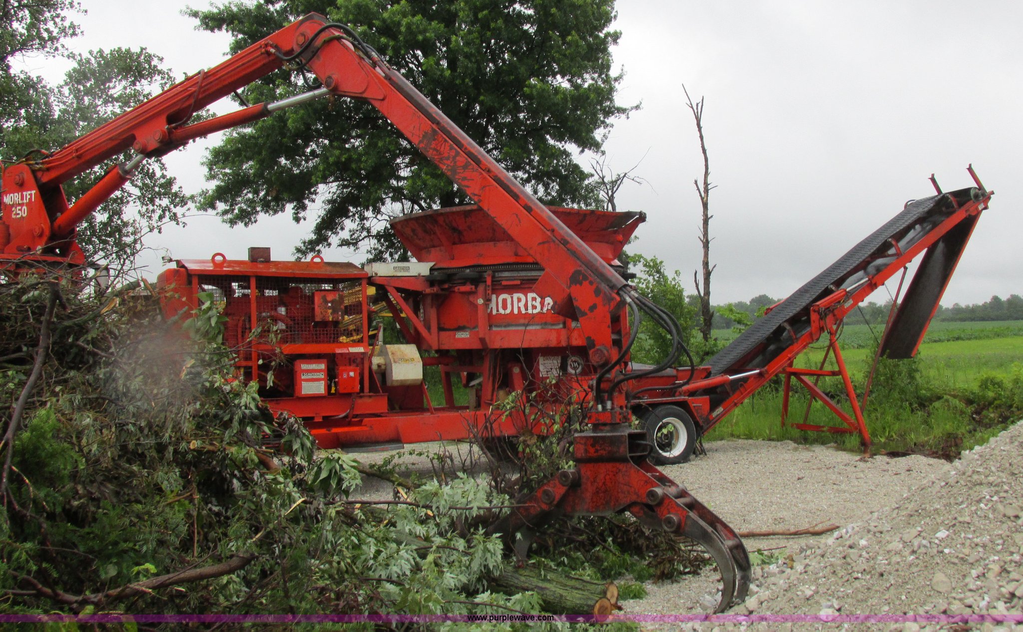 Purple Wave is selling a used Shredder in Missouri. This item is a 1994 Morbark 1050 tub grinder with the following: 2,182 hours on meter, Caterpillar 3406B six cylinder diesel engine, Serial 6TB1057, 10.5' diameter tub, Lever grinder controls, Auger discharge, 24'L x 28"W conveyor belt, Morelift 250 knuckle boom loader, Serial 869-186, Joystick loader controls, Grapple hooks, Stabilizer legs, Approximately 38'L x 8.5'W x 13'4"H transport dimensions, Fifth wheel plate, Tandem axle, 215/75R17.5 tires