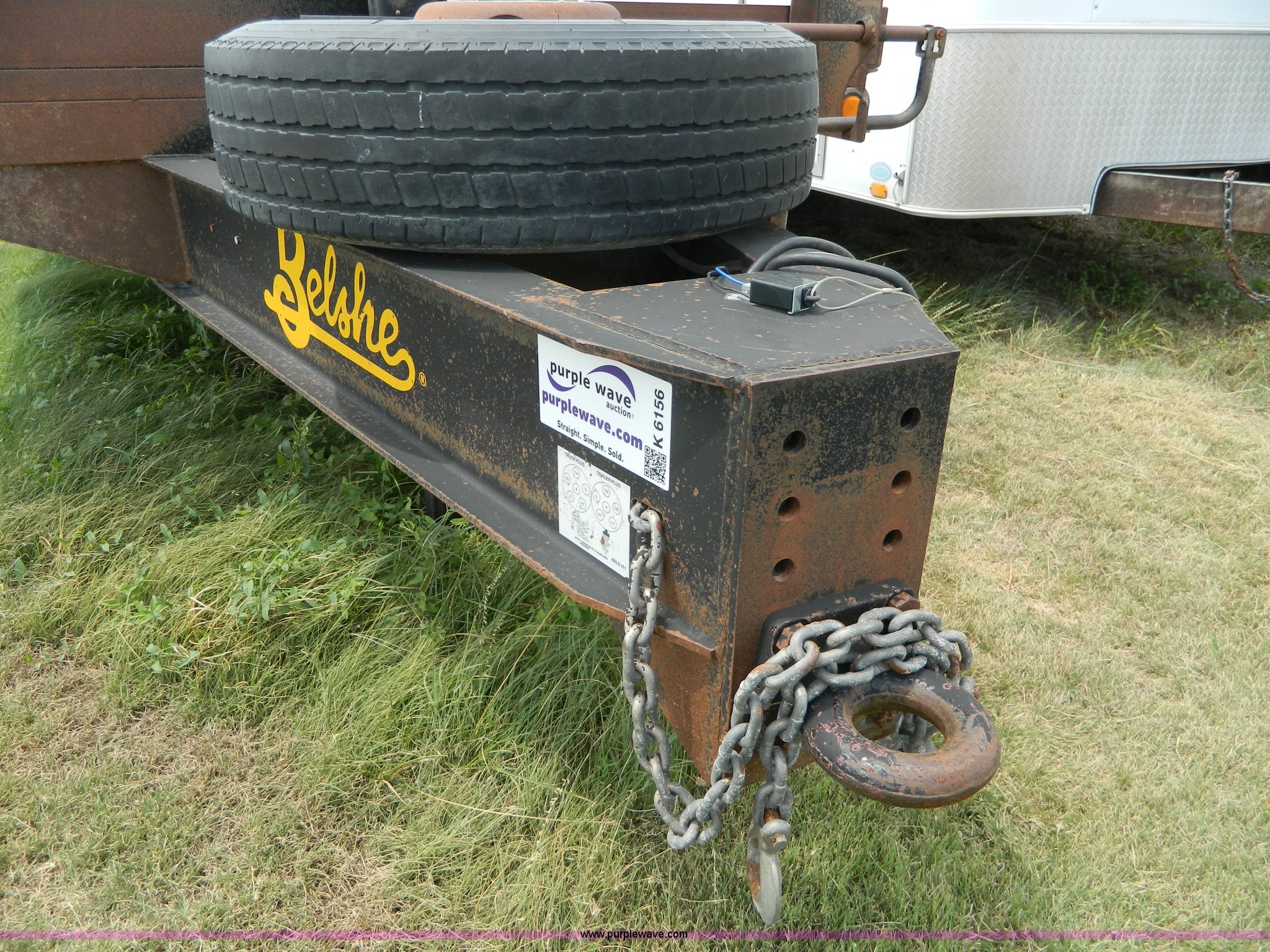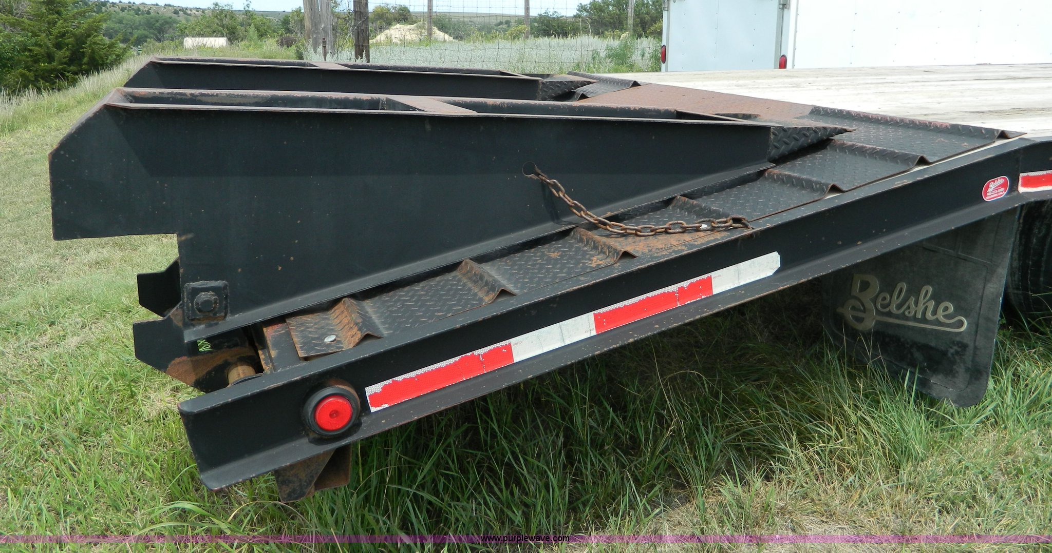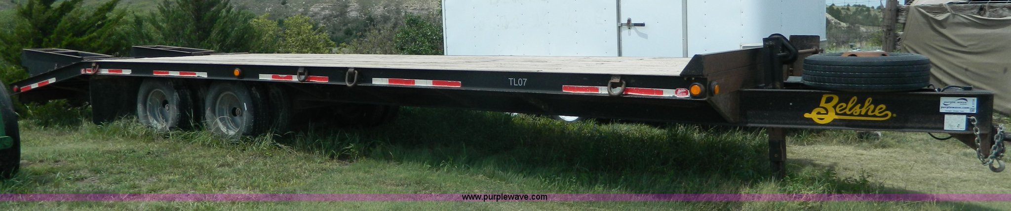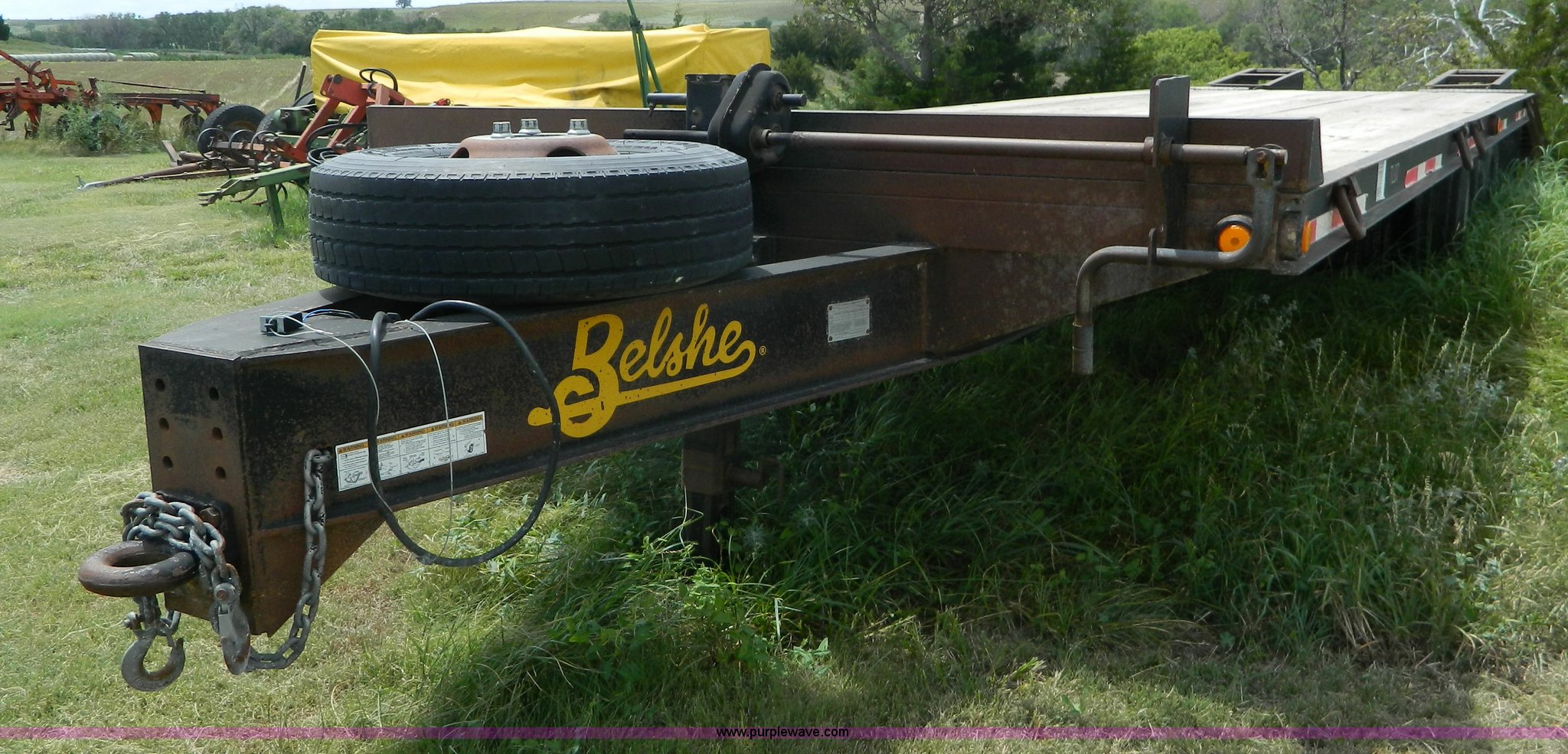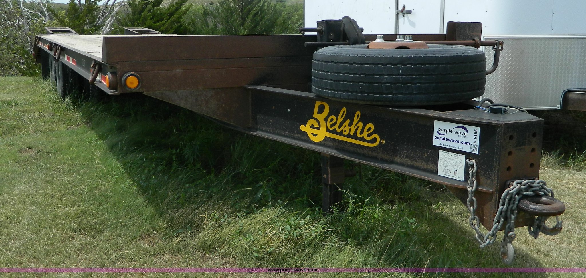Purple Wave is selling a used Equip. Trailer in Kansas. This item is a 2010 Belshe equipment trailer with the following: 24'L x 8'W wood deck, 6.5'L dovetail, 6'L ramps, (8) D-ring tie downs, Single leg landing gear, Spring suspension, Electric brakes, Tandem axle, 235/85R16 tires, GVWR 22,000 lbs
