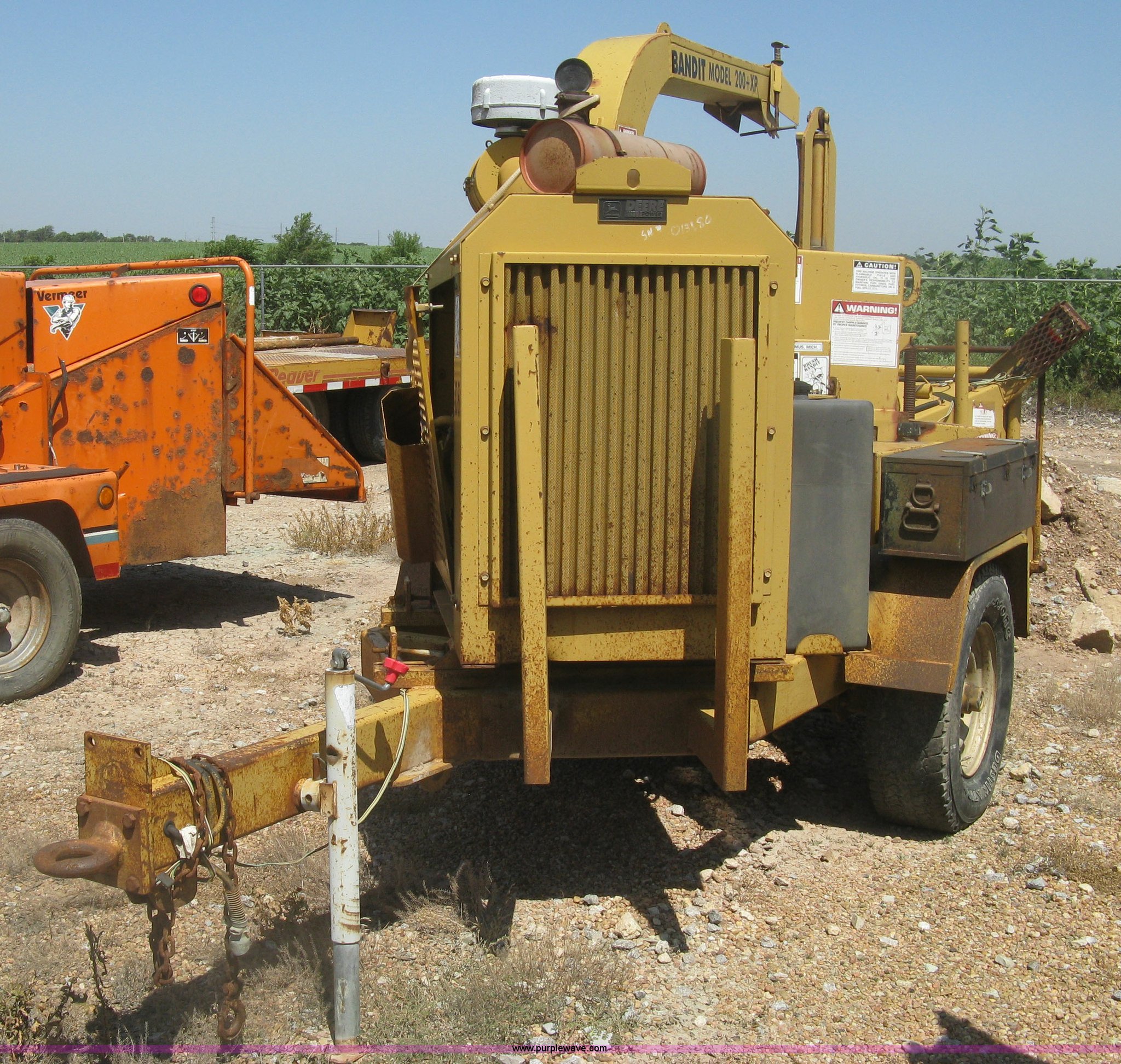 Purple Wave is selling a used Wood Chipper or Stump Grinder in Kansas. This item is a Brush Bandit 200 XP chipper with the following: 2,566 hours on meter, John Deere four cylinder diesel engine, Model 4045DF150, Serial T04045D771177, Rockford PTO, Oscillating discharge chute, Rear feed housing, 16" x 16" throat, Full fenders, Easy lube hubs, Adjustable pintle hitch, LT265/75R16 tires, Weld repairs to chipper body housing, Discharge blower housing damaged, Non-operational unit, Serial 19958, Unit# E000247