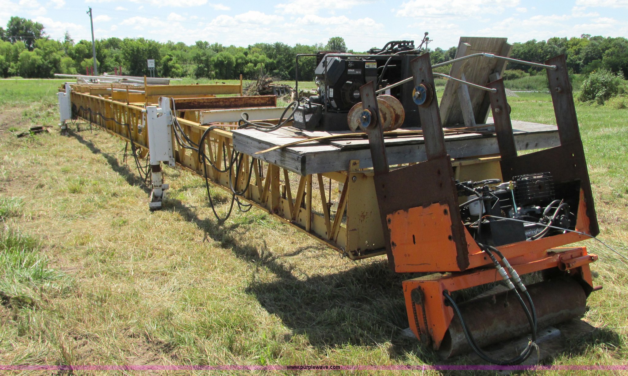 Gomaco bridge finishing machine. 48'L, Additional 20', 68' overall, 48"W, Dual Kohler gas engines 15 HP, Hydraulic drive, Pipe ride rails, Wood rail blocks. Raytown, MO 64133