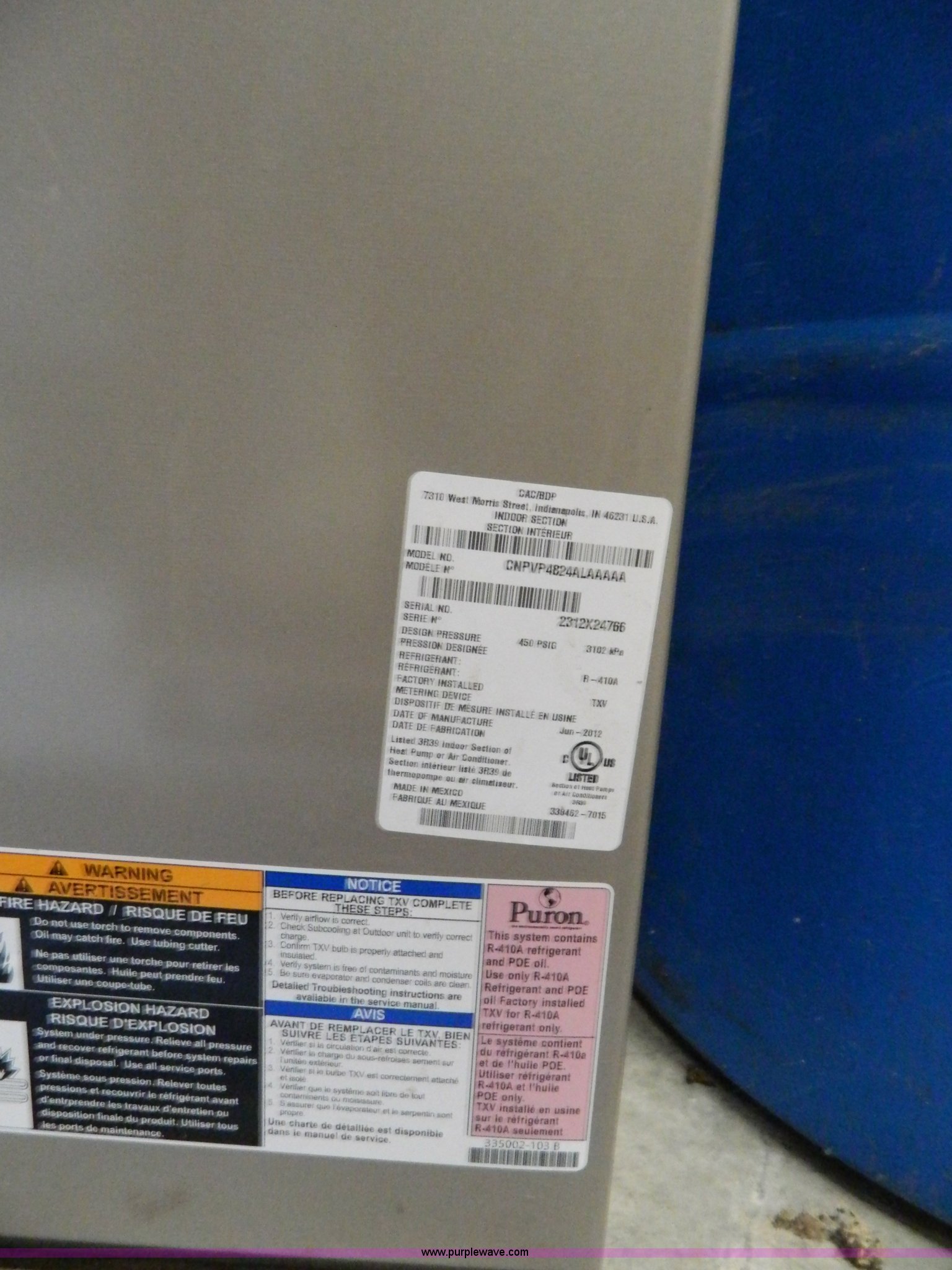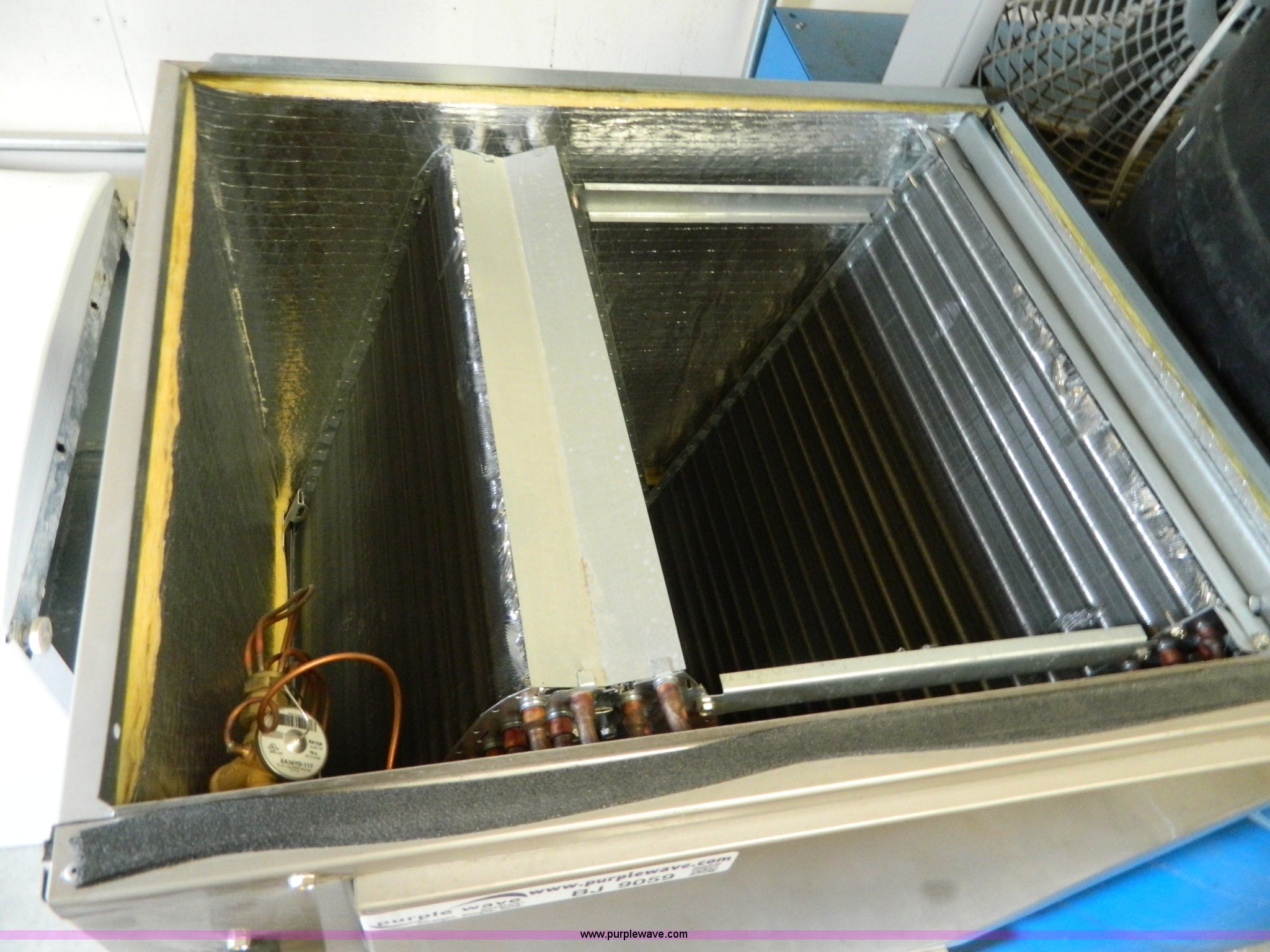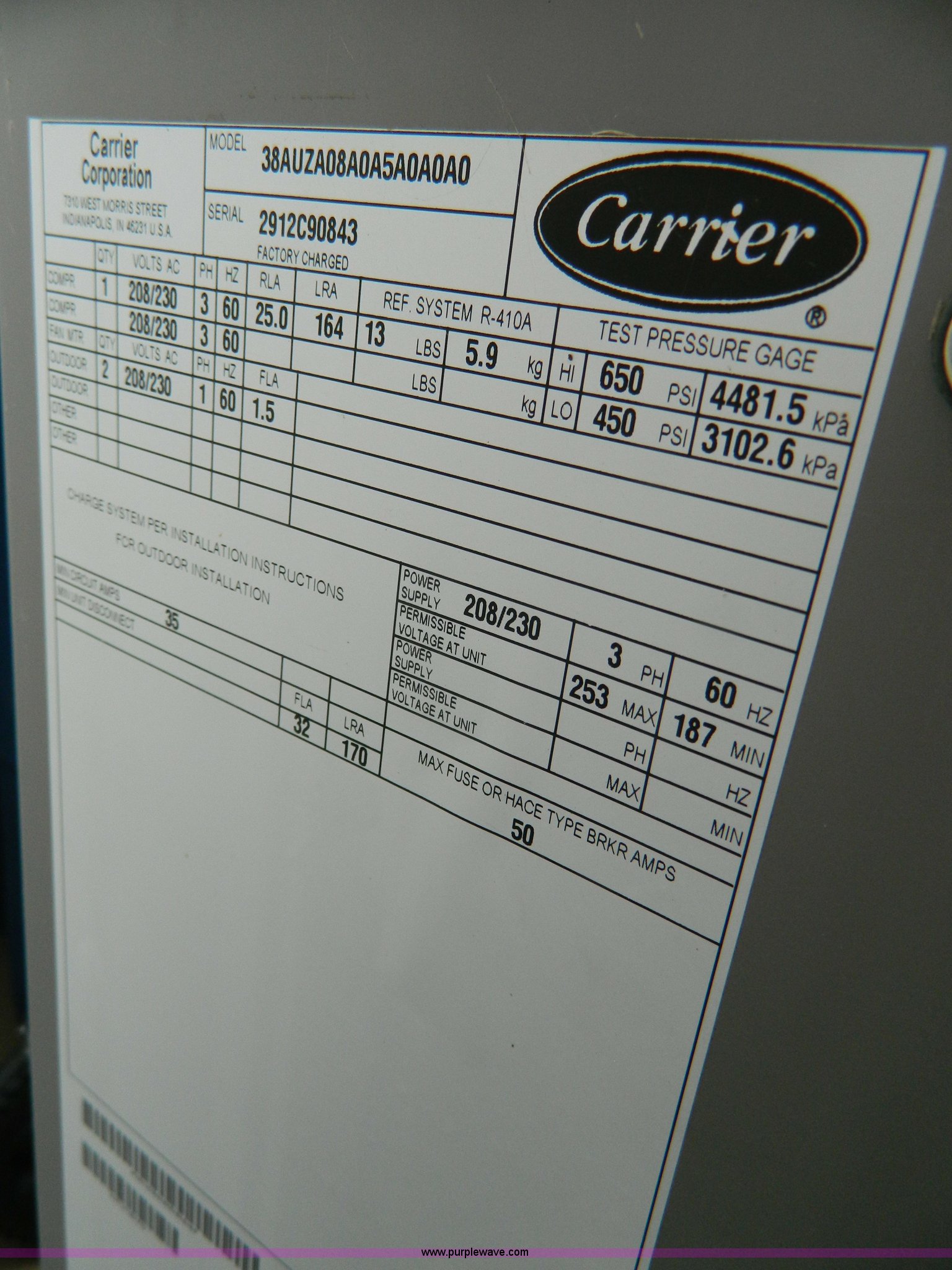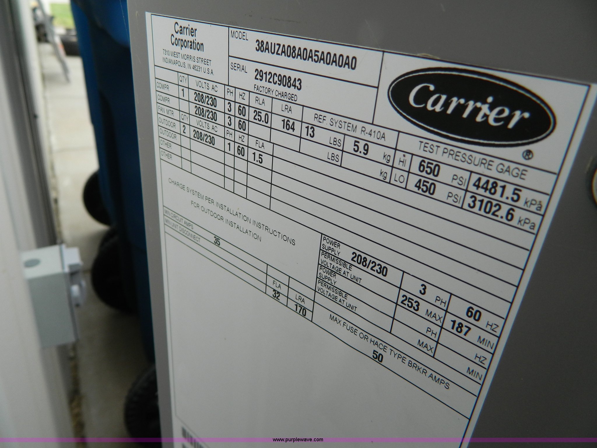 Purple Wave is selling a used Appliances in Kansas. This item is a Carrier High Efficiency Puron R-410A condensing unit with the following: Model 38AUZA08A0A5, 7.5 ton capacity, Carrier cased vertical N-Coil units, Model CNPUP4824ATA, Tin plated evaporator coils, Four ton capacity