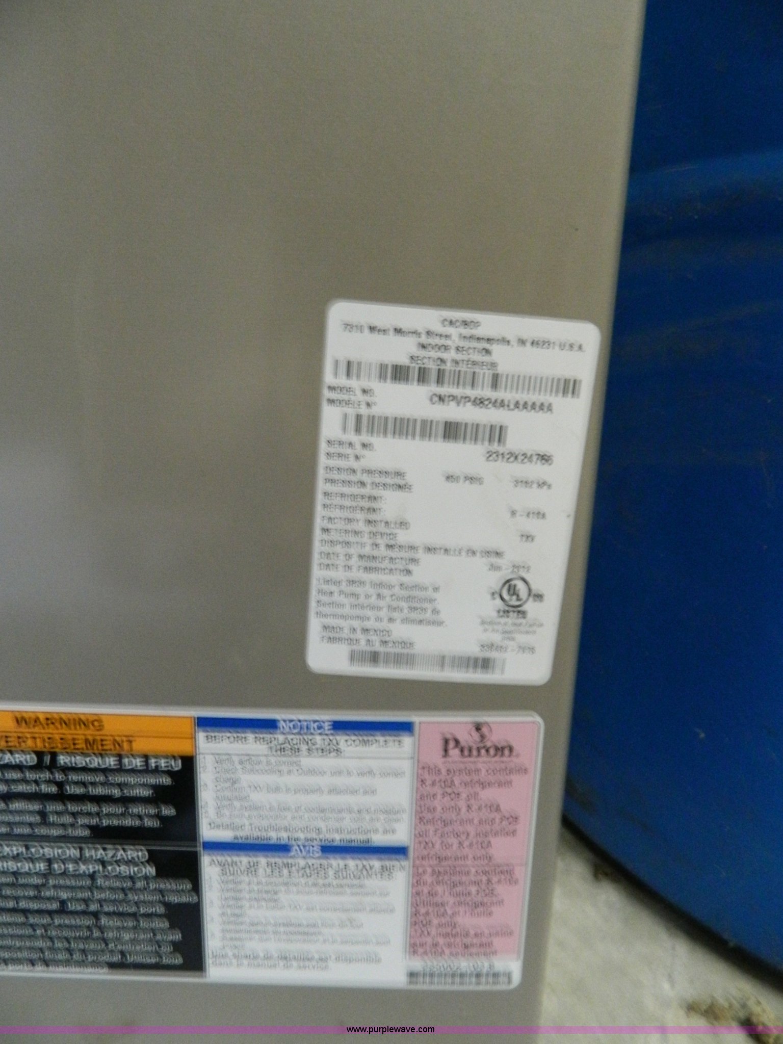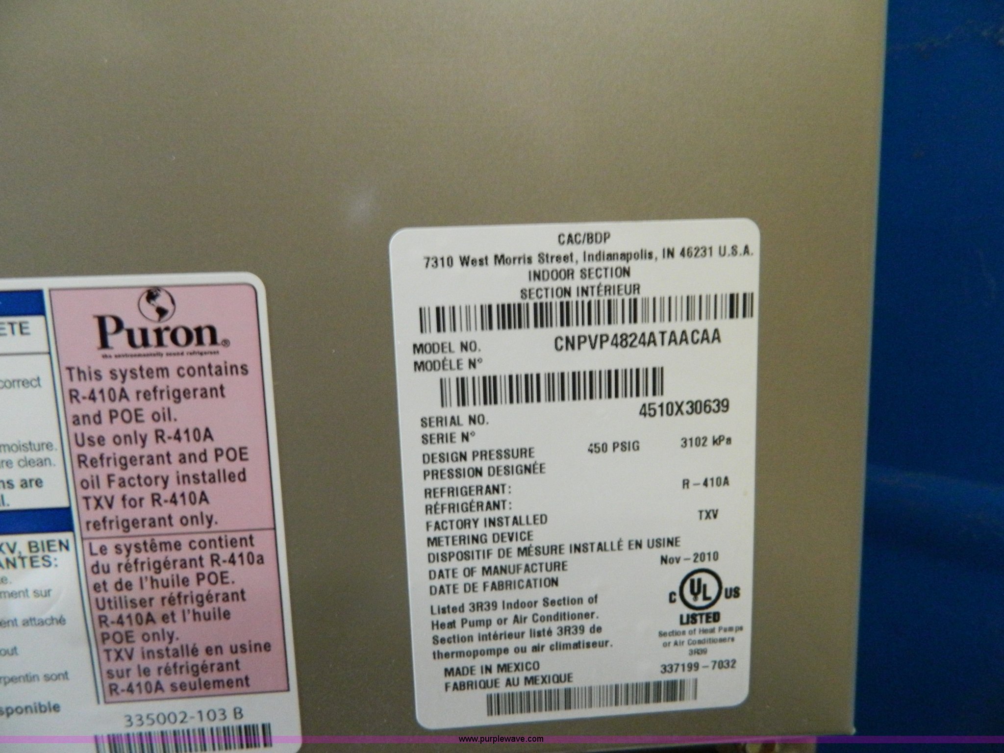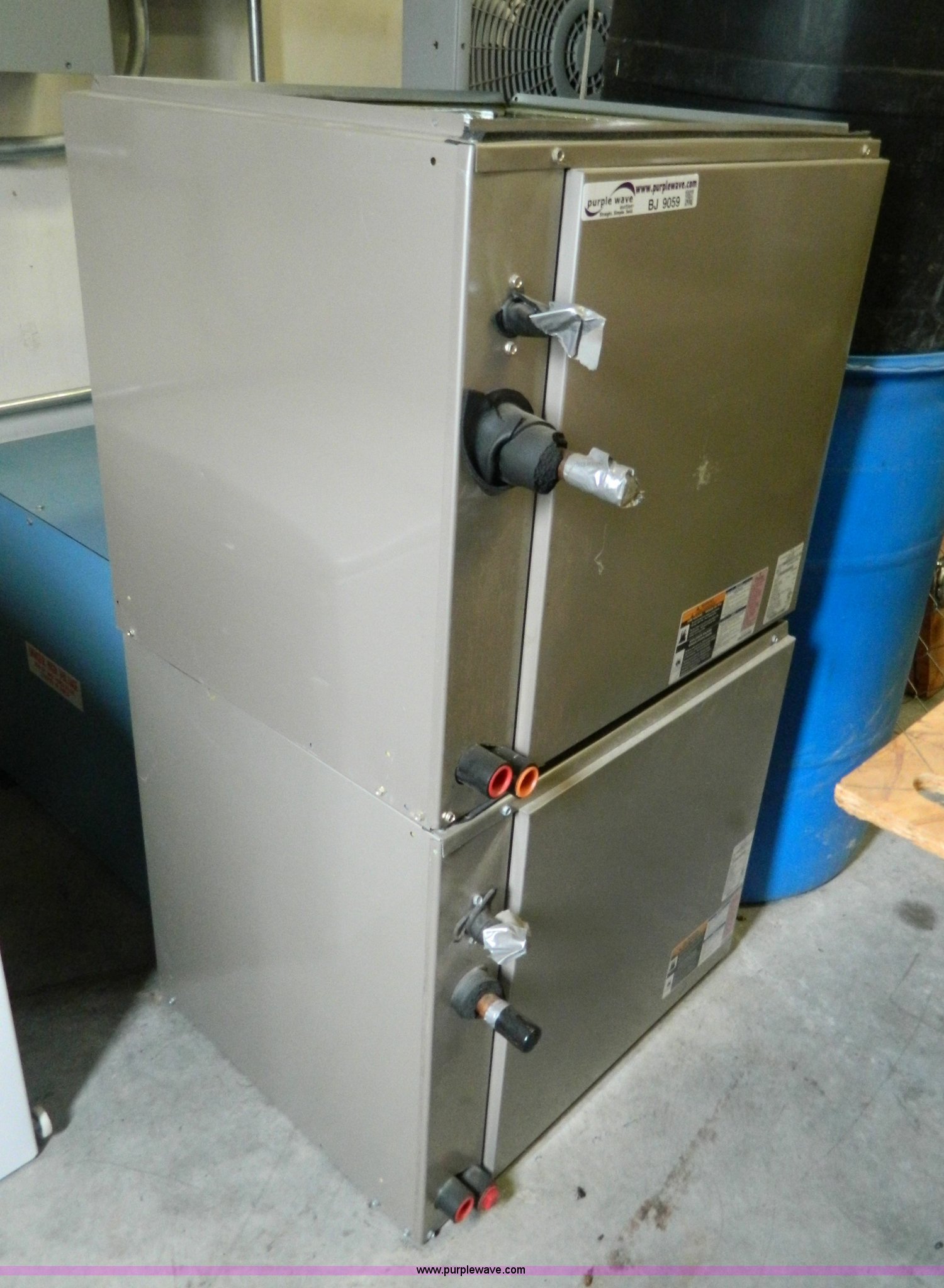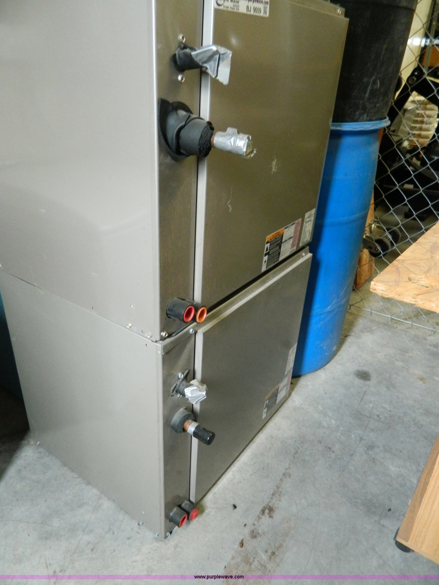 Purple Wave is selling a used Appliances in Kansas. This item is a Carrier High Efficiency Puron R-410A condensing unit with the following: Model 38AUZA08A0A5, 7.5 ton capacity, Carrier cased vertical N-Coil units, Model CNPUP4824ATA, Tin plated evaporator coils, Four ton capacity