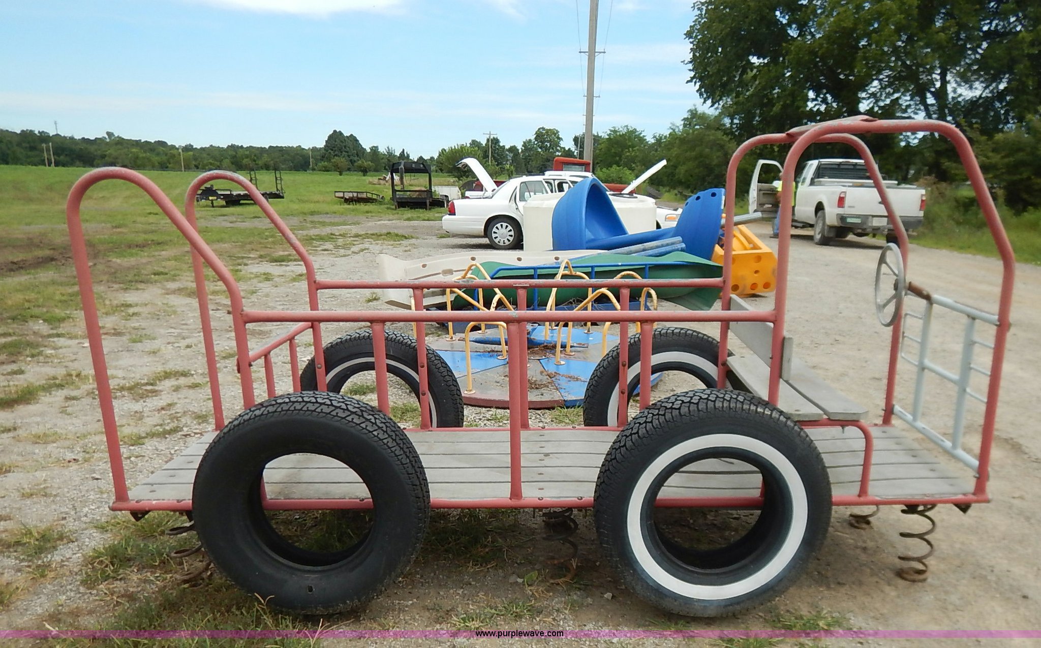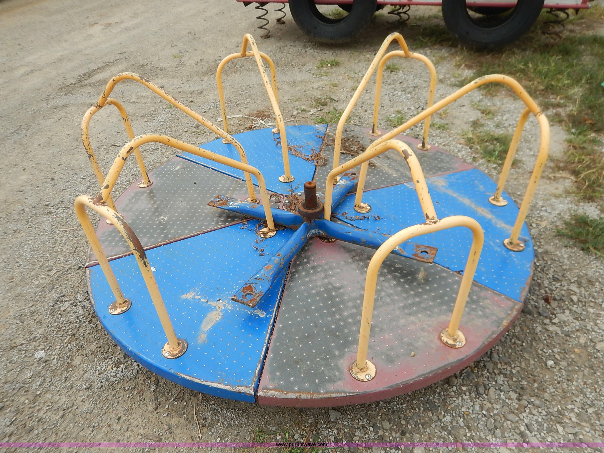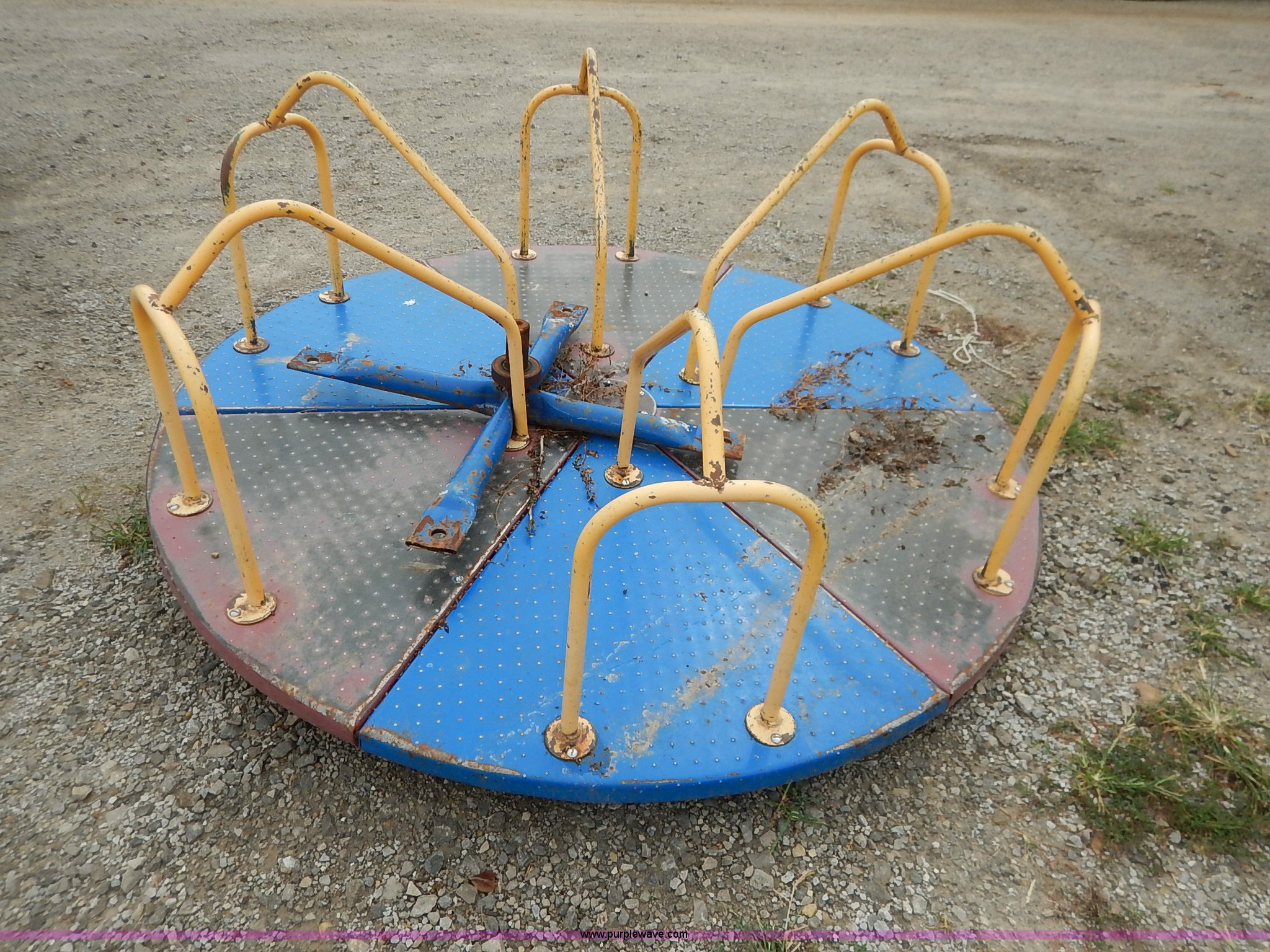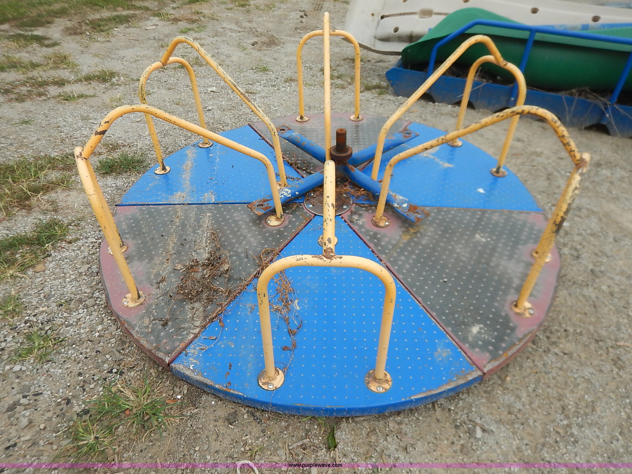 Purple Wave is selling a used Sporting Goods in Kansas. This item is a Assorted playground equipment with the following: Merry-Go-Round, 68" diameter, Steel framed bus