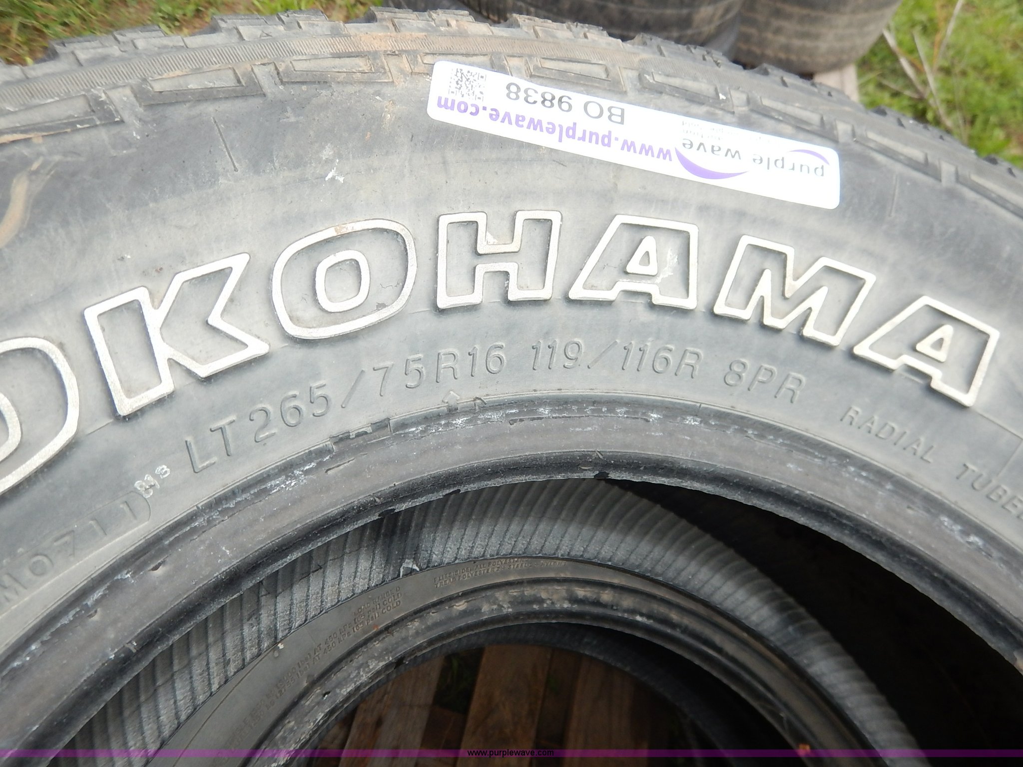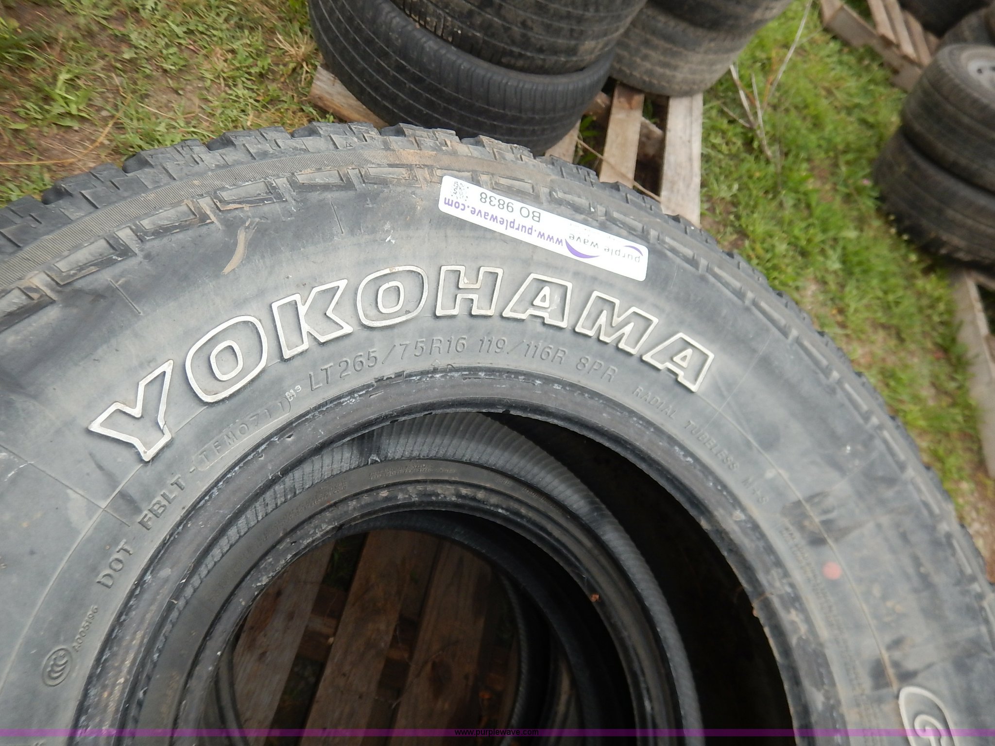 Purple Wave is selling a used Fleet Tires in Kansas. This item is a (3) Yokohama 265/75R16 tires with the following: (3) Yokohama 265/75R16 tires. City of Baldwin. 609 High St. Baldwin City, KS 66006