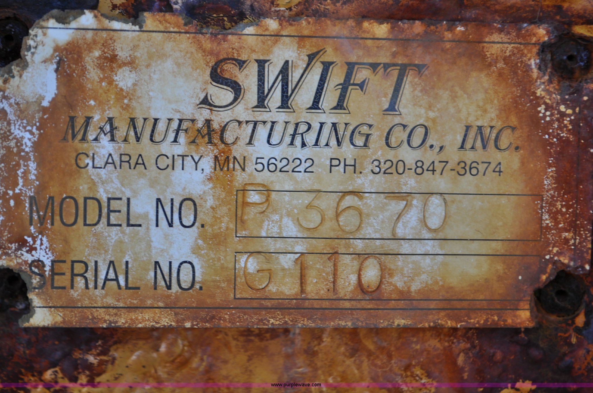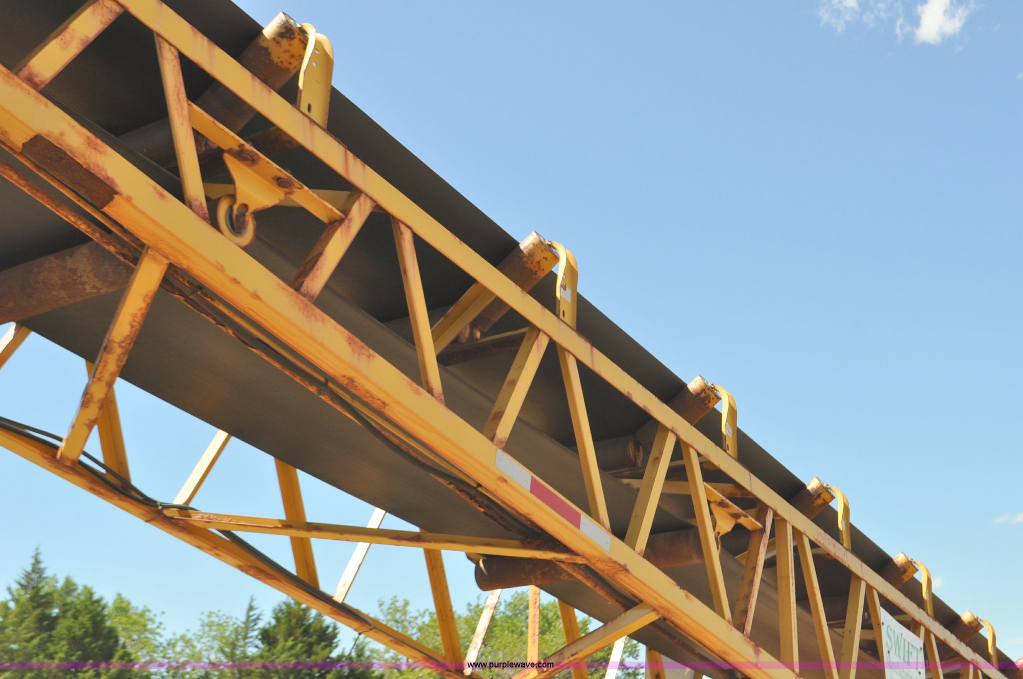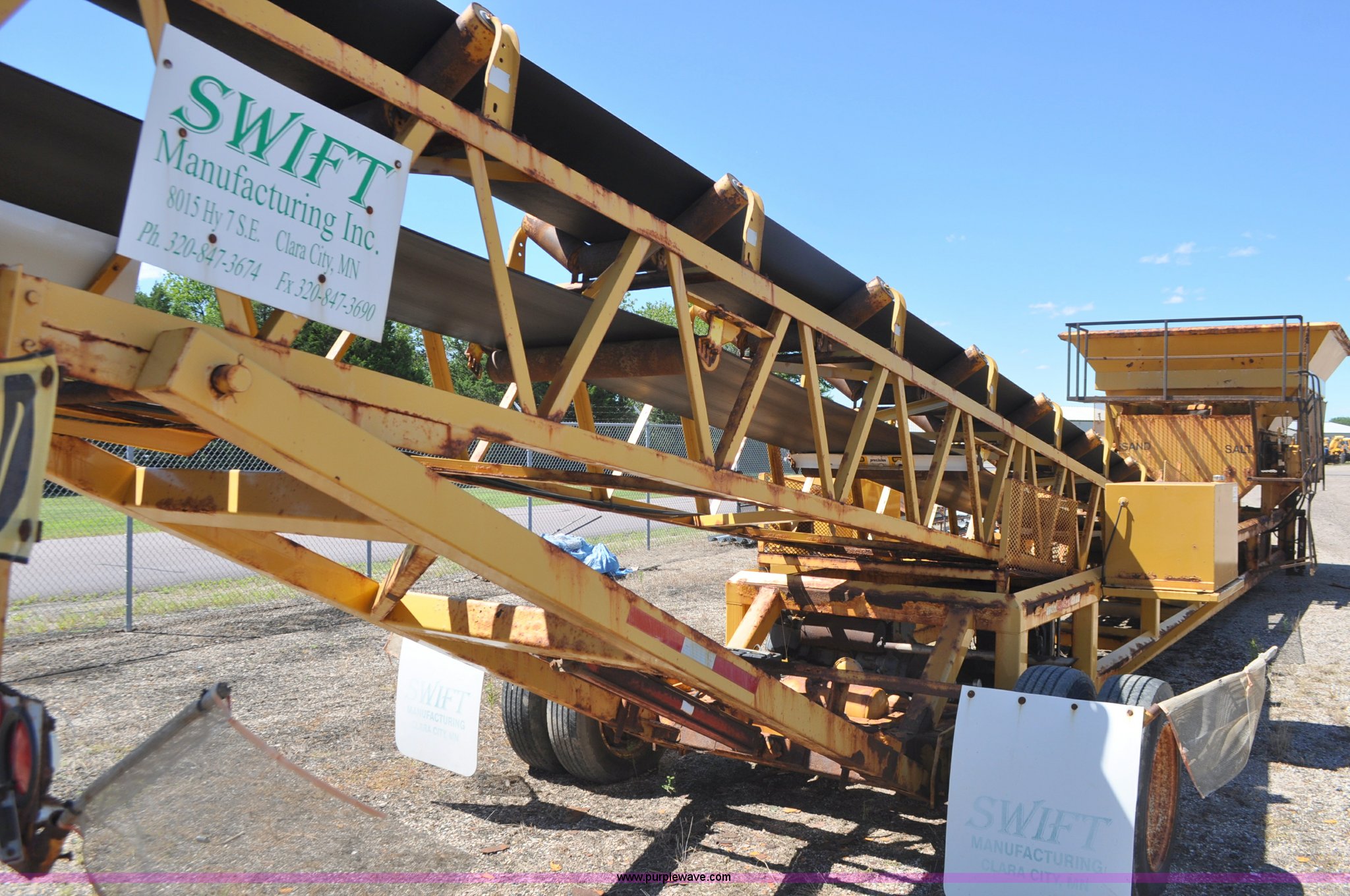 Purple Wave is selling a used Conveyor in South Dakota. This item is a 2006 Swift sand/salt mixing conveyor with the following: 933 hours on meter, Model PBF3670TB, Deutz four cylinder diesel engine, Divided hopper, 13' x 10.5' hopper opening, 4' depth, Dual 11' x 24" conveyors, 72' x 36" main conveyor, Hydraulic raise/lower, Remote control, Unknown operating condition, Pintle hitch, 255/70R22.5 tires, Salt damage, Conveyor and landing legs hydraulic valves frozen, Some roller are not turning during operation, Electric and air components corroded, Serial G110