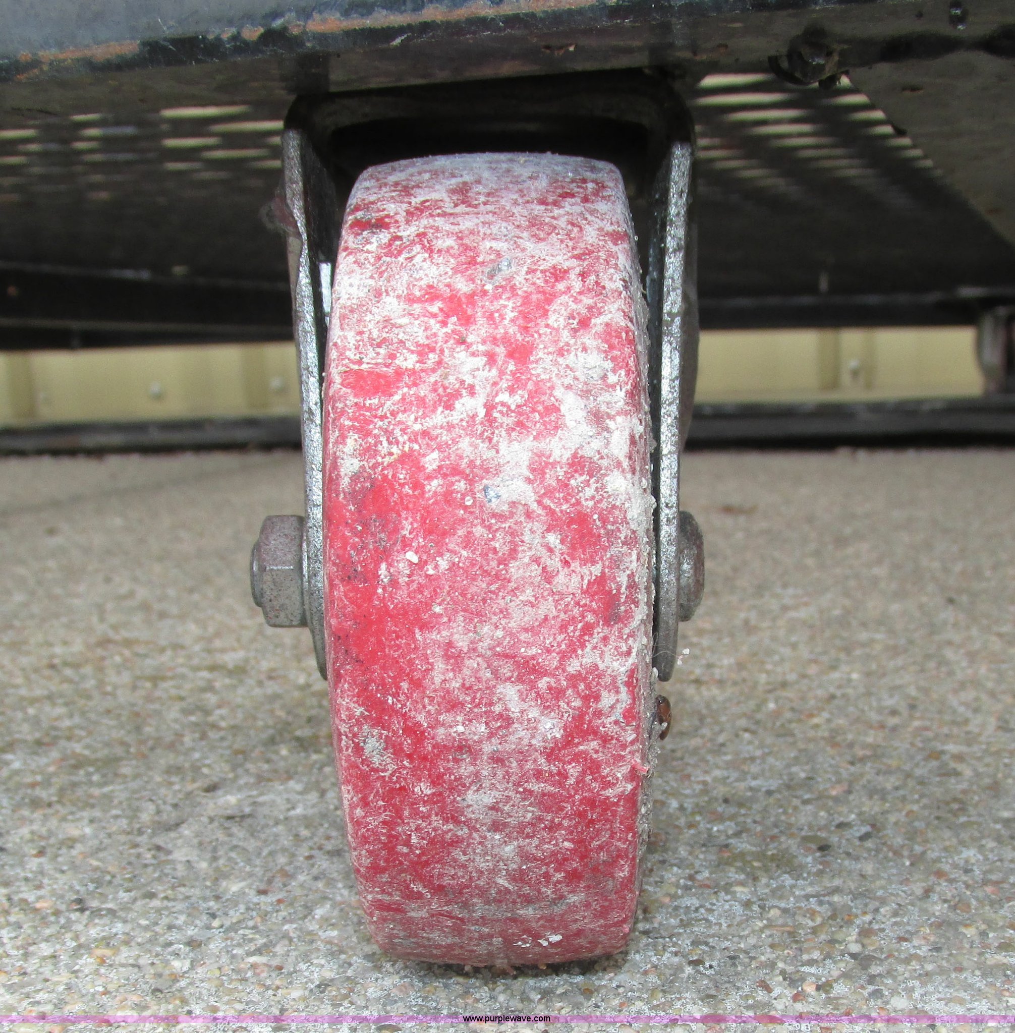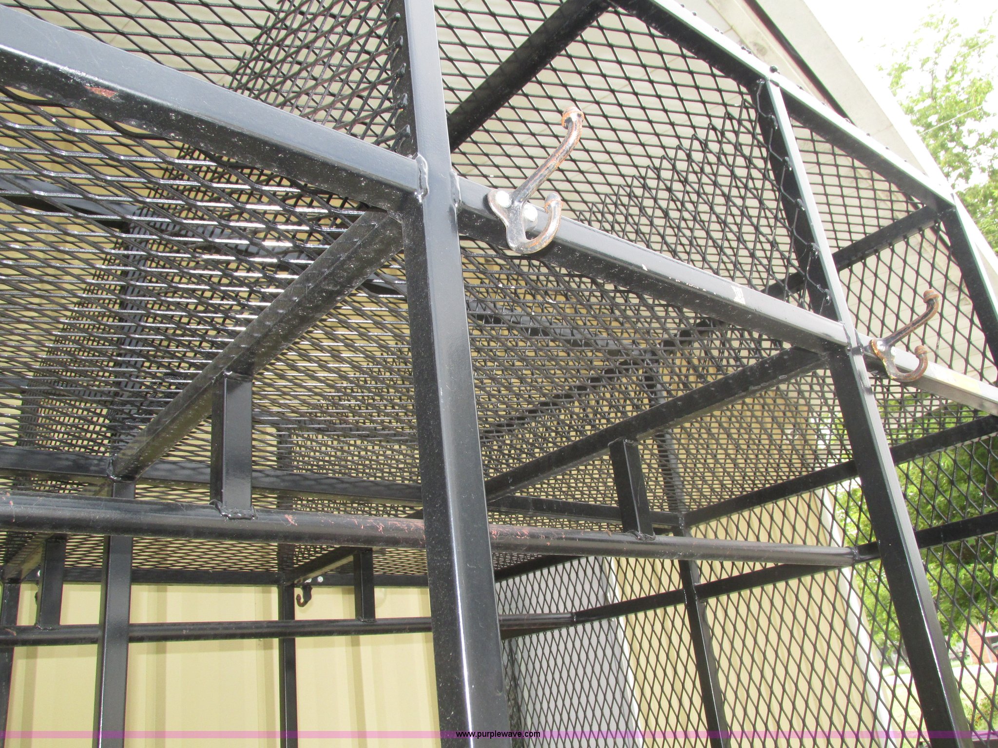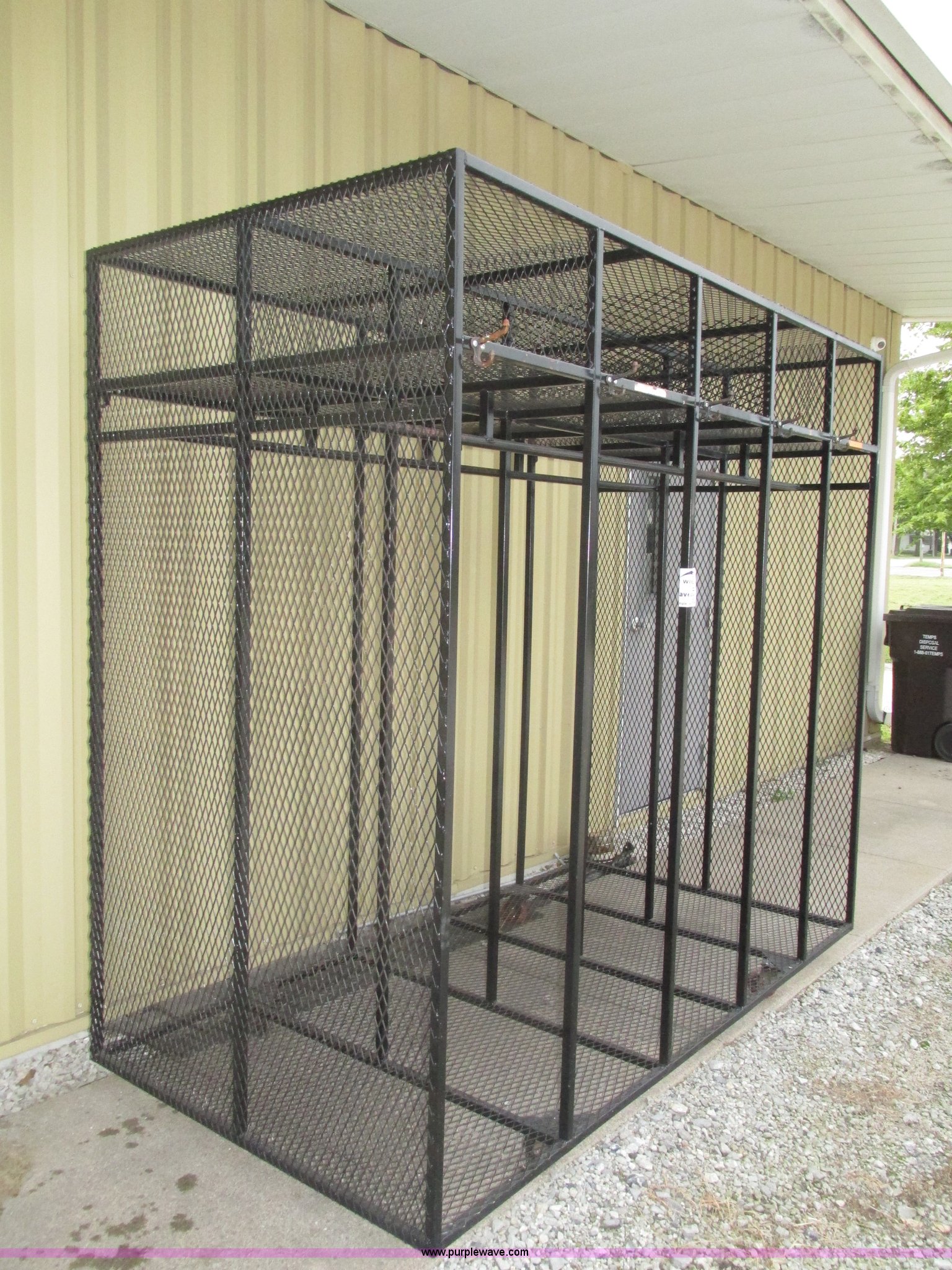 Ten compartment bunker gear locker. Two sided rolling, 8'W x 4'D x 88"H O.D., (4) 4" casters, (2) lockable, 18"W x 69"H lower compartments, 18"W x 12"H upper compartments, Steel mesh sides, top, and flooring, Clothes hangers and hooks. City of Wymore, Nebraska. 115 West E St. Wymore, NE 68466