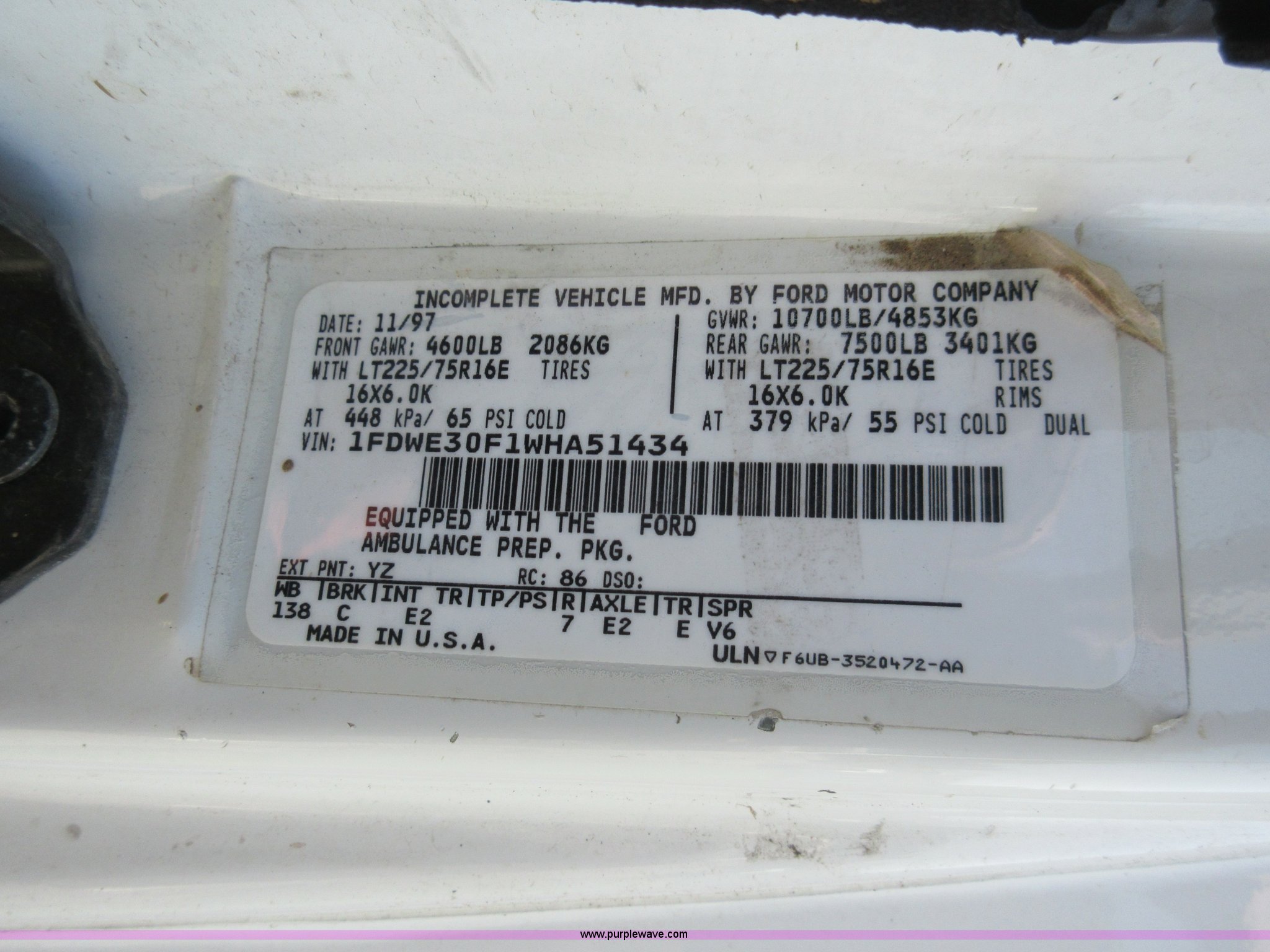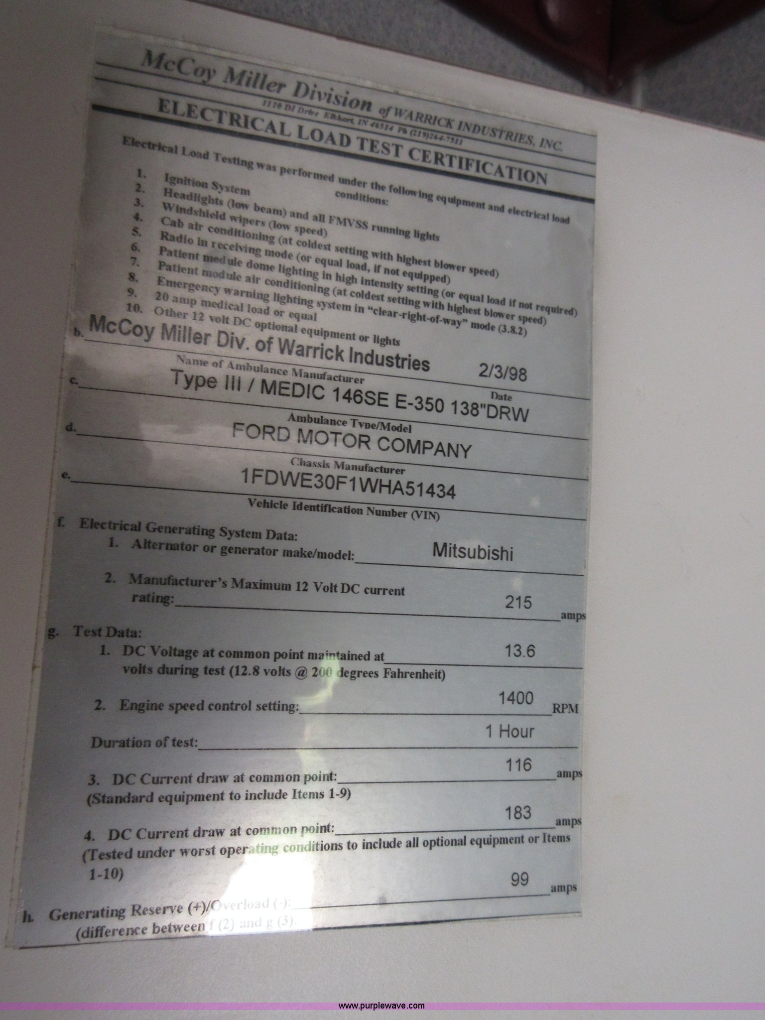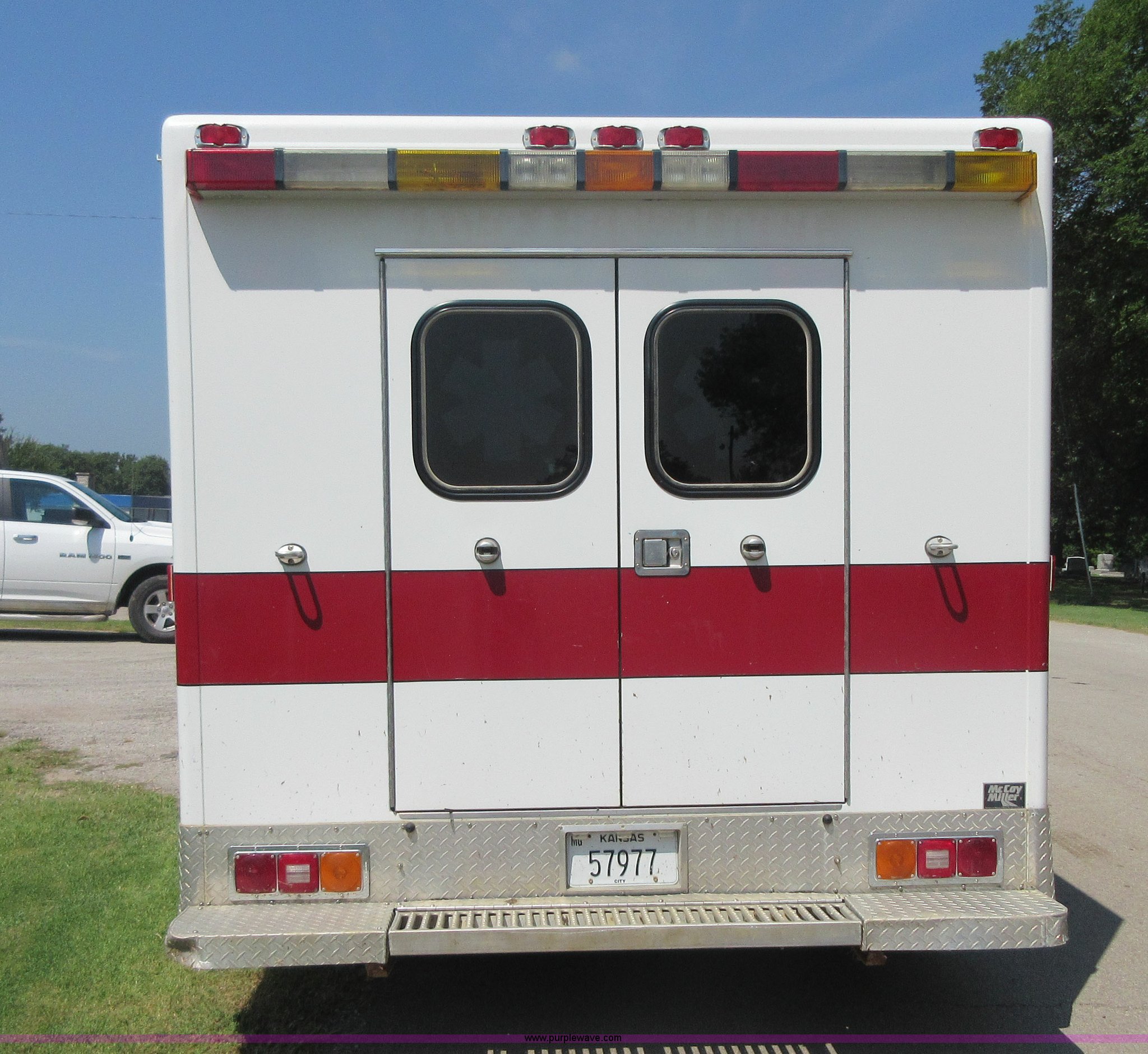 Purple Wave is selling a used Fire Truck or Emergency Vehicle in Kansas. This item is a 1998 Ford Econoline E350 ambulance with the following: 124,559 miles on odometer, 7.3L V8 OHV 16V diesel engine, Automatic transmission, AC and heat, Tilt, Cruise, AM/FM, Power windows and locks, Cloth interior, Running boards, Block heater, McCoy Miller ambulance body, Type III Medic 146SE, LT225/75R16 tires