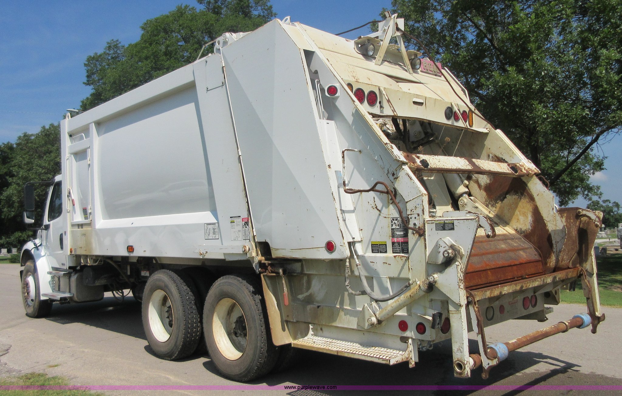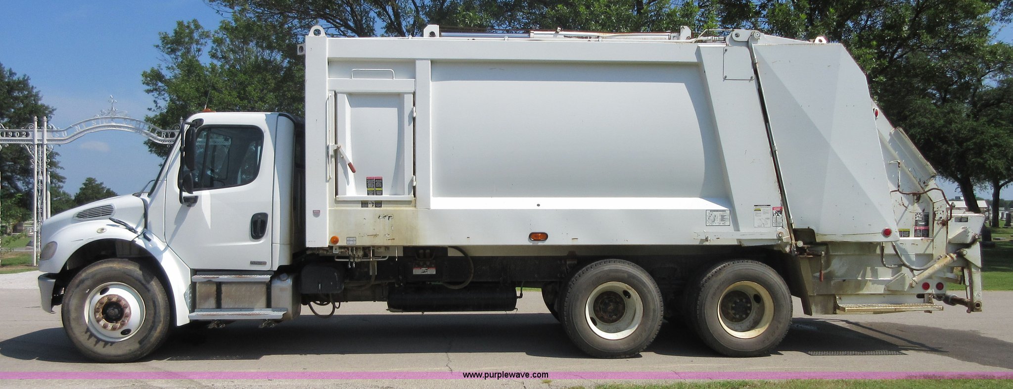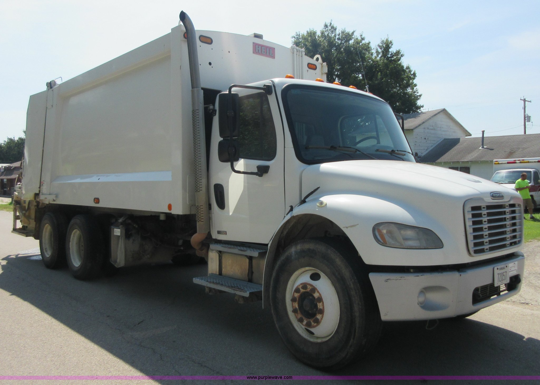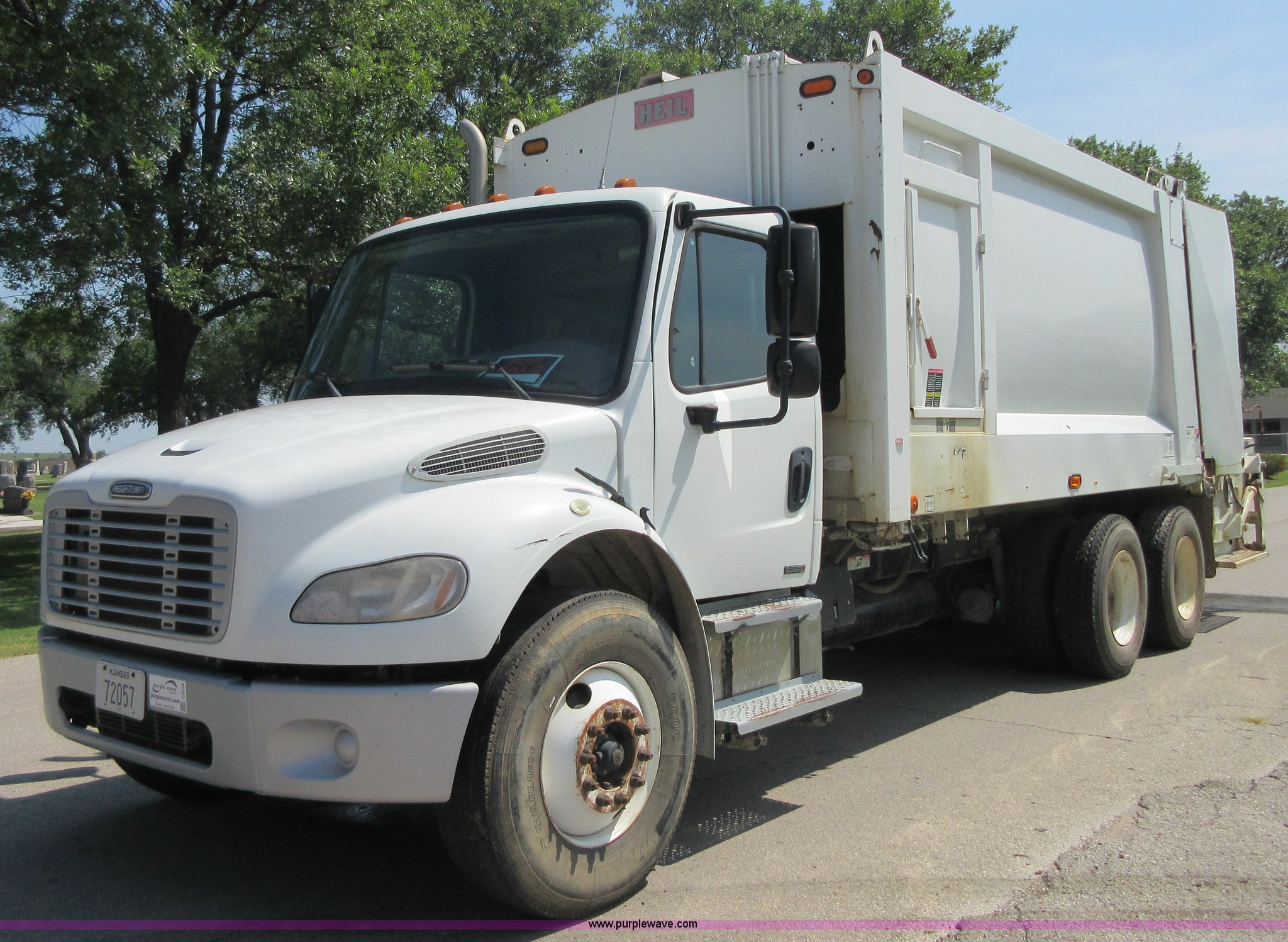 Purple Wave is selling a used Refuse Truck in Kansas. This item is a 2008 Freightliner Business Class M2 refuse truck with the following: 89,567 miles on odometer, Cummins ISB 6.7L L6 turbo diesel engine, Allison automatic transmission, Tandem axle, AC and heat, Cruise, AM/FM/CD, Air suspension seat, Twin passenger steps, Front tow hooks, PTO, Heil refuse body, 25 yard capacity, Hydraulic ram lift, Single exhaust stack, Dual fuel tanks, Walking beam suspension, Air brakes, Double frame, 224" wheelbase, 12R22.5 front tires, 11R22.5 rear tires, GVWR 48,000 lbs, FAWR 14,800 lbs, IAWR 20,000 lbs, RAWR 20,000 lbs, Check engine light on, ABS light on
