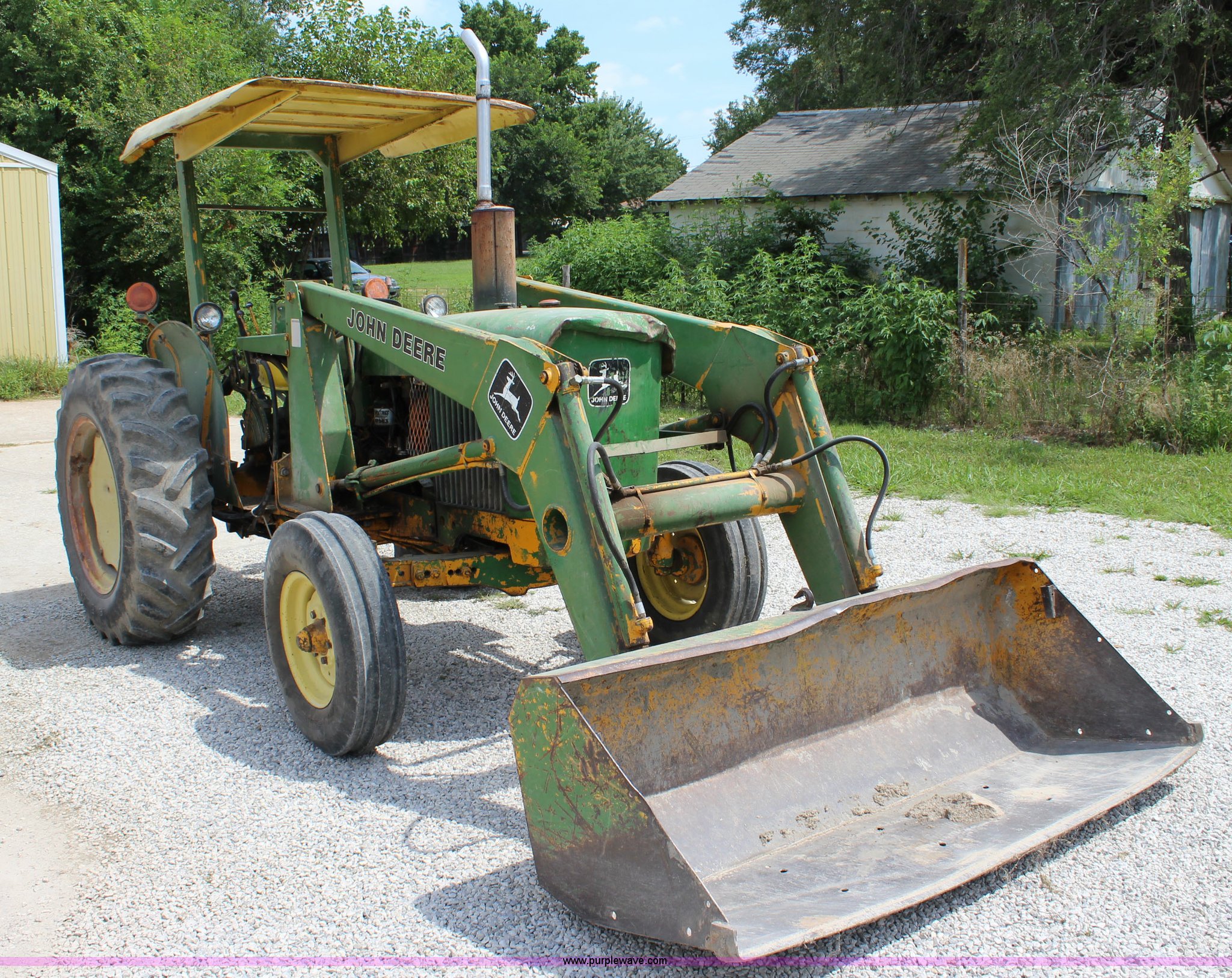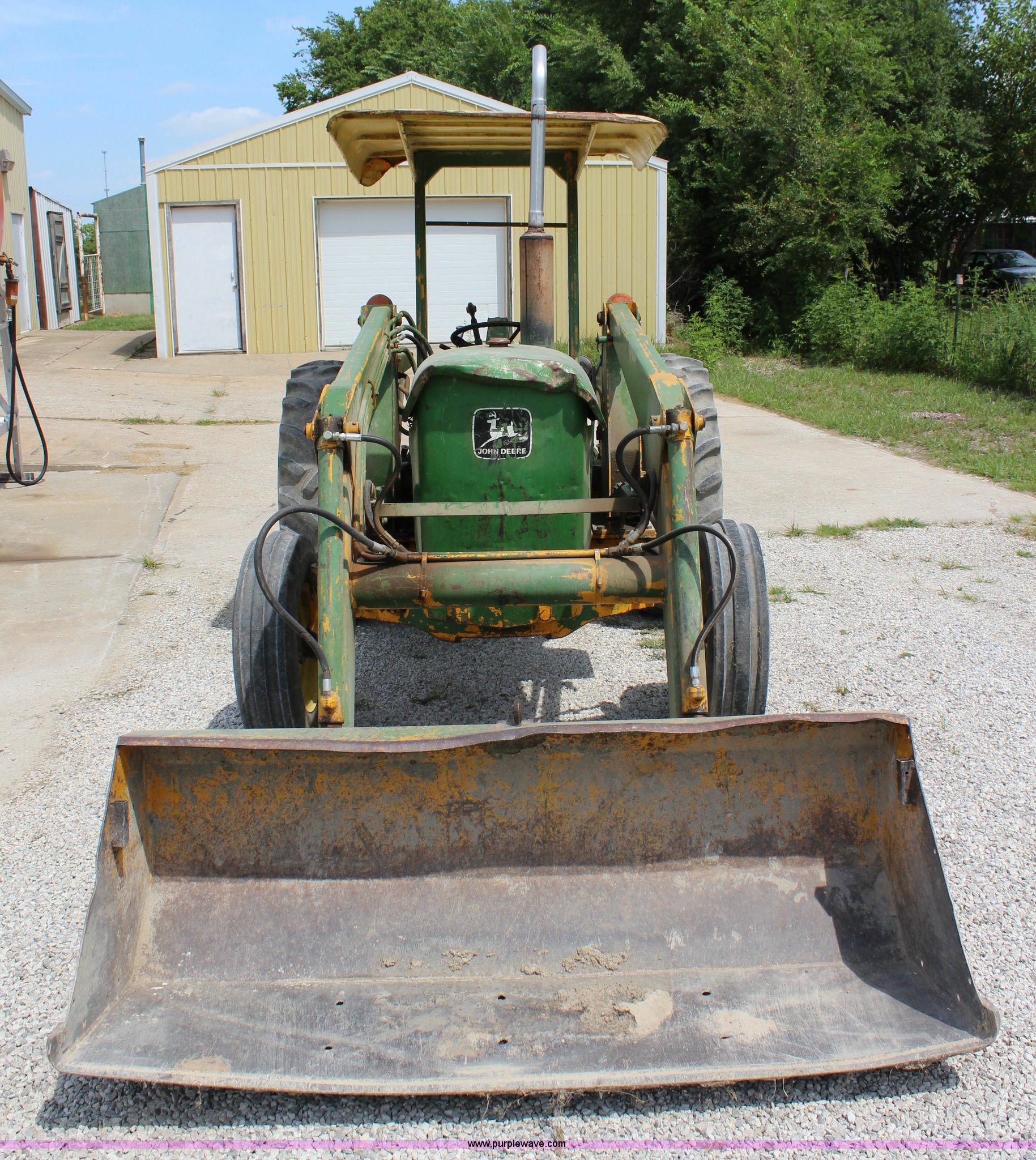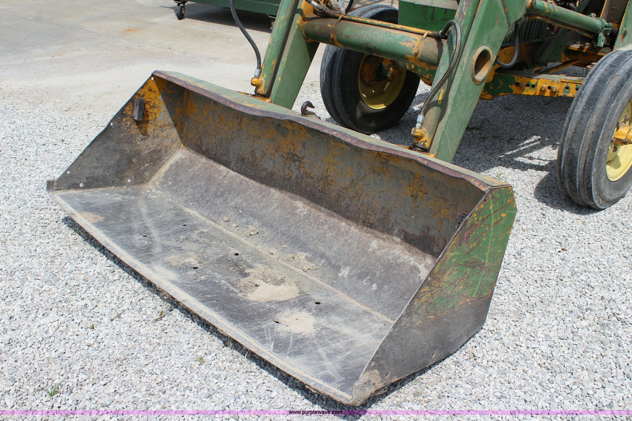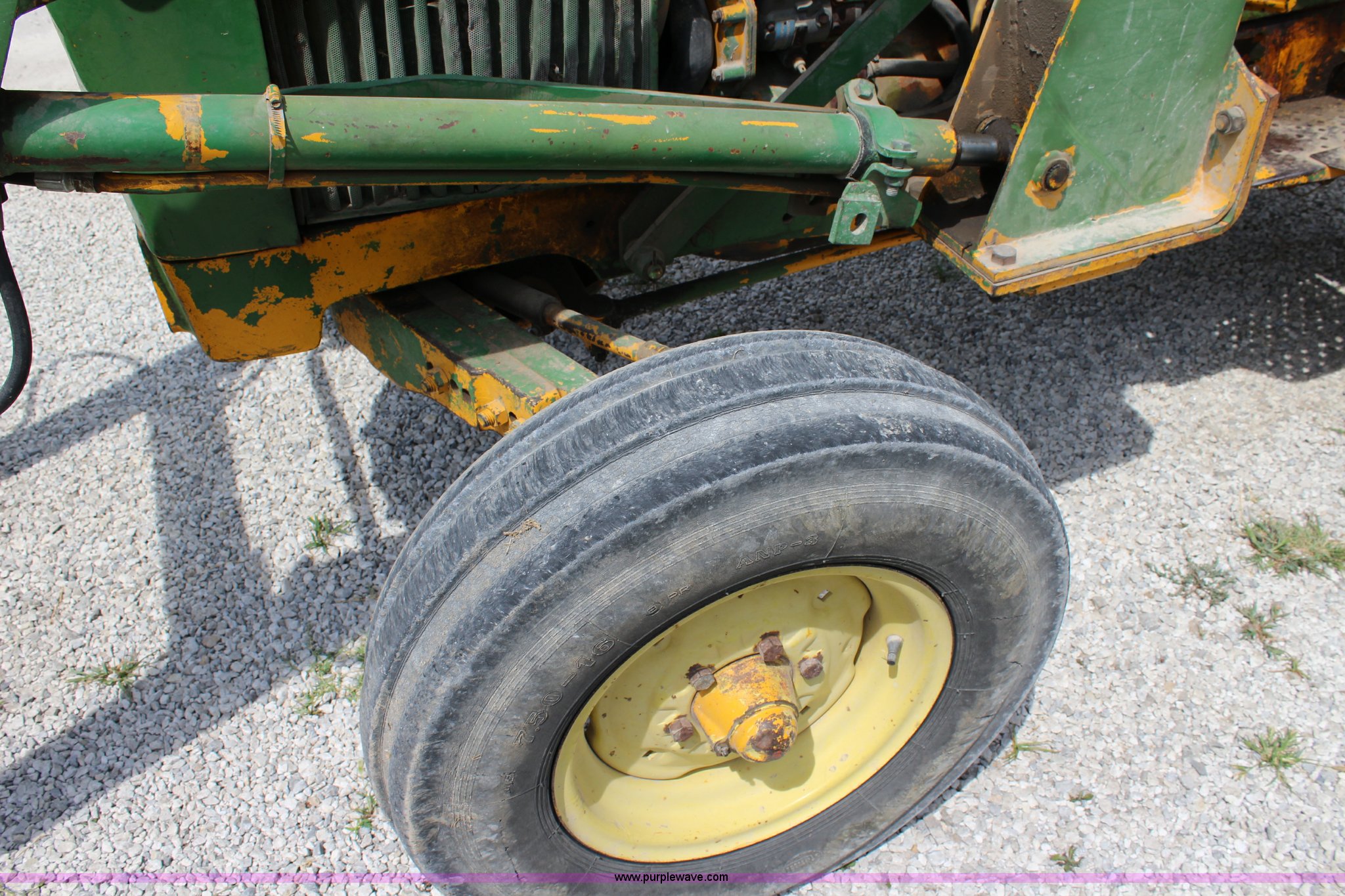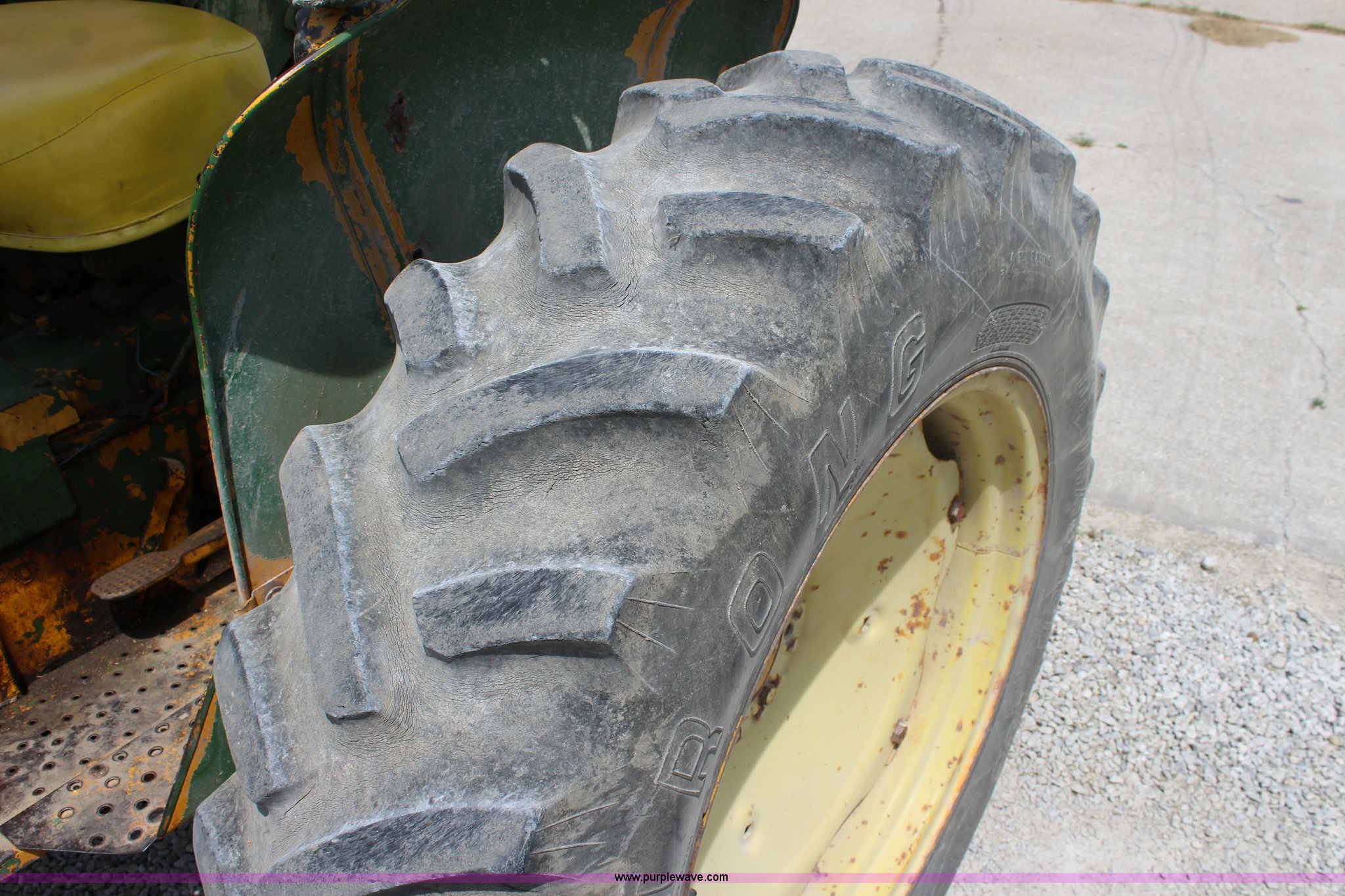 Purple Wave is selling a used Tractor in Kansas. This item is a John Deere 302 tractor with the following: 5,495 hours on meter, John Deere 2.7L three cylinder diesel engine, 50 HP, Manual transmission, 8F-4R gears, Canopy, Three point, 540 PTO, Rear hydraulic remote set, Loader, 62"W bucket, Two-lever controls, 7.50-16 front tires, 13.6-28 rear tires, Hydraulic leak on loader hydraulics, Serial 26397T