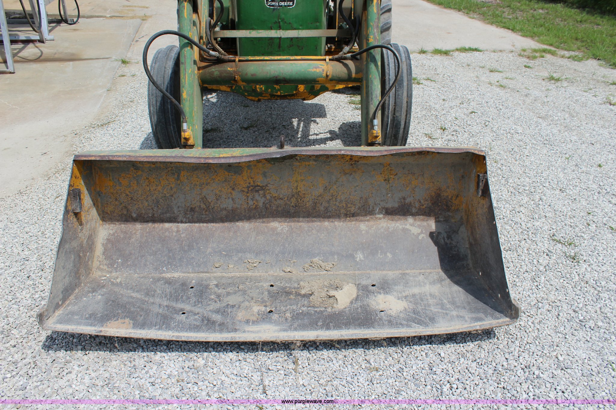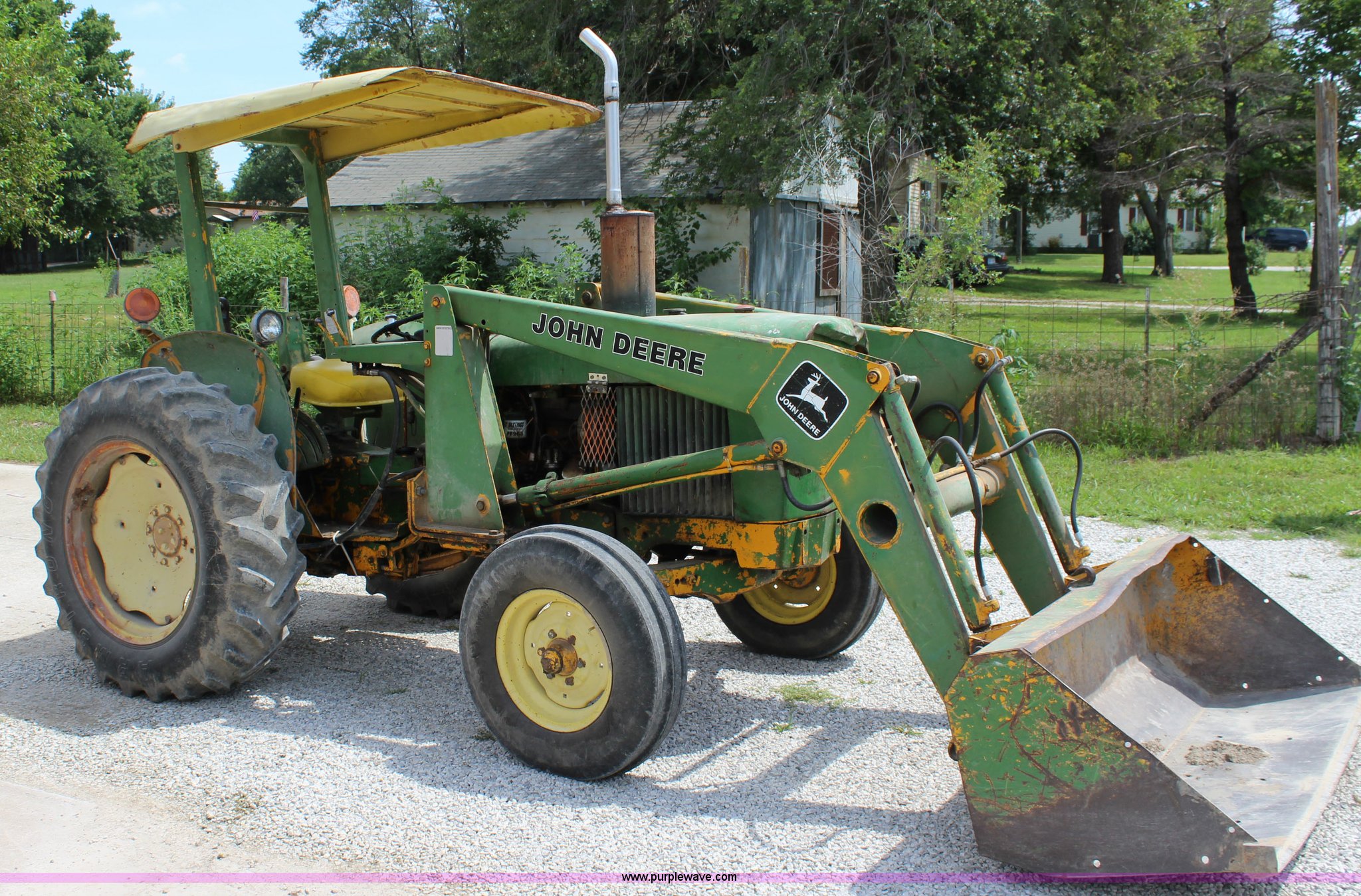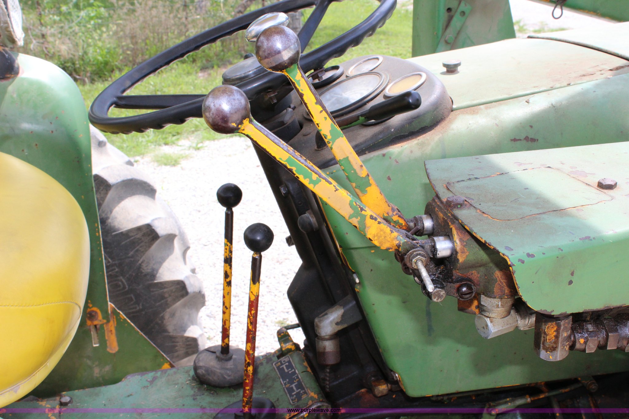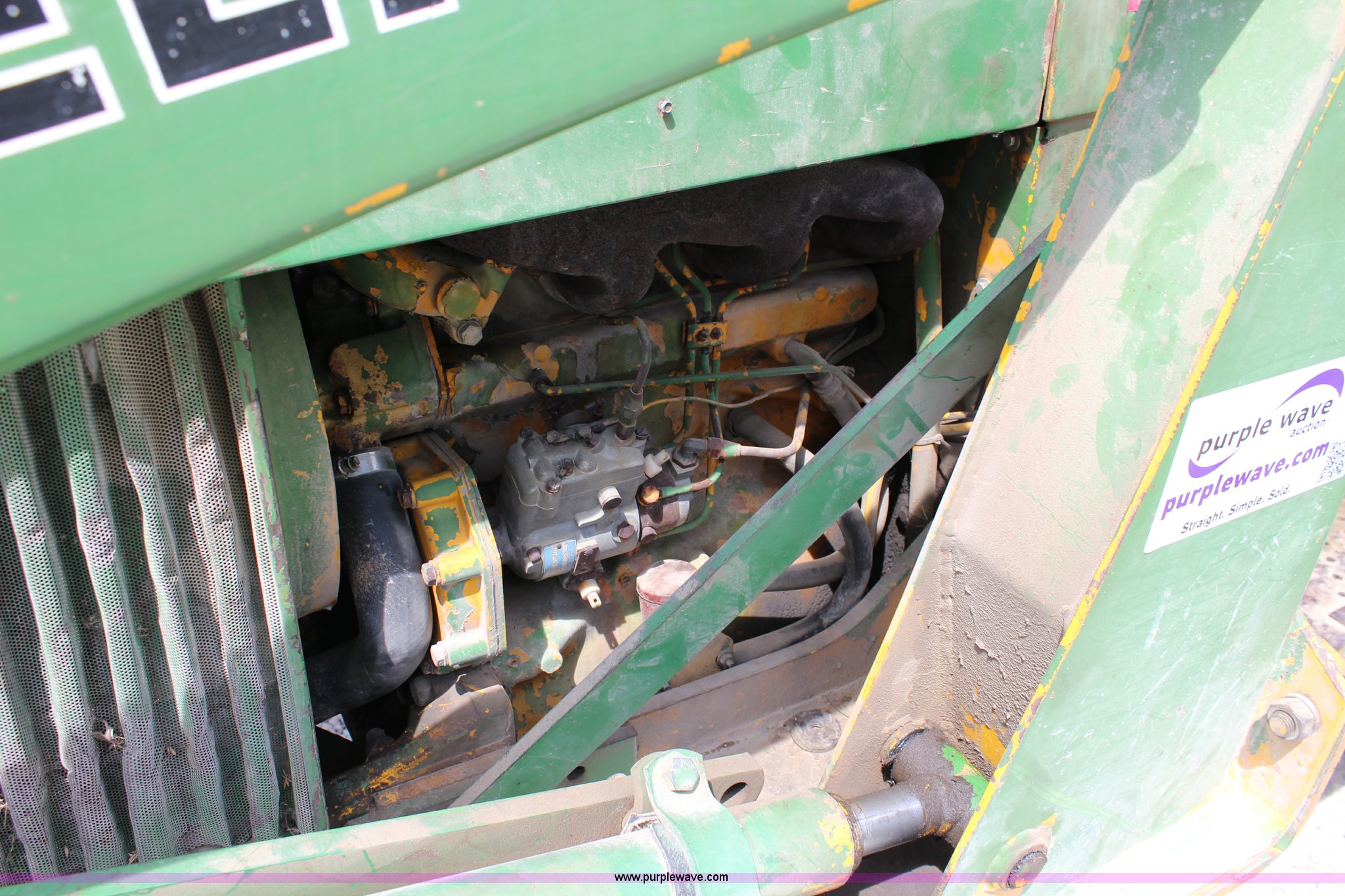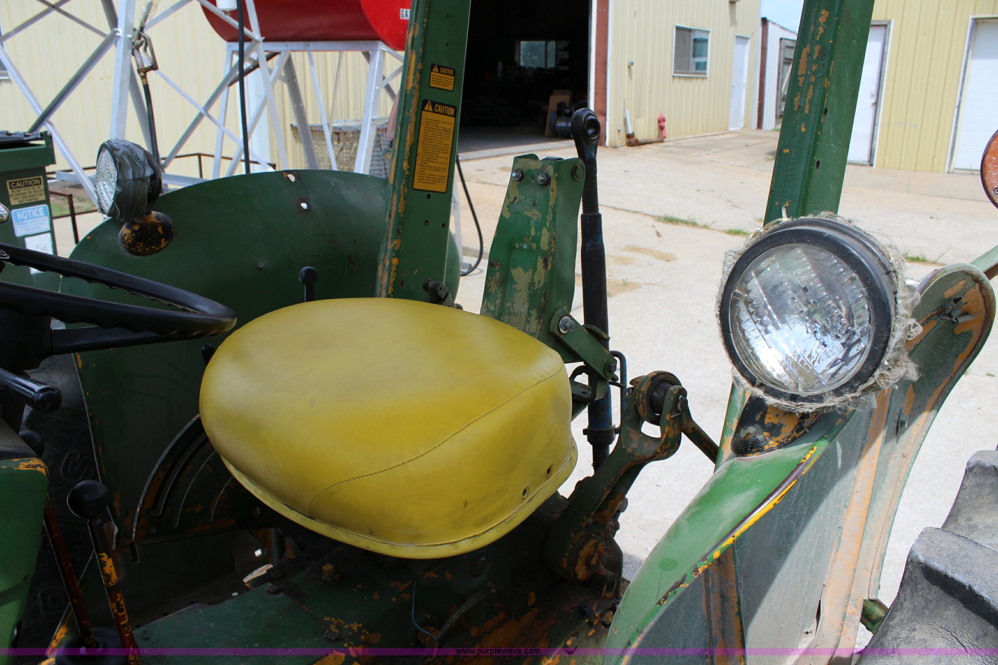 Purple Wave is selling a used Tractor in Kansas. This item is a John Deere 302 tractor with the following: 5,495 hours on meter, John Deere 2.7L three cylinder diesel engine, 50 HP, Manual transmission, 8F-4R gears, Canopy, Three point, 540 PTO, Rear hydraulic remote set, Loader, 62"W bucket, Two-lever controls, 7.50-16 front tires, 13.6-28 rear tires, Hydraulic leak on loader hydraulics, Serial 26397T