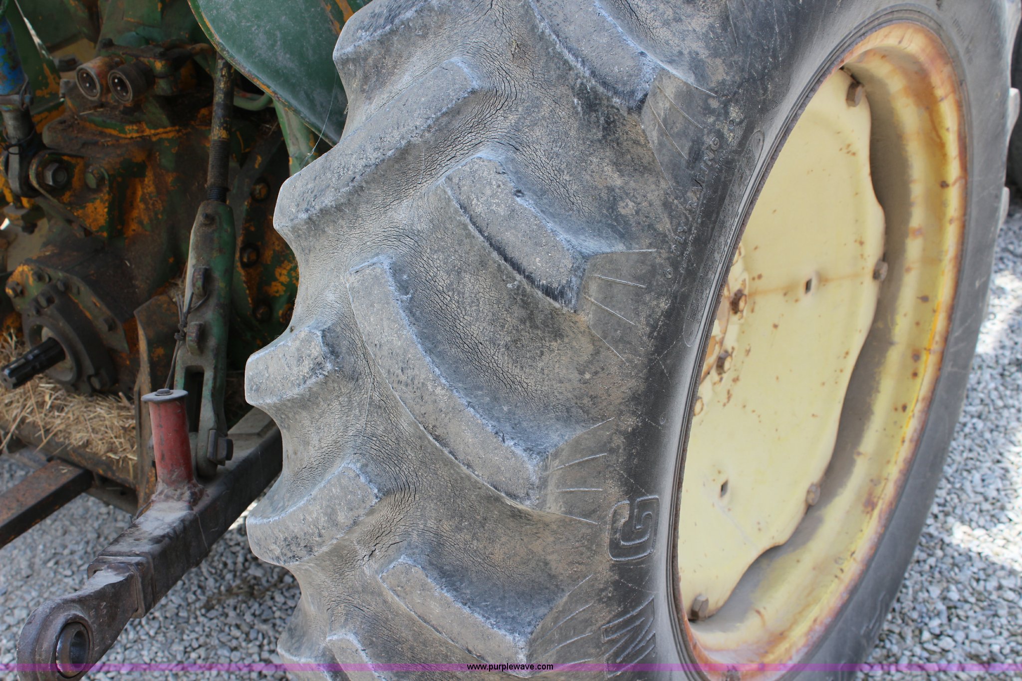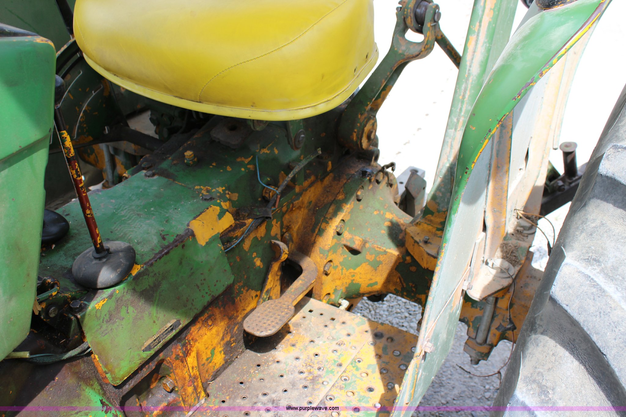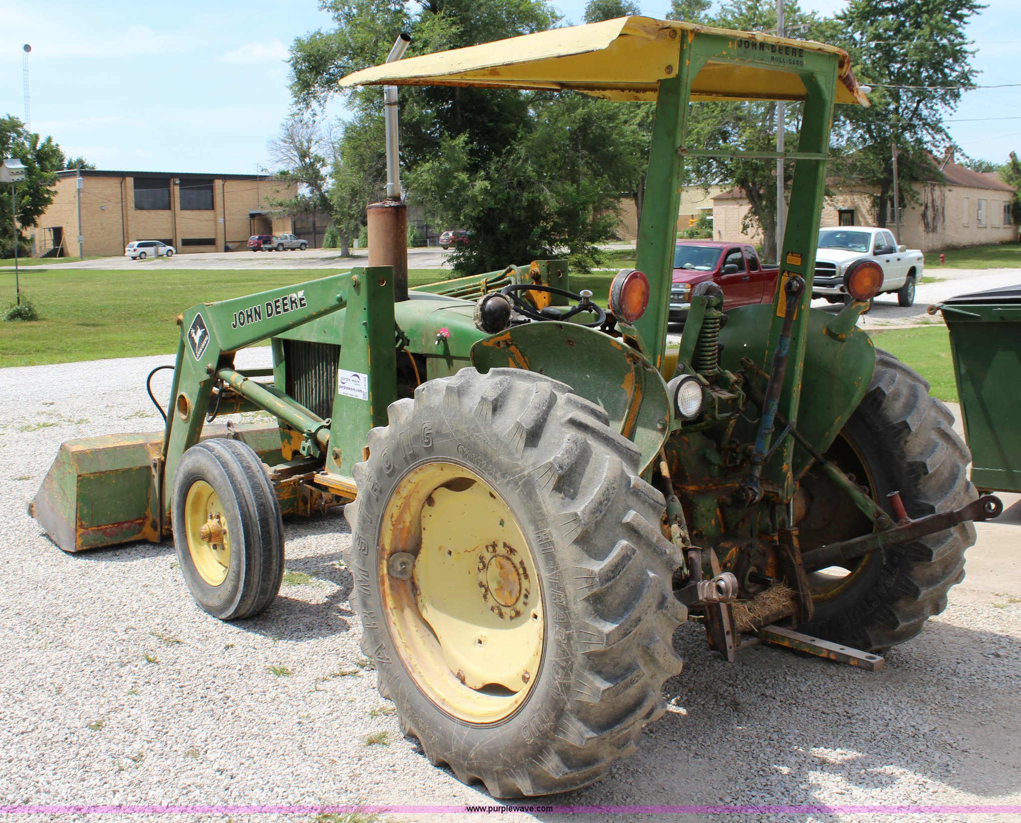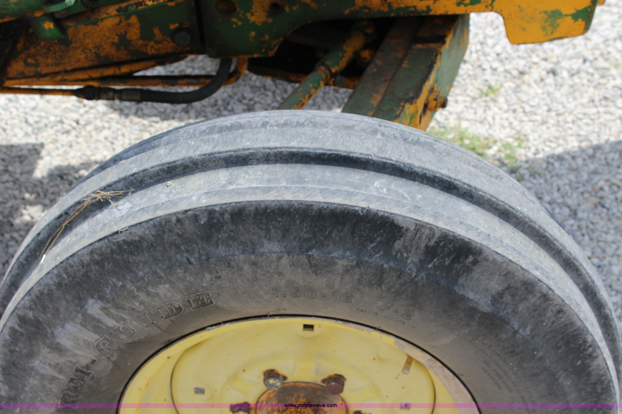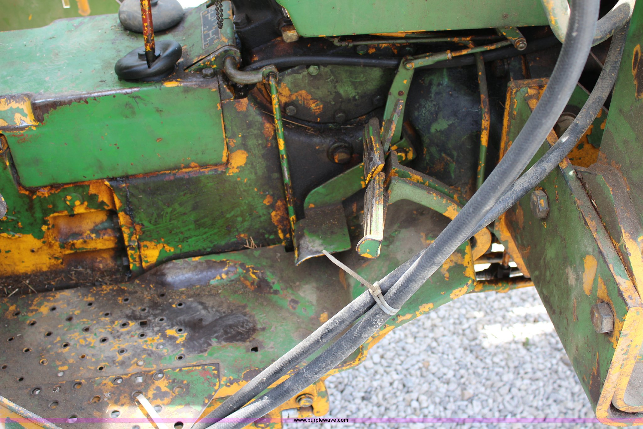 Purple Wave is selling a used Tractor in Kansas. This item is a John Deere 302 tractor with the following: 5,495 hours on meter, John Deere 2.7L three cylinder diesel engine, 50 HP, Manual transmission, 8F-4R gears, Canopy, Three point, 540 PTO, Rear hydraulic remote set, Loader, 62"W bucket, Two-lever controls, 7.50-16 front tires, 13.6-28 rear tires, Hydraulic leak on loader hydraulics, Serial 26397T