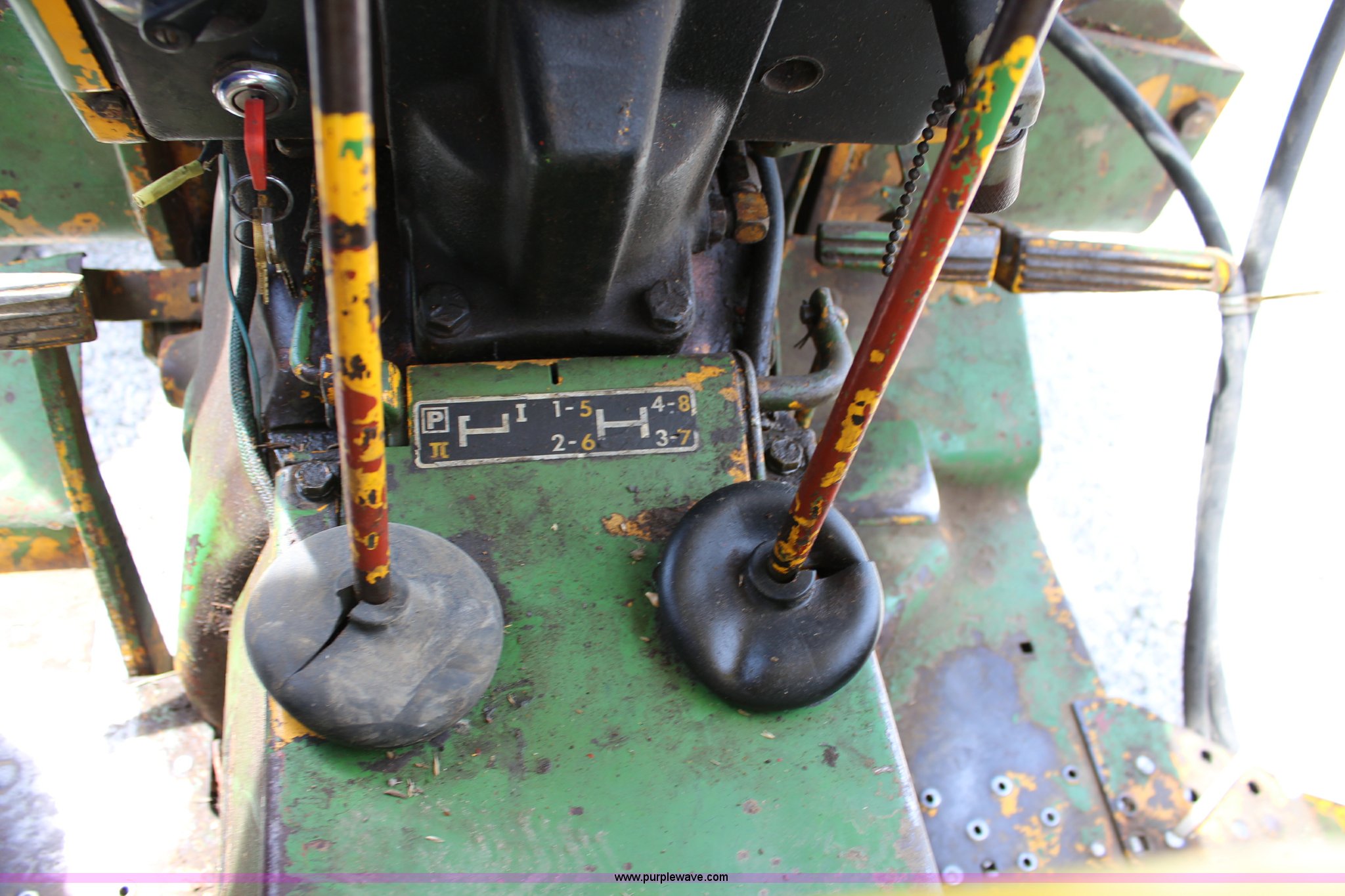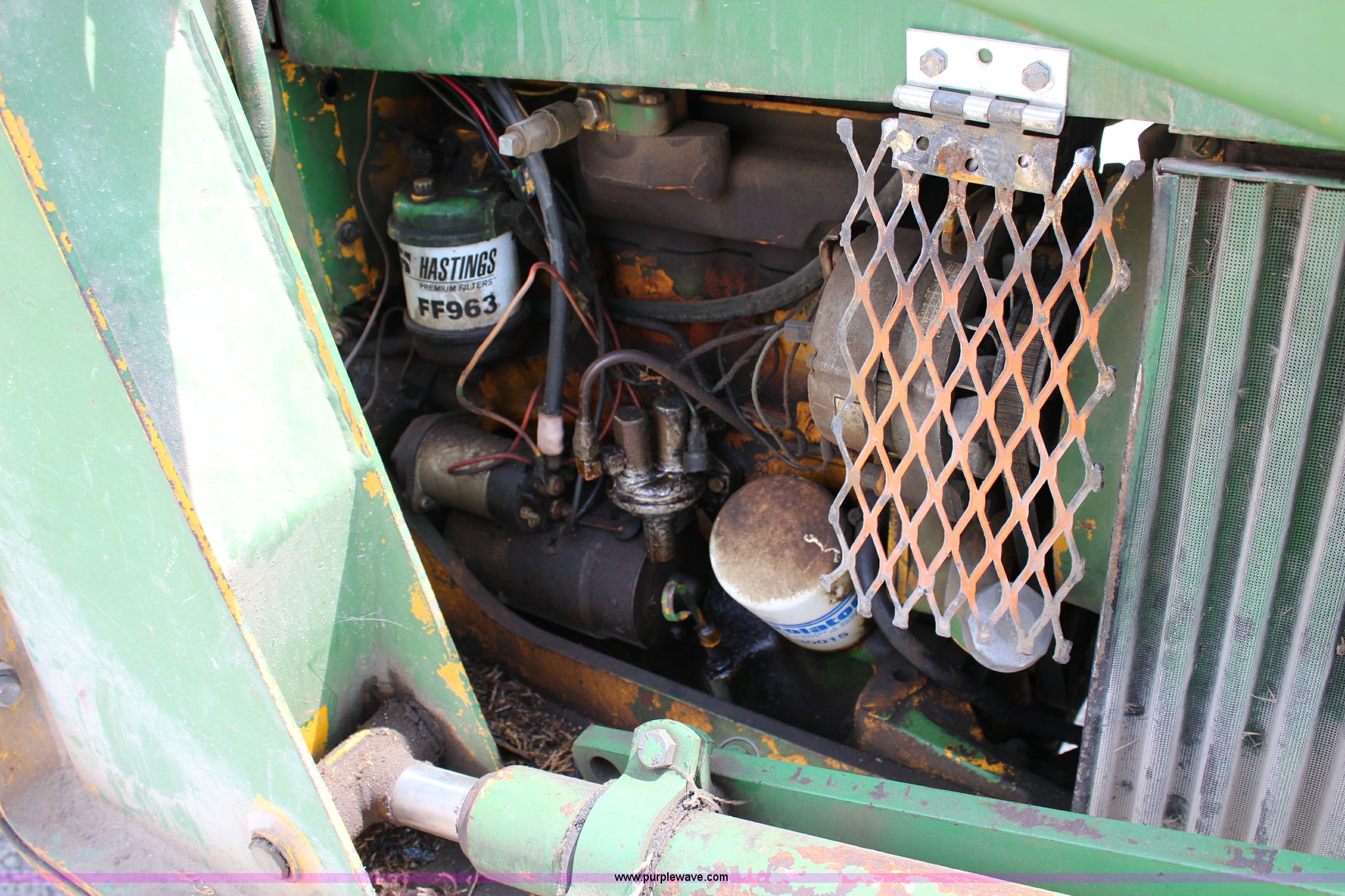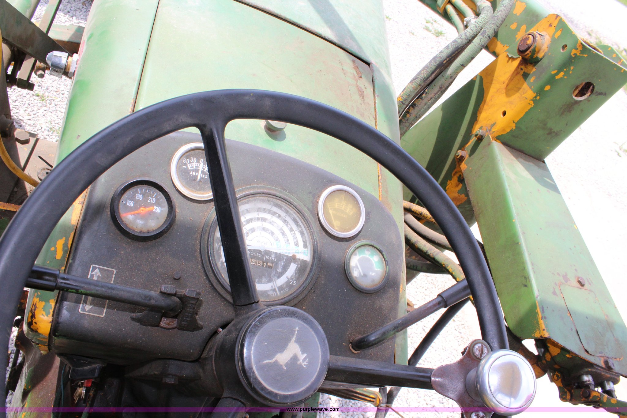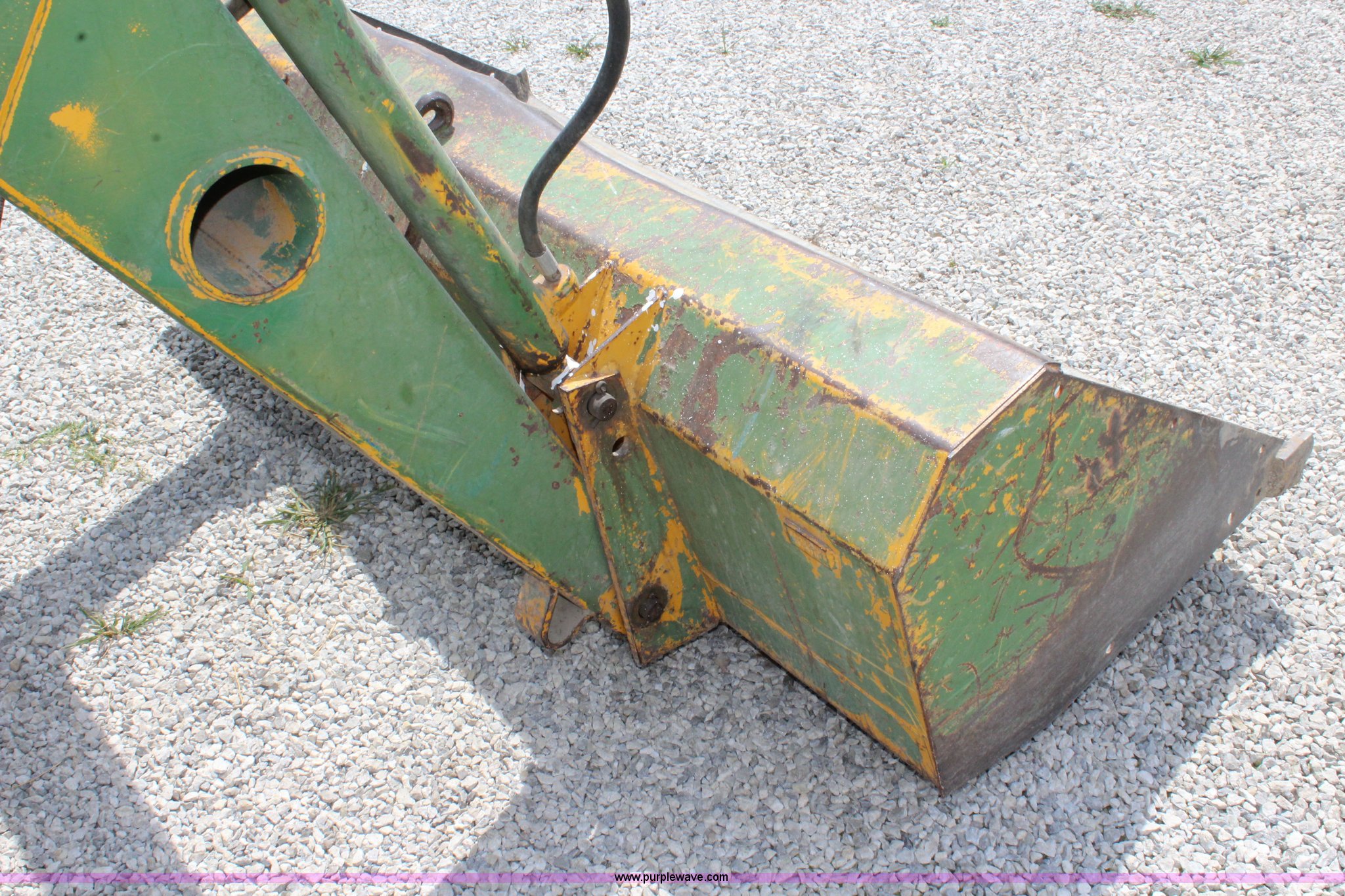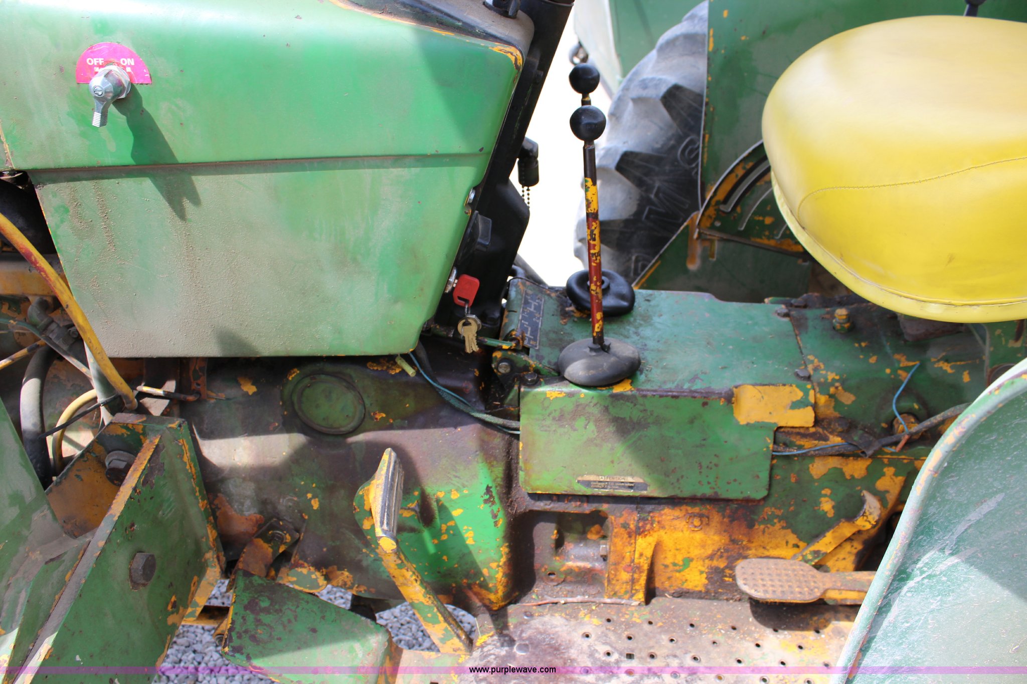 Purple Wave is selling a used Tractor in Kansas. This item is a John Deere 302 tractor with the following: 5,495 hours on meter, John Deere 2.7L three cylinder diesel engine, 50 HP, Manual transmission, 8F-4R gears, Canopy, Three point, 540 PTO, Rear hydraulic remote set, Loader, 62"W bucket, Two-lever controls, 7.50-16 front tires, 13.6-28 rear tires, Hydraulic leak on loader hydraulics, Serial 26397T