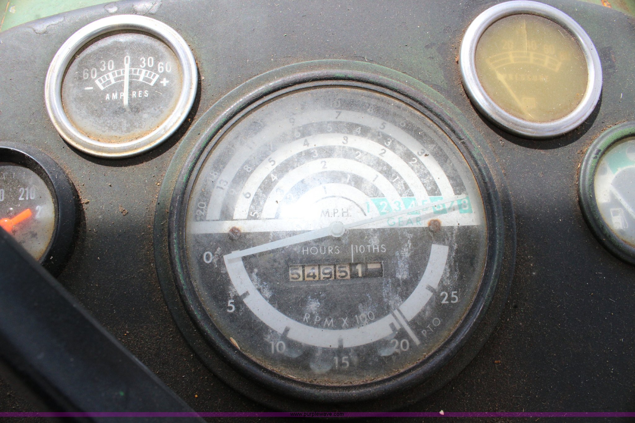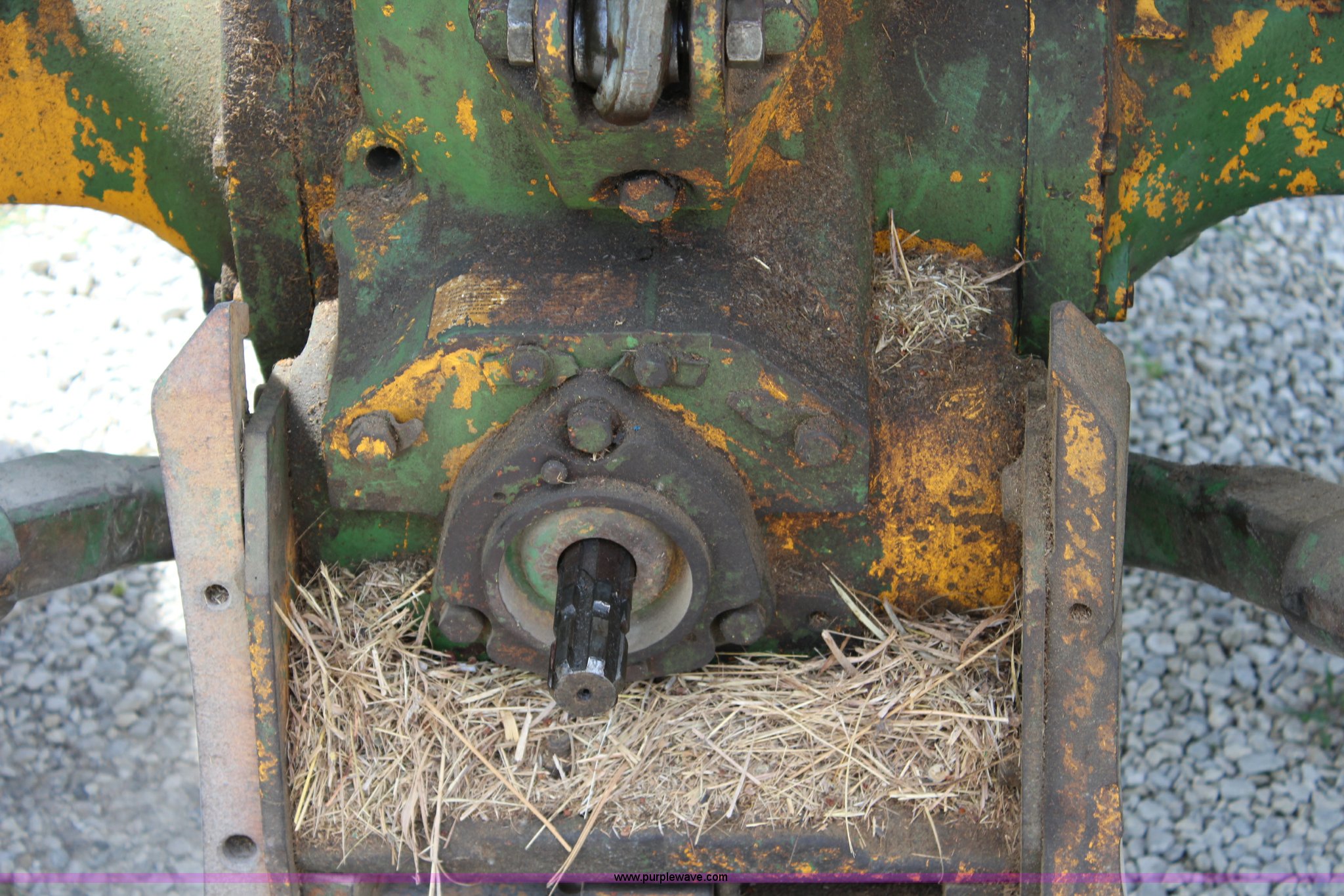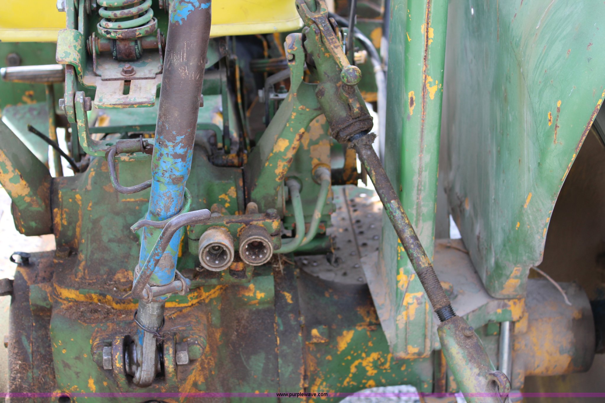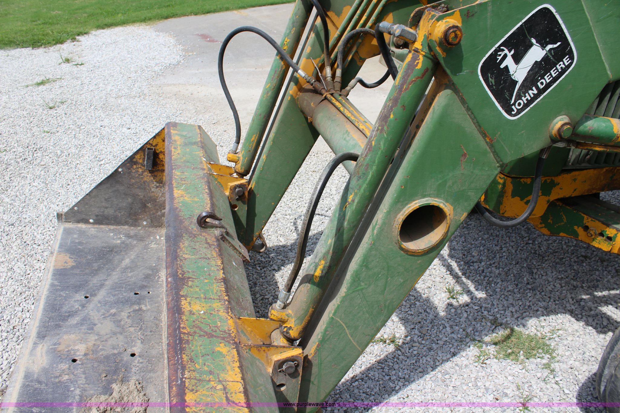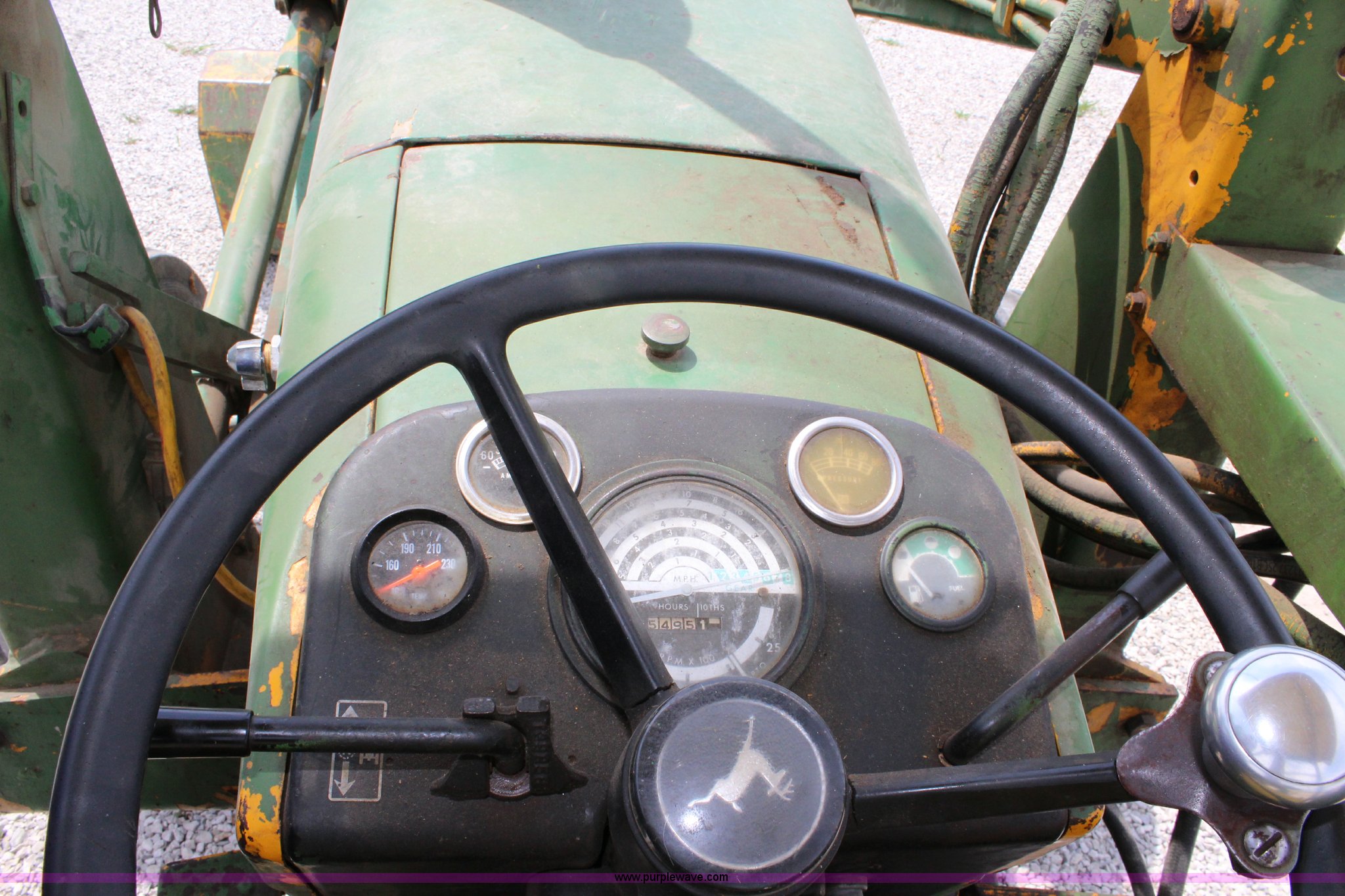 Purple Wave is selling a used Tractor in Kansas. This item is a John Deere 302 tractor with the following: 5,495 hours on meter, John Deere 2.7L three cylinder diesel engine, 50 HP, Manual transmission, 8F-4R gears, Canopy, Three point, 540 PTO, Rear hydraulic remote set, Loader, 62"W bucket, Two-lever controls, 7.50-16 front tires, 13.6-28 rear tires, Hydraulic leak on loader hydraulics, Serial 26397T