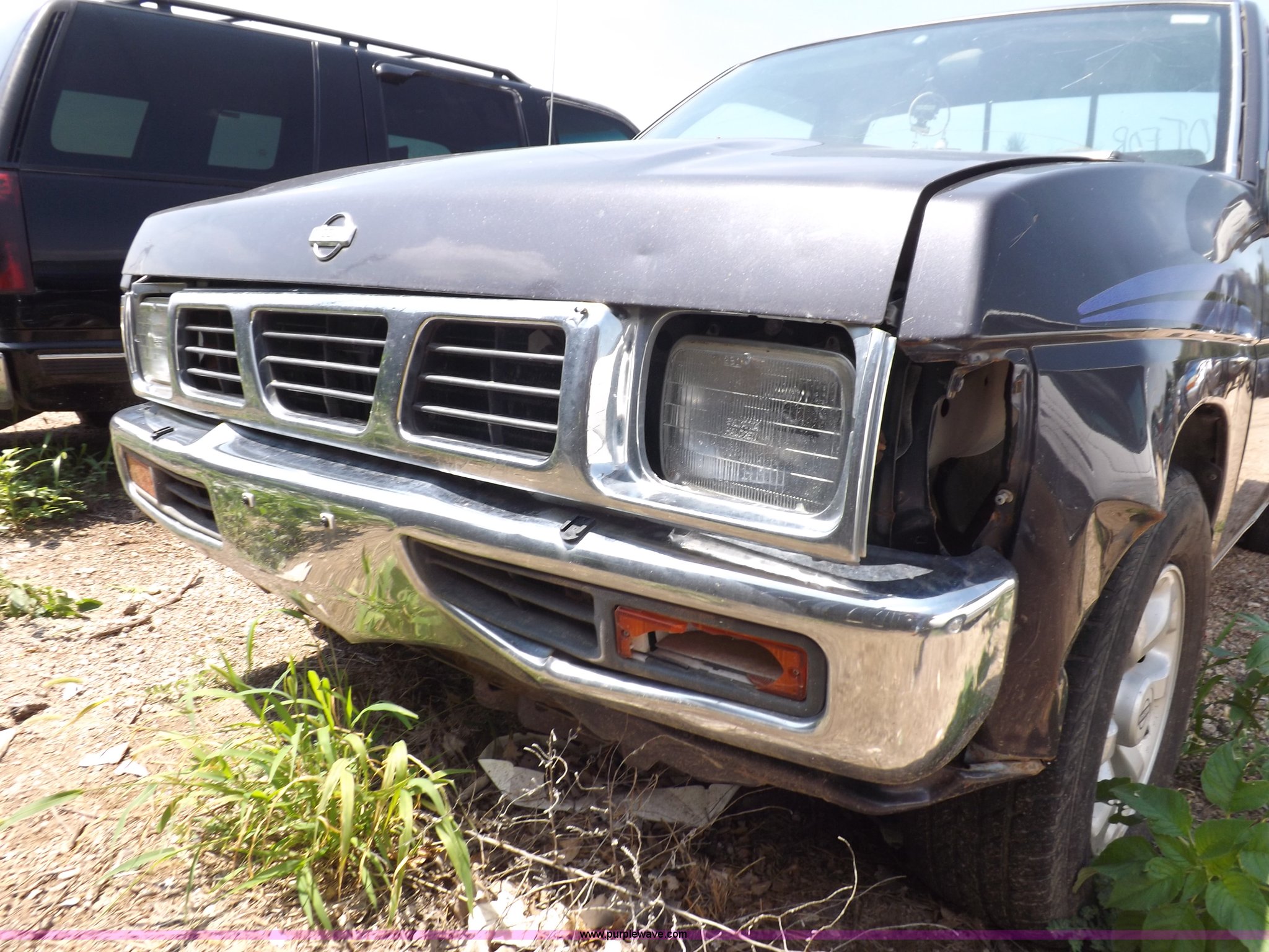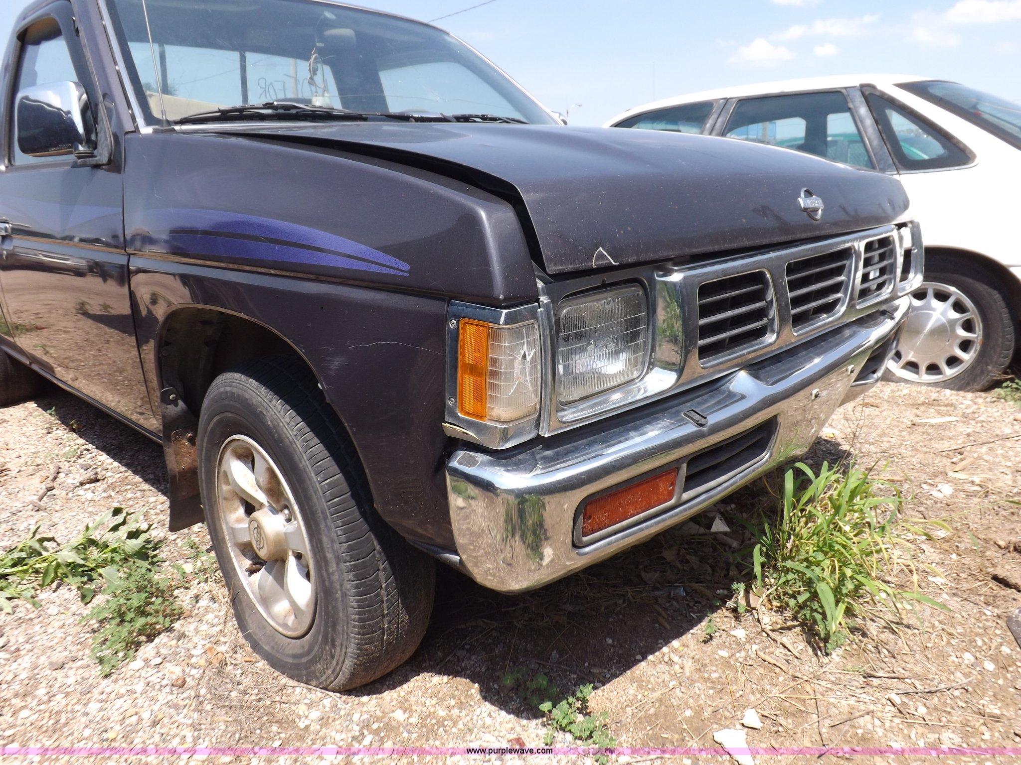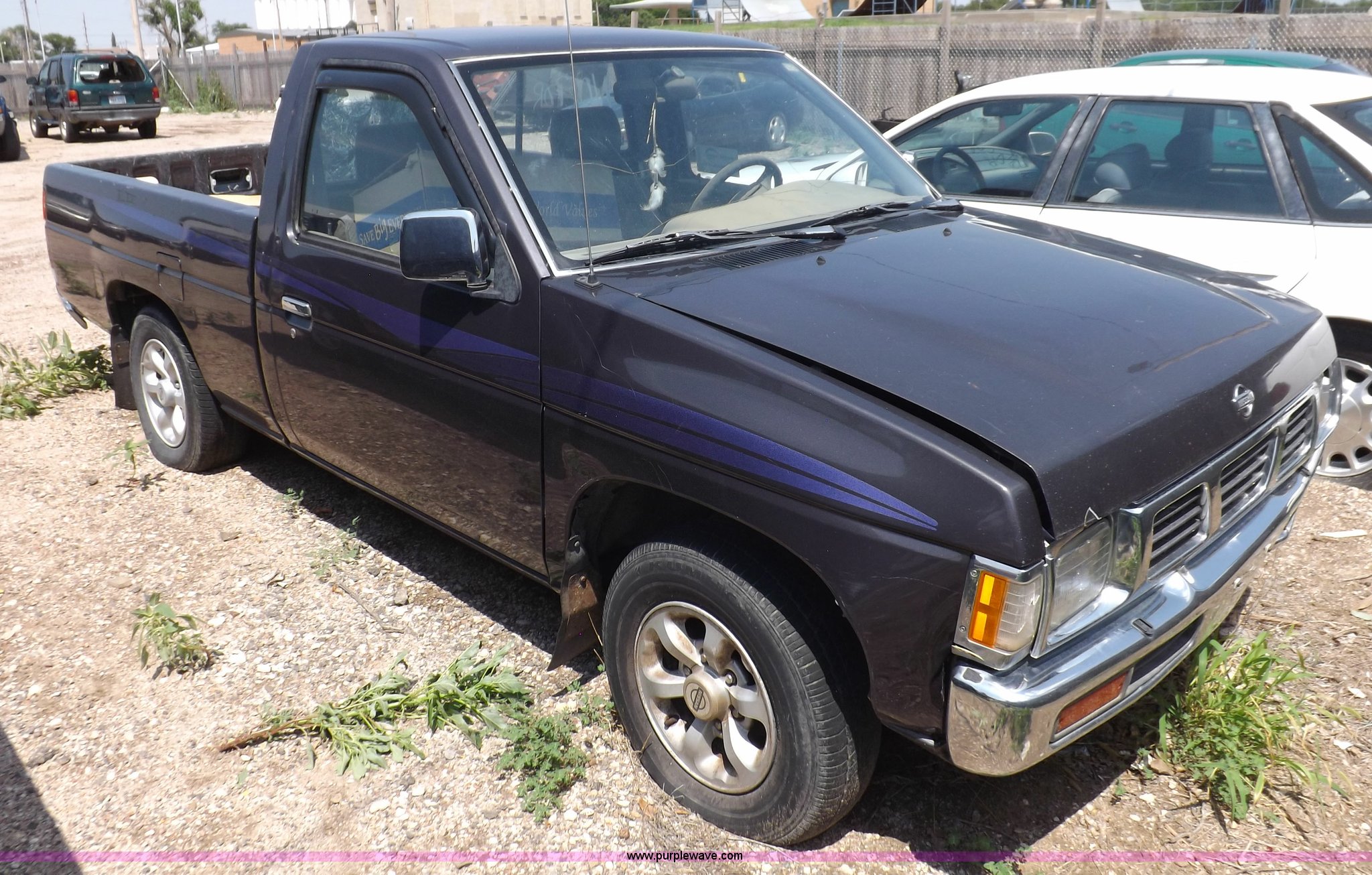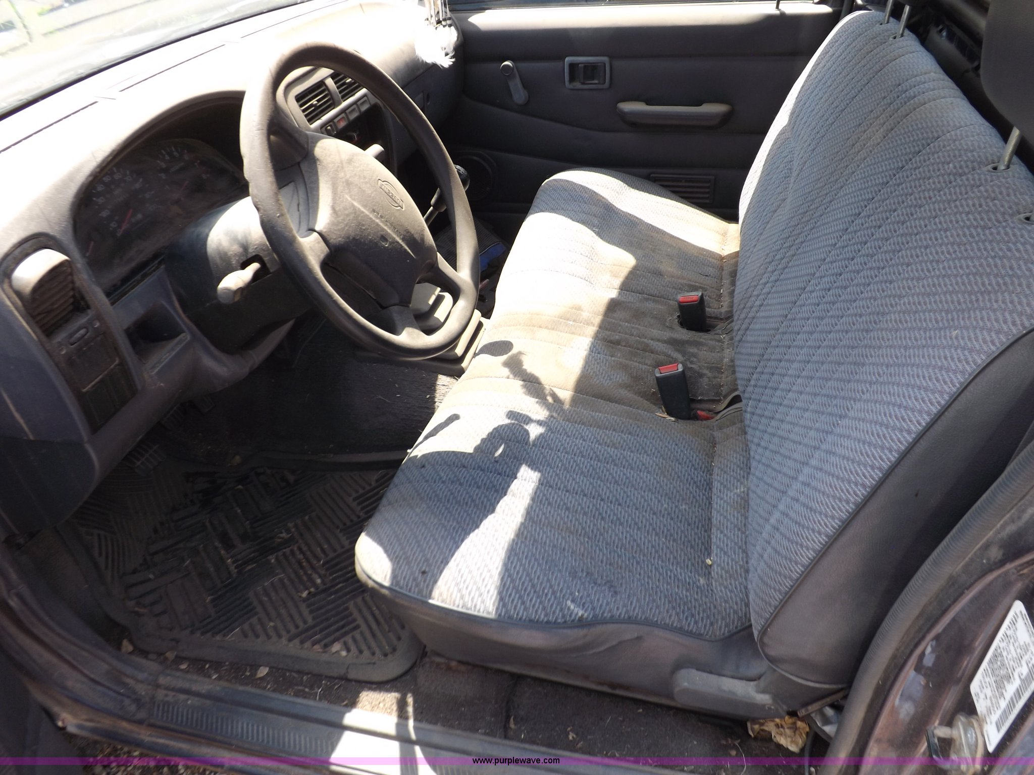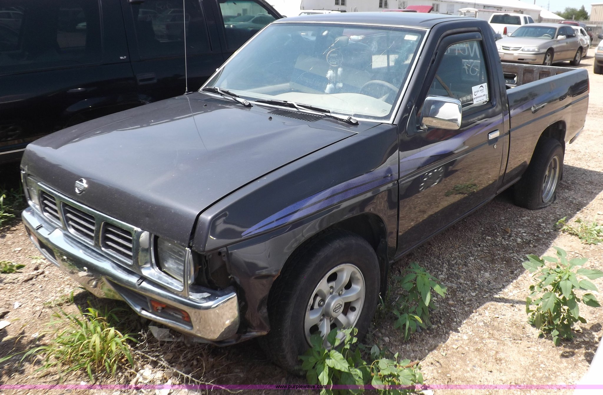 Purple Wave is selling a used Compact Pickup or Van in Kansas. This item is a 1997 Nissan XE pickup truck with the following: 173,616 miles on odometer, 2.4L L4 SOHC 12V gas engine, Five speed manual transmission, AC and heat, AM/FM/cassette, Manual windows and locks, Cloth interior, 215/70R14 tires, Battery dead, Interior/exterior cosmetic damage, Windshield cracked, Front end damaged, Hood will not unlatch, (3) flat tires, No keys, Unknown running condition