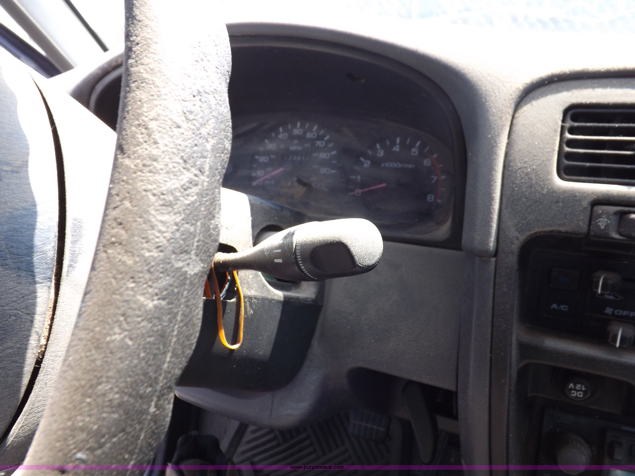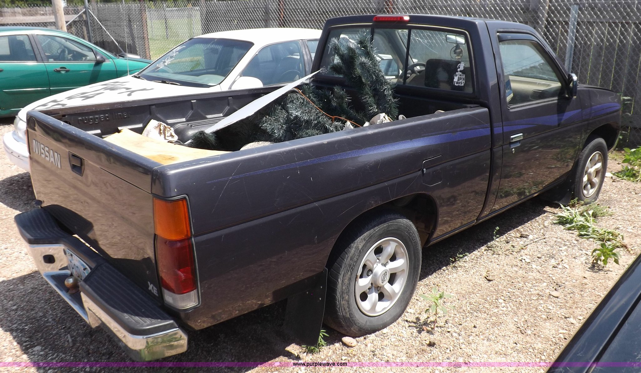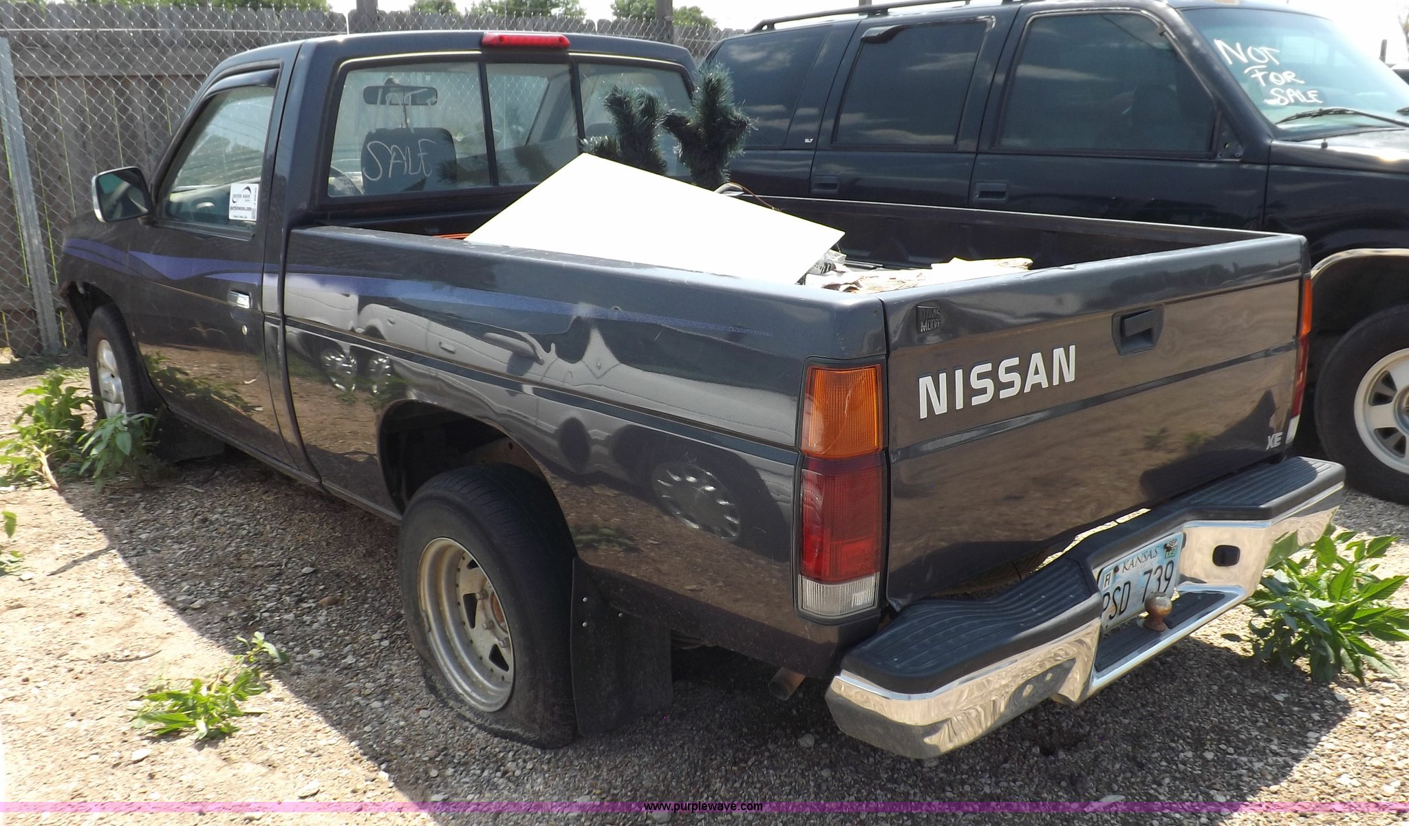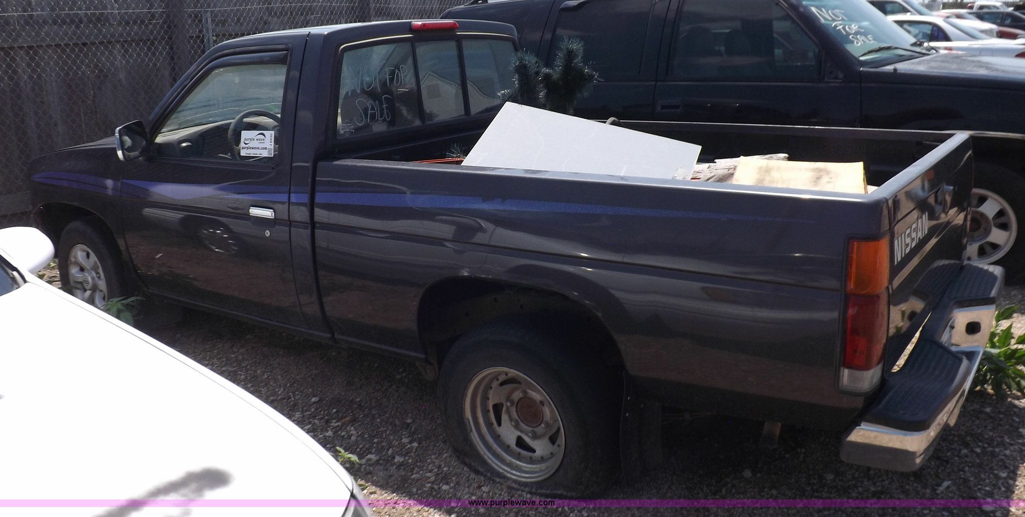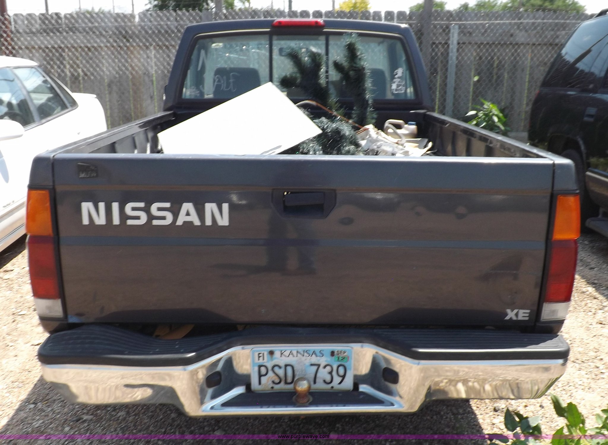 Purple Wave is selling a used Compact Pickup or Van in Kansas. This item is a 1997 Nissan XE pickup truck with the following: 173,616 miles on odometer, 2.4L L4 SOHC 12V gas engine, Five speed manual transmission, AC and heat, AM/FM/cassette, Manual windows and locks, Cloth interior, 215/70R14 tires, Battery dead, Interior/exterior cosmetic damage, Windshield cracked, Front end damaged, Hood will not unlatch, (3) flat tires, No keys, Unknown running condition