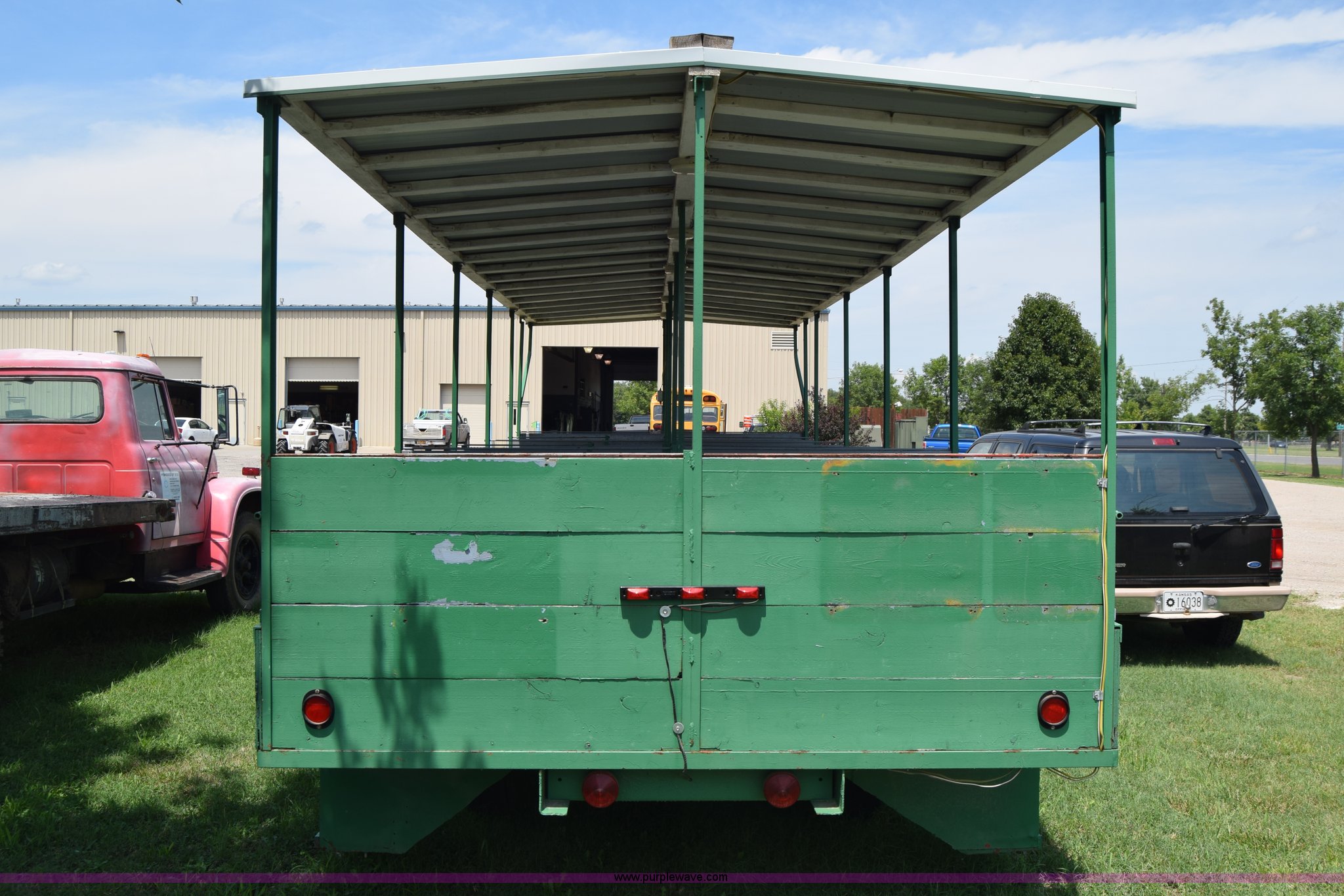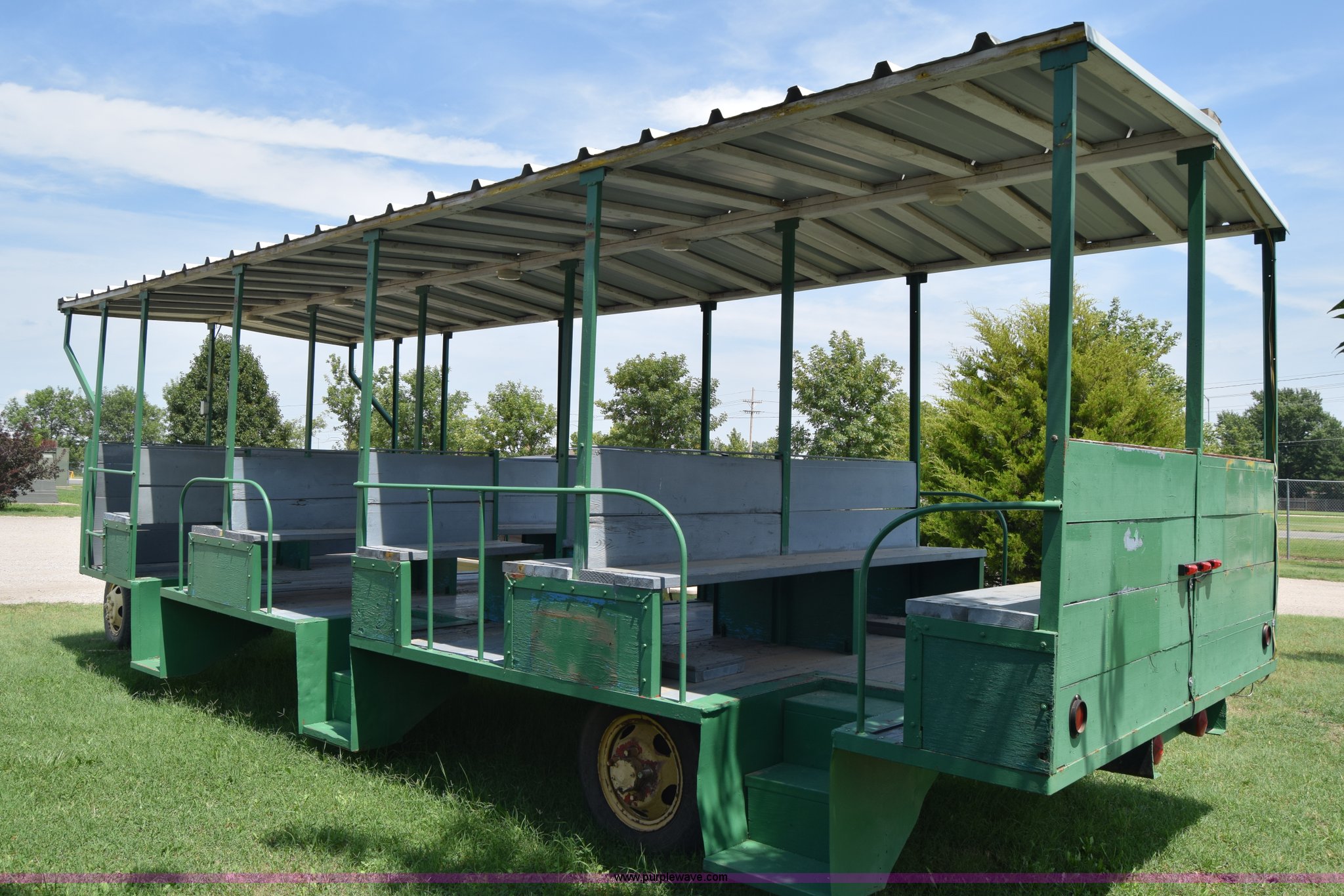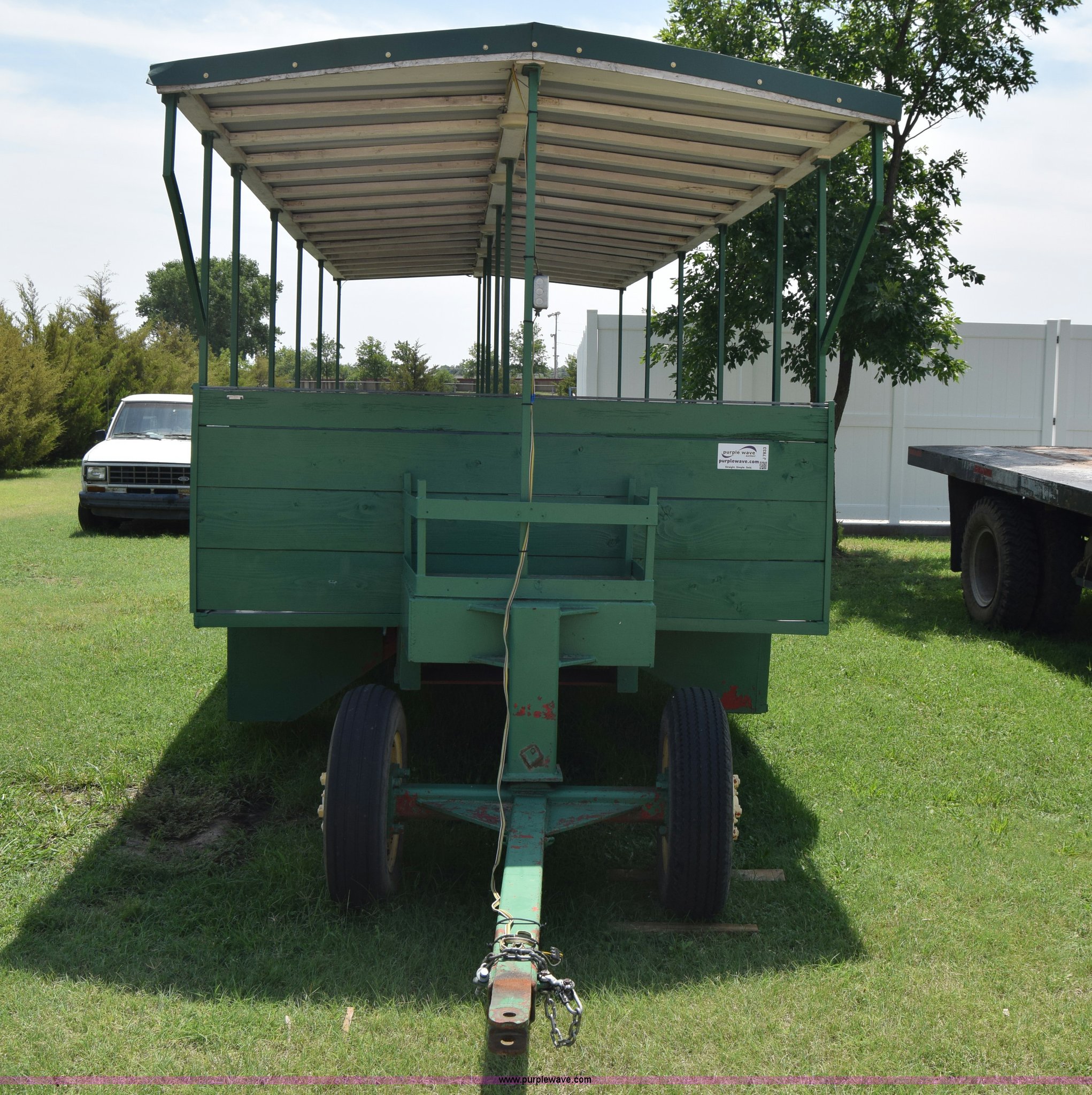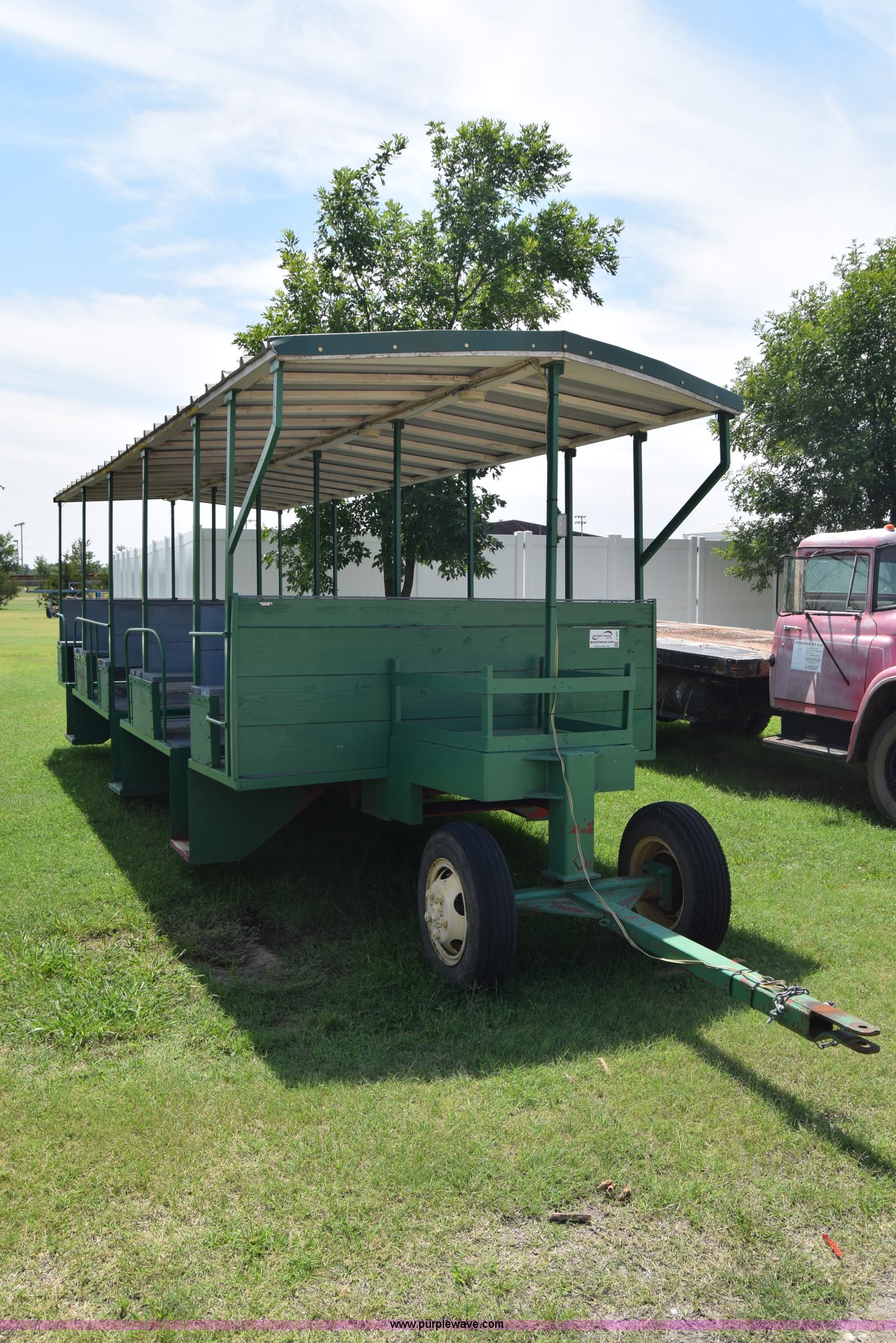 Purple Wave is selling a used Trailer Other in Kansas. This item is a Trolley wagon with the following: 25'L x 8'W x 9'H, Wood floor, Interior lighting, Approx. 25 person capacity, Pin hitch, Spring suspension, 6.50-16SL tires