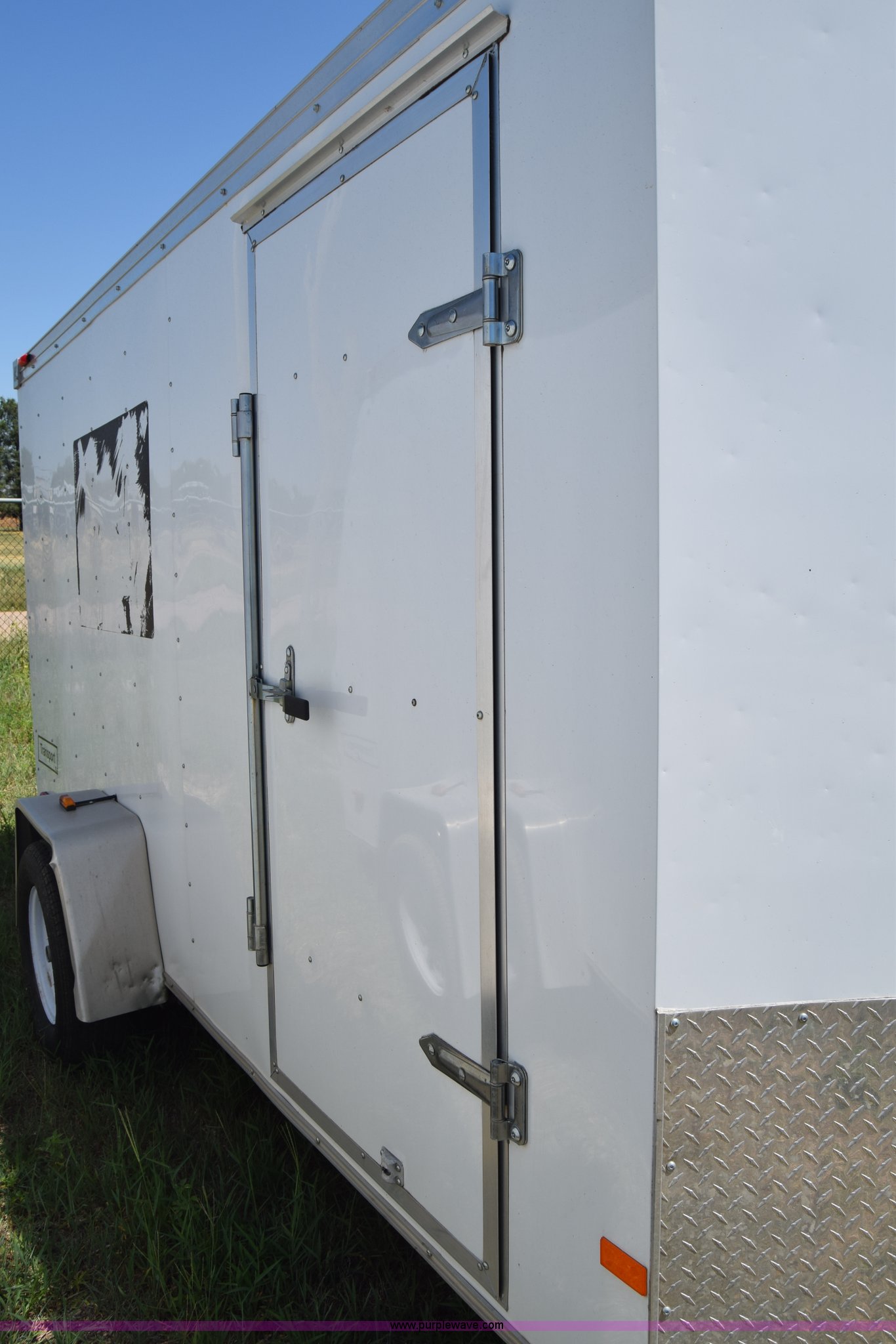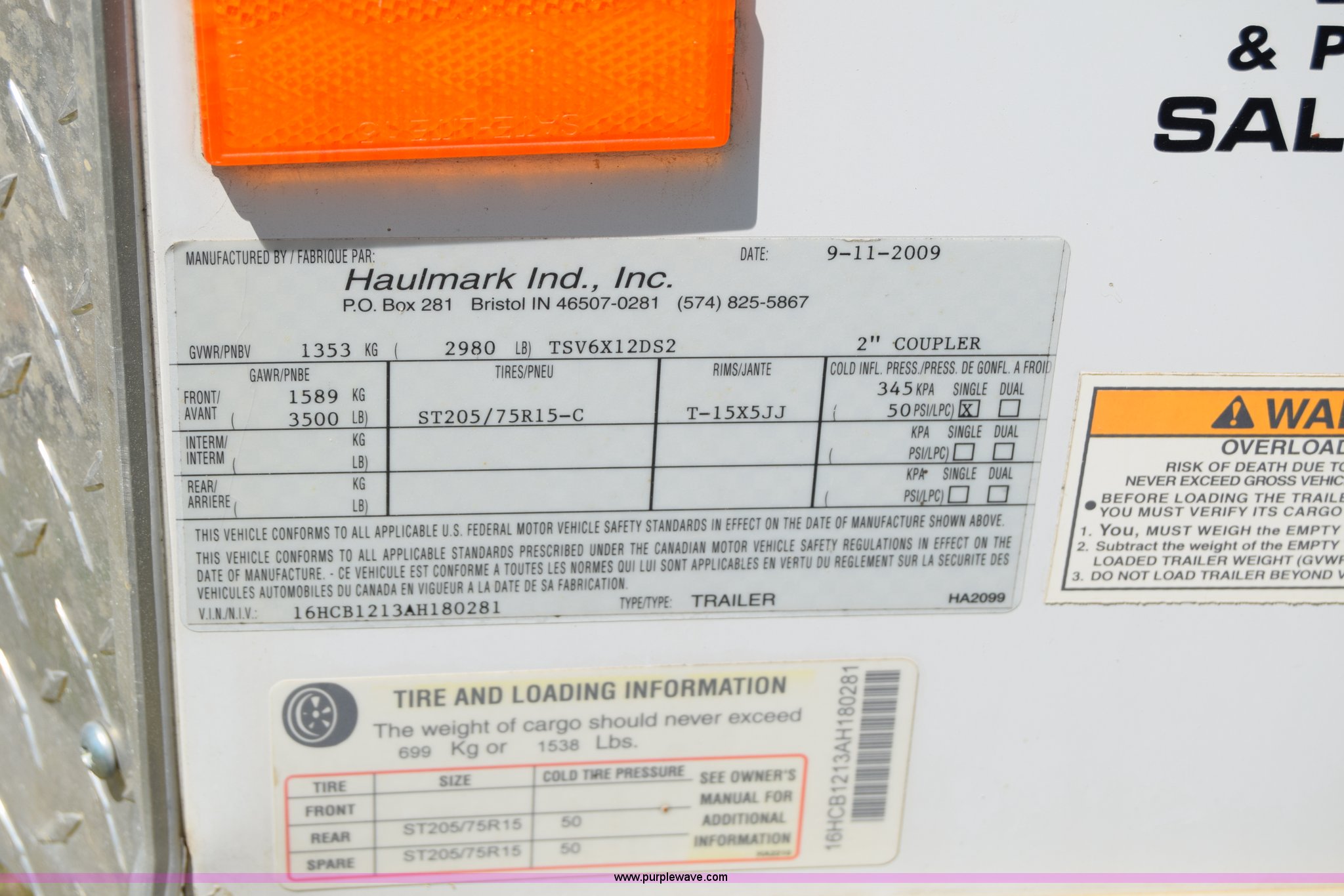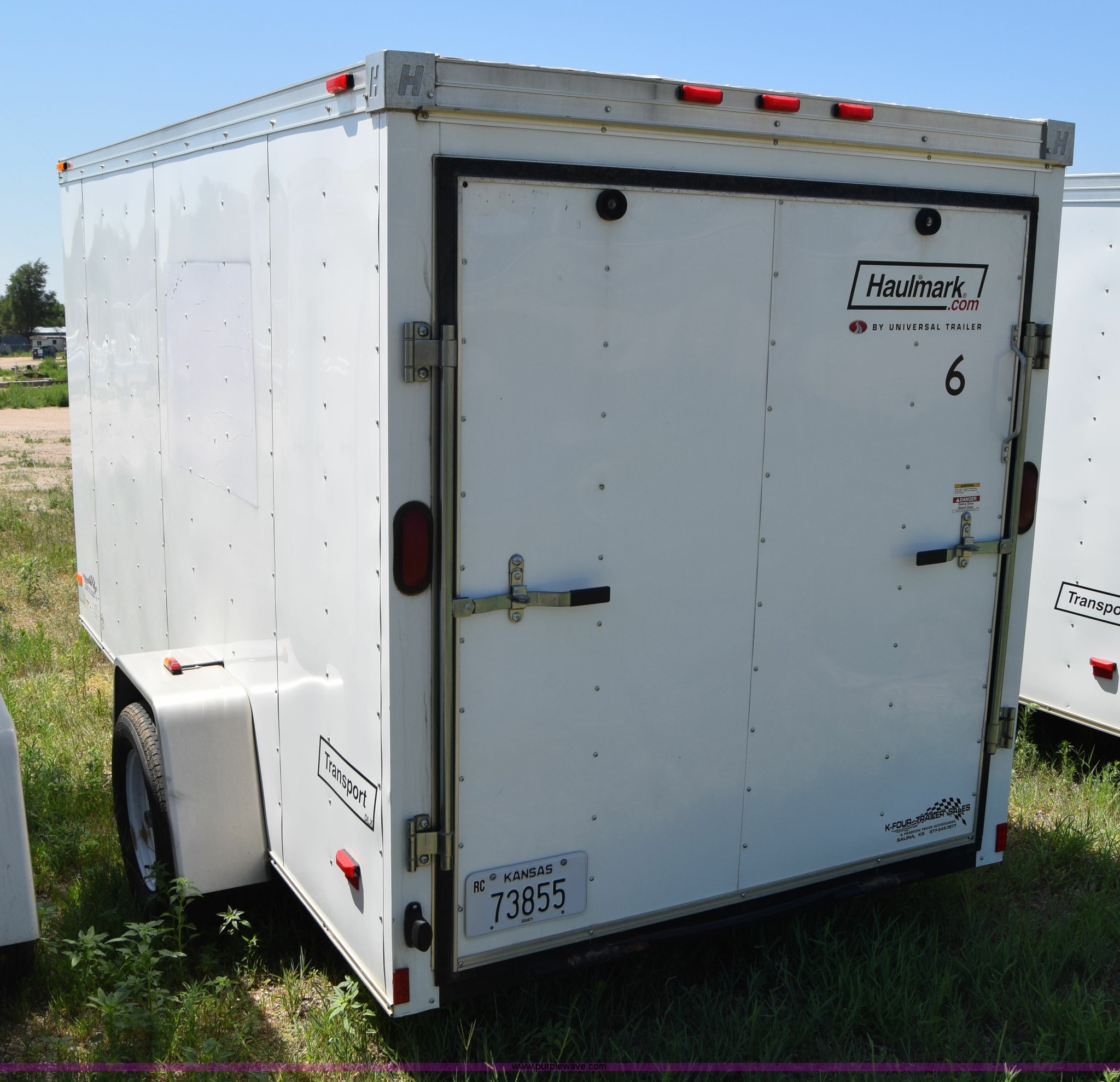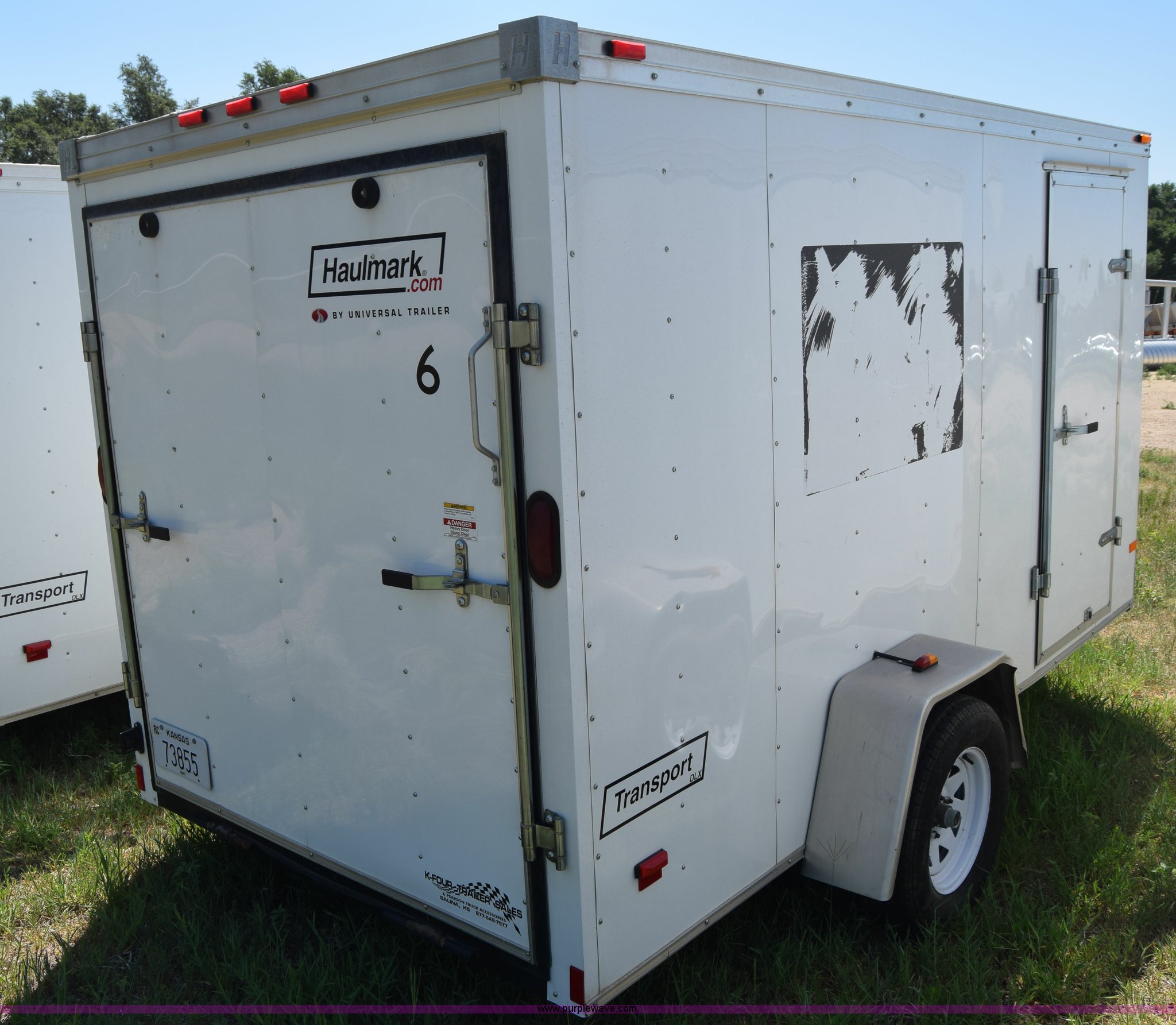 Purple Wave is selling a used Enclosed Cargo Trailer in Kansas. This item is a 2010 Haulmark enclosed cargo trailer with the following: 12'L x 6'W x 6'H, Single axle, Wood floor, Rear fold down door, Side swing door, Interior lighting, Ball hitch, 2" coupler, 205/75R15 tires, Dents and scratches, GVWR 2,980 lbs