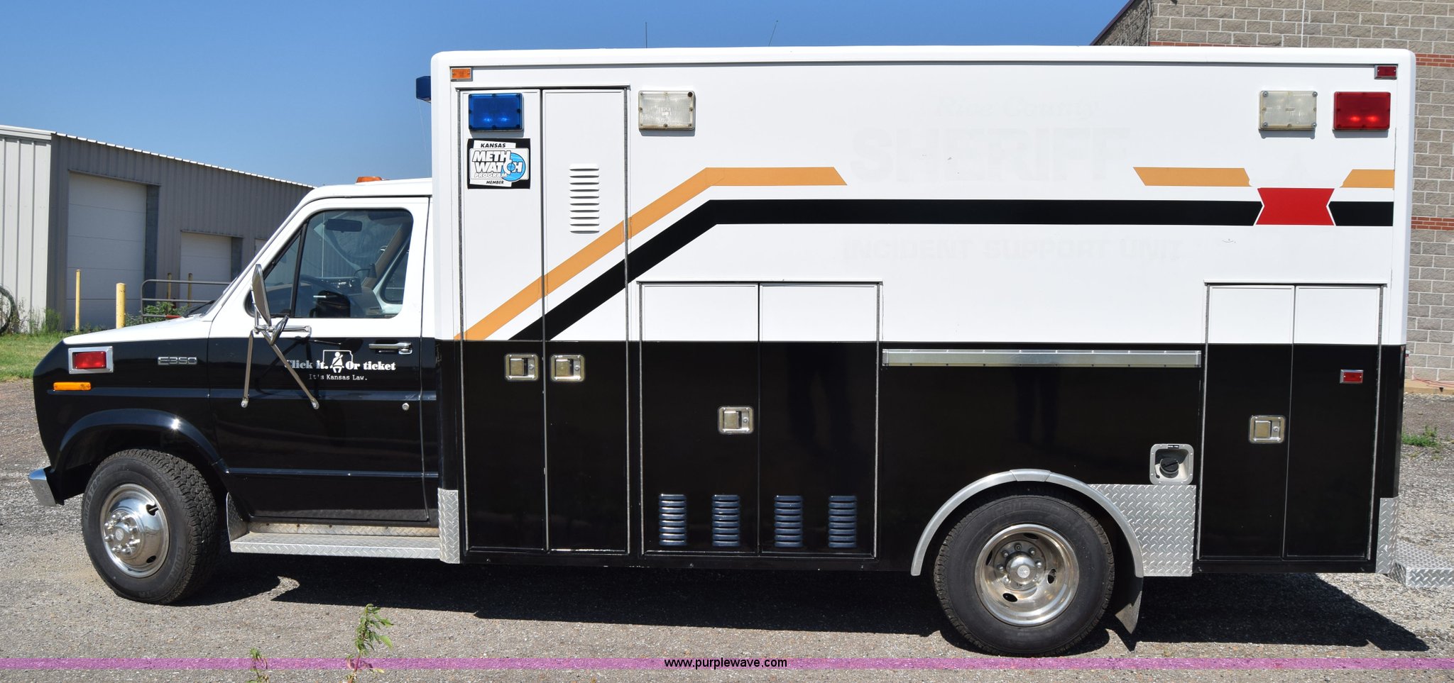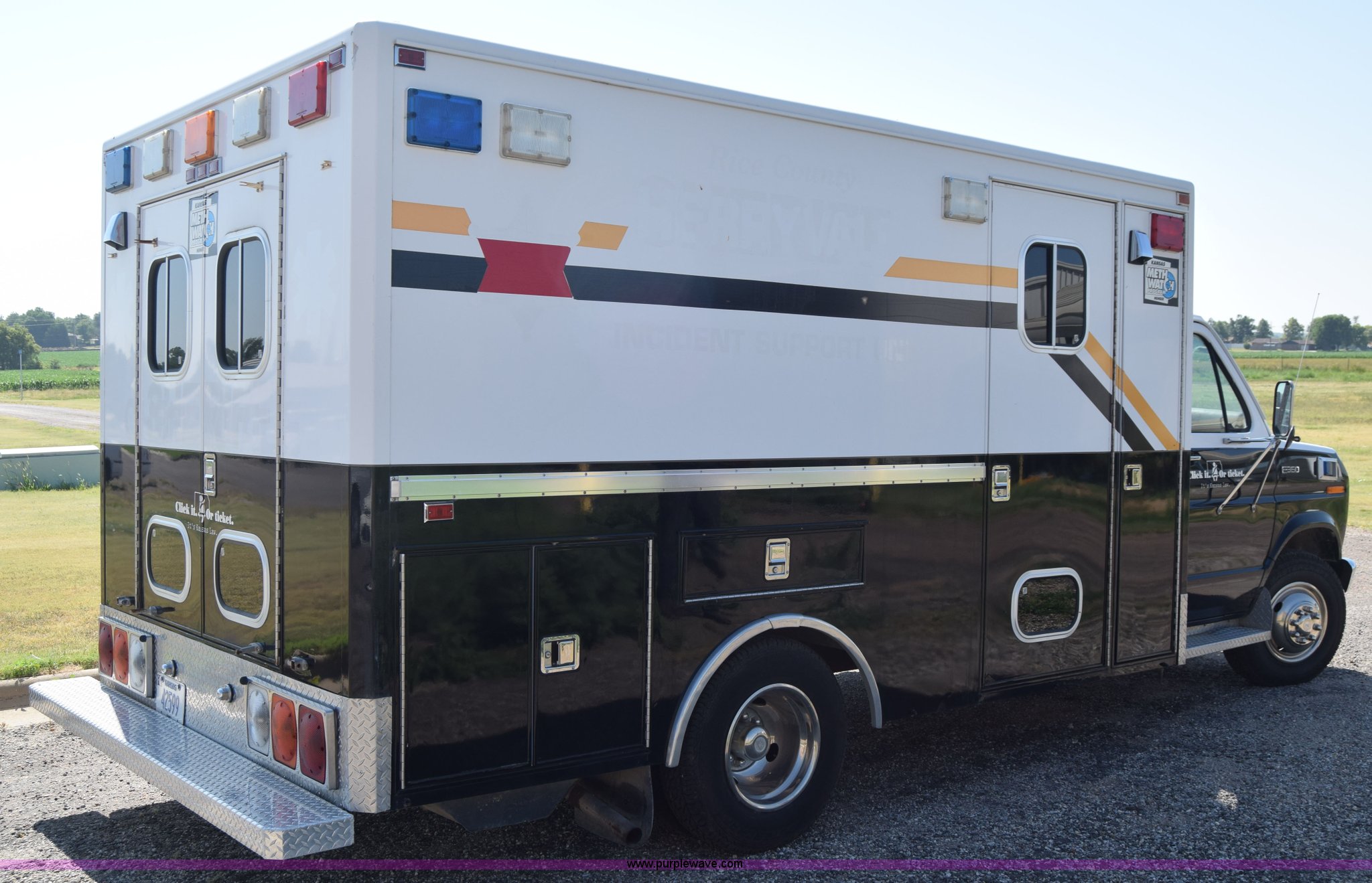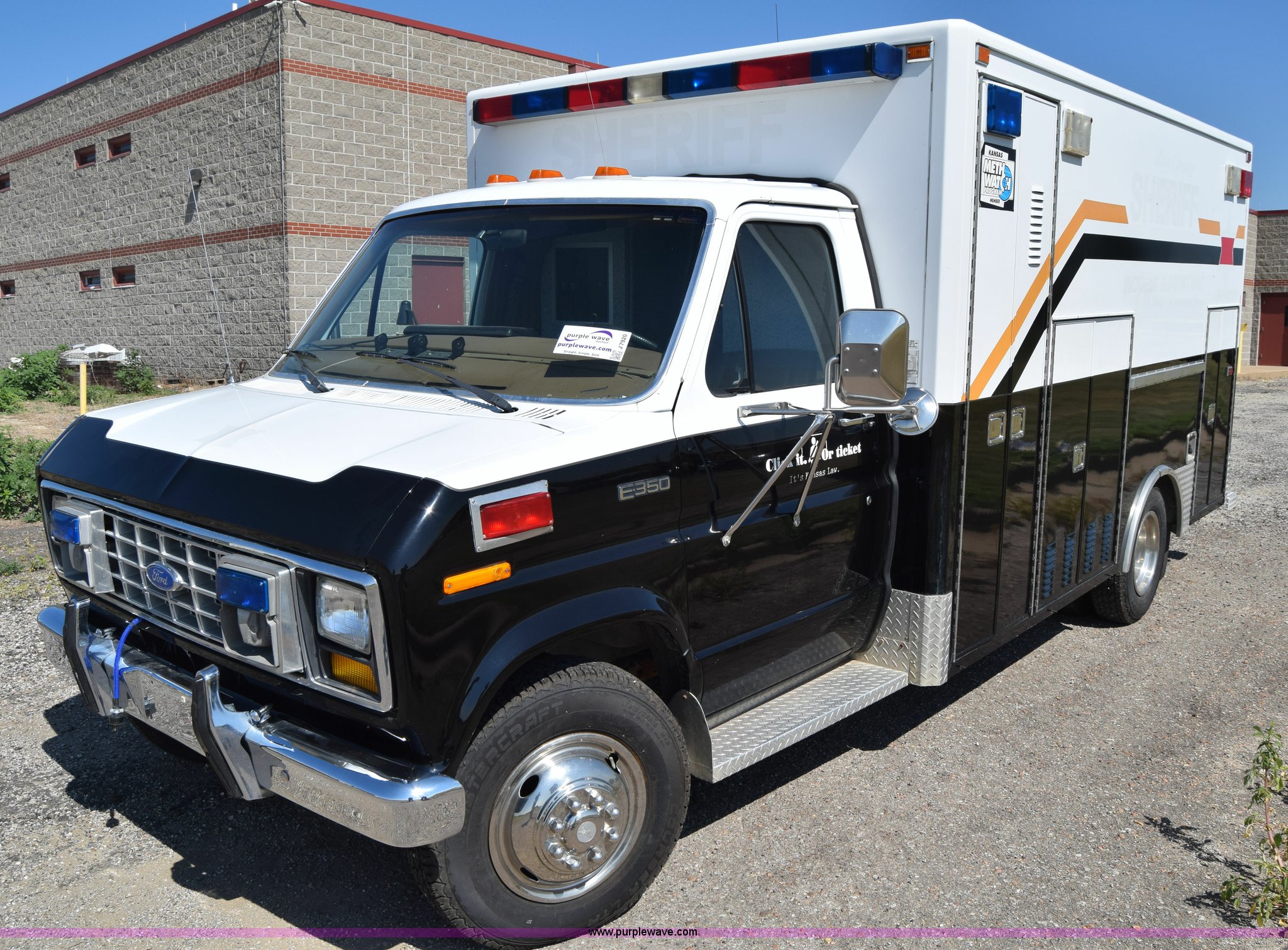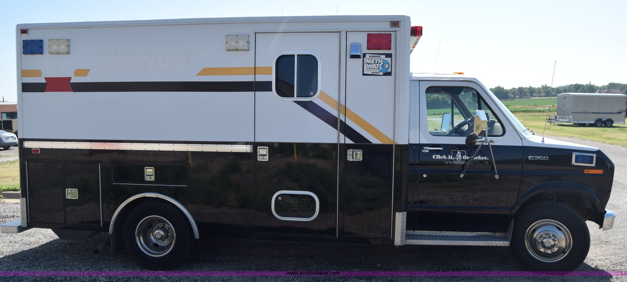 Purple Wave is selling a used Fire Truck or Emergency Vehicle in Kansas. This item is a 1991 Ford Econoline E350 ambulance with the following: 95,188 miles on odometer, 4.6L V8 SOHC 16V diesel engine, Automatic transmission, AC and heat, AM/FM, Manual windows and locks, Vinyl interior, Engine block heater, 215/85R16 tires, National Ambulance Builders ambulance body, Full light package, Running boards, Exterior storage compartments, GVWR 11,000 lbs