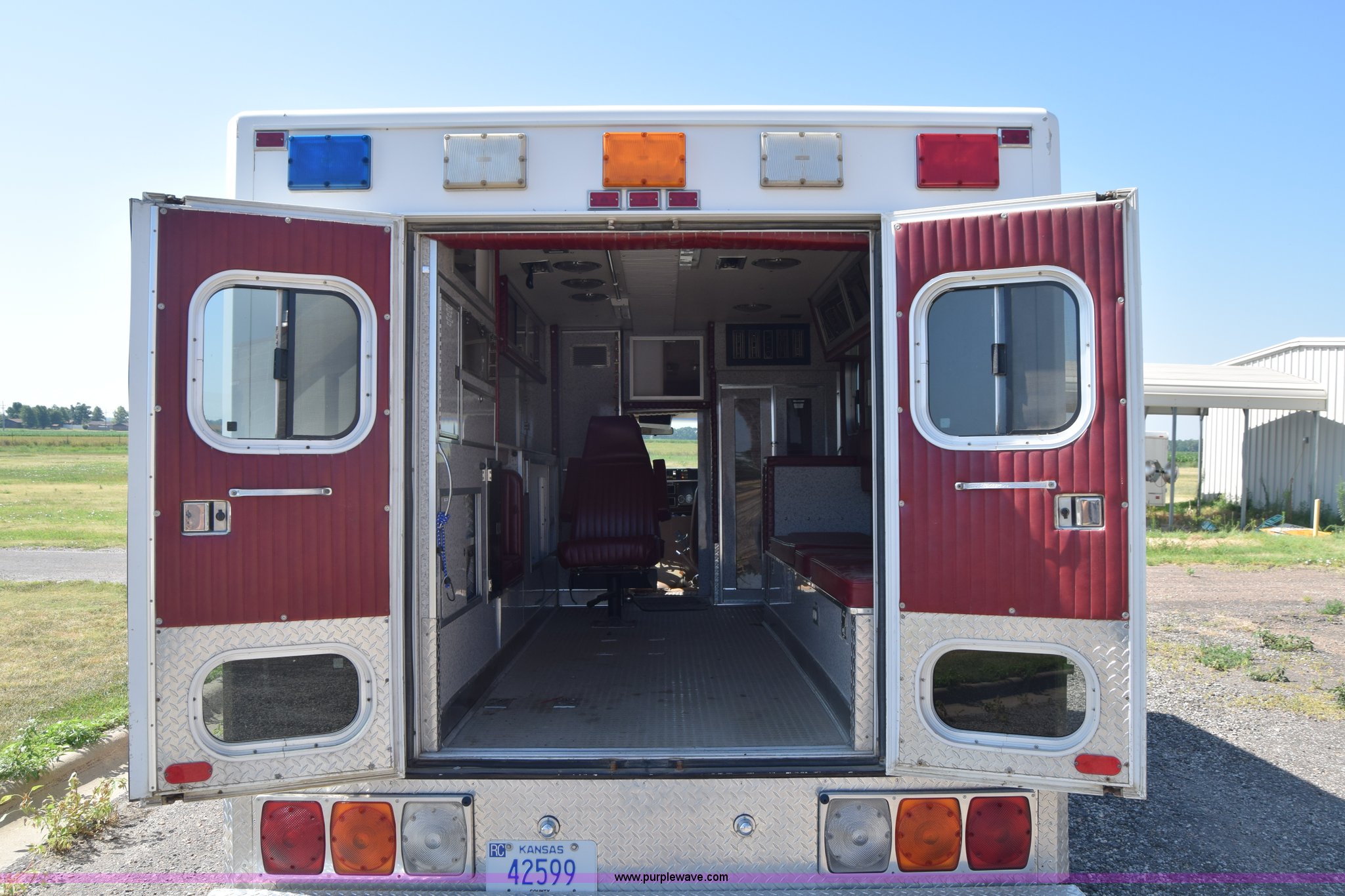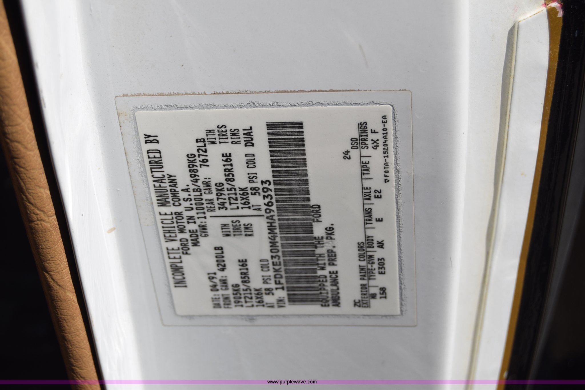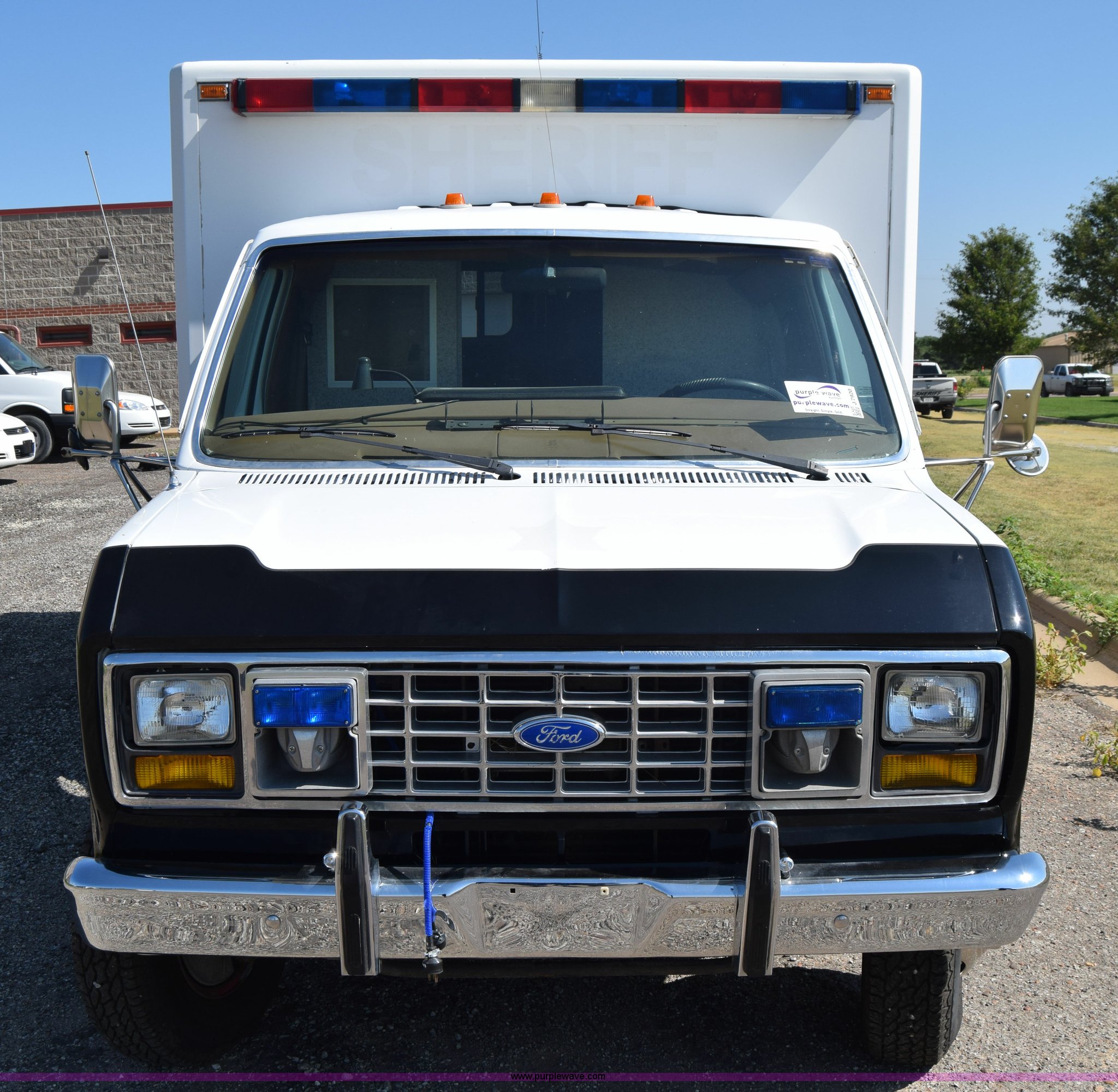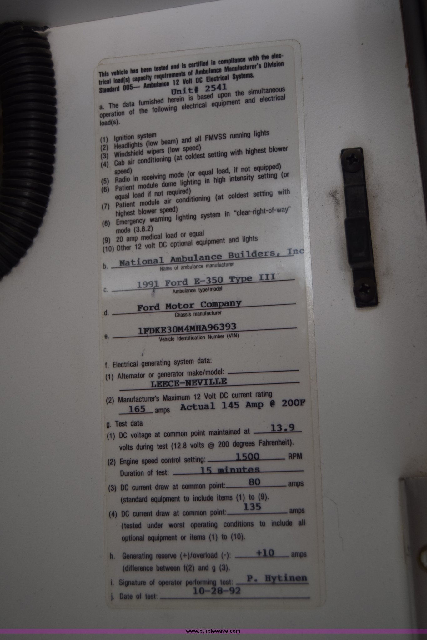 Purple Wave is selling a used Fire Truck or Emergency Vehicle in Kansas. This item is a 1991 Ford Econoline E350 ambulance with the following: 95,188 miles on odometer, 4.6L V8 SOHC 16V diesel engine, Automatic transmission, AC and heat, AM/FM, Manual windows and locks, Vinyl interior, Engine block heater, 215/85R16 tires, National Ambulance Builders ambulance body, Full light package, Running boards, Exterior storage compartments, GVWR 11,000 lbs