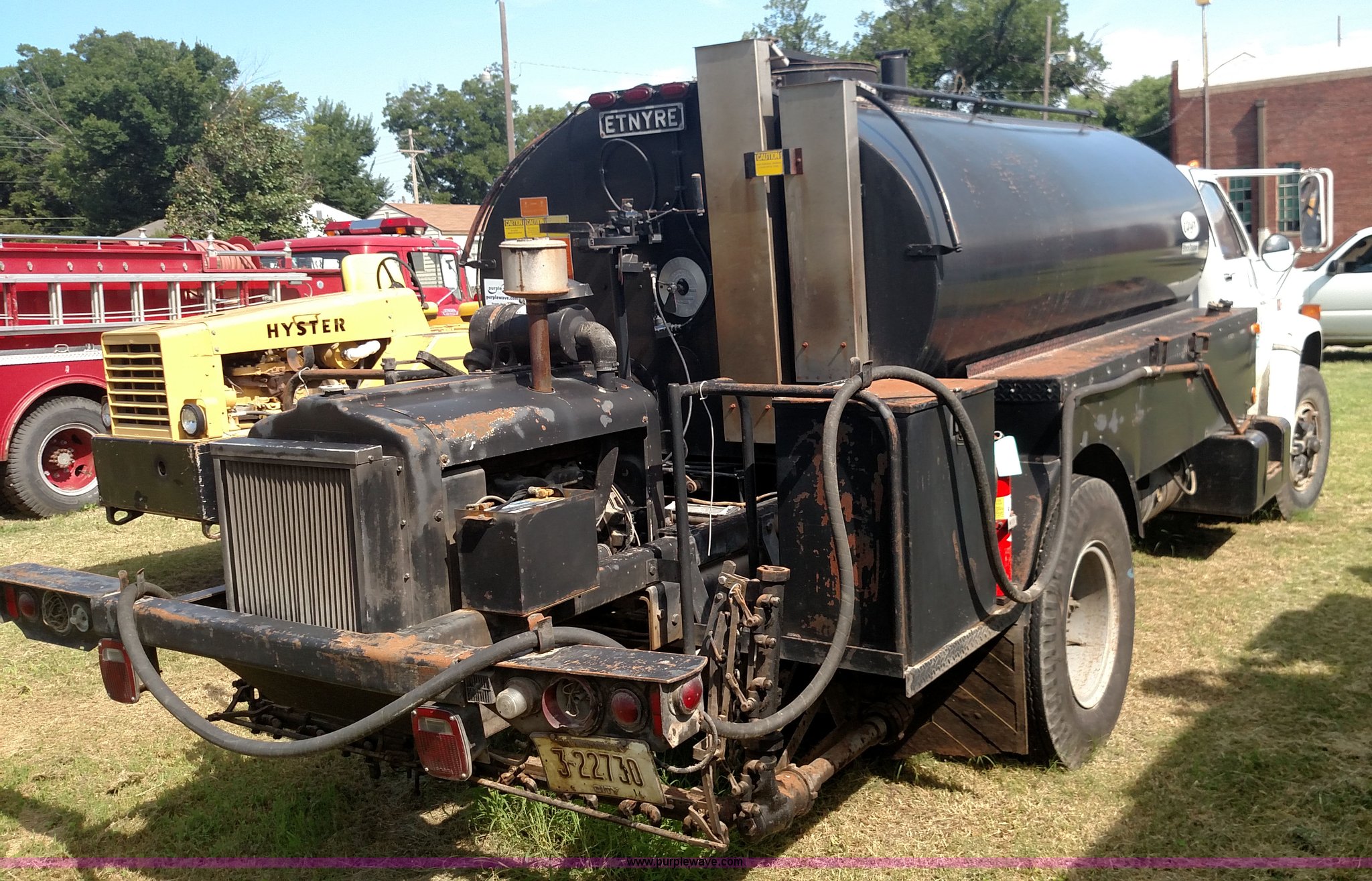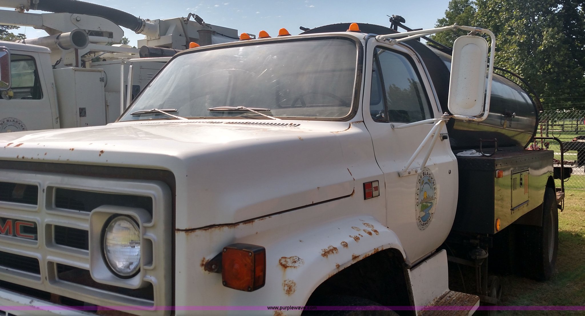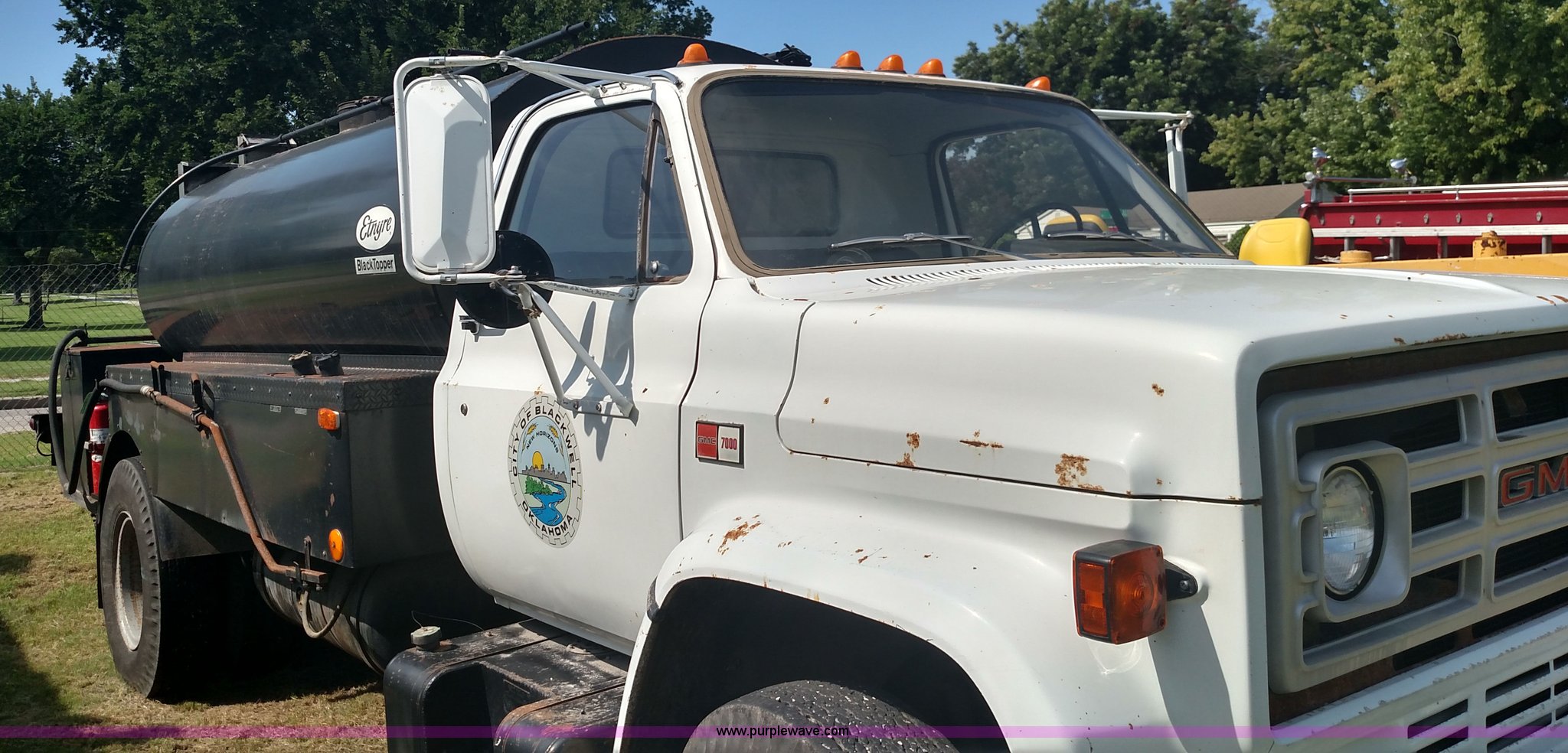 Purple Wave is selling a used Oil Distributor Truck in Oklahoma. This item is a 1985 GMC 7000 oil distributor truck with the following: 5,870 miles on odometer, V8 gas engine, Five speed manual transmission, Two speed rear end, Manual windows, Etnyre in-cab control monitor, Gauge cluster, Etnyre Black-Topper tank, Model BT-RS, 1,330 gallon tank, Serial J8385, Air brakes, 10.00-20 tires, GVWR 28,000 lbs