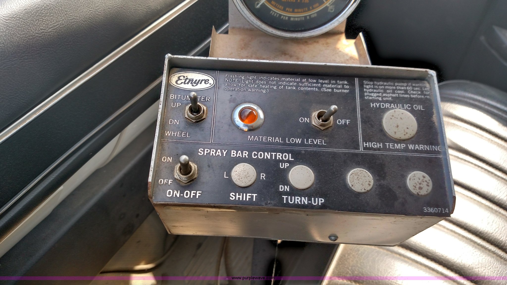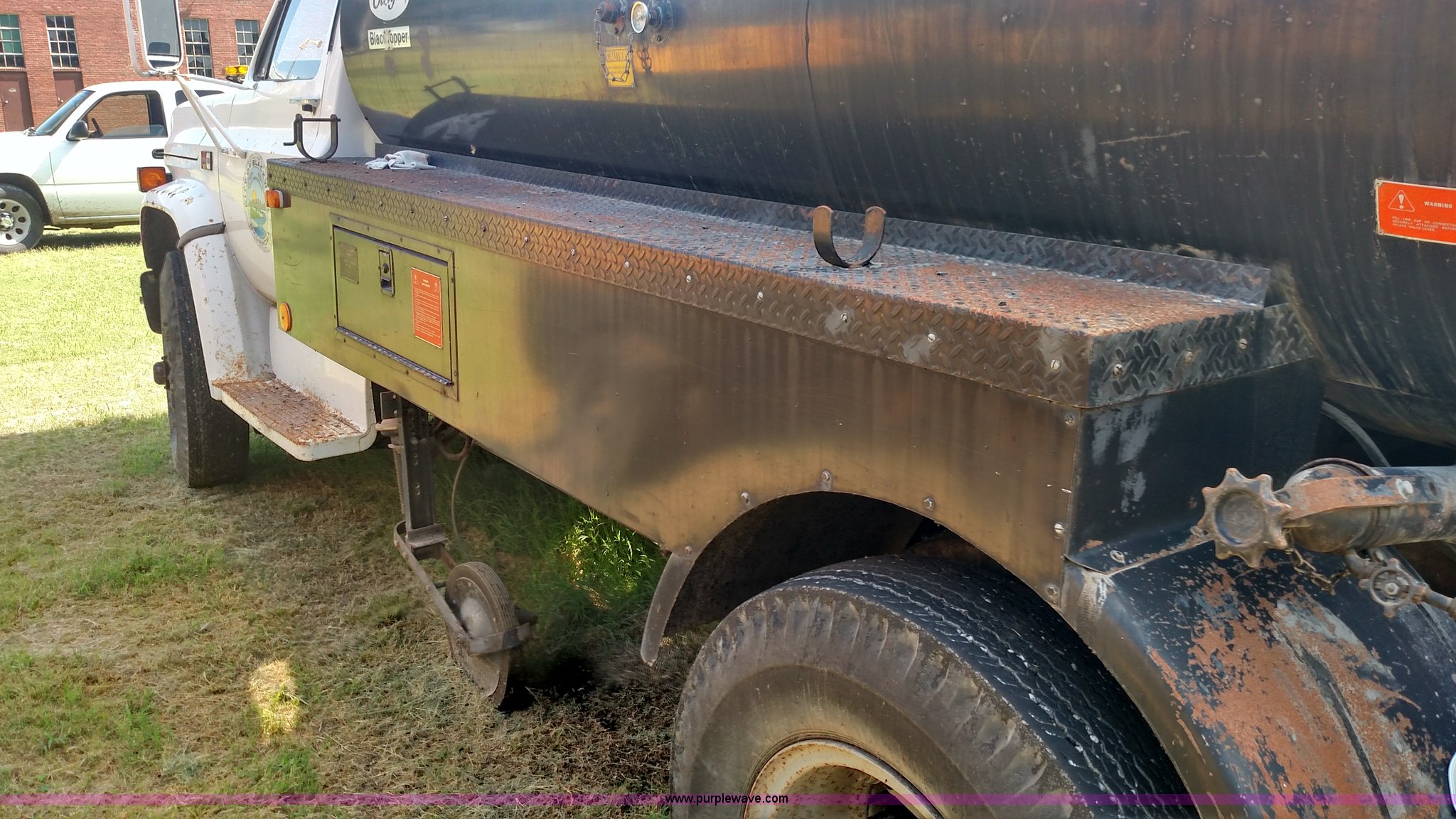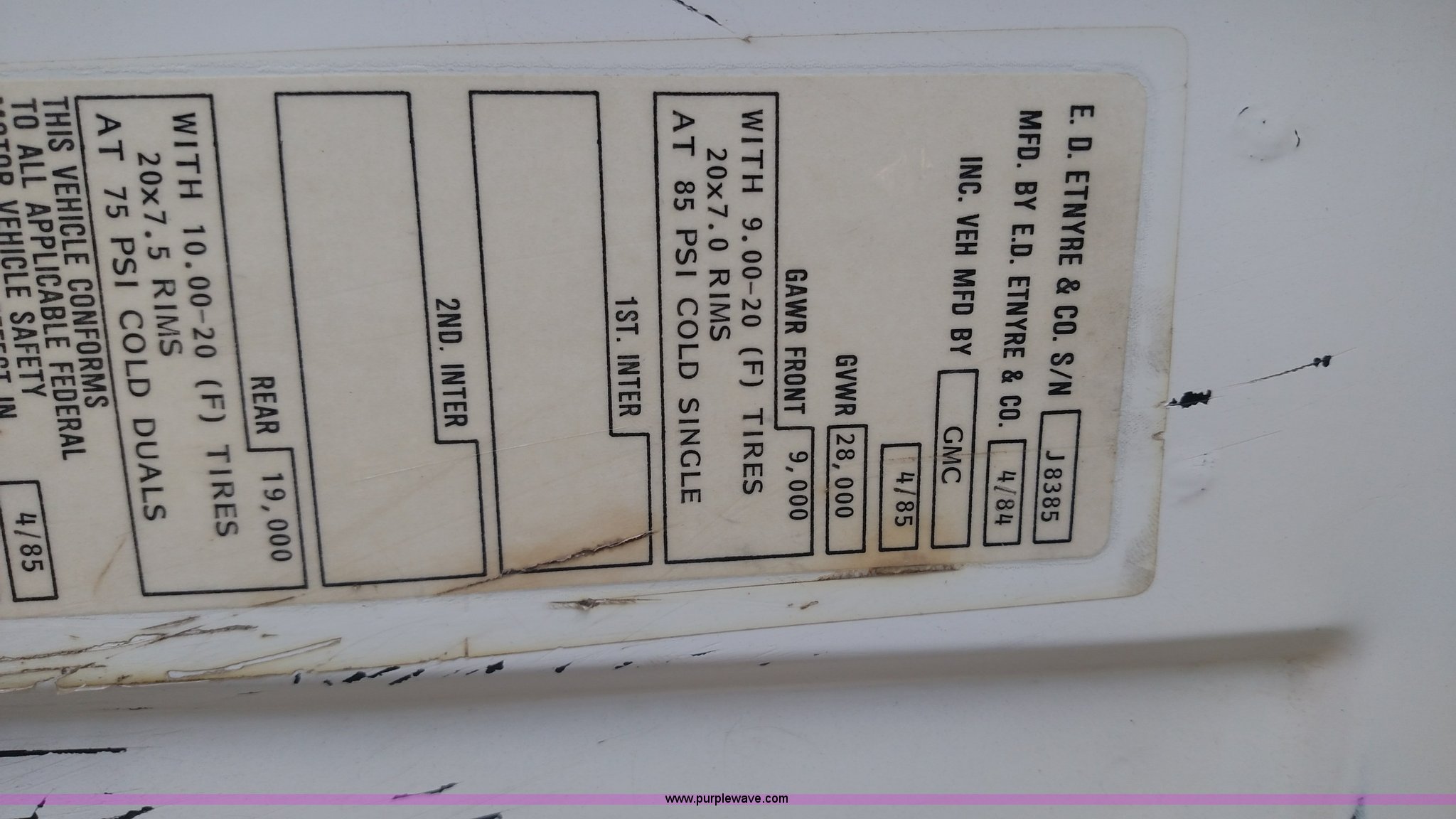 Purple Wave is selling a used Oil Distributor Truck in Oklahoma. This item is a 1985 GMC 7000 oil distributor truck with the following: 5,870 miles on odometer, V8 gas engine, Five speed manual transmission, Two speed rear end, Manual windows, Etnyre in-cab control monitor, Gauge cluster, Etnyre Black-Topper tank, Model BT-RS, 1,330 gallon tank, Serial J8385, Air brakes, 10.00-20 tires, GVWR 28,000 lbs