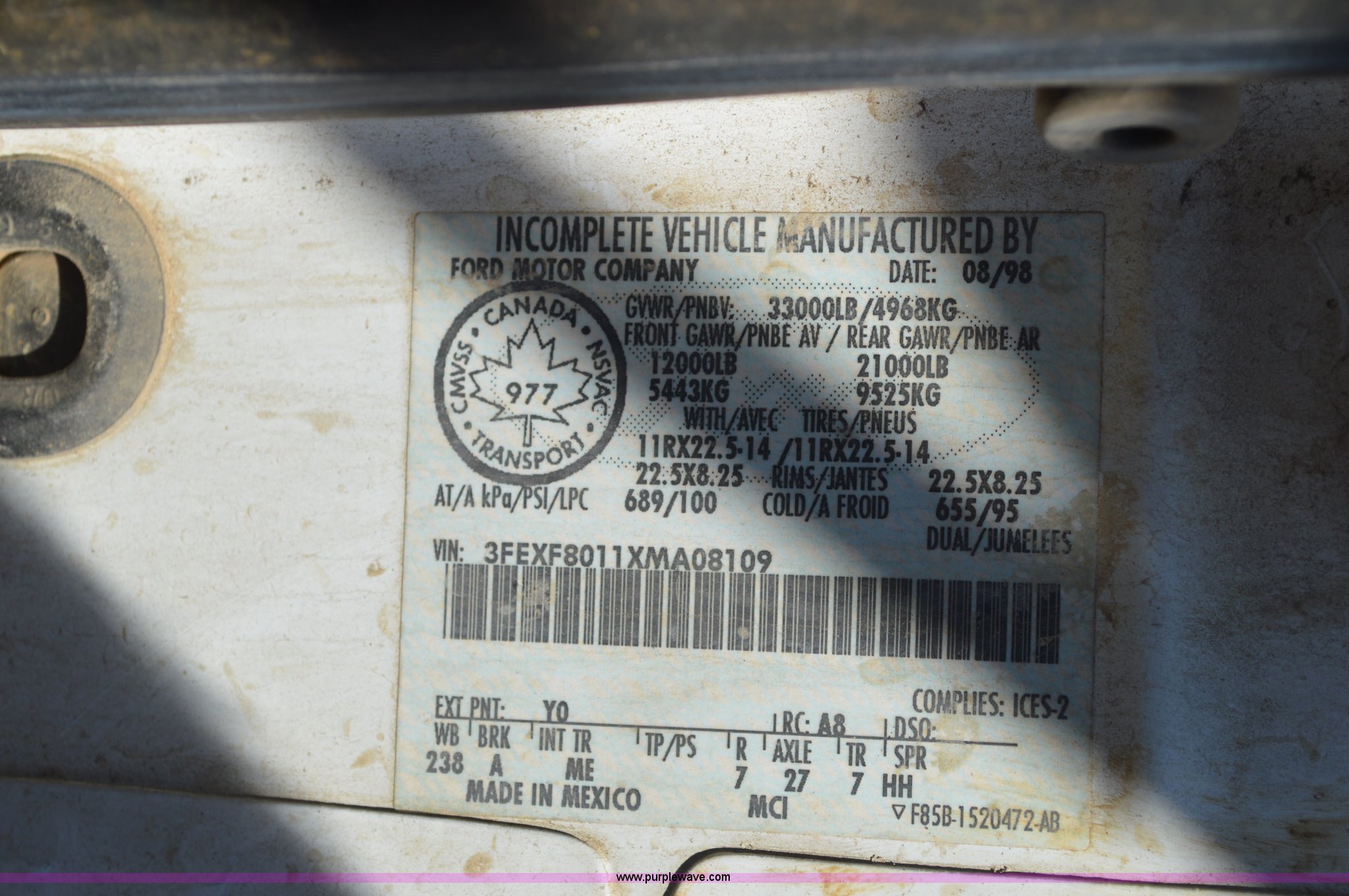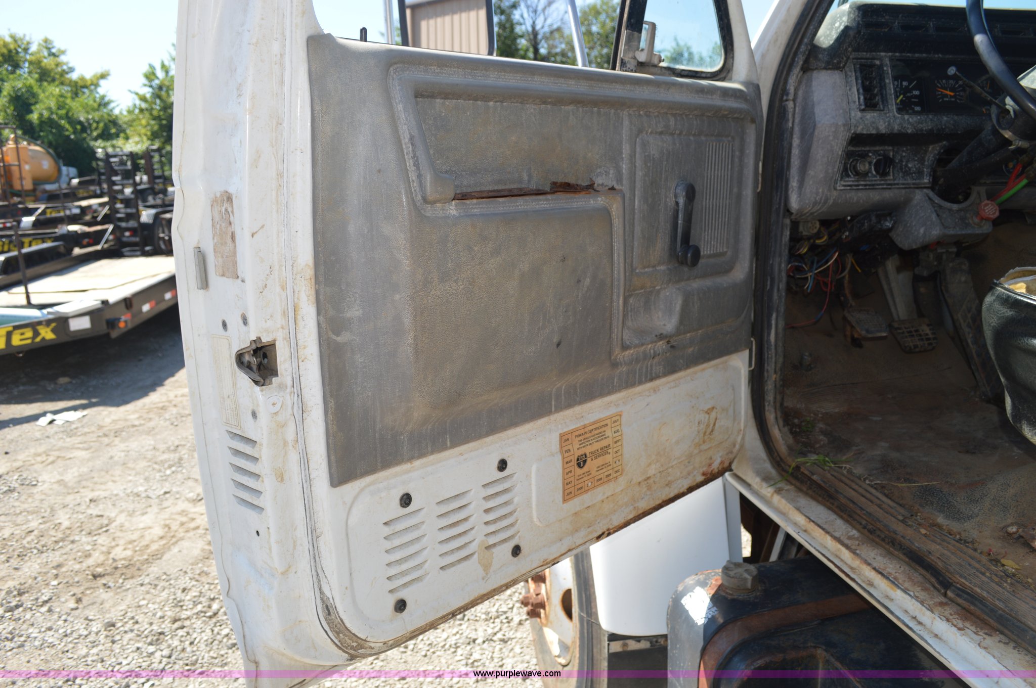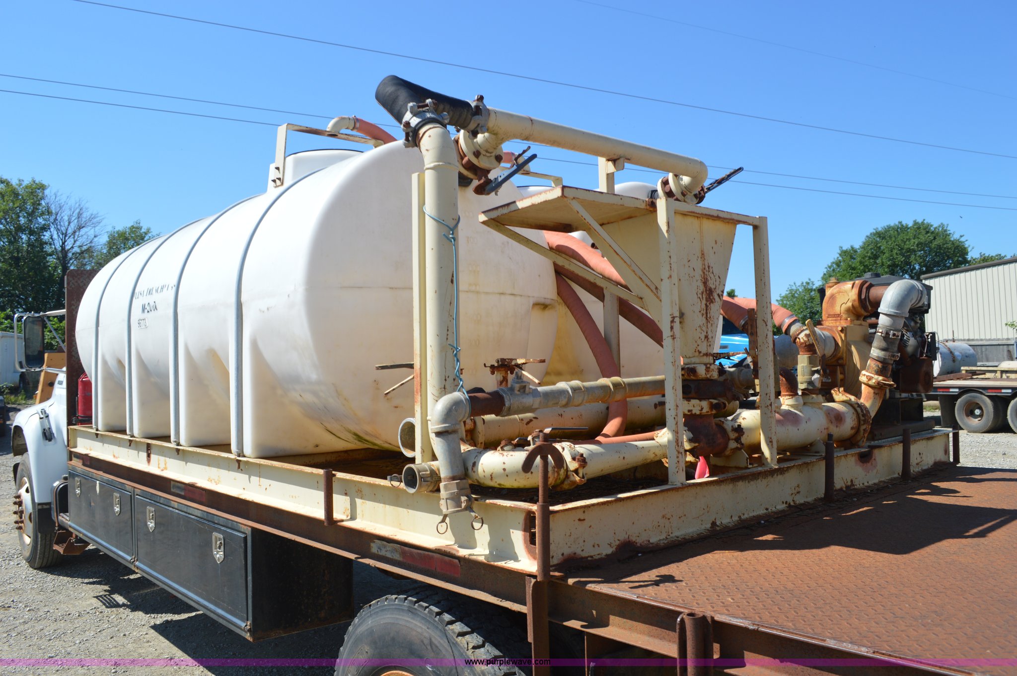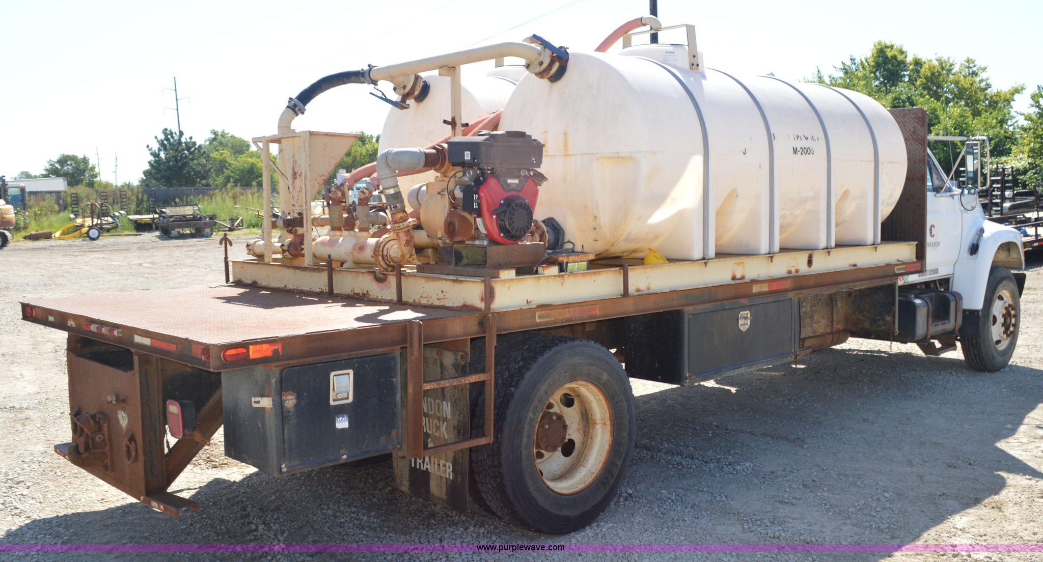 Purple Wave is selling a used Flat Bed Truck in Kansas. This item is a 1999 Ford F800 flat bed truck with mud mixer with the following: 105,806 miles on odometer, Cummins ISB 5.9L L6 diesel engine, Six speed manual transmission, Spring suspension, Toolboxes, Pintle hitch, Air brakes, 20'L x 8'W flatbed, Mud mixer, (2) 1000 gallon poly tanks, Vanguard 16 HP twin cylinder gas engine,, 11R22.5 tires, 235" wheelbase, Unit # 915018
