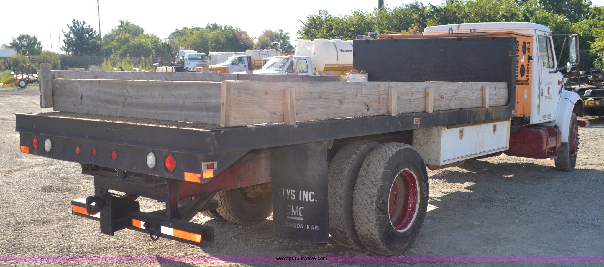 Purple Wave is selling a used Flat Bed Truck in Kansas. This item is a 1997 International 4700 flat dump bed truck with the following: 266,777 miles on odometer, 8,962 hours on meter, DT-466 7.6L L6 diesel engine, Manual transmission, Spring suspension, Hydraulic brakes, 17.5'L x 9'W flat dump bed, 236" wheelbase, 11R22.5 front tires, Sullivan-Palatek D210U10JD air compressor, 800 hrs on meter, 4.5L four cylinder John Deer diesel engine, PTO cable needs adjustment, Fuel leak around pump area, Unit # 919004