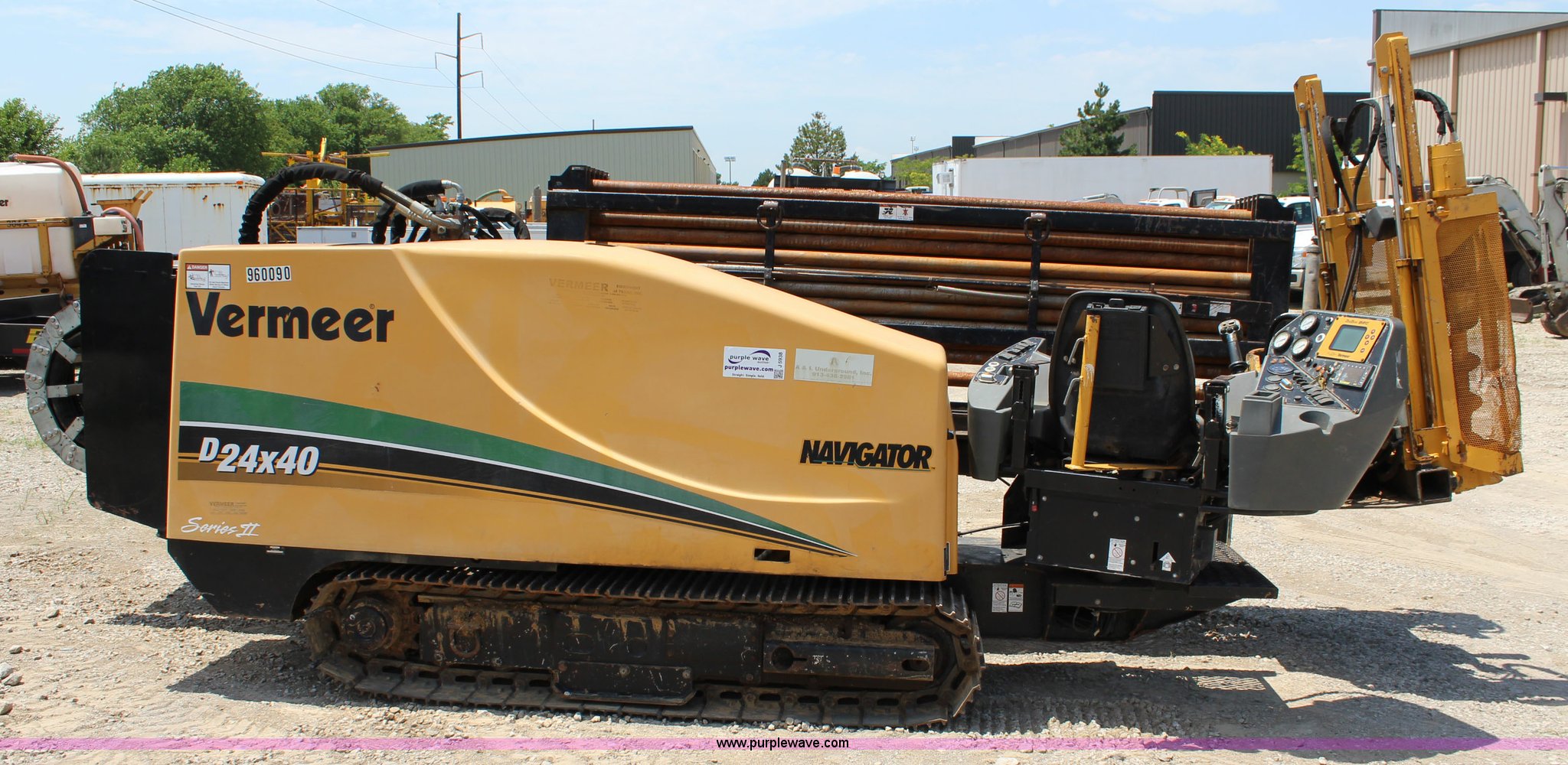 Purple Wave is selling a used Directional Boring Unit in Kansas. This item is a 2007 Vermeer D24X40 Series II directional drill with the following: 2,221 hours on meter, John Deere four cylinder diesel engine, (52) joints of 2 3/8" drill rod, 520' total, 16" tracks, Serial 1VRZ1903771000441