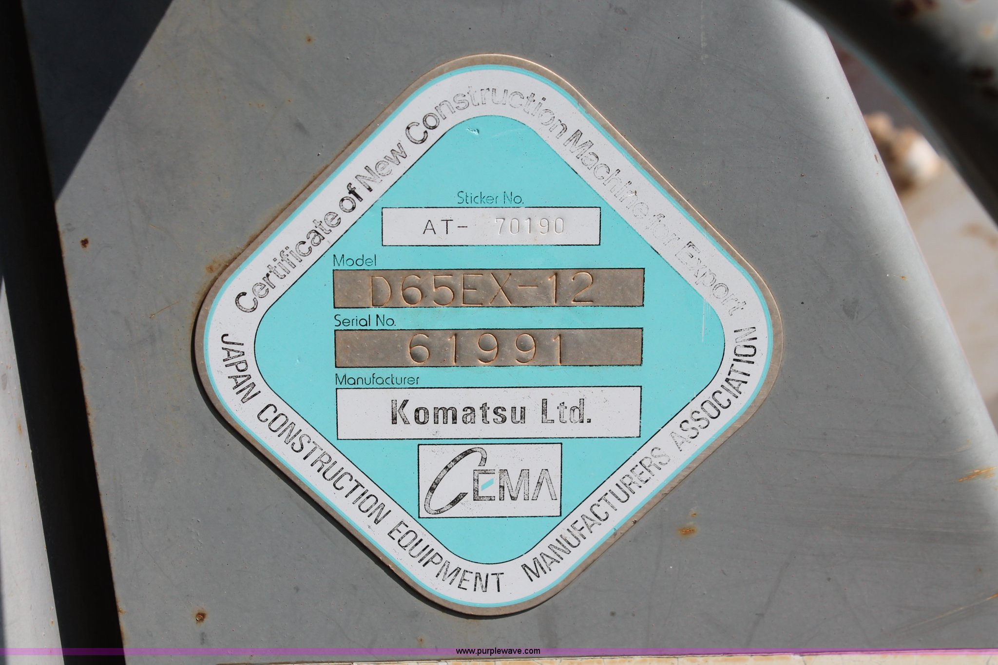Purple Wave is selling a used Crawler Dozer in Oklahoma. This item is a 1997 Komatsu D65EX-12 dozer with the following: 5,412 hours on meter, Komatsu six cylinder turbo diesel engine, Powershift transmission, Canopy, Suspension seat, Clutch brake with joystick steering, 160" straight angle dozer blade, 24" single grouser track pads, 40,960 lbs. base operating weight, Recently replaced transmission cables, Brakes operable, Serial 61991, Unit# 30-09