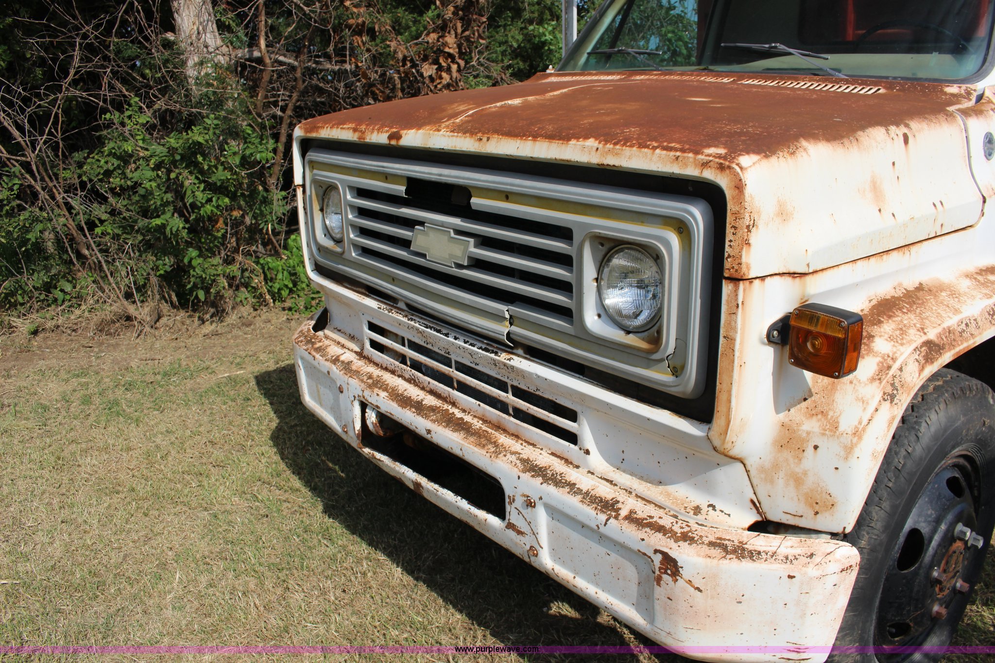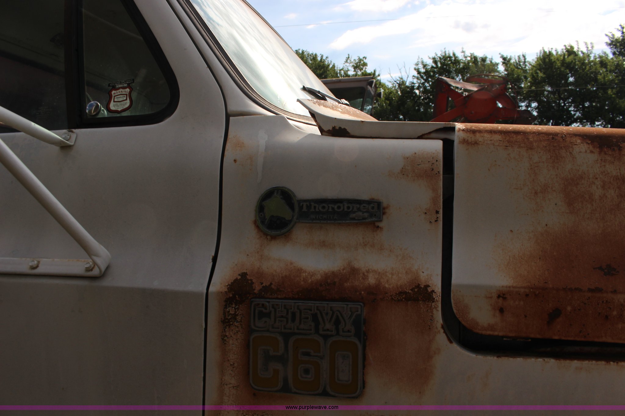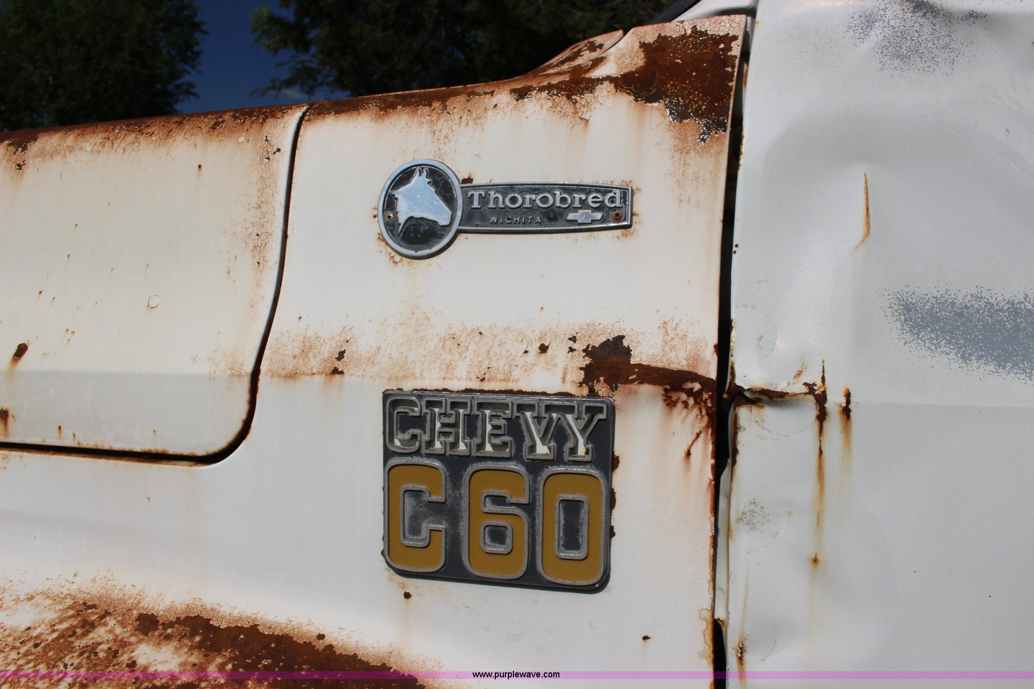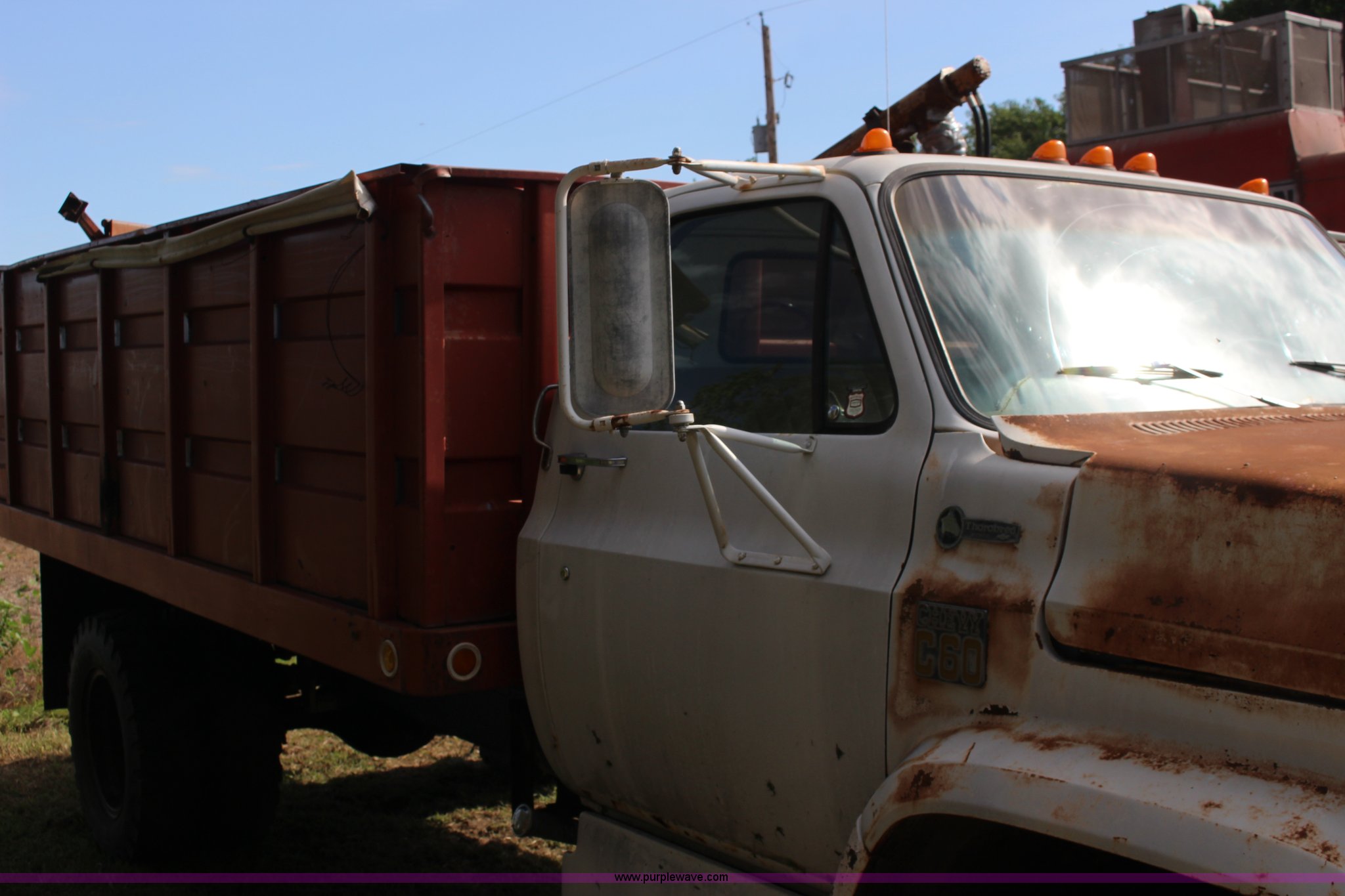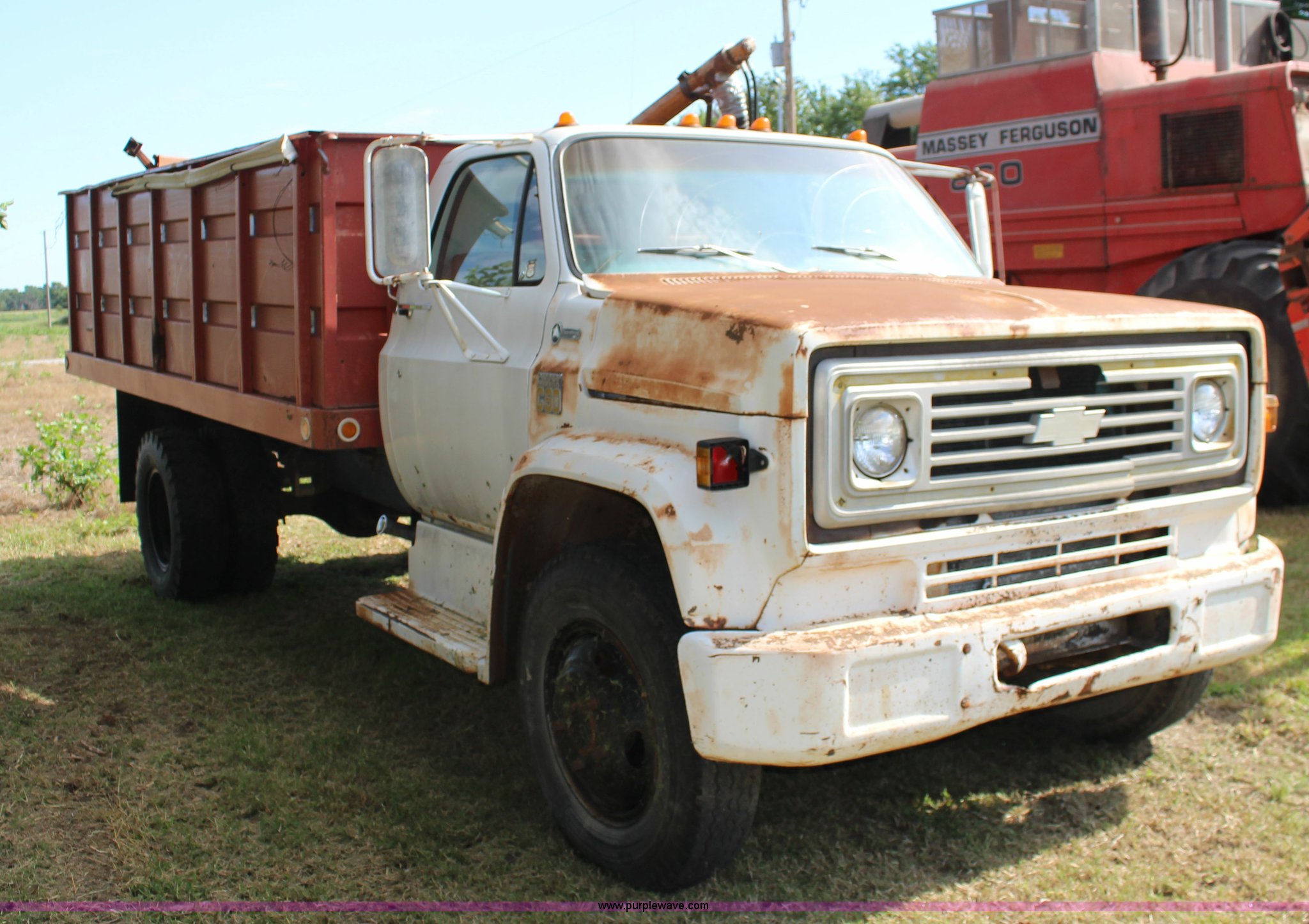 Purple Wave is selling a used Grain Truck in Kansas. This item is a 1974 Chevrolet C60 grain truck with the following: 7,887 miles on odometer, V8 gas engine, Engine blown, Four speed manual transmission, Two speed rear end, Manual windows and locks, 16'L x 8'W steel bed, Hoist, Hoist leaks,, Spring suspension, Hydraulic brakes, Non-operational, 8.25-20 tires, Has not been used in three years