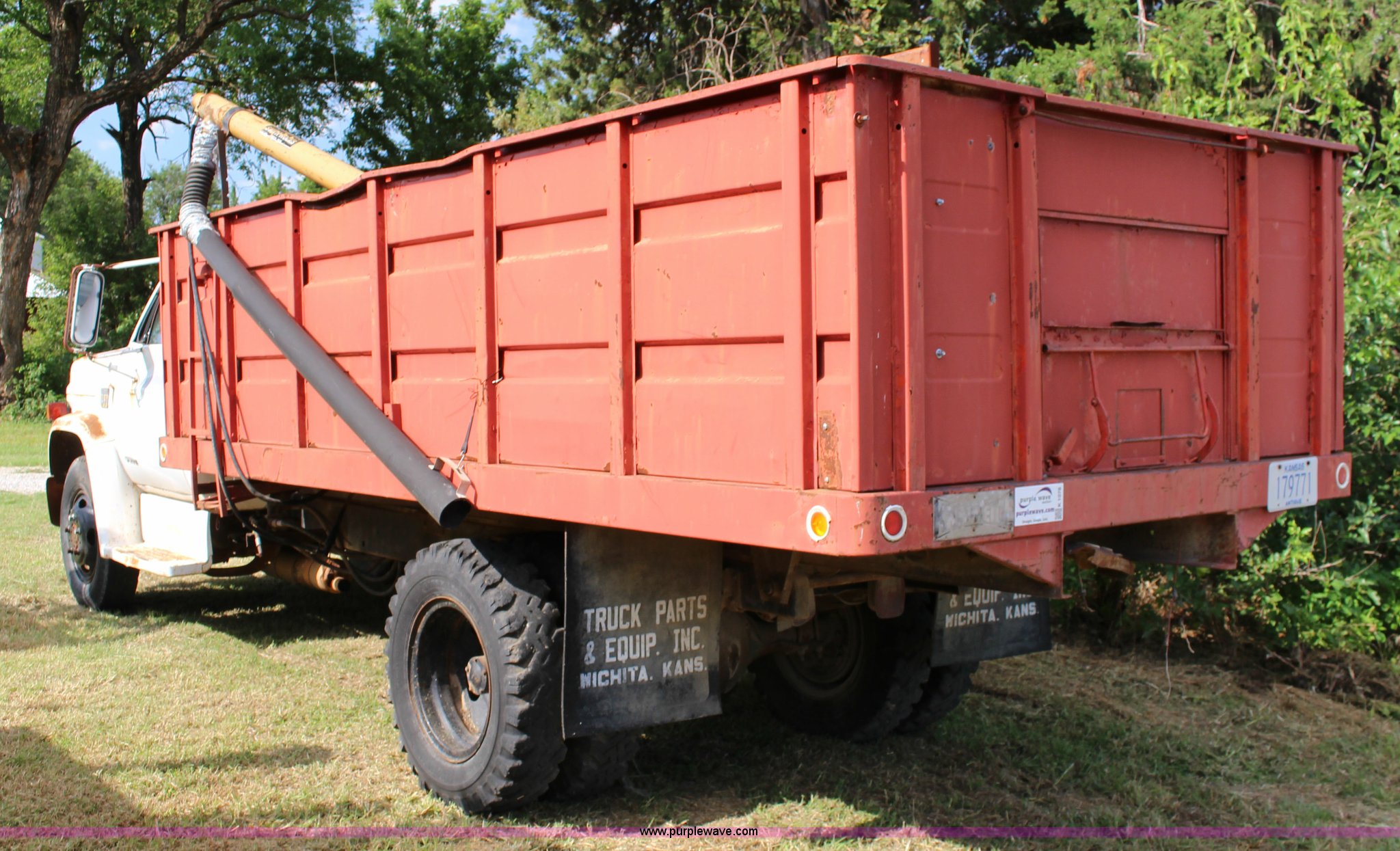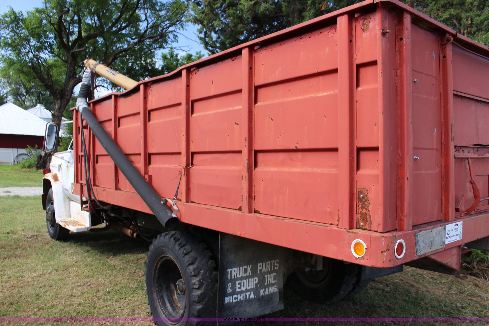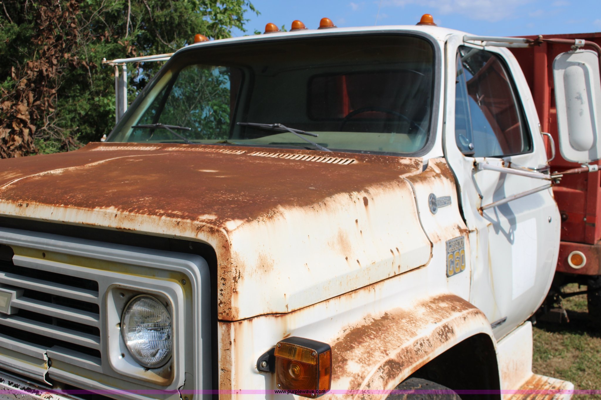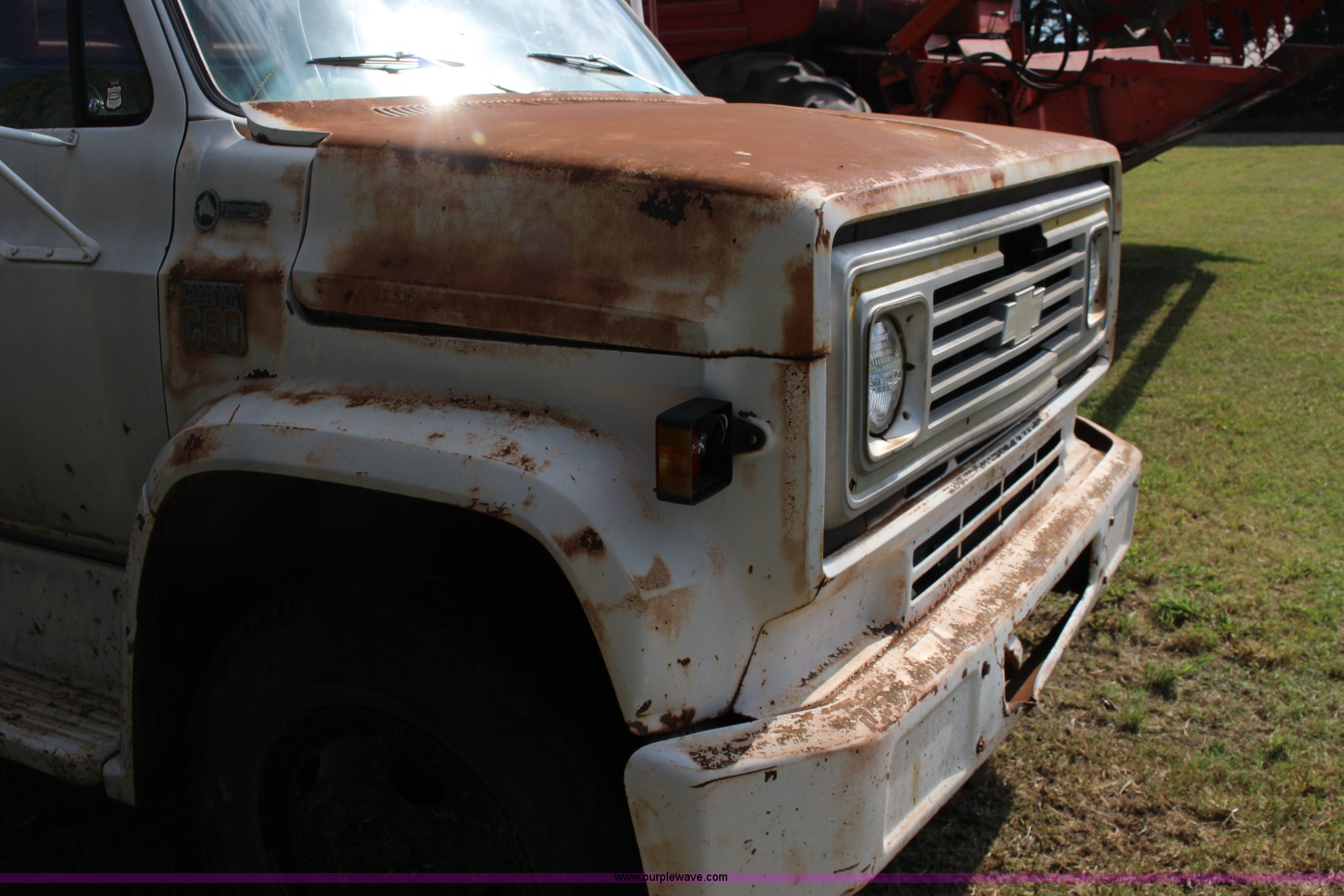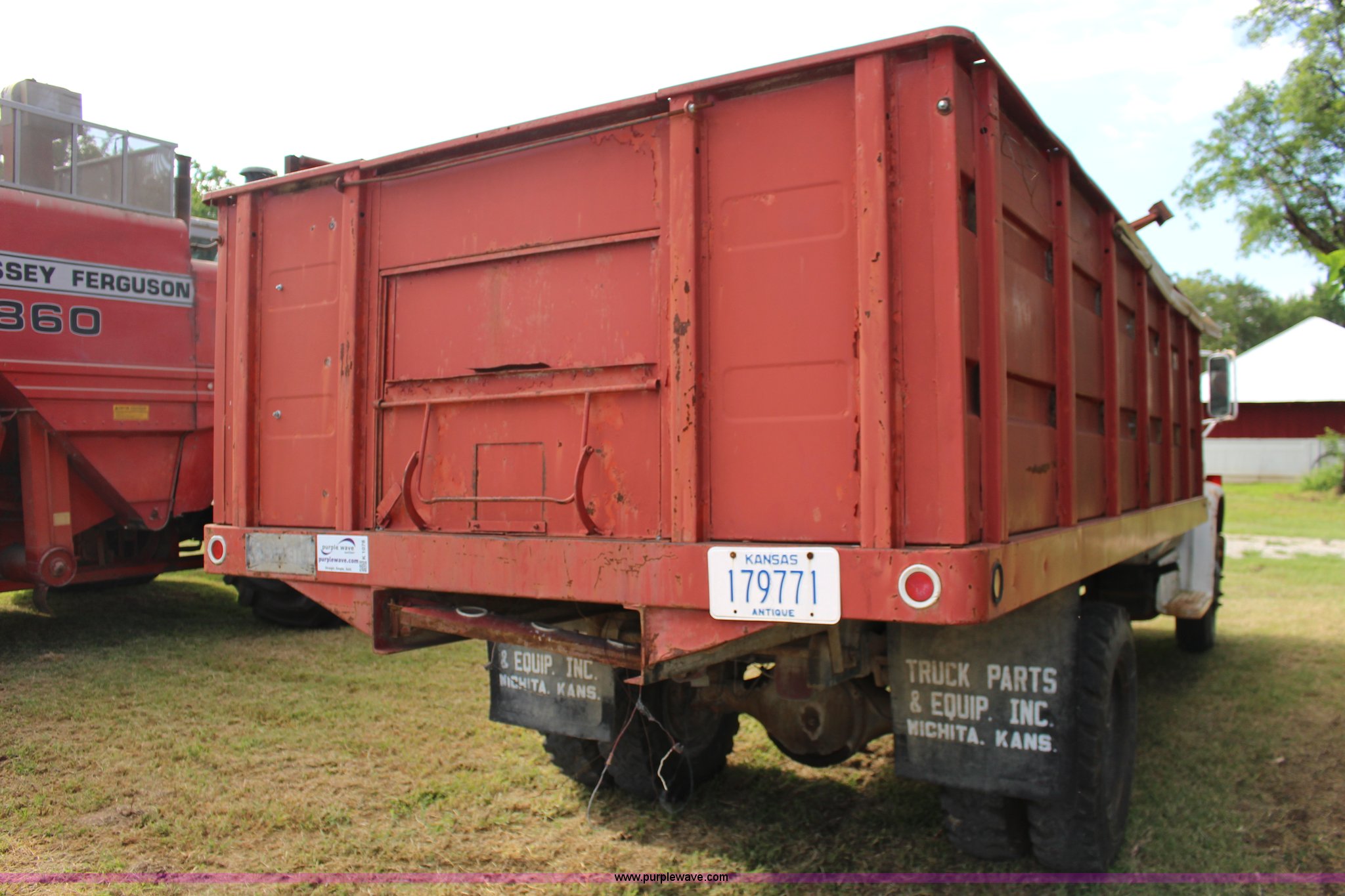 Purple Wave is selling a used Grain Truck in Kansas. This item is a 1974 Chevrolet C60 grain truck with the following: 7,887 miles on odometer, V8 gas engine, Engine blown, Four speed manual transmission, Two speed rear end, Manual windows and locks, 16'L x 8'W steel bed, Hoist, Hoist leaks,, Spring suspension, Hydraulic brakes, Non-operational, 8.25-20 tires, Has not been used in three years