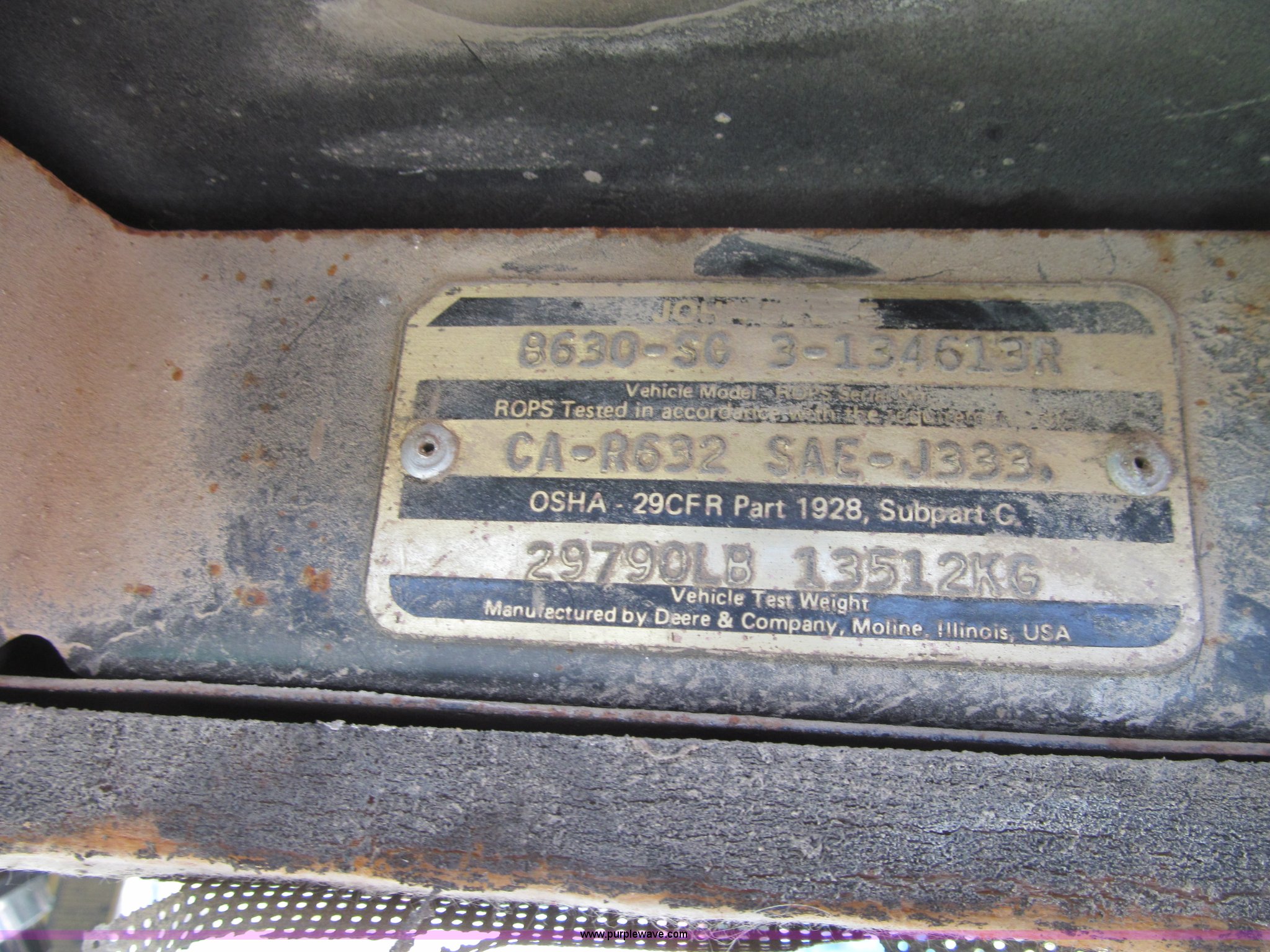 1977 John Deere 8630 4WD tractor. 7,776 hours on meter, John Deere 10.1L six cylinder turbo diesel engine 275 HP, Quad-Range transmission 16F-4R gears, Differential lock, AC and heat, AM/FM, Tilt steering wheel, Suspension seat, Block heater, Three point Top link, Quick attach, (2) rear hydraulic remote sets, (6) wheel weights, 125" wheelbase, 30.5L-32 dual tires Dual wheels and tires furnished loose, Serial 8630H007363R. View equipment video. Sulzberger Excavating, Inc.. 1500 S Houser St. Muscatine, IA 52761