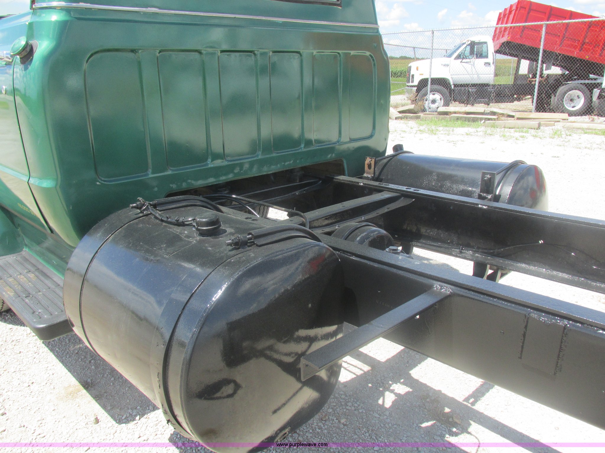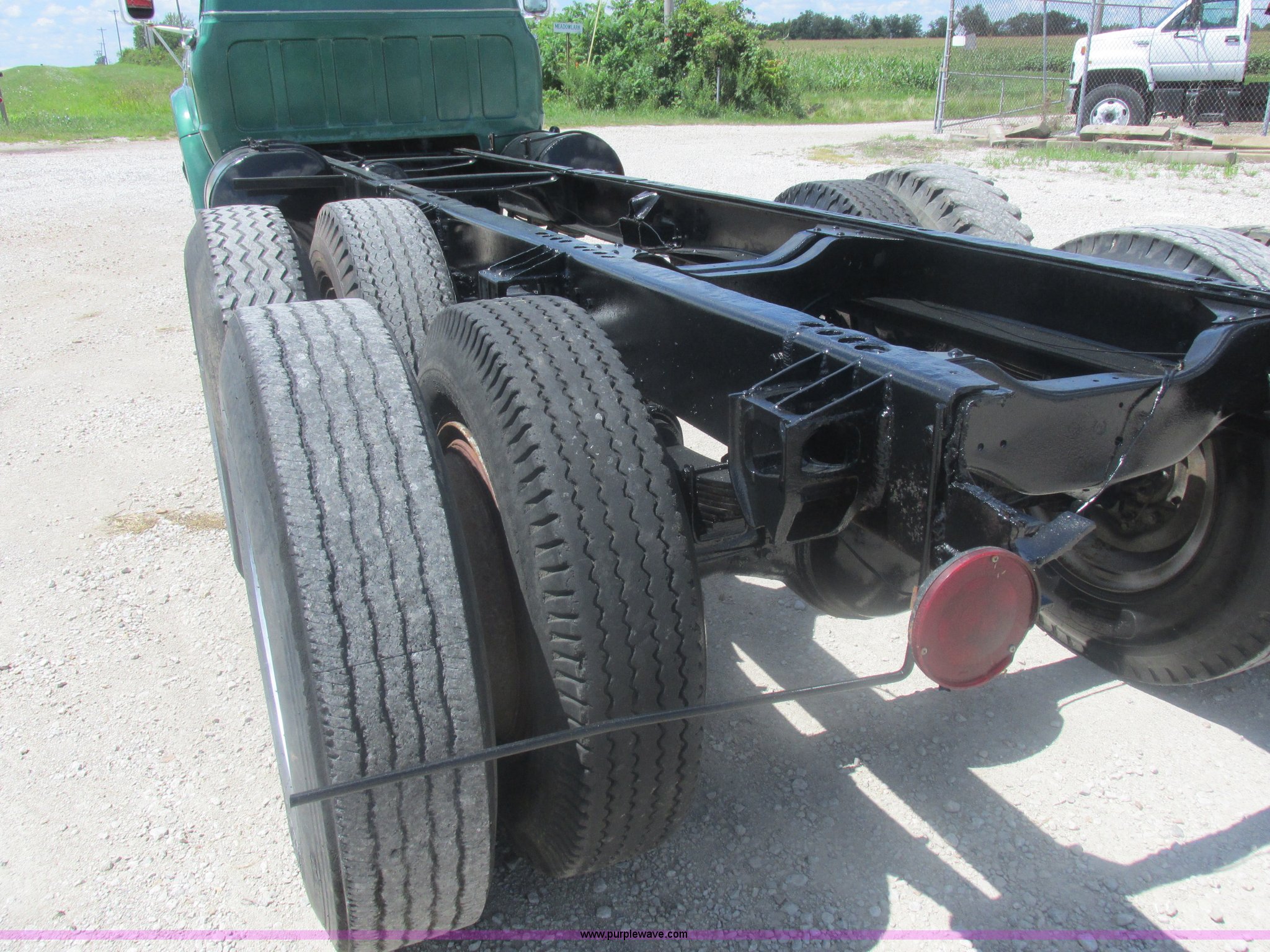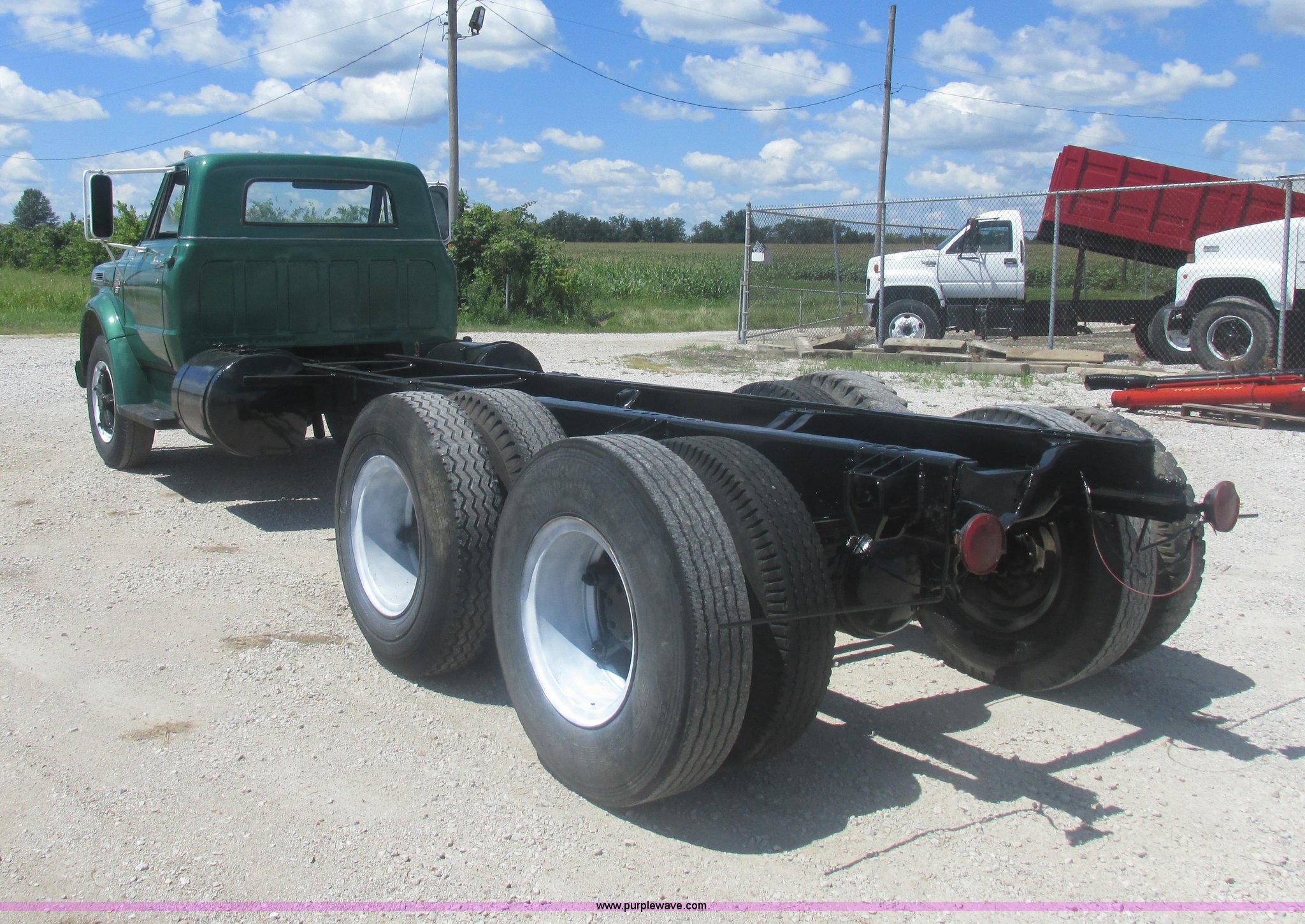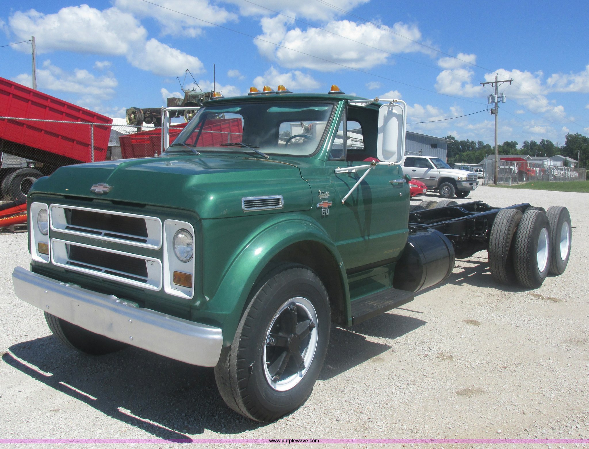 Purple Wave is selling a used Truck Chassis in Missouri. This item is a 1967 Chevrolet C60 truck cab and chassis with the following: 95,842 miles on odometer, Eight cylinder gas engine, Five speed manual transmission, Two speed rear end, Tandem axle, Heat, AM, Manual windows and locks, Vinyl interior, Running boards, Dual fuel tanks, Spring suspension, Hydraulic brakes, 9-20 front tires, 10R20 rear tires