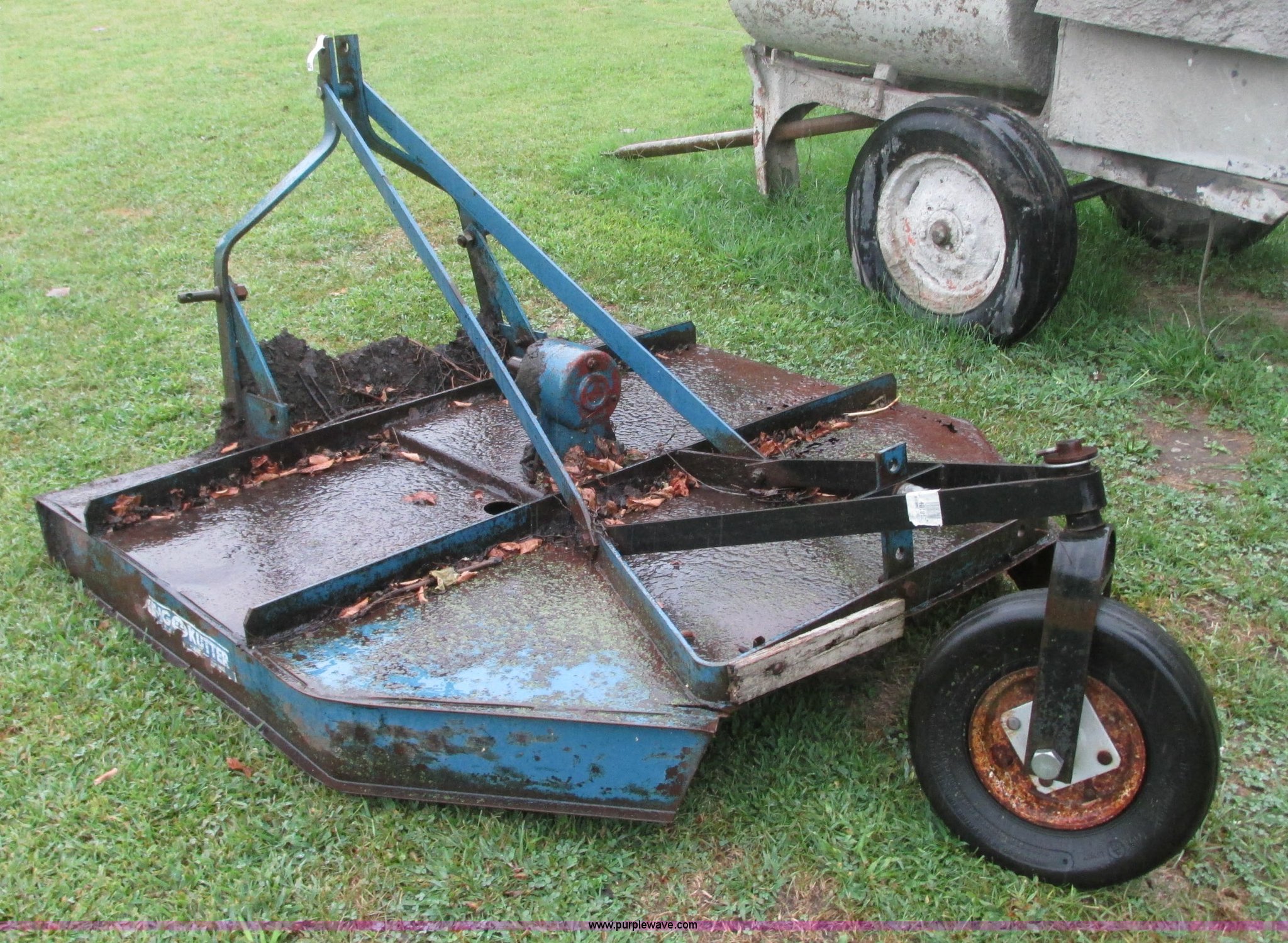 Purple Wave is selling a used Mower, Cutter, Shredder in Missouri. This item is a King Kutter rotary mower with the following: 5'W, Three point, Rear adjustable caster wheel, No PTO shaft, Rust, Unknown operating condition
