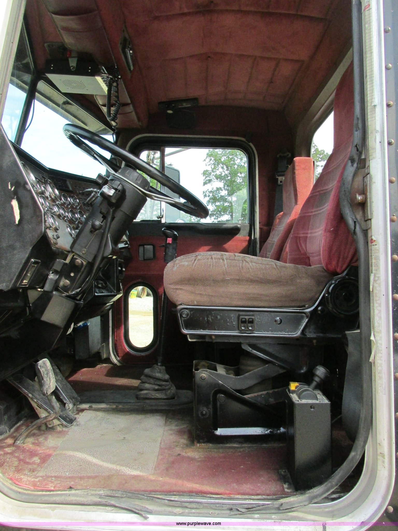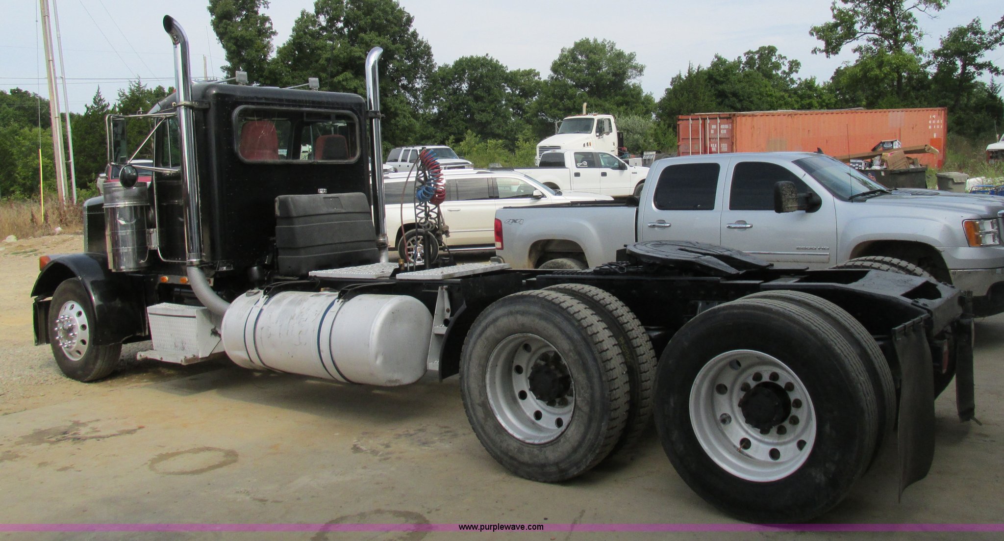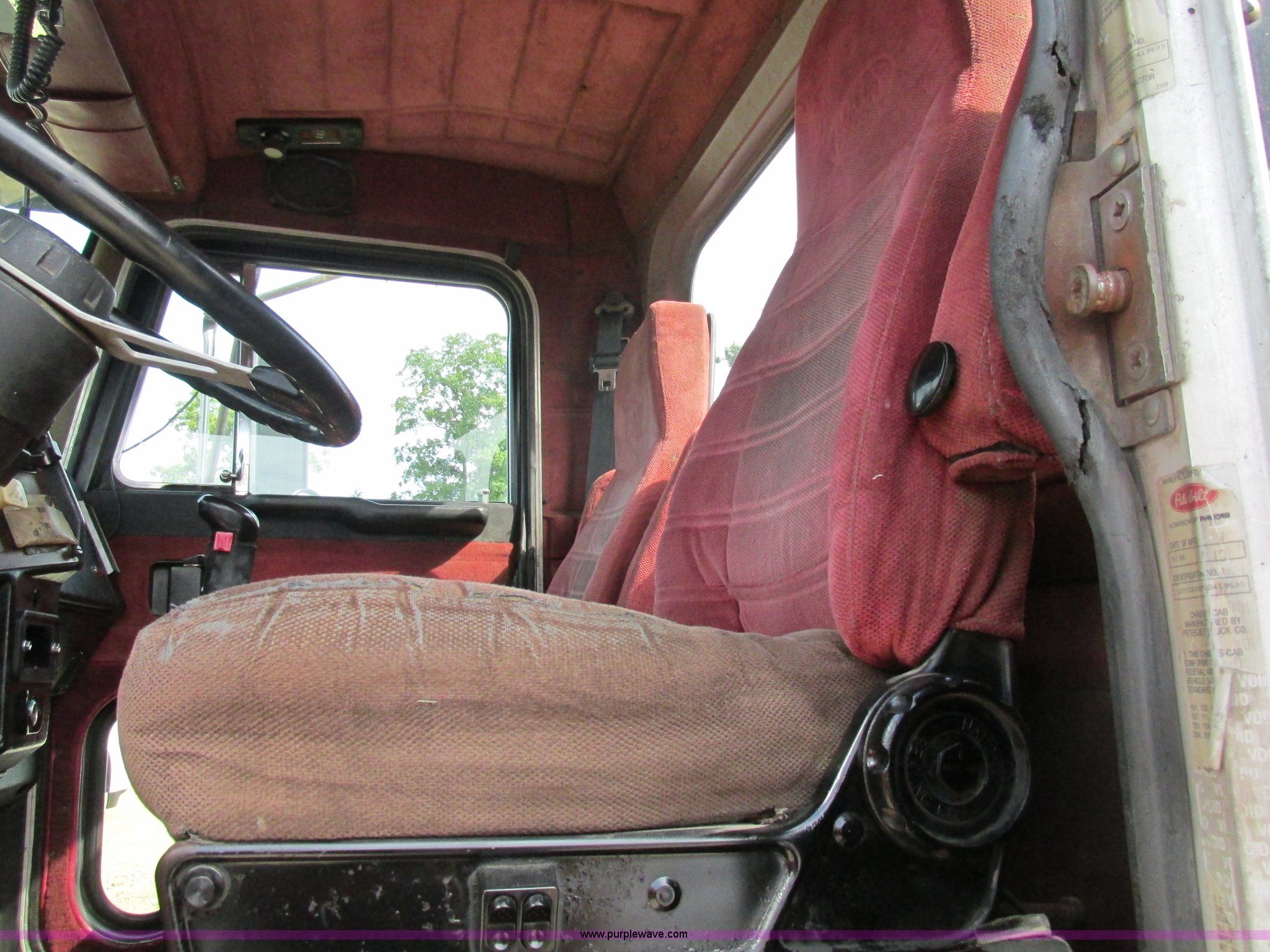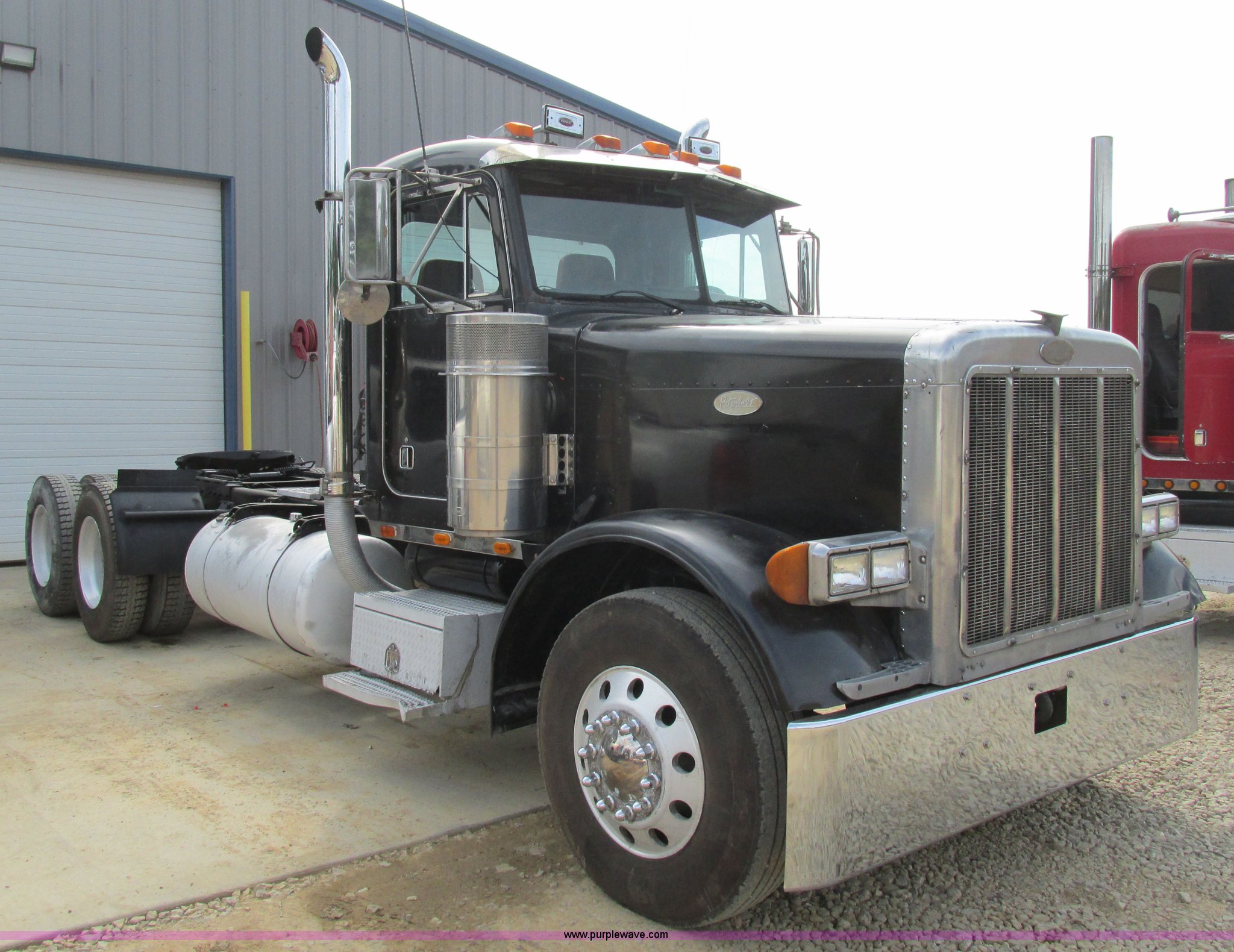 Purple Wave is selling a used Truck Tractor in Missouri. This item is a 1997 Peterbilt 379 semi truck with the following: 1,405,877 miles on odometer, Caterpillar 3406 14.6L L6 turbo diesel engine, 13 speed manual transmission, AC and heat, AM/FM, Air ride cab, In-cab dump controls, Exterior visor, PTO, Wet kit, Aluminum sliding fifth wheel plate, Dual rear exhaust stacks, Dual 110 gallon fuel tanks, Quarter fenders, Mud flaps, 3:70 gear ratio, Aluminum outer wheels, 11R22.5 front tires, 11R24.5 rear tires, GVWR 50,000 lbs, Interior/exterior cosmetic damage