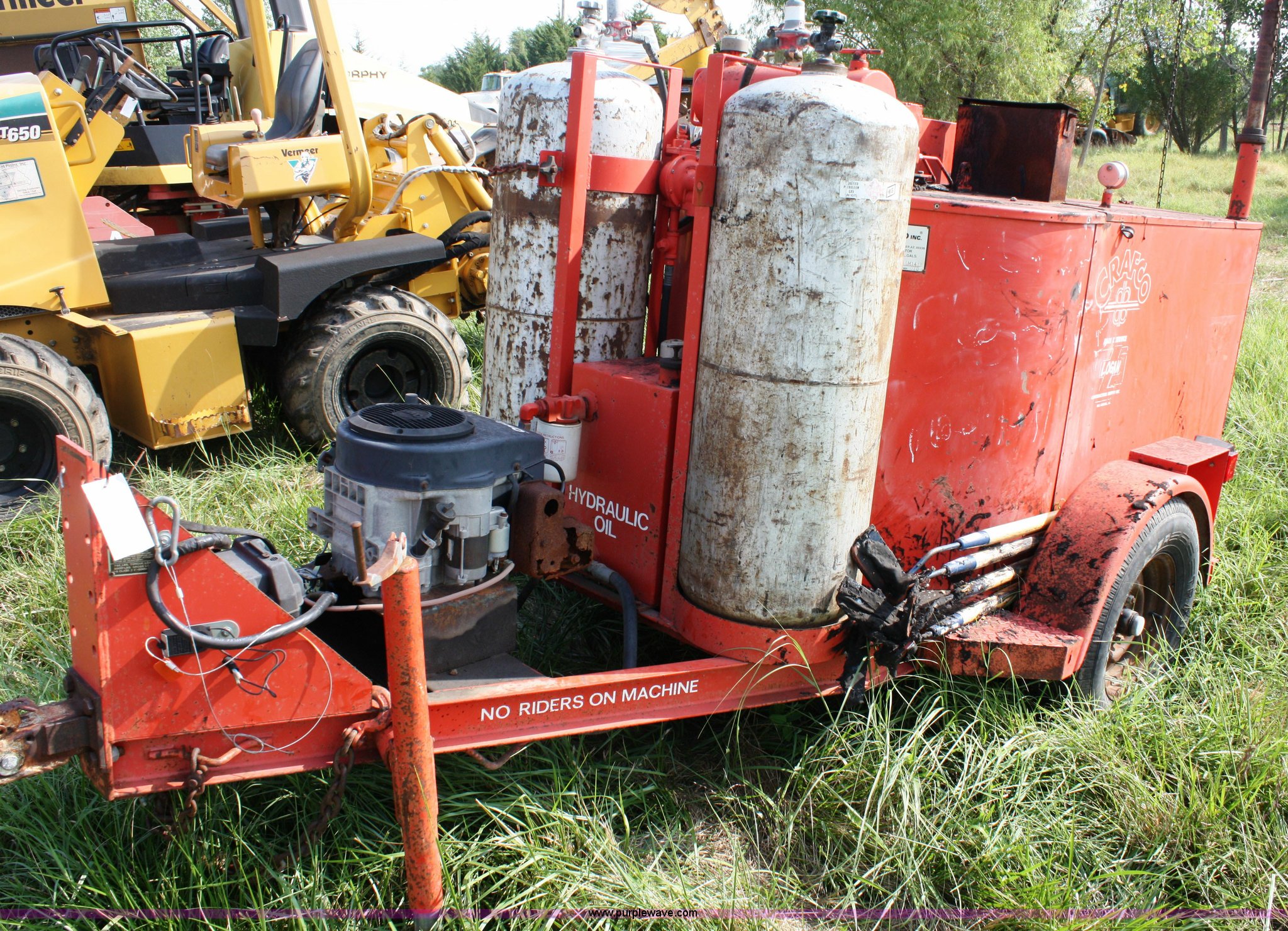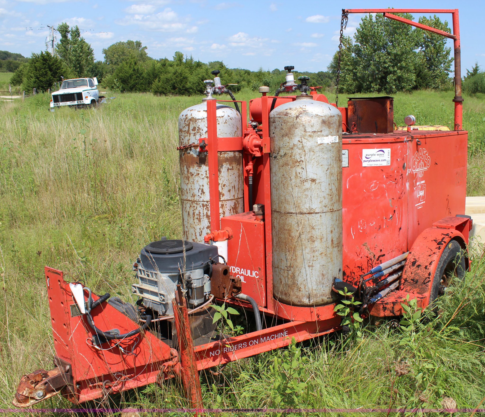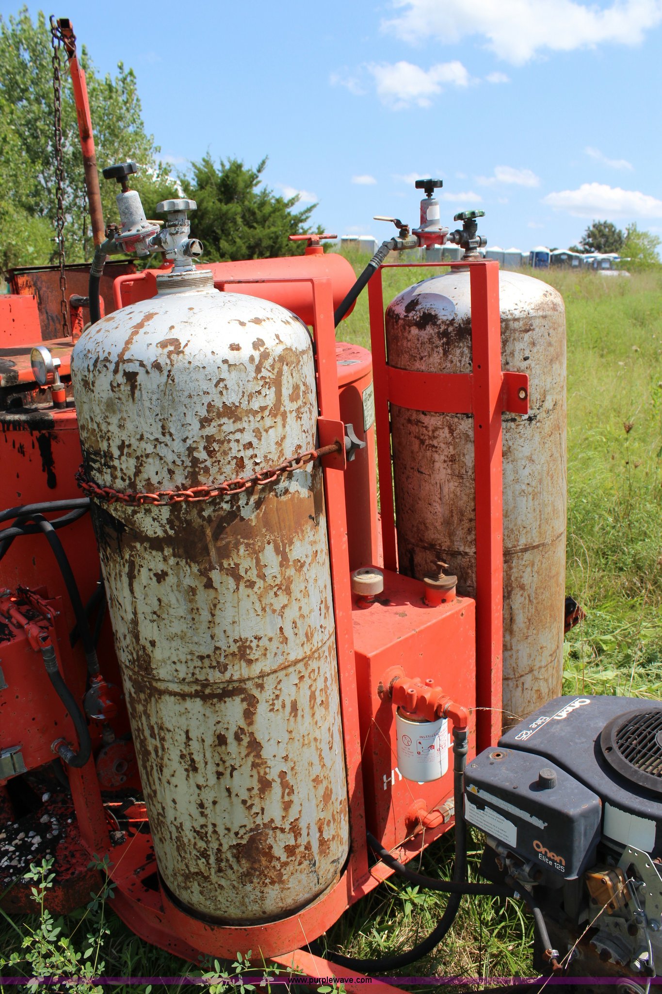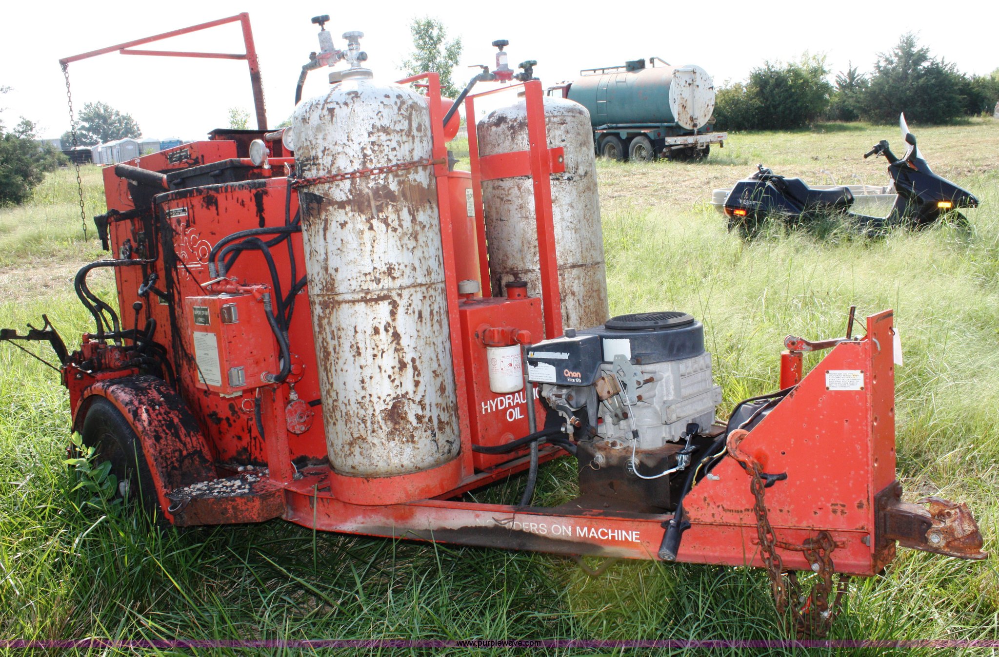 Purple Wave is selling a used Pot Hole Patcher in Kansas. This item is a Crafco EZ Pour melter/applicator with the following: Onan Elite 125 gas engine, Electric start, 100 gallon capacity, (2) 100 lbs propane bottles, 2 5/16" ball hitch, 215/75R14 tires, Unknown operating condition